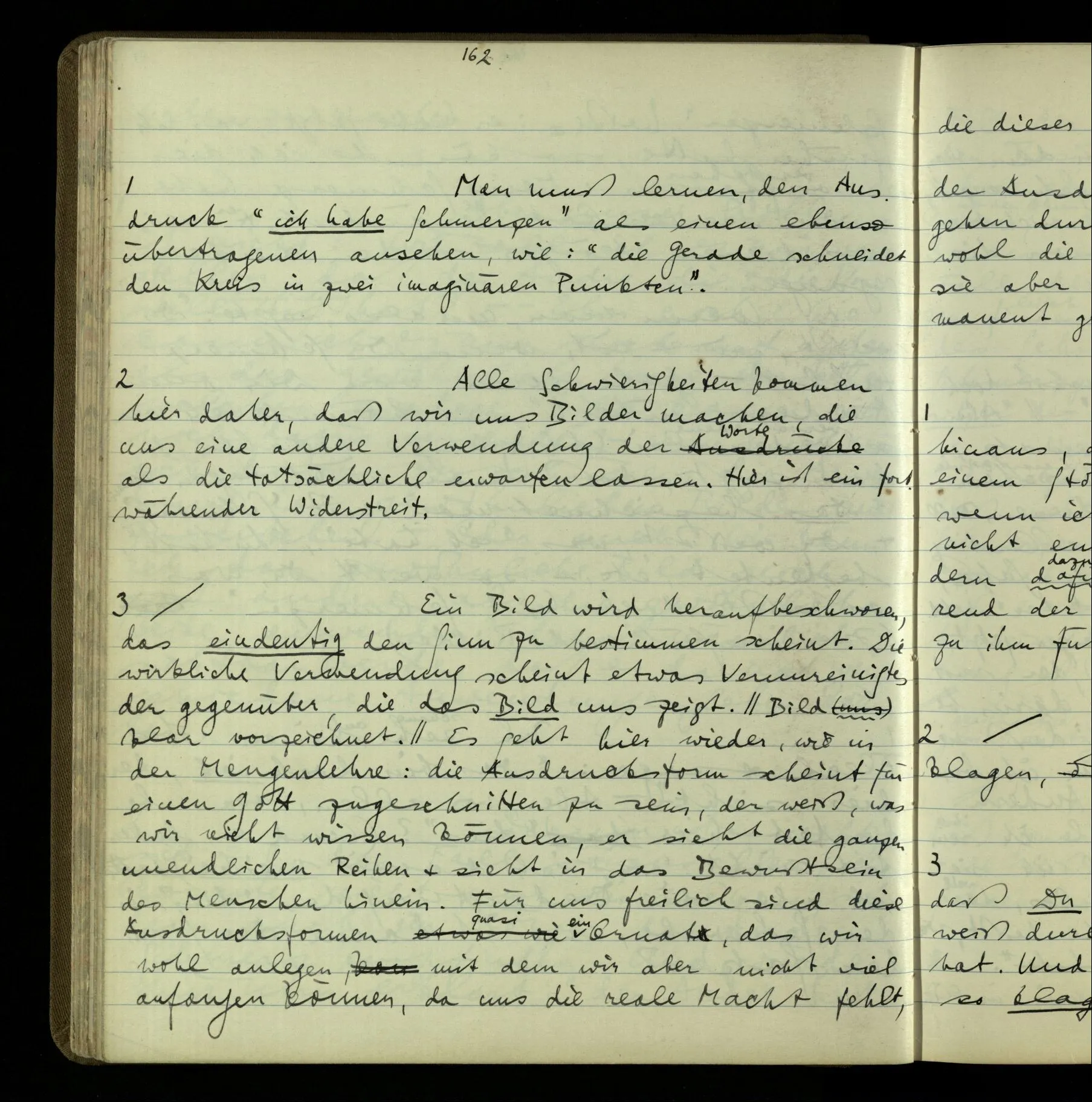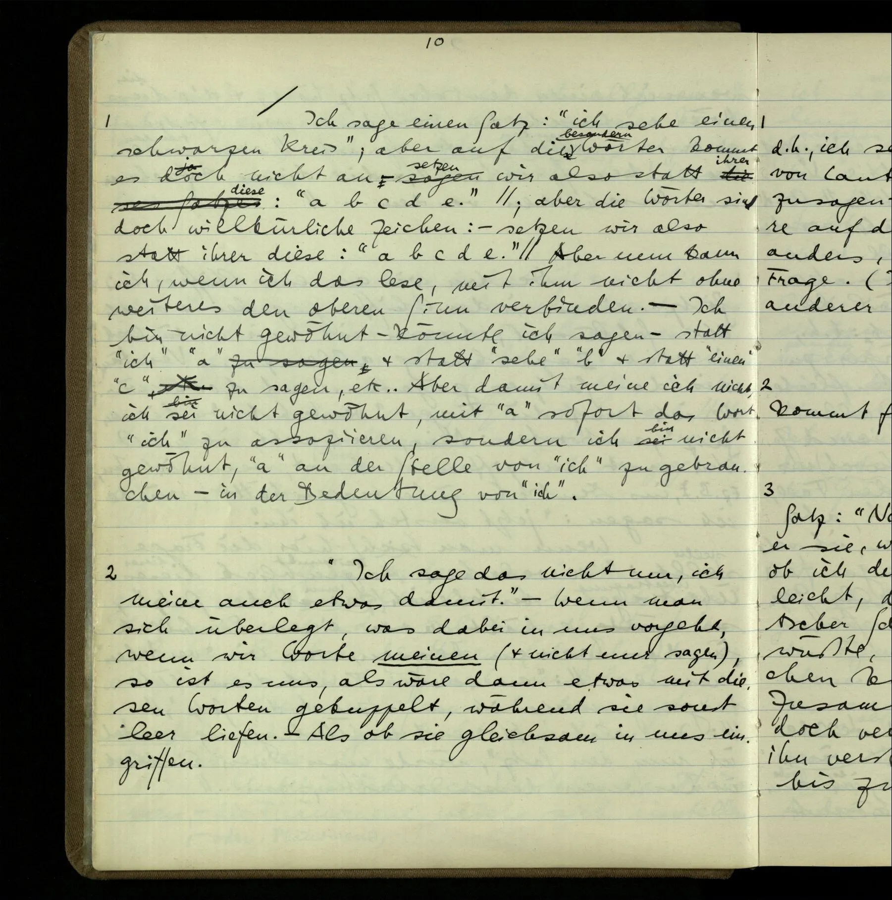 1 Ich sage einen Satz: “ich sehe einen schwarzen Kreis”; aber auf diese besondern Wörter kommt es doch nicht an – setzen wir also statt ihrer diese: “a b c d e.” Aber nun kann ich, wenn ich das lese, mit ihm nicht ohne weiteres den oberen Sinn verbinden. – Ich bin nicht gewöhnt – könnte ich sagen – statt “ich” “a” & statt “sehe” “b” & statt “einen” “c” zu sagen, etc.. Aber damit meine ich nicht, ich sei nicht gewöhnt, mit “a” sofort das Wort “ich” zu assoziieren, sondern ich bin nicht gewöhnt, “a” an der Stelle von “ich” zu gebrauchen – in der Bedeutung von “ich”.