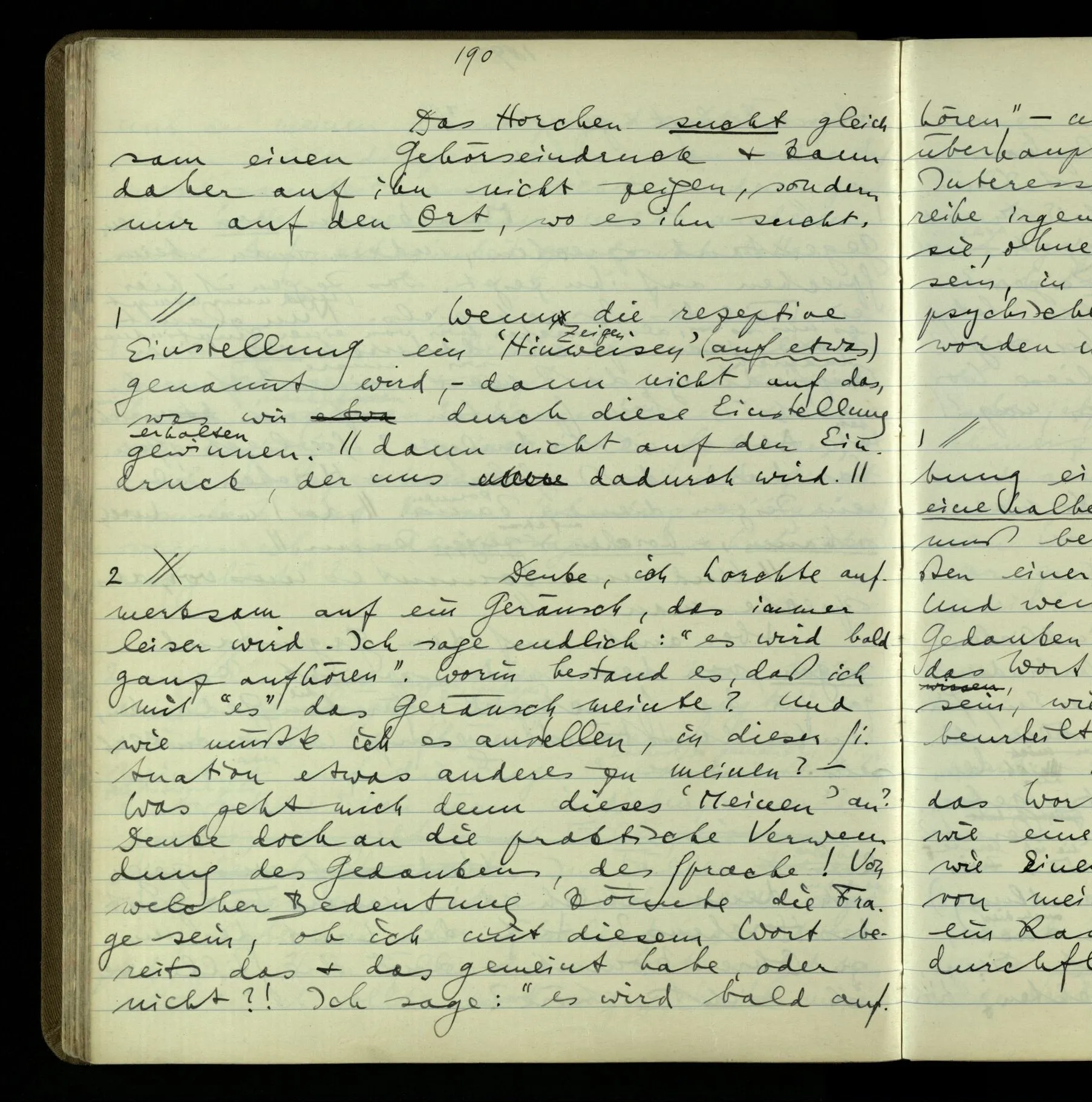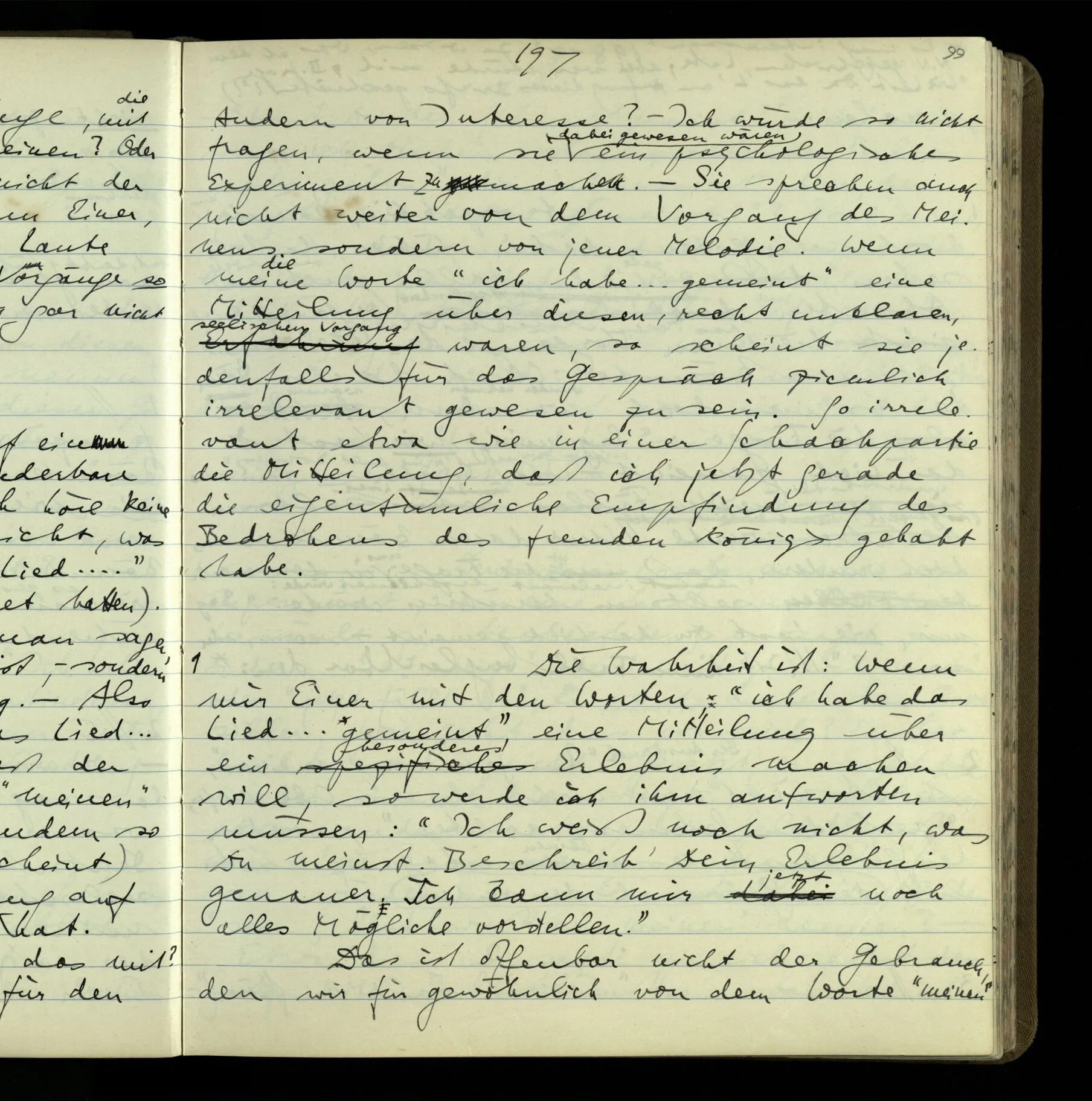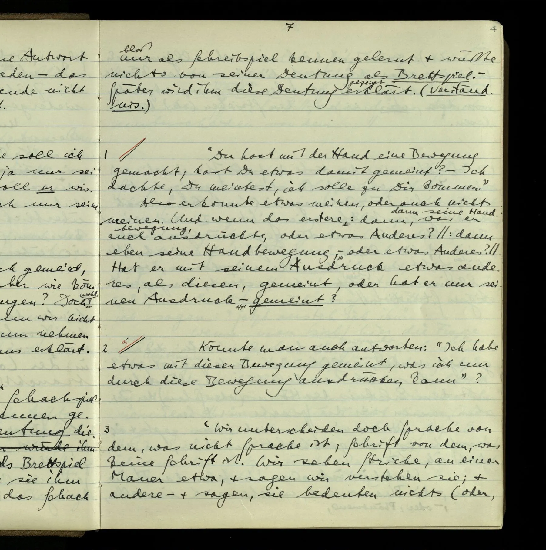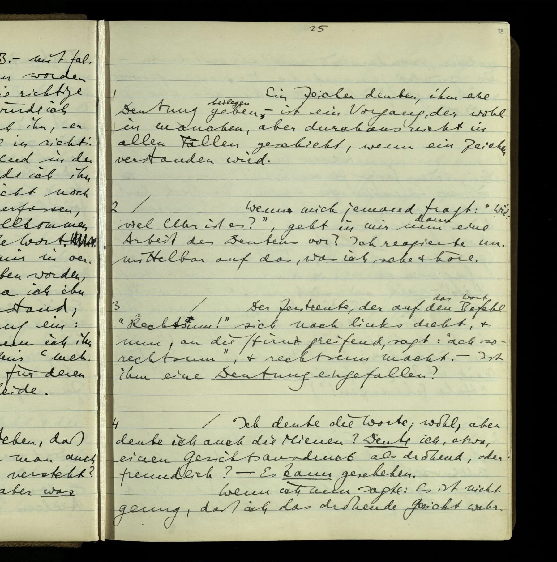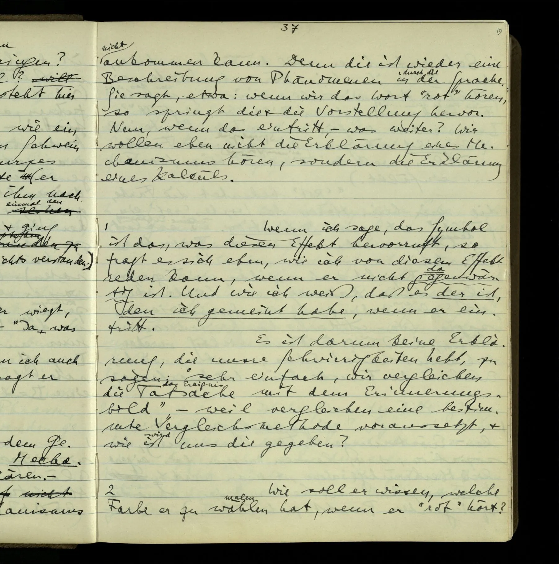 2 Geben wir denn den Worten, die uns gesagt werden, willkürlich Interpretationen? Kommt nicht das Erlebnis des Verstehens mit dem Erlebnis des Hörens (oder Sehens) der Zeichen, wenn wir die Sprache verstehen? Wenn mir jemand etwas sagt & ich verstehe (es), so geschieht mir dies, so wie, daß ich höre. Und hier ist also Verstehen das Phänomen, – die Phänomene, welche sich einstellen, wenn ich einen deutschen Satz höre, & die dieses Hören unterscheiden von dem eines Satzes einer mir unbekannten Sprache.