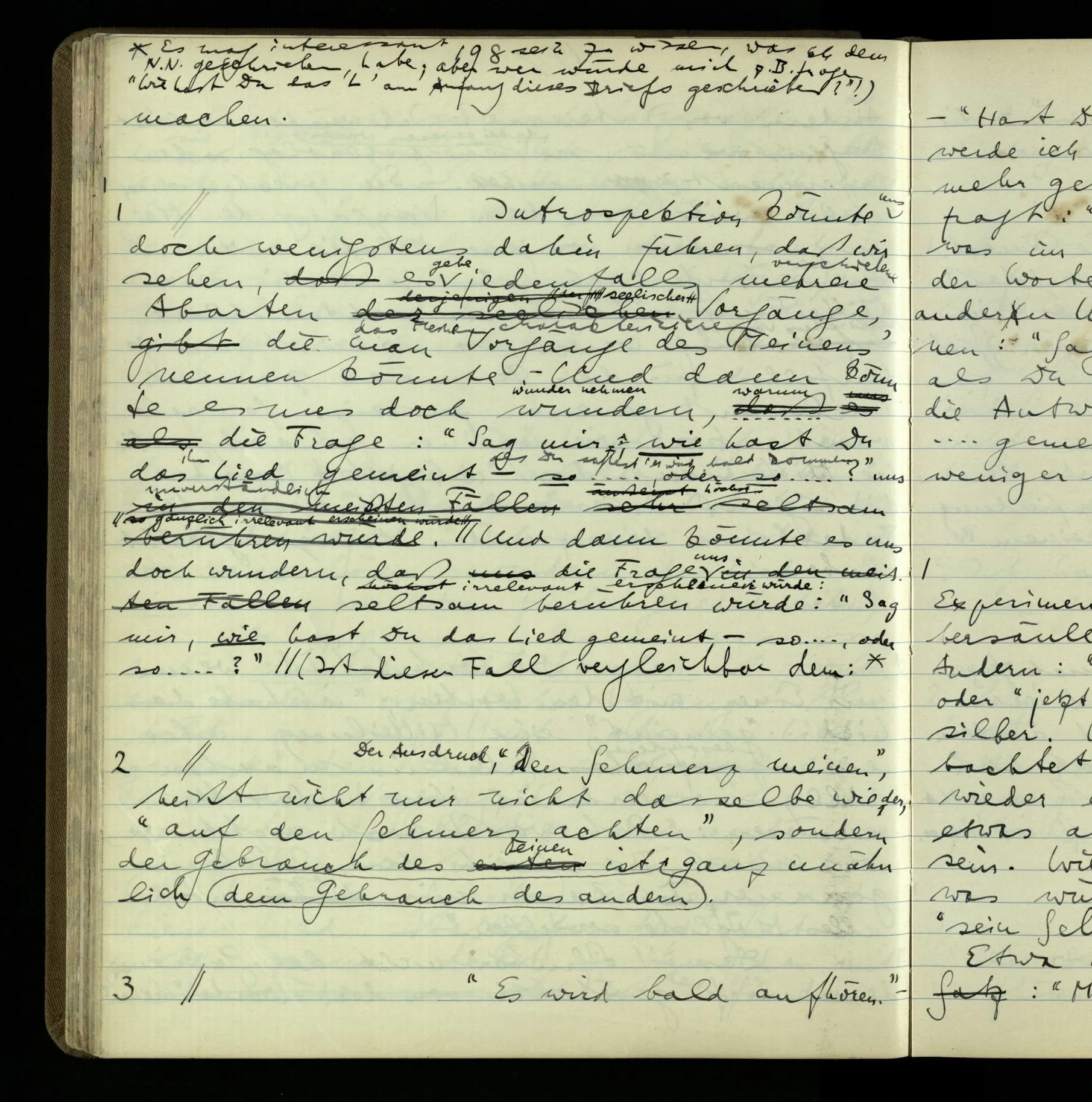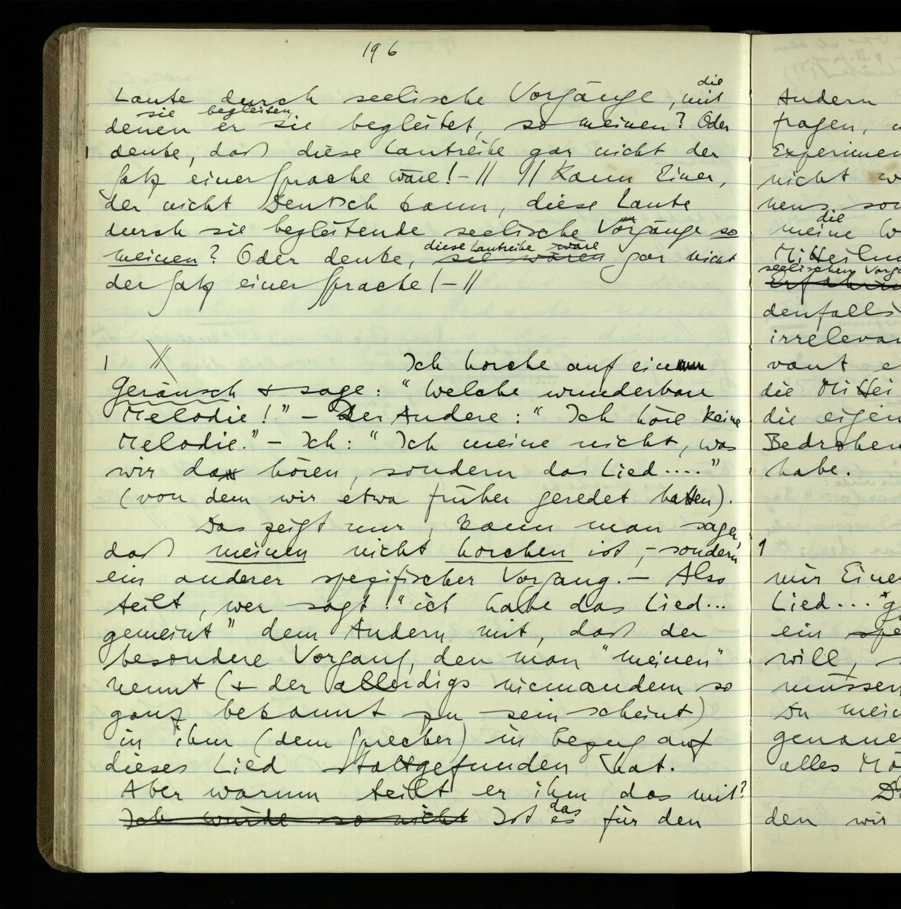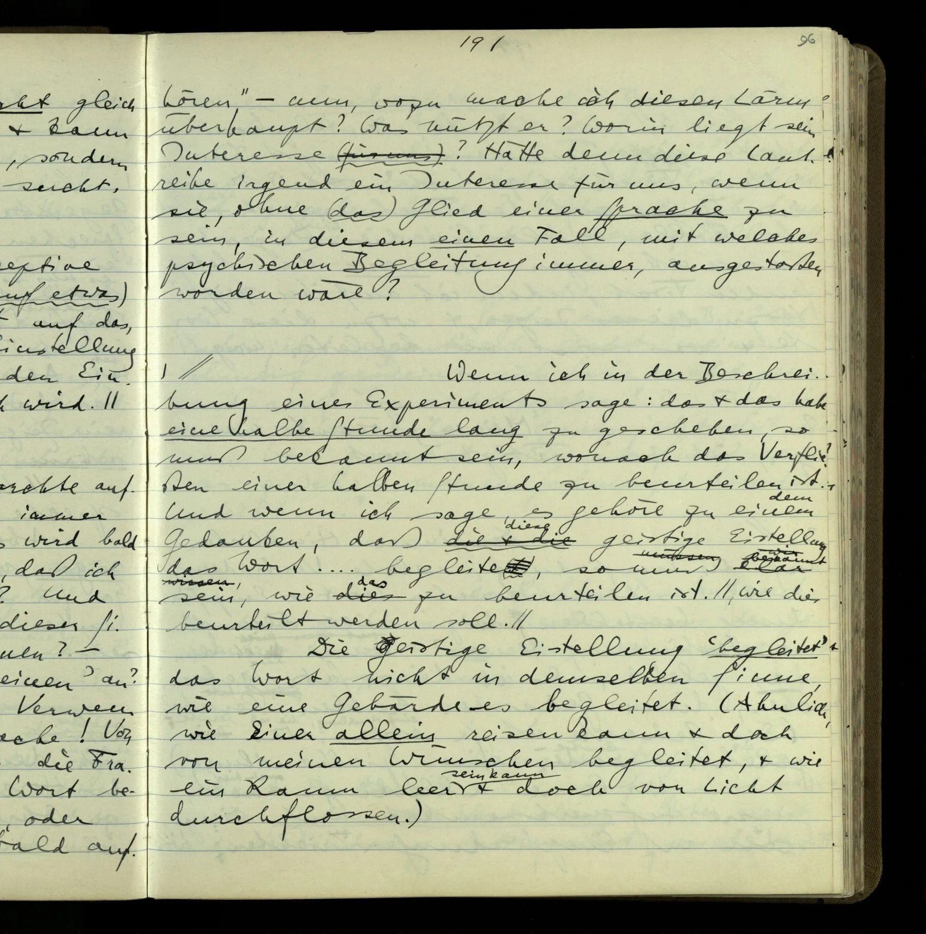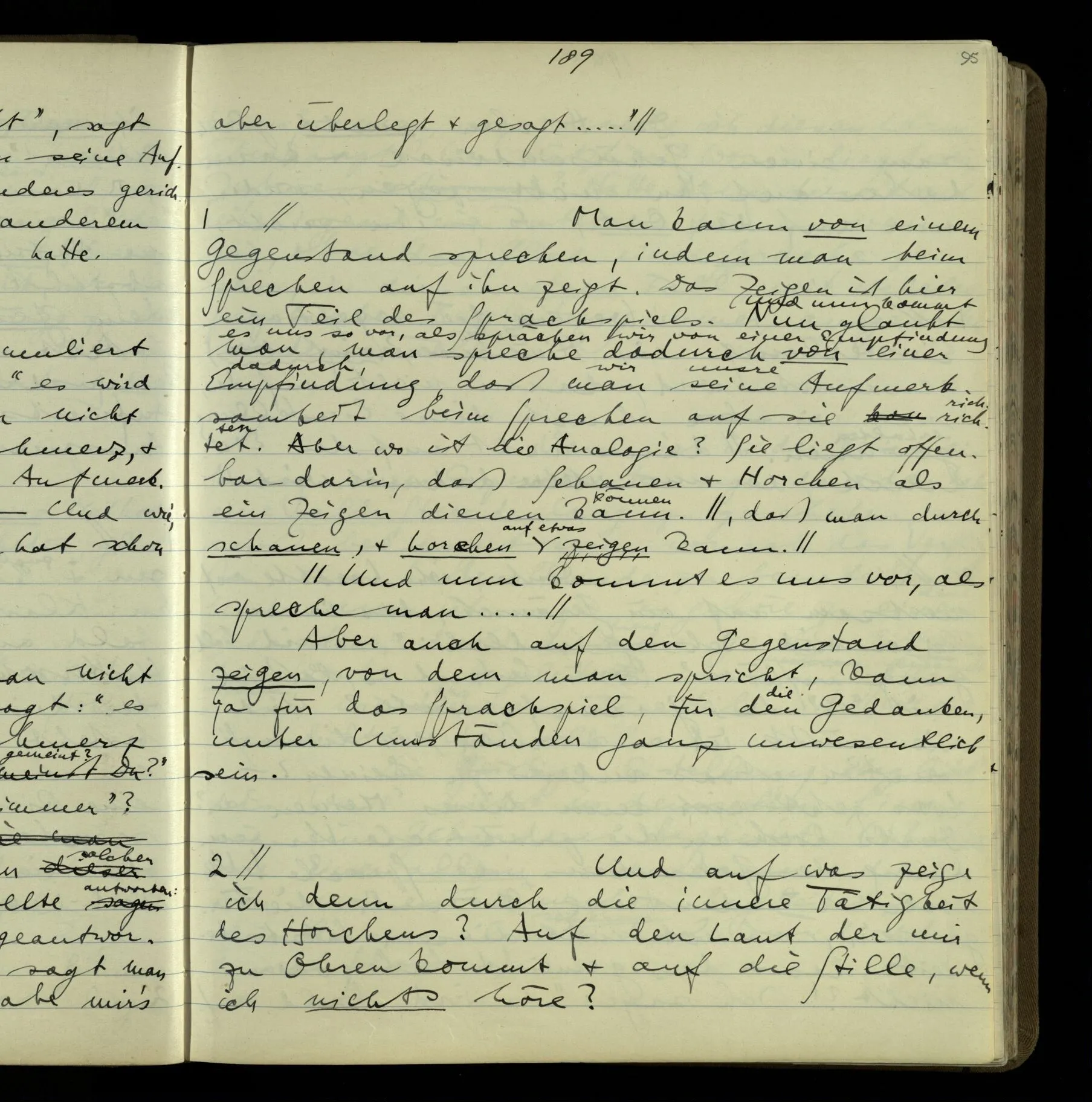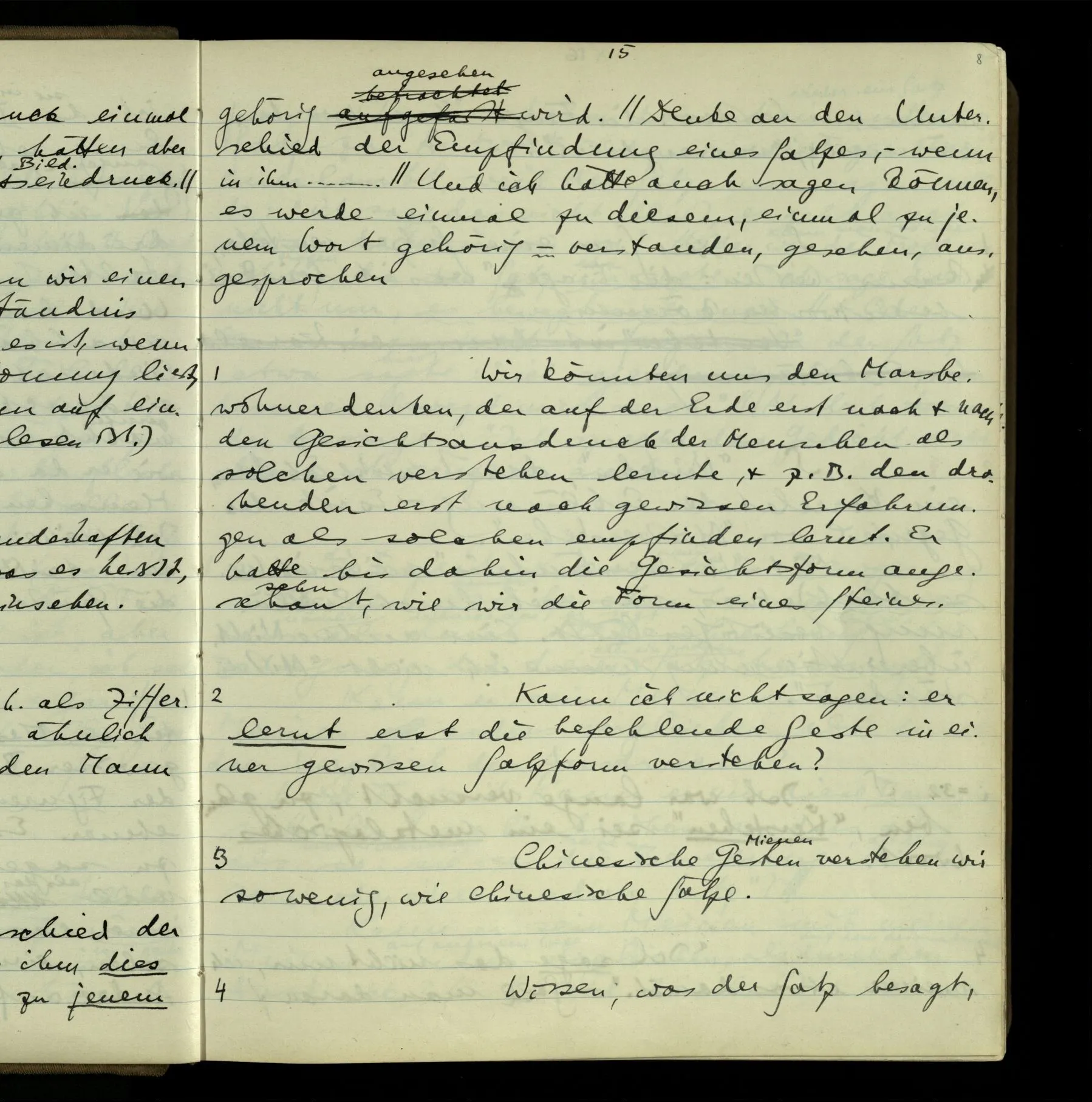 2 Geben wir denn den Worten, die uns gesagt werden, willkürlich Interpretationen? Kommt nicht das Erlebnis des Verstehens mit dem Erlebnis des Hörens (oder Sehens) der Zeichen, wenn wir die Sprache verstehen? Wenn mir jemand etwas sagt & ich verstehe (es), so geschieht mir dies, so wie, daß ich höre. Und hier ist also Verstehen das Phänomen, – die Phänomene, welche sich einstellen, wenn ich einen deutschen Satz höre, & die dieses Hören unterscheiden von dem eines Satzes einer mir unbekannten Sprache.
