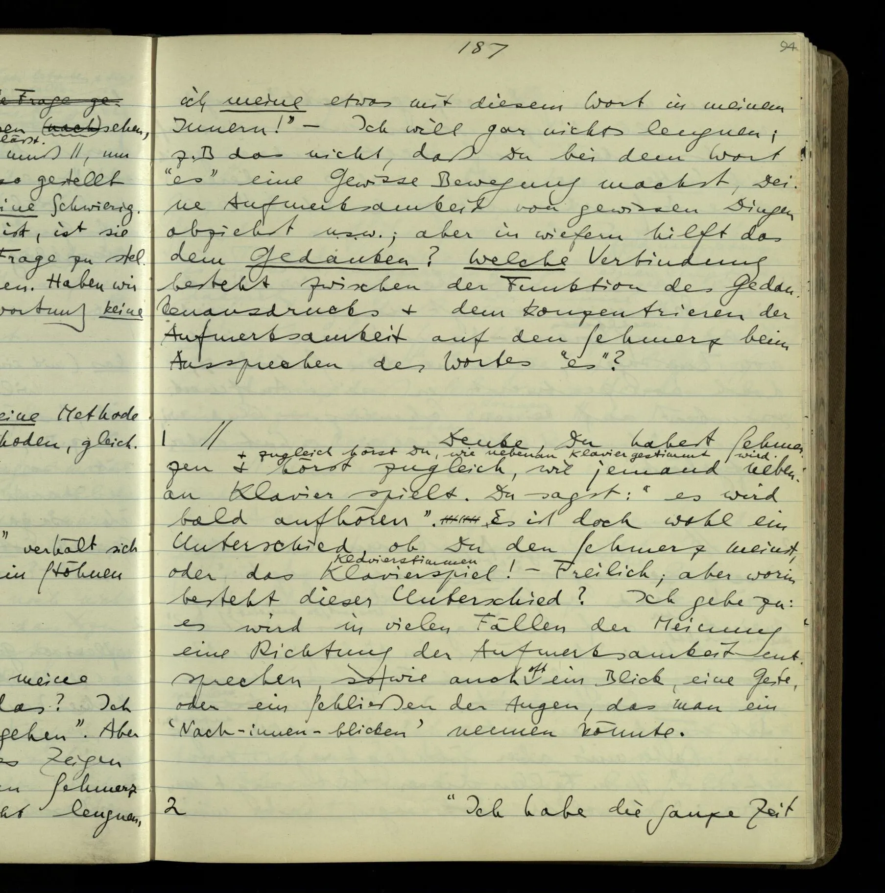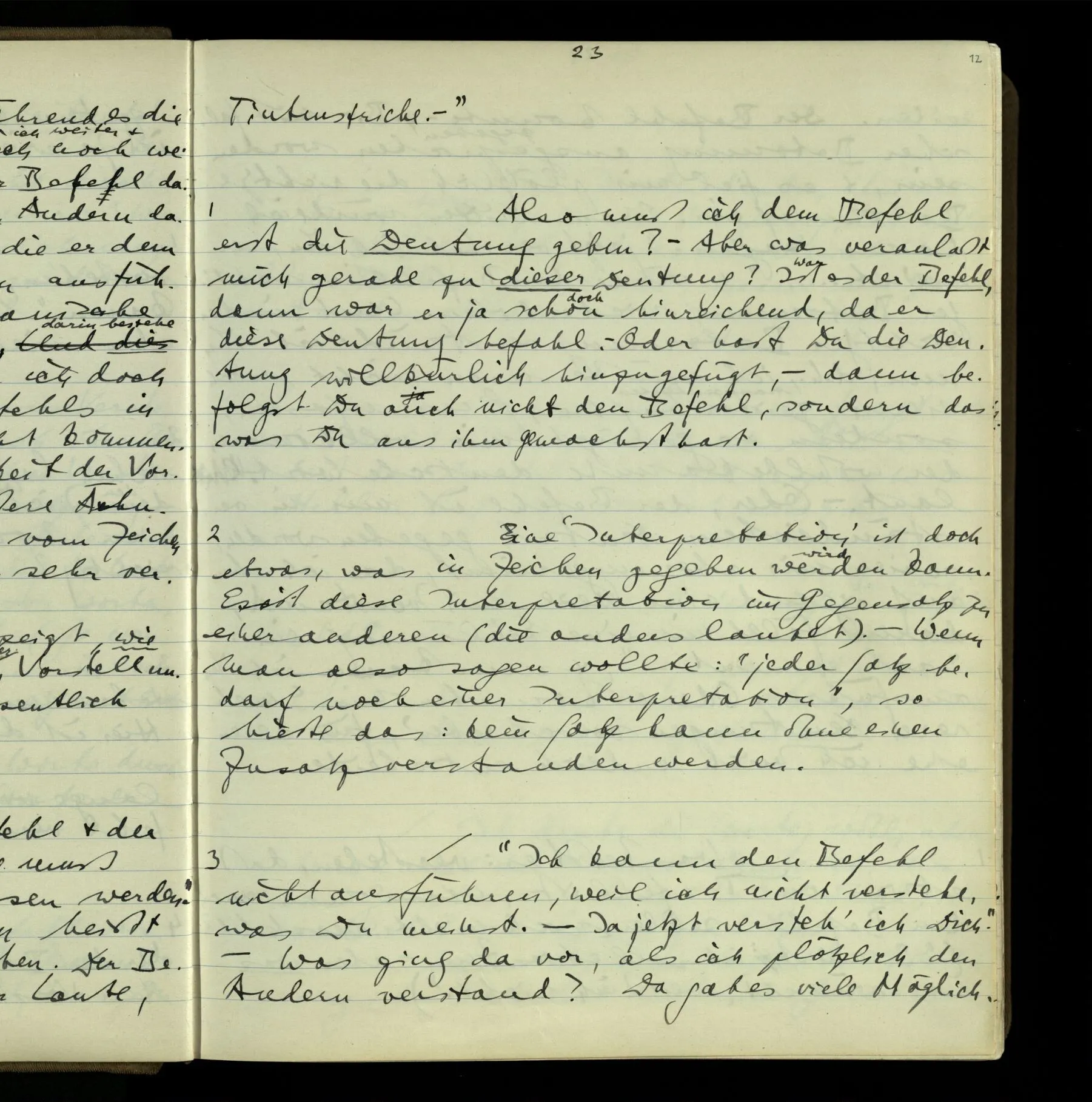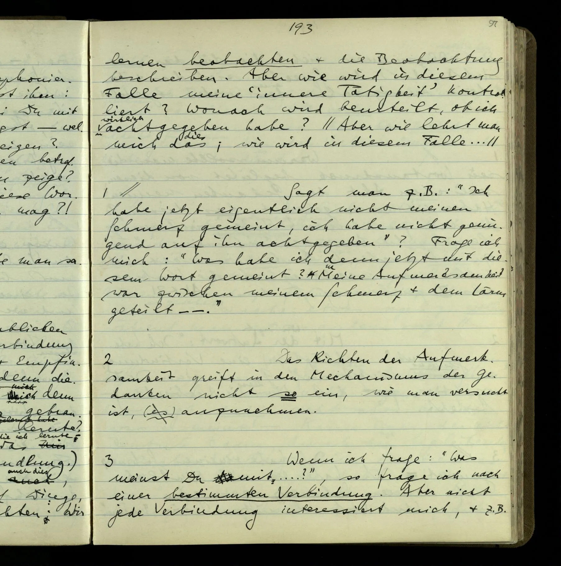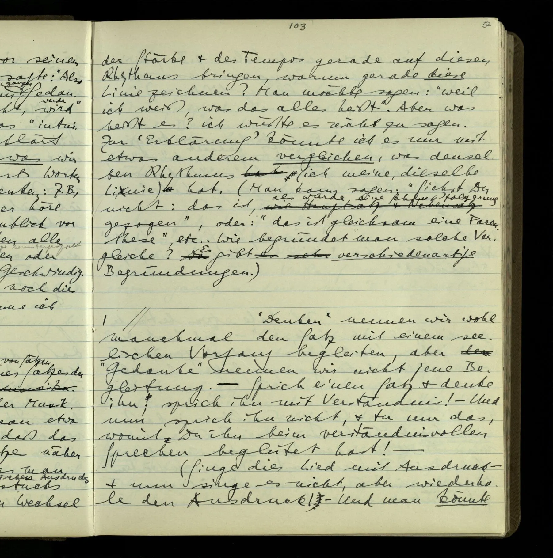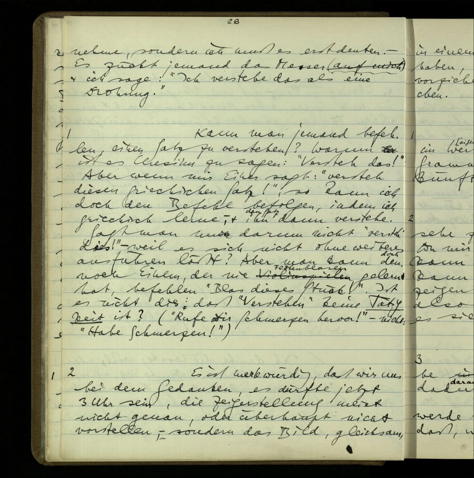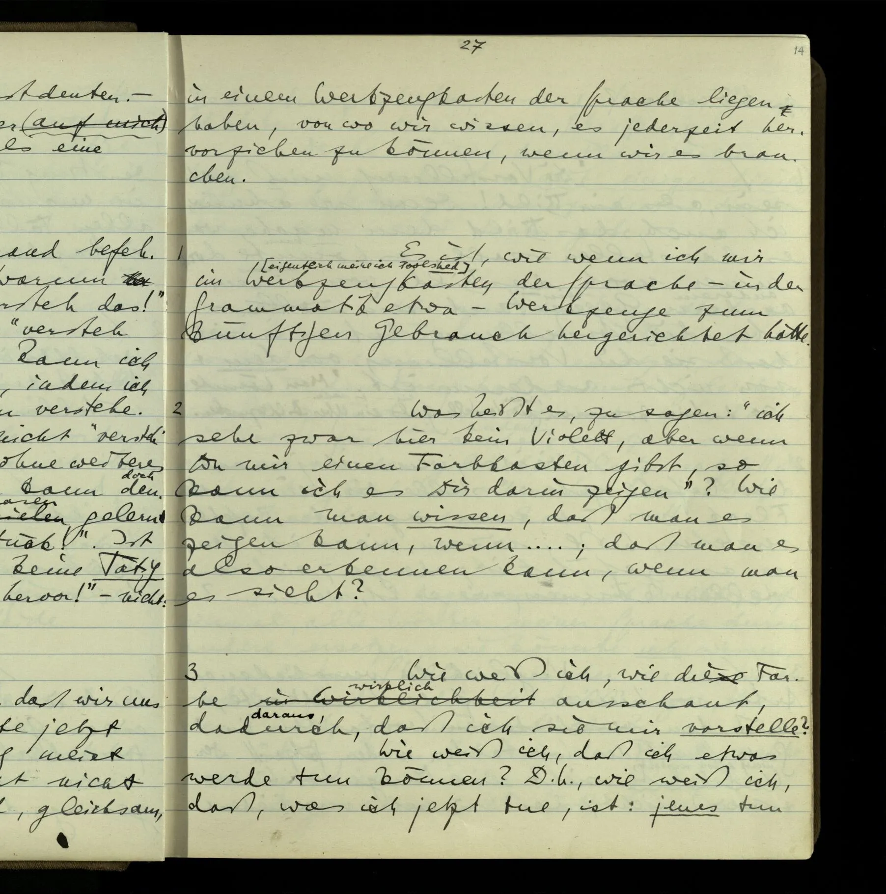 2 Geben wir denn den Worten, die uns gesagt werden, willkürlich Interpretationen? Kommt nicht das Erlebnis des Verstehens mit dem Erlebnis des Hörens (oder Sehens) der Zeichen, wenn wir die Sprache verstehen? Wenn mir jemand etwas sagt & ich verstehe (es), so geschieht mir dies, so wie, daß ich höre. Und hier ist also Verstehen das Phänomen, – die Phänomene, welche sich einstellen, wenn ich einen deutschen Satz höre, & die dieses Hören unterscheiden von dem eines Satzes einer mir unbekannten Sprache.