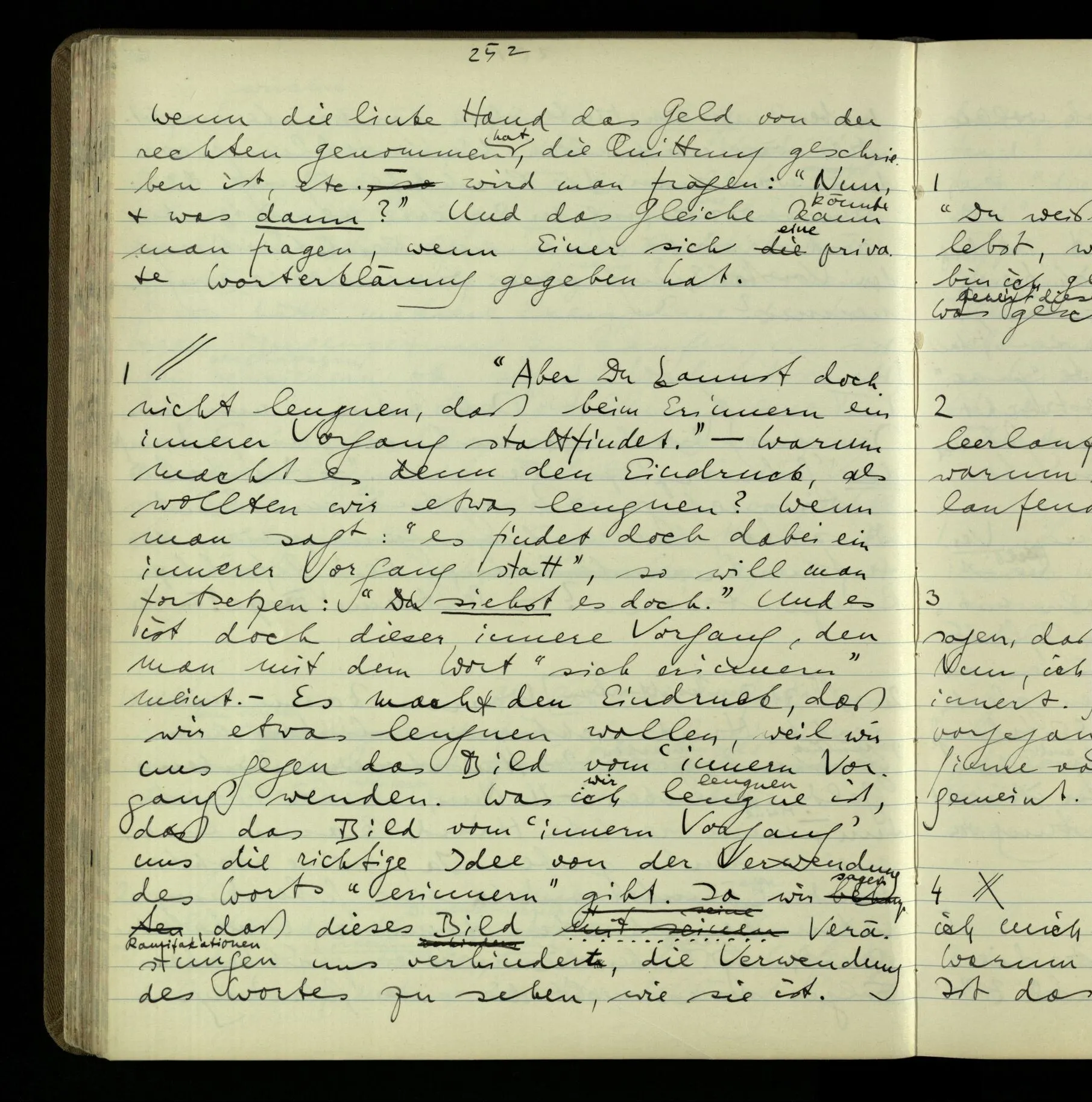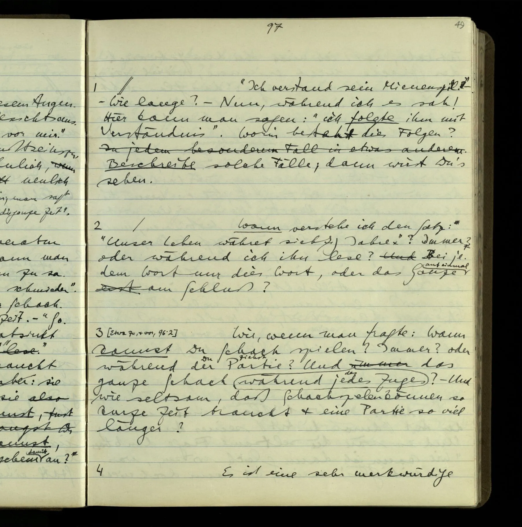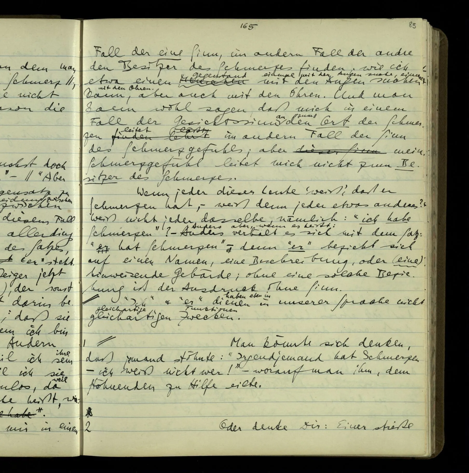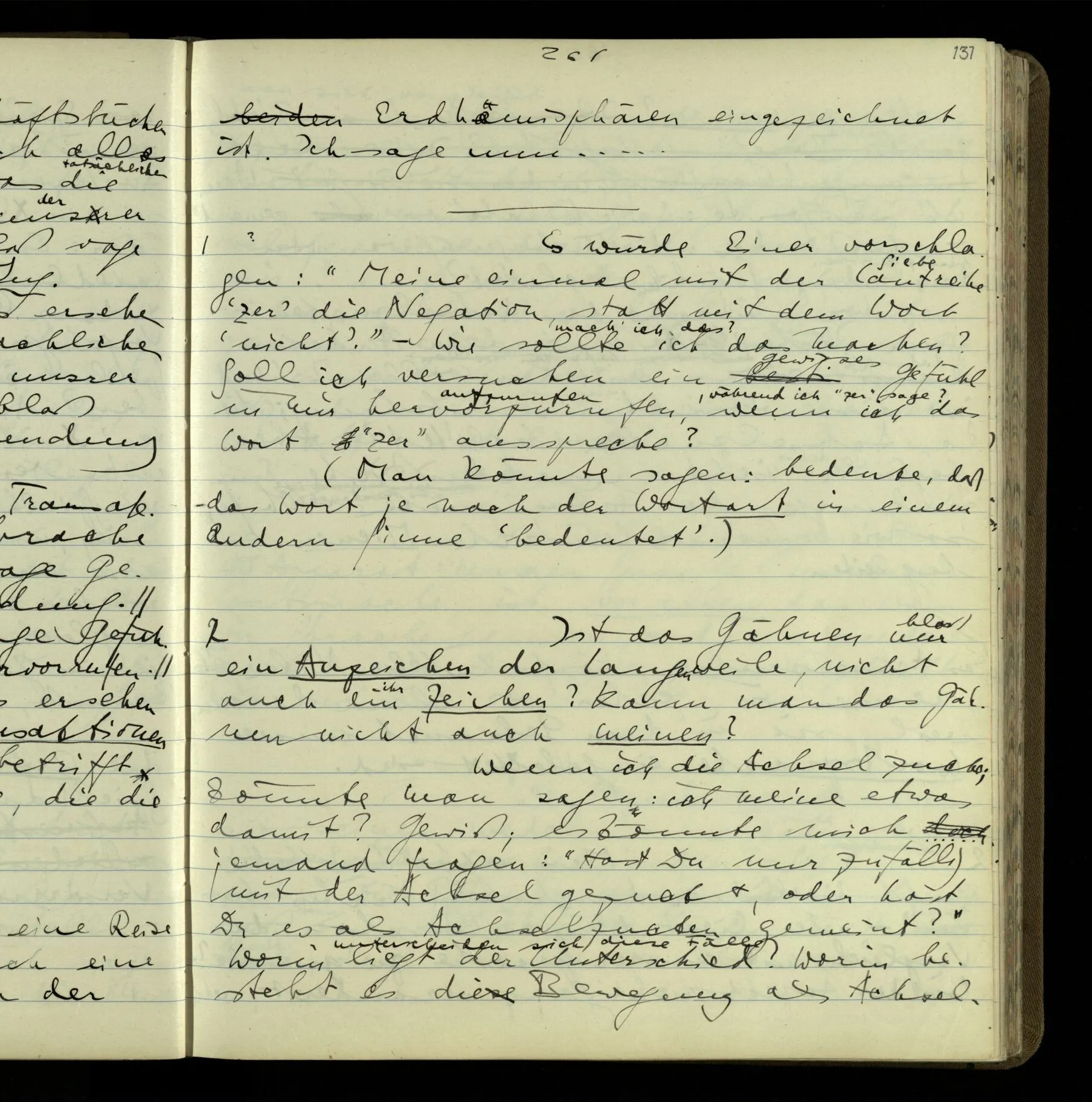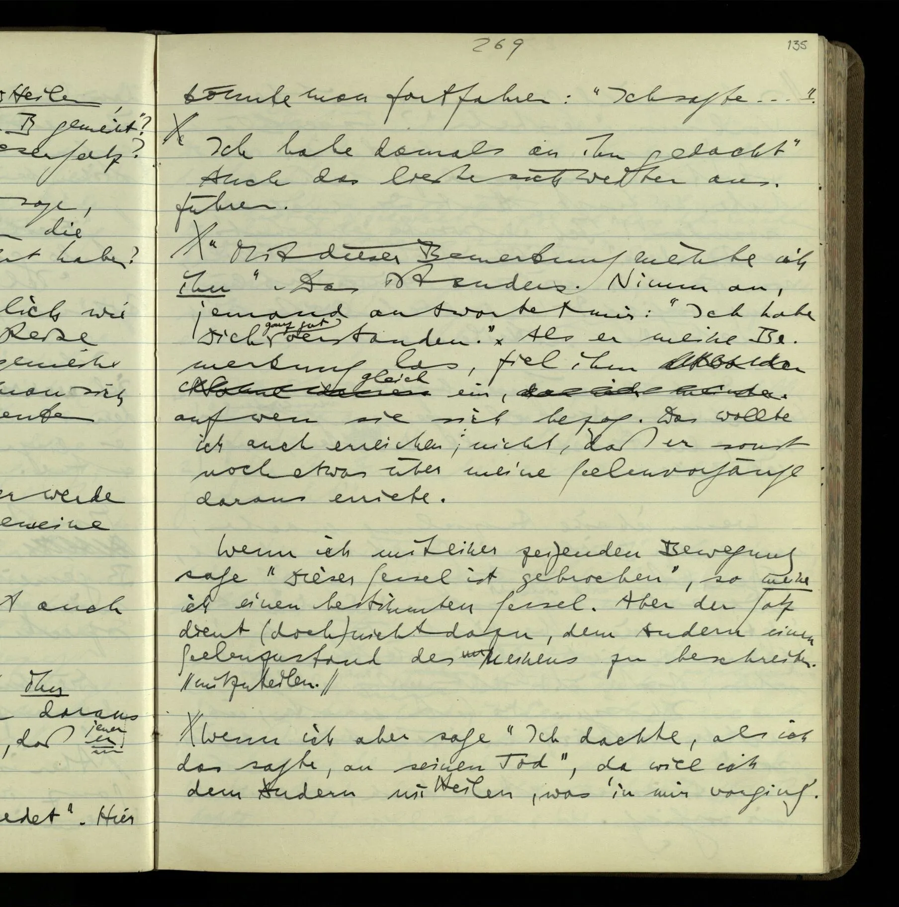 2 Geben wir denn den Worten, die uns gesagt werden, willkürlich Interpretationen? Kommt nicht das Erlebnis des Verstehens mit dem Erlebnis des Hörens (oder Sehens) der Zeichen, wenn wir die Sprache verstehen? Wenn mir jemand etwas sagt & ich verstehe (es), so geschieht mir dies, so wie, daß ich höre. Und hier ist also Verstehen das Phänomen, – die Phänomene, welche sich einstellen, wenn ich einen deutschen Satz höre, & die dieses Hören unterscheiden von dem eines Satzes einer mir unbekannten Sprache.