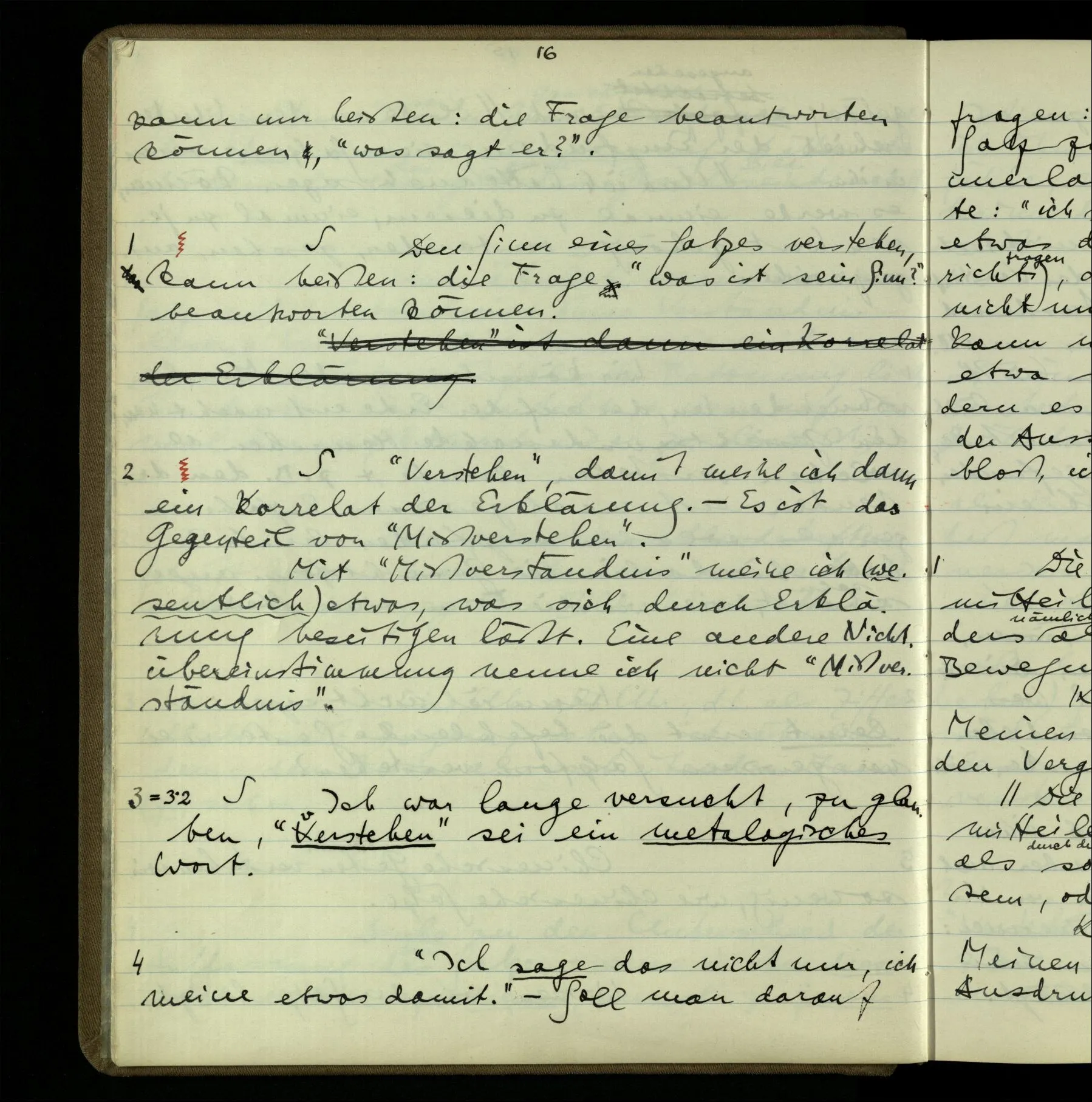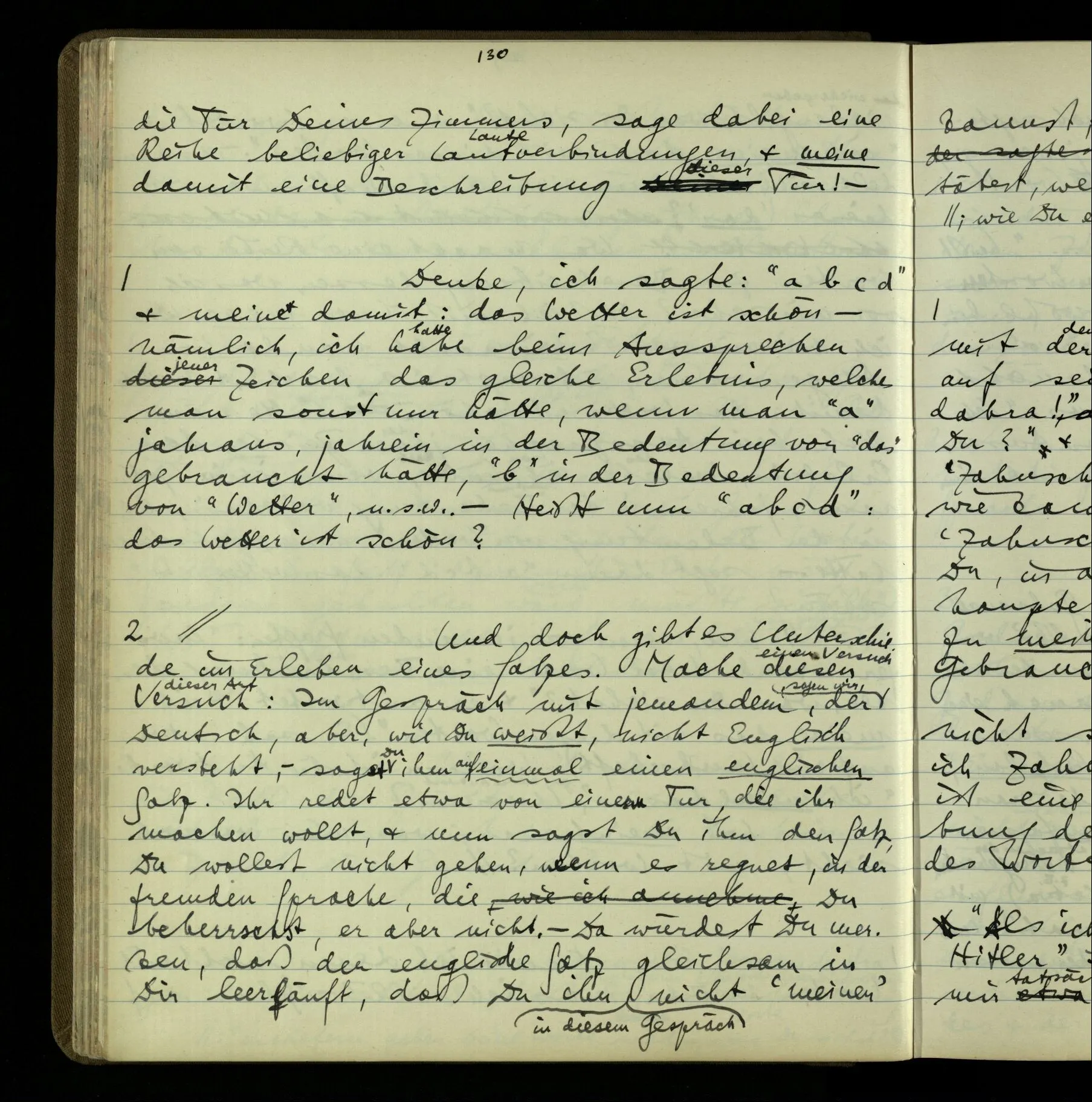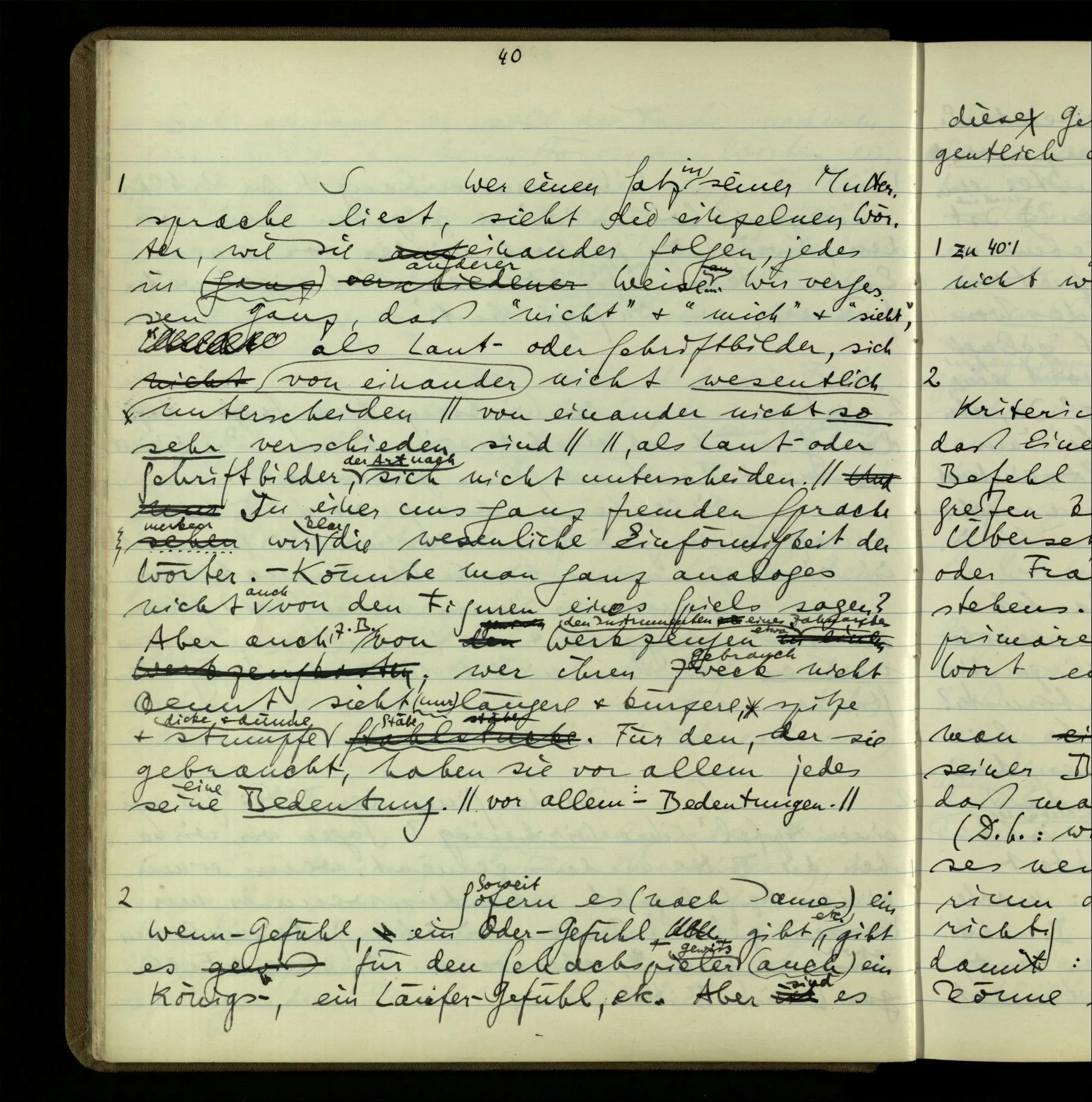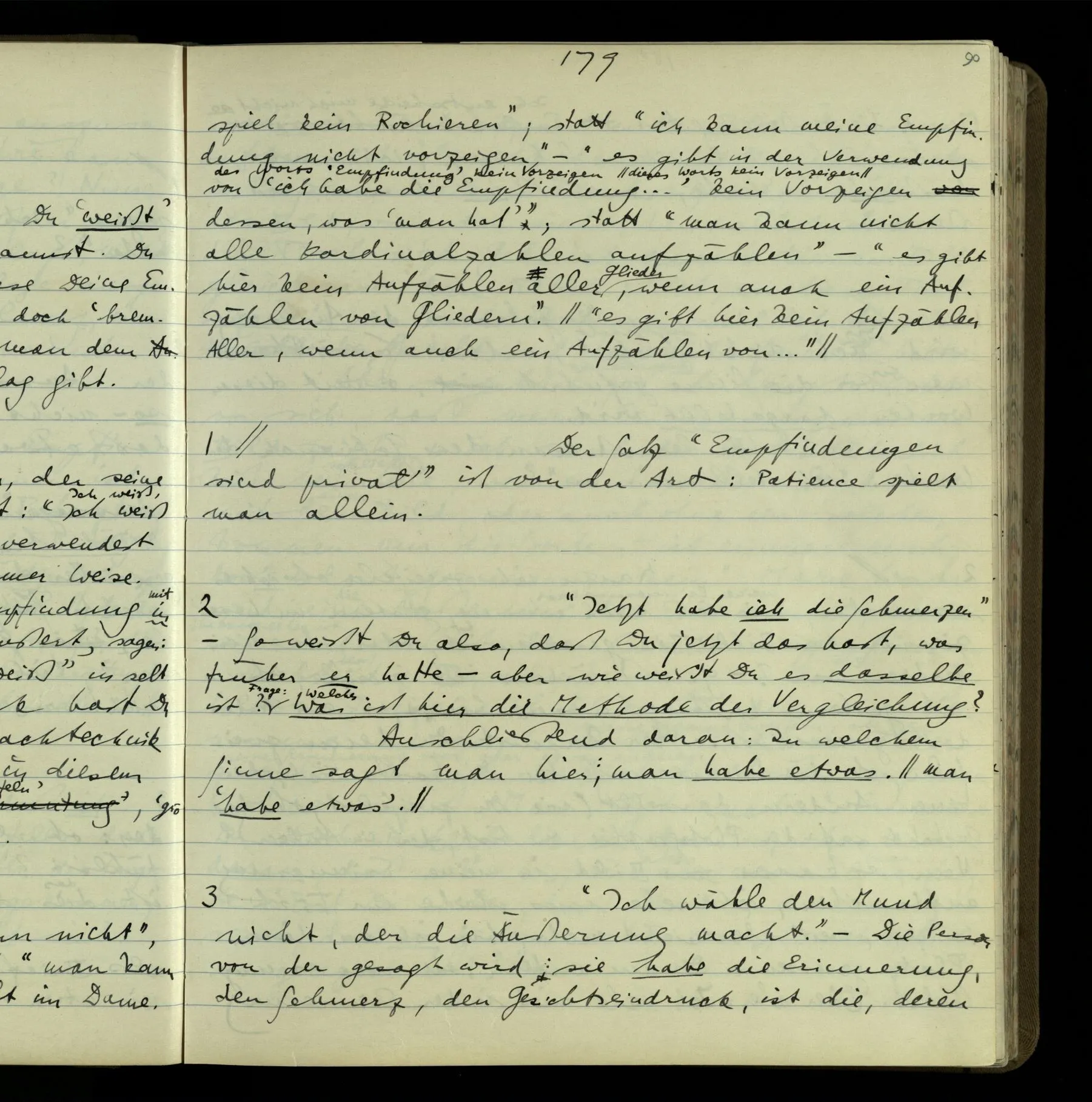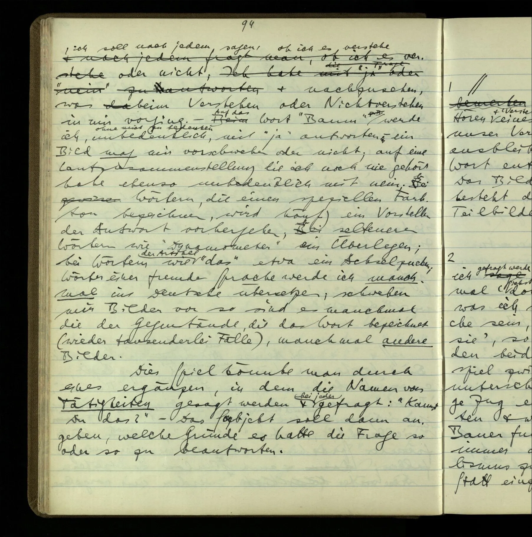 2 Geben wir denn den Worten, die uns gesagt werden, willkürlich Interpretationen? Kommt nicht das Erlebnis des Verstehens mit dem Erlebnis des Hörens (oder Sehens) der Zeichen, wenn wir die Sprache verstehen? Wenn mir jemand etwas sagt & ich verstehe (es), so geschieht mir dies, so wie, daß ich höre. Und hier ist also Verstehen das Phänomen, – die Phänomene, welche sich einstellen, wenn ich einen deutschen Satz höre, & die dieses Hören unterscheiden von dem eines Satzes einer mir unbekannten Sprache.