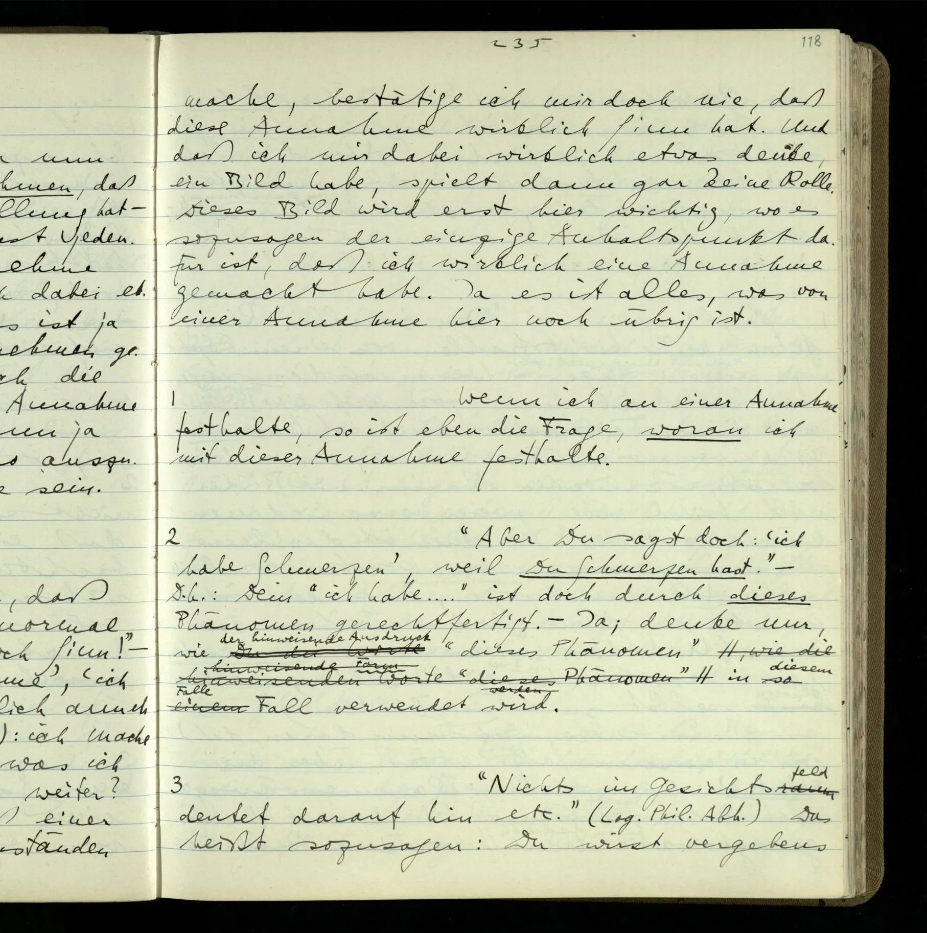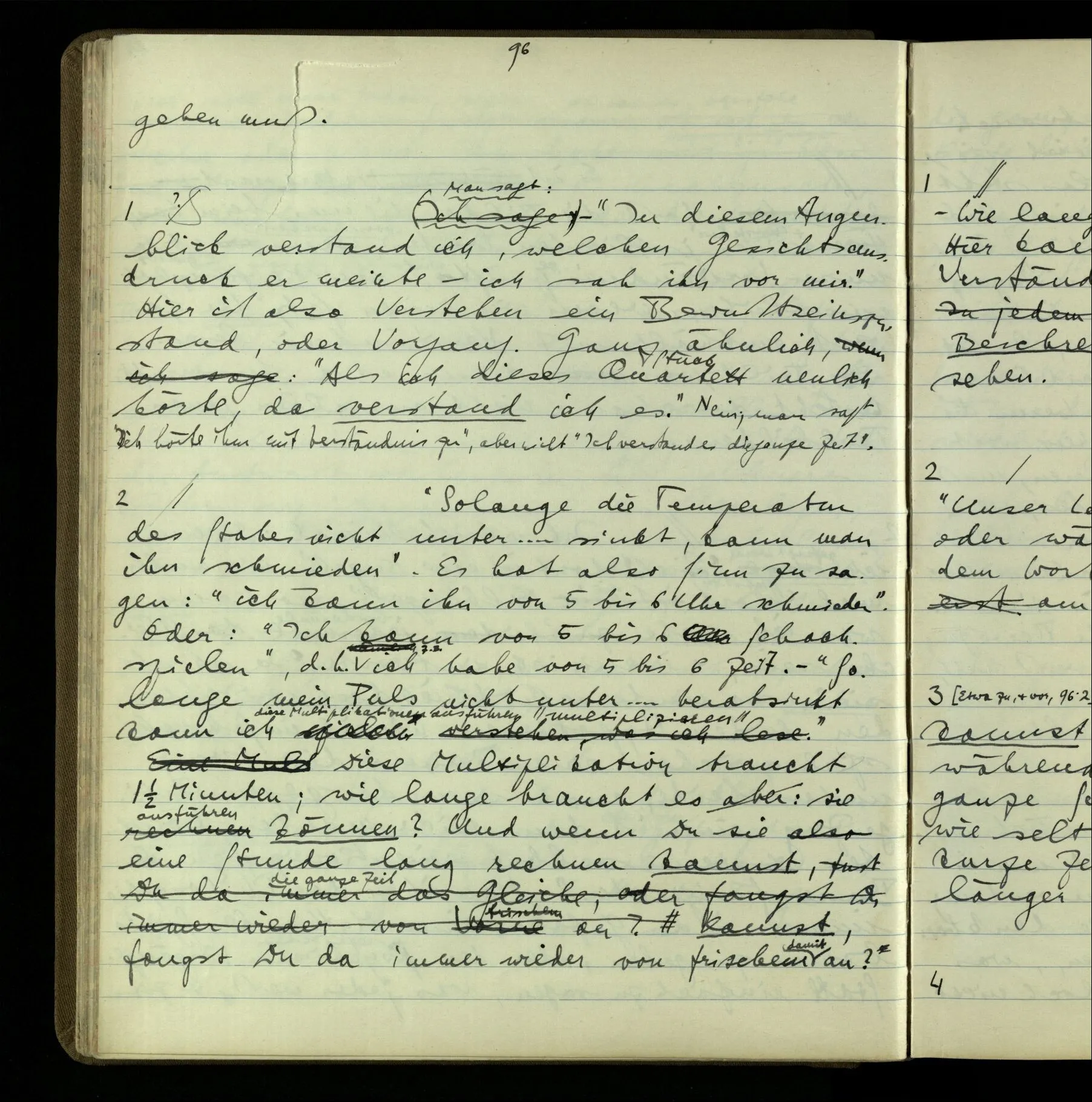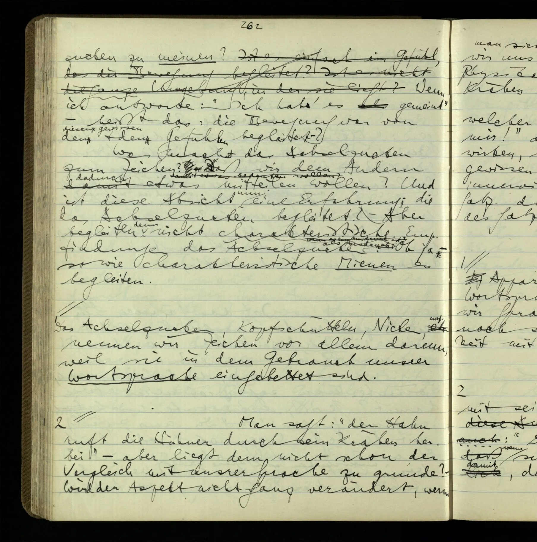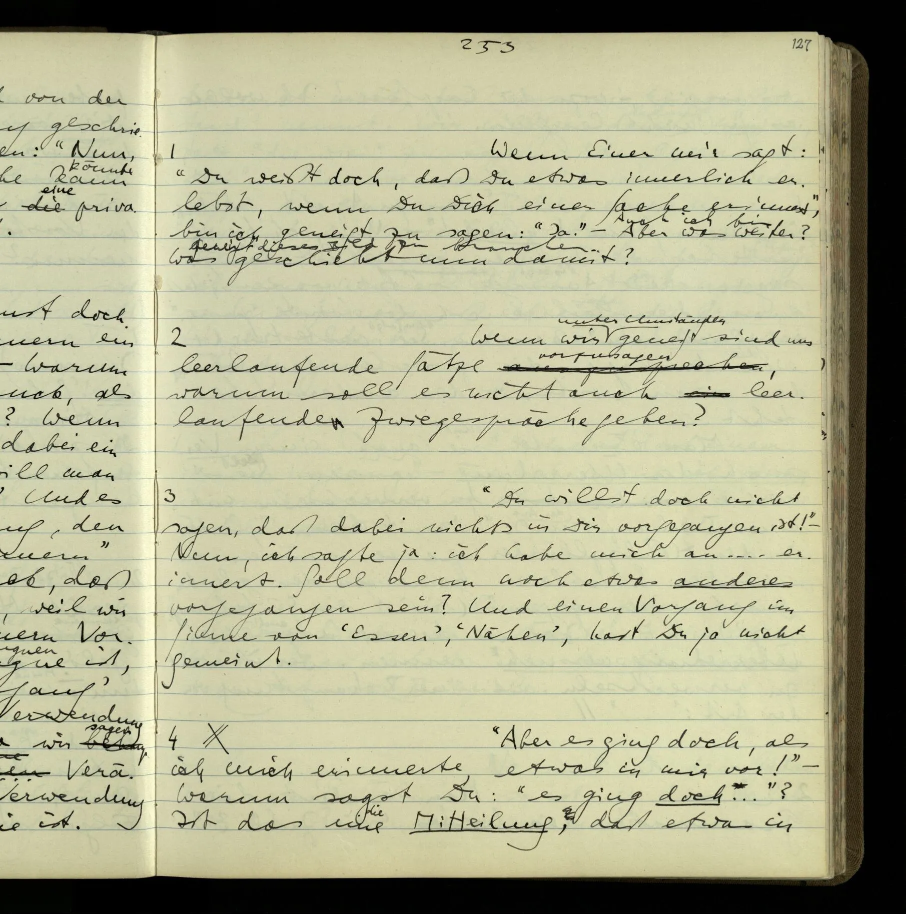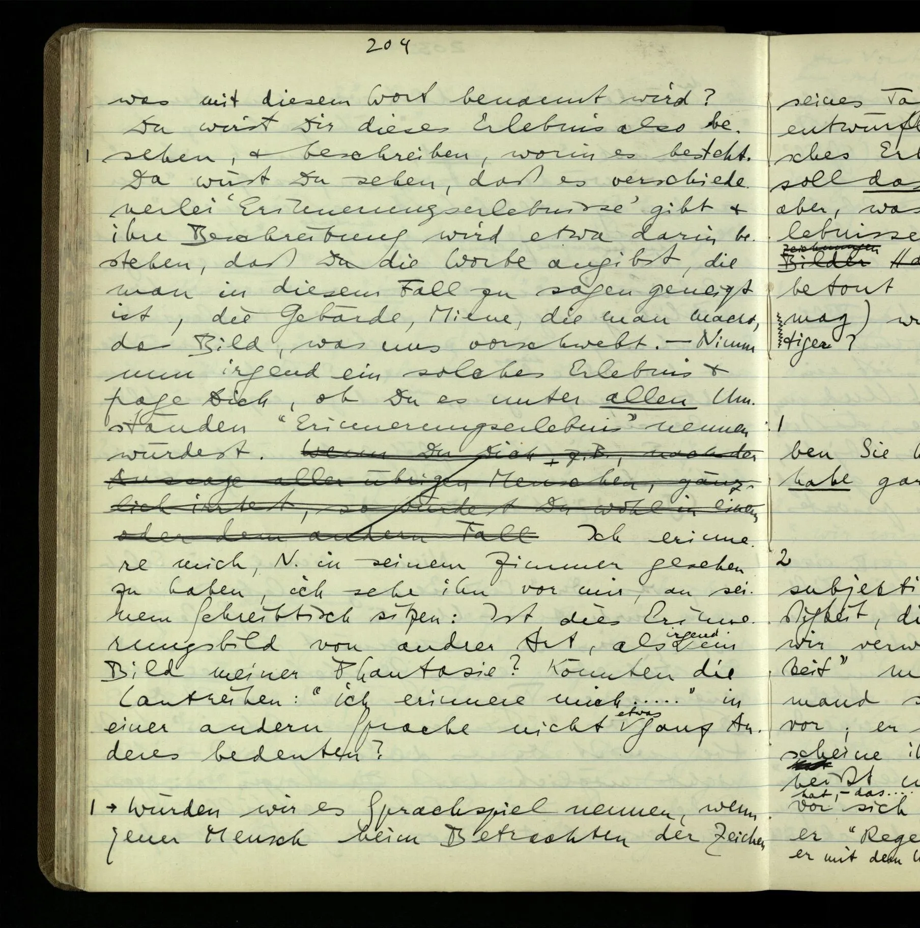 2 Geben wir denn den Worten, die uns gesagt werden, willkürlich Interpretationen? Kommt nicht das Erlebnis des Verstehens mit dem Erlebnis des Hörens (oder Sehens) der Zeichen, wenn wir die Sprache verstehen? Wenn mir jemand etwas sagt & ich verstehe (es), so geschieht mir dies, so wie, daß ich höre. Und hier ist also Verstehen das Phänomen, – die Phänomene, welche sich einstellen, wenn ich einen deutschen Satz höre, & die dieses Hören unterscheiden von dem eines Satzes einer mir unbekannten Sprache.