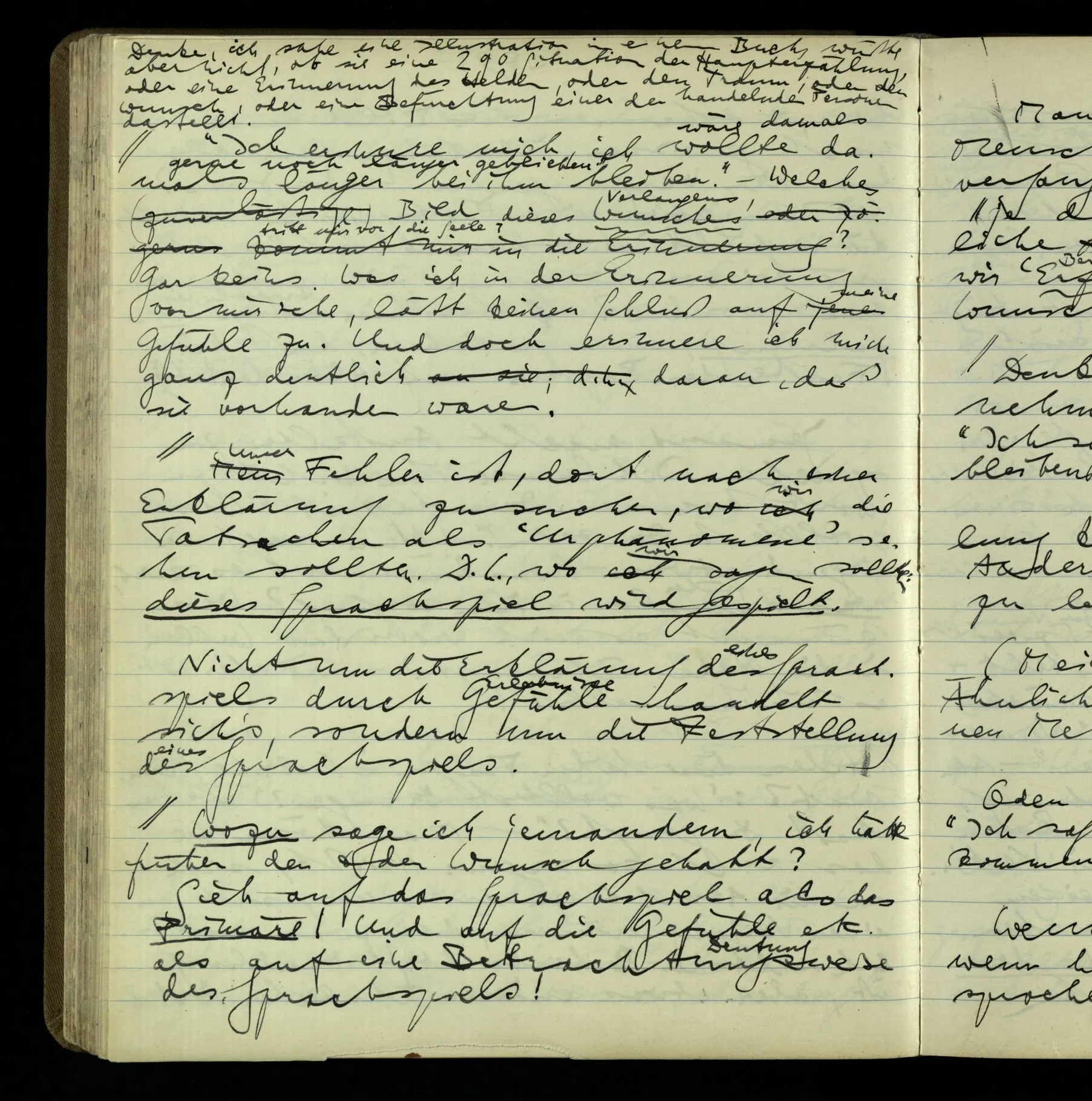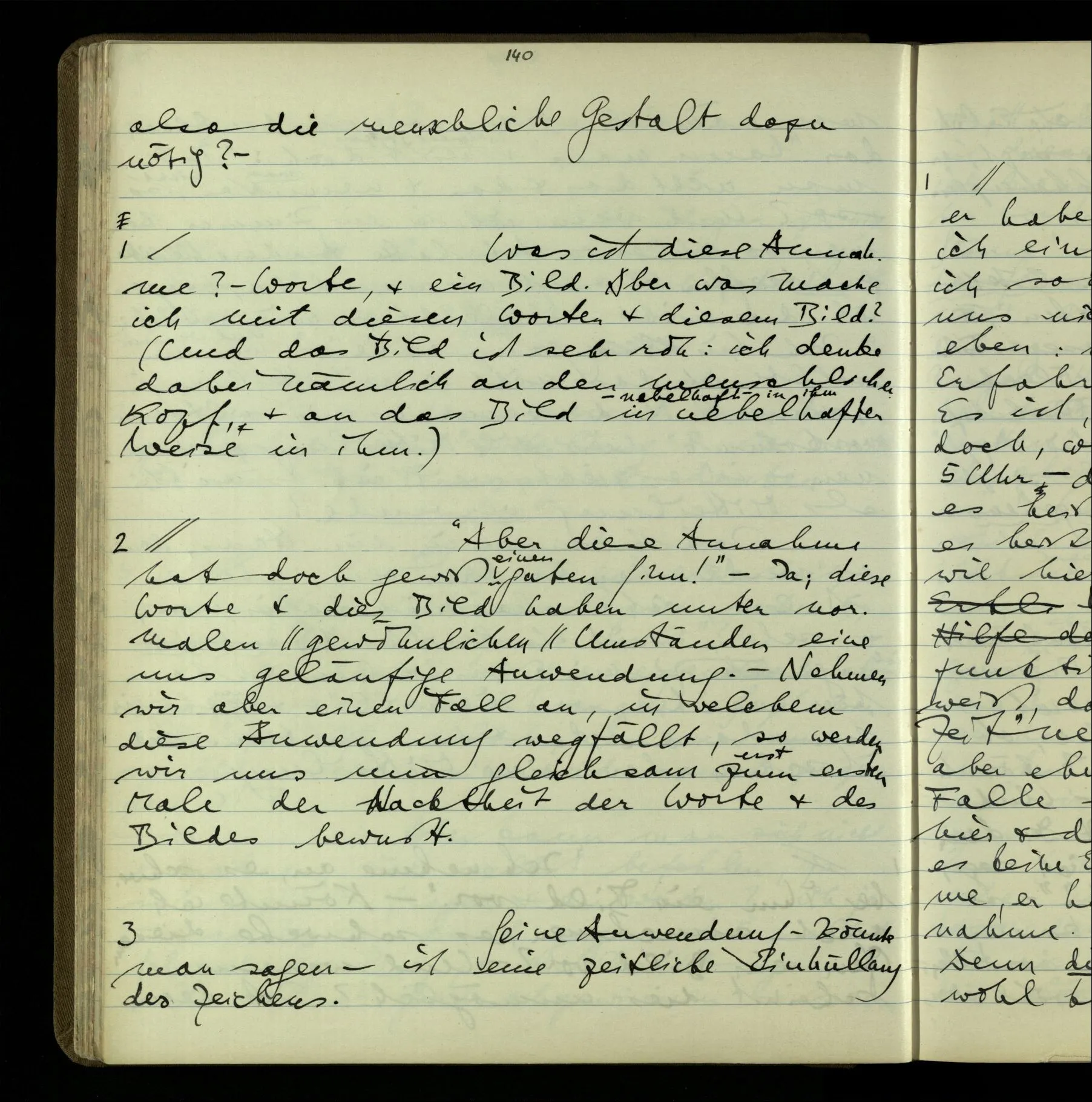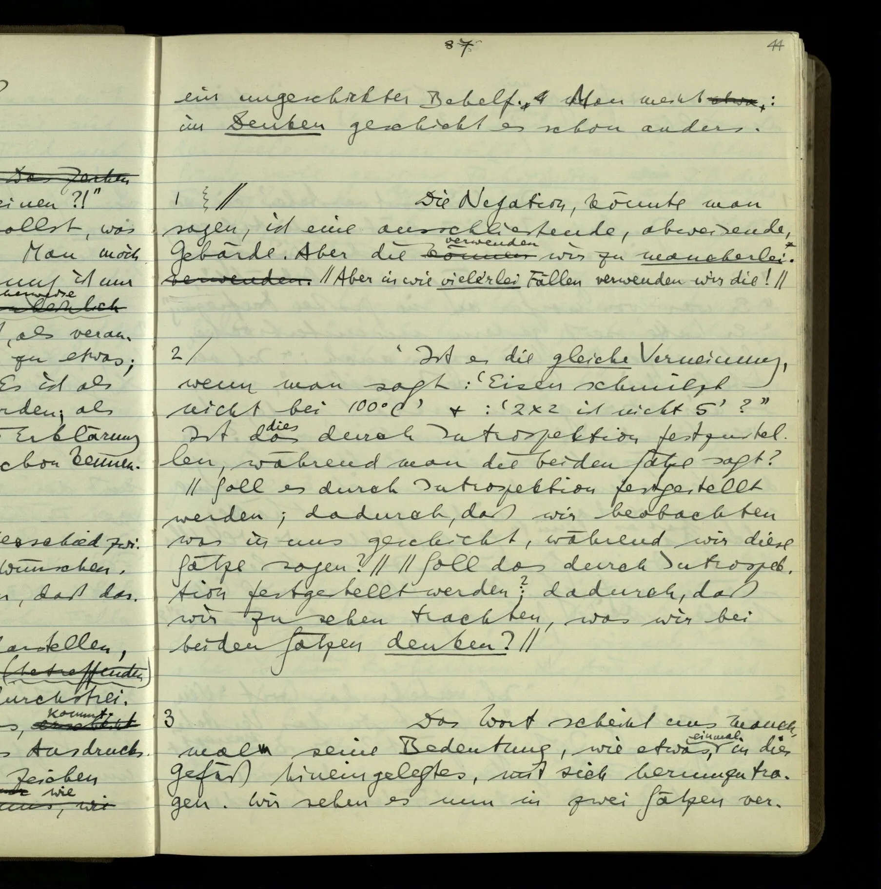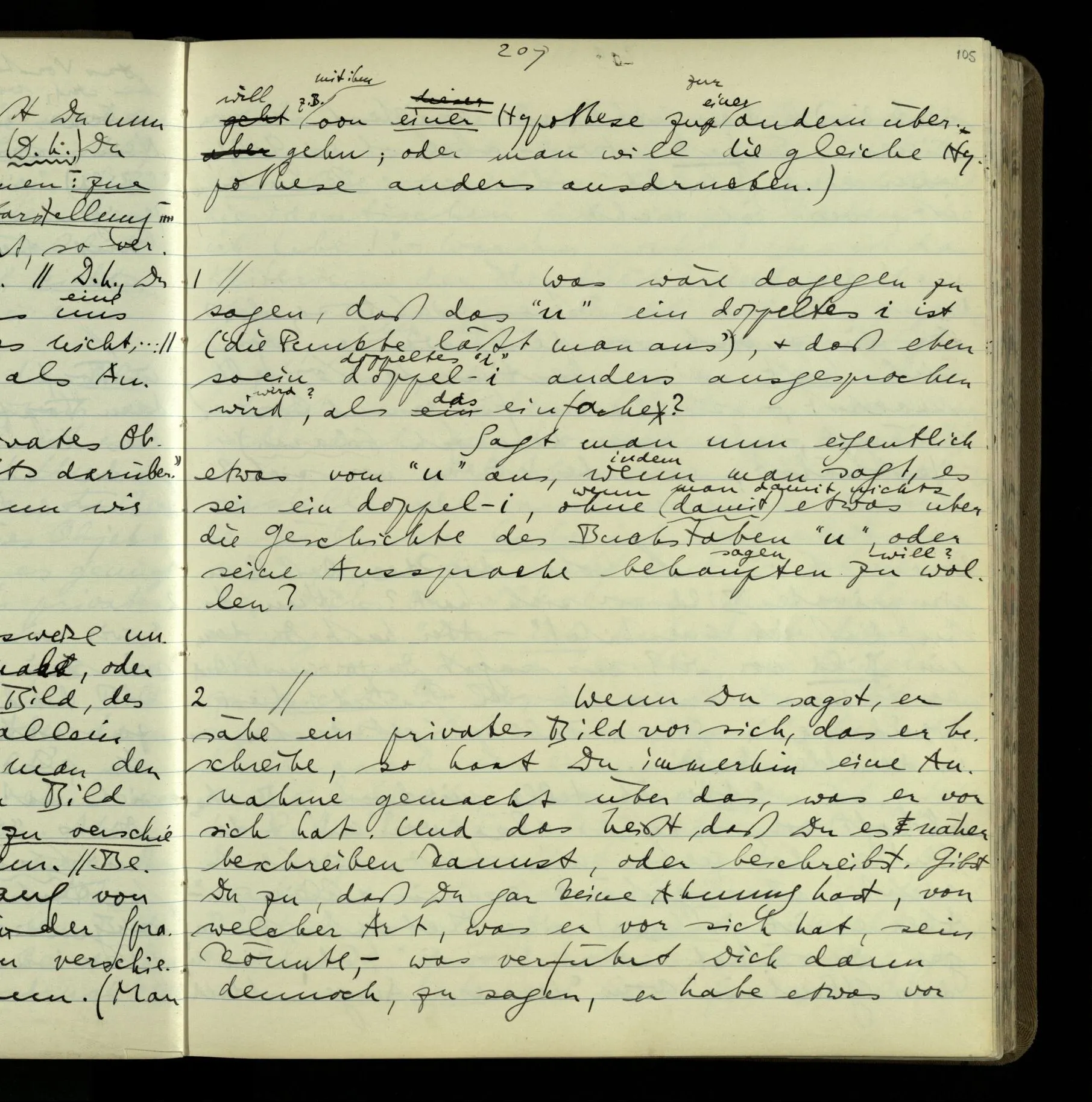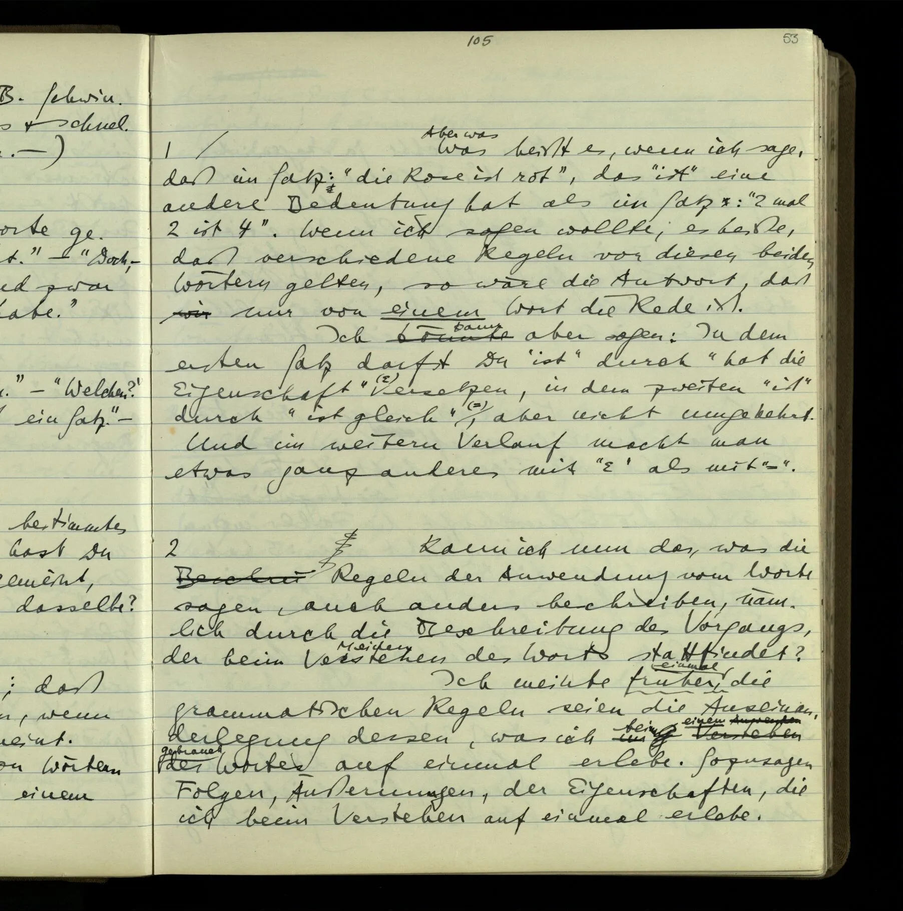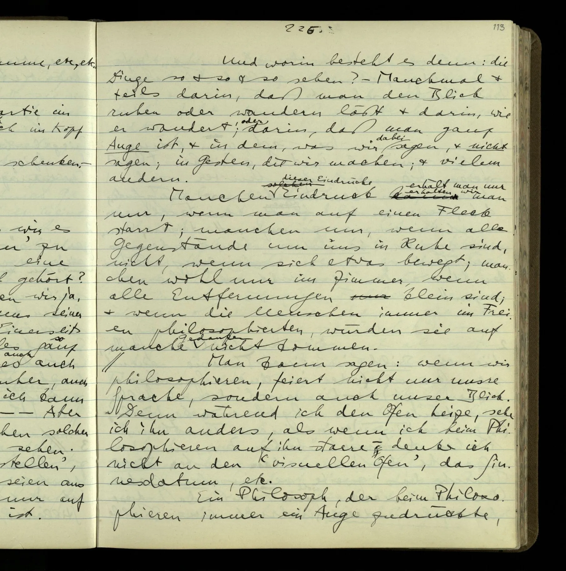 2 Geben wir denn den Worten, die uns gesagt werden, willkürlich Interpretationen? Kommt nicht das Erlebnis des Verstehens mit dem Erlebnis des Hörens (oder Sehens) der Zeichen, wenn wir die Sprache verstehen? Wenn mir jemand etwas sagt & ich verstehe (es), so geschieht mir dies, so wie, daß ich höre. Und hier ist also Verstehen das Phänomen, – die Phänomene, welche sich einstellen, wenn ich einen deutschen Satz höre, & die dieses Hören unterscheiden von dem eines Satzes einer mir unbekannten Sprache.