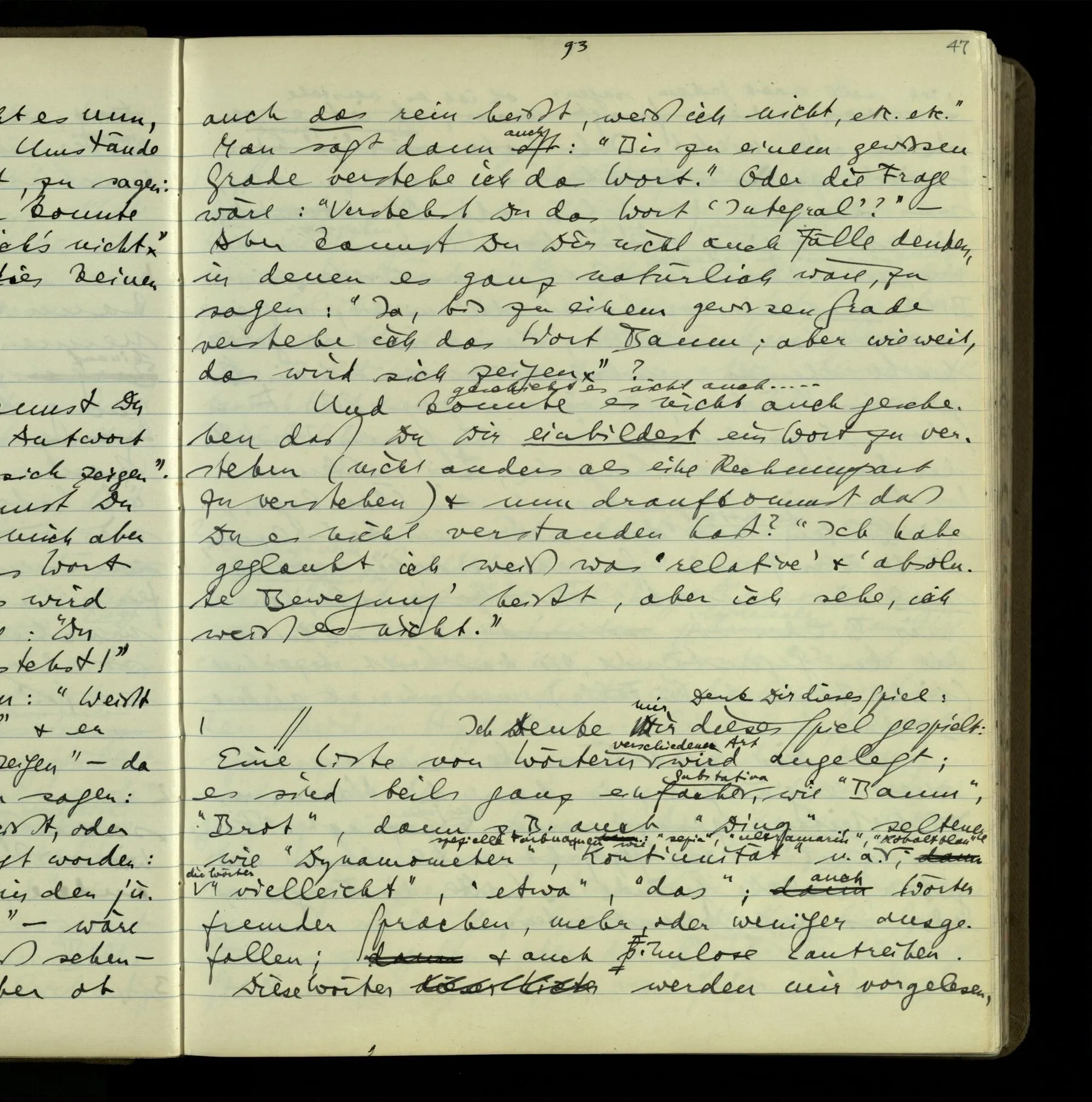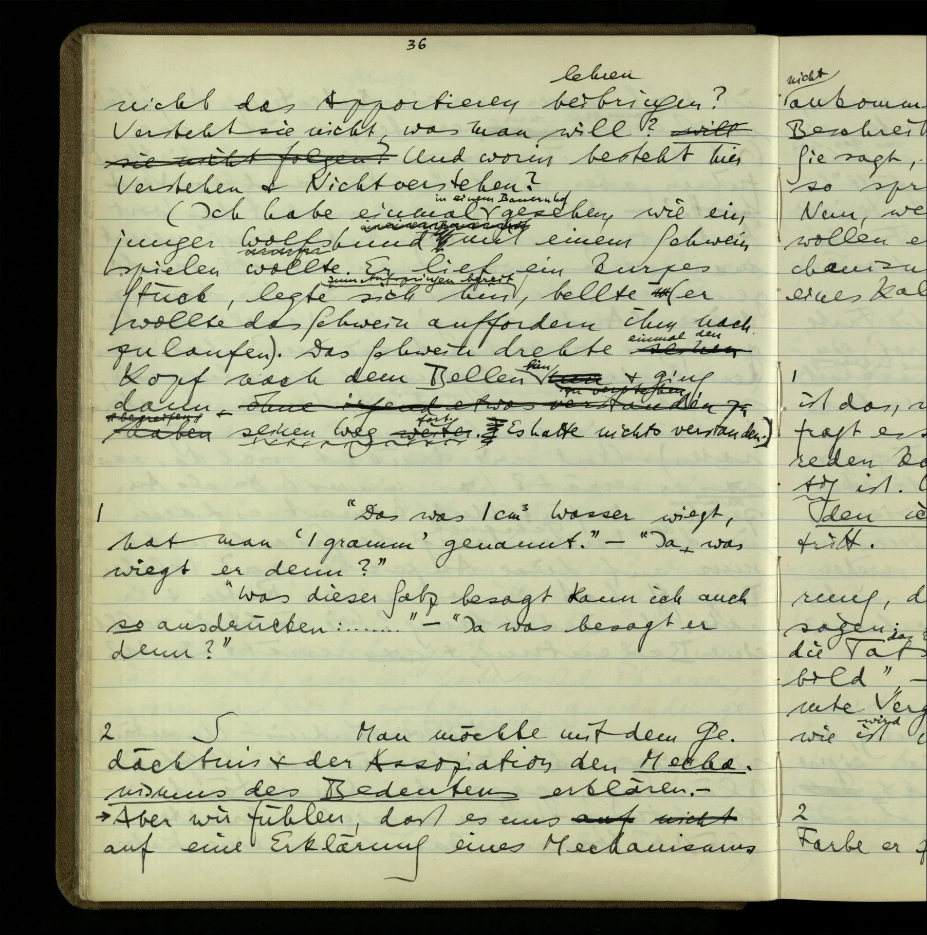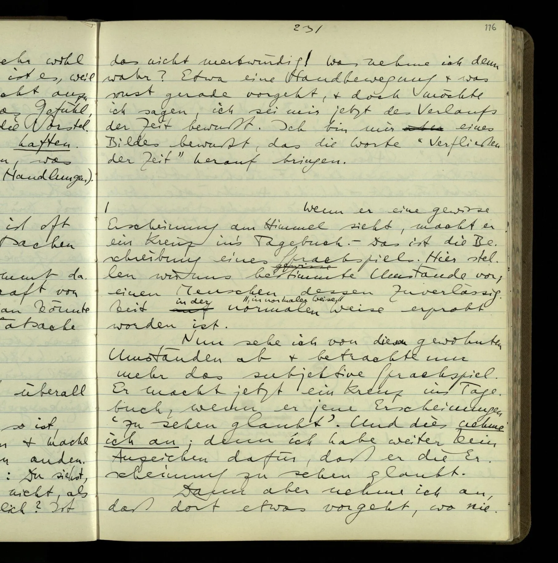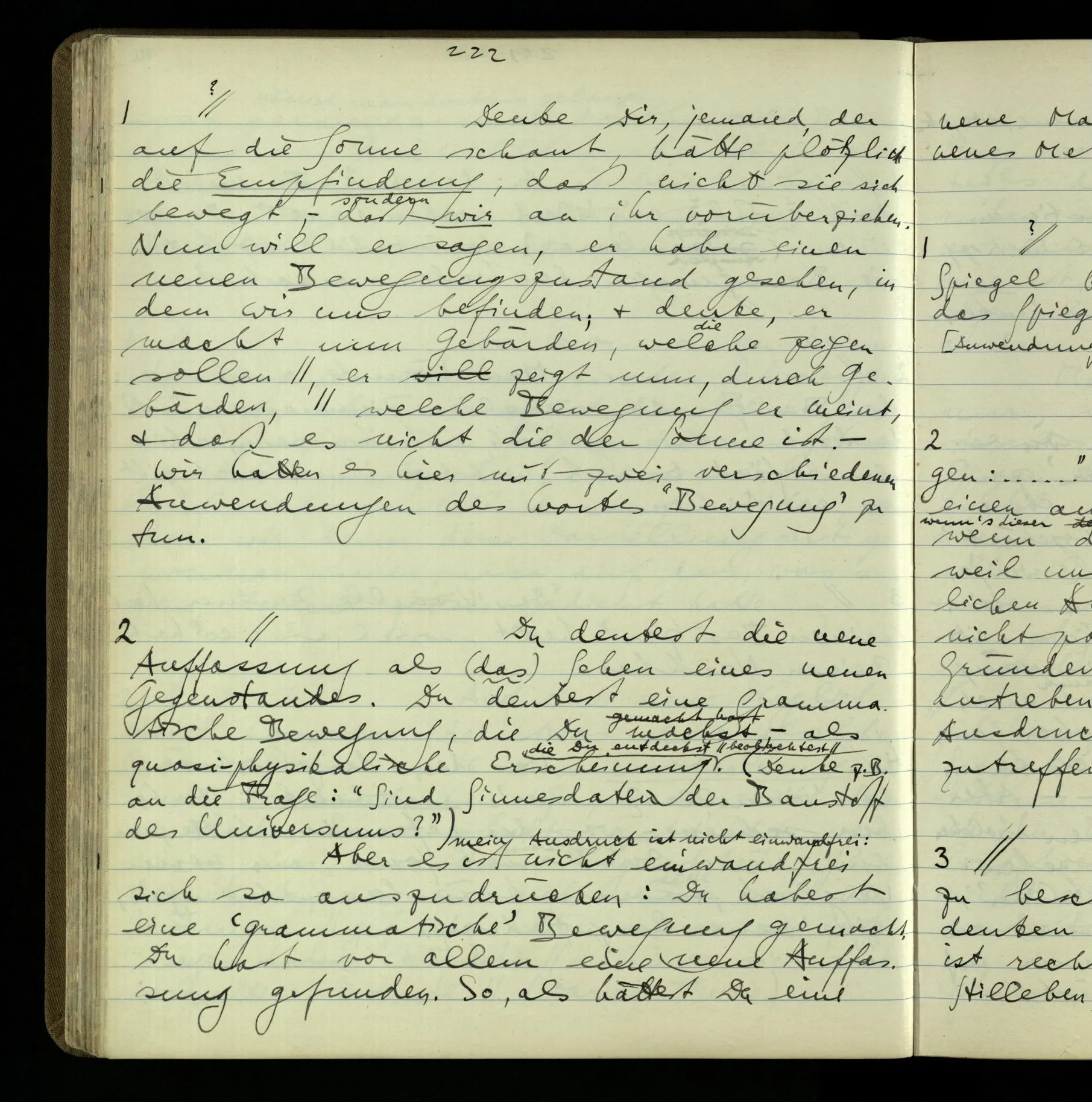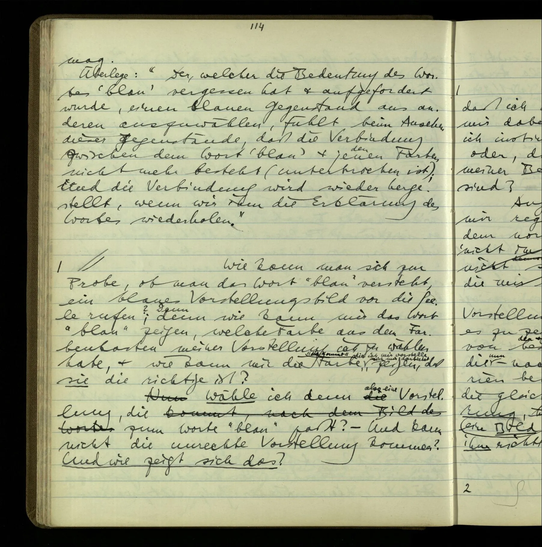 2 Geben wir denn den Worten, die uns gesagt werden, willkürlich Interpretationen? Kommt nicht das Erlebnis des Verstehens mit dem Erlebnis des Hörens (oder Sehens) der Zeichen, wenn wir die Sprache verstehen? Wenn mir jemand etwas sagt & ich verstehe (es), so geschieht mir dies, so wie, daß ich höre. Und hier ist also Verstehen das Phänomen, – die Phänomene, welche sich einstellen, wenn ich einen deutschen Satz höre, & die dieses Hören unterscheiden von dem eines Satzes einer mir unbekannten Sprache.