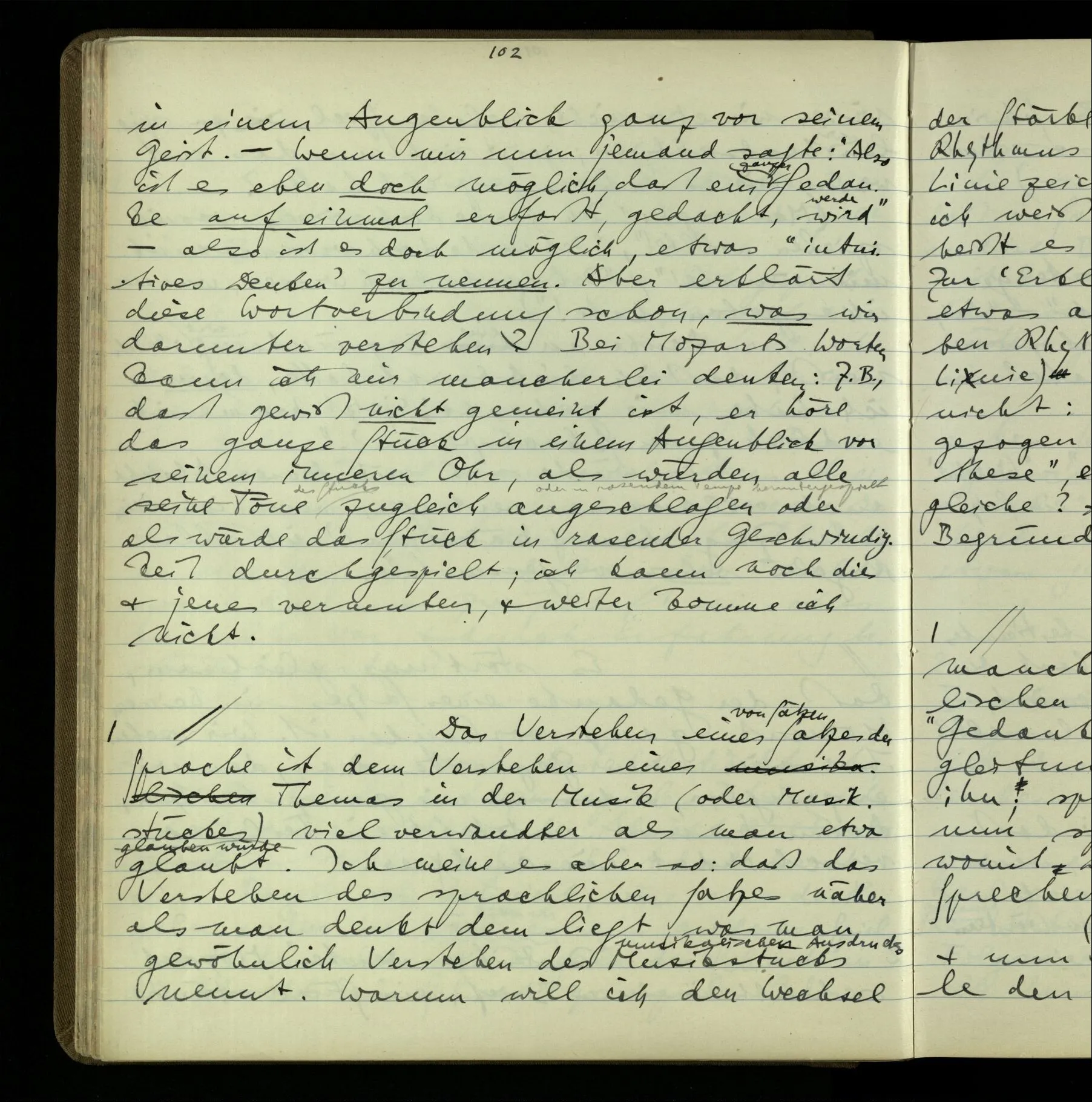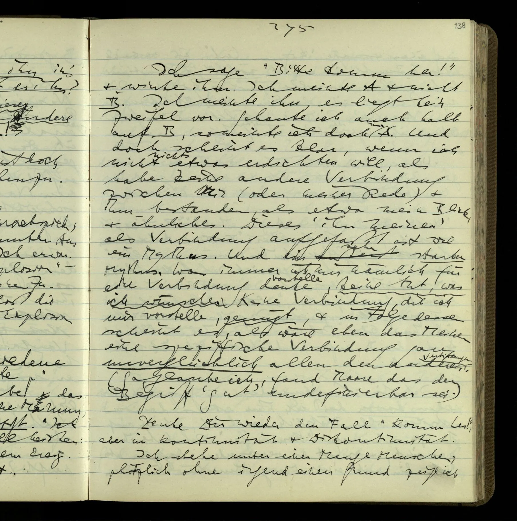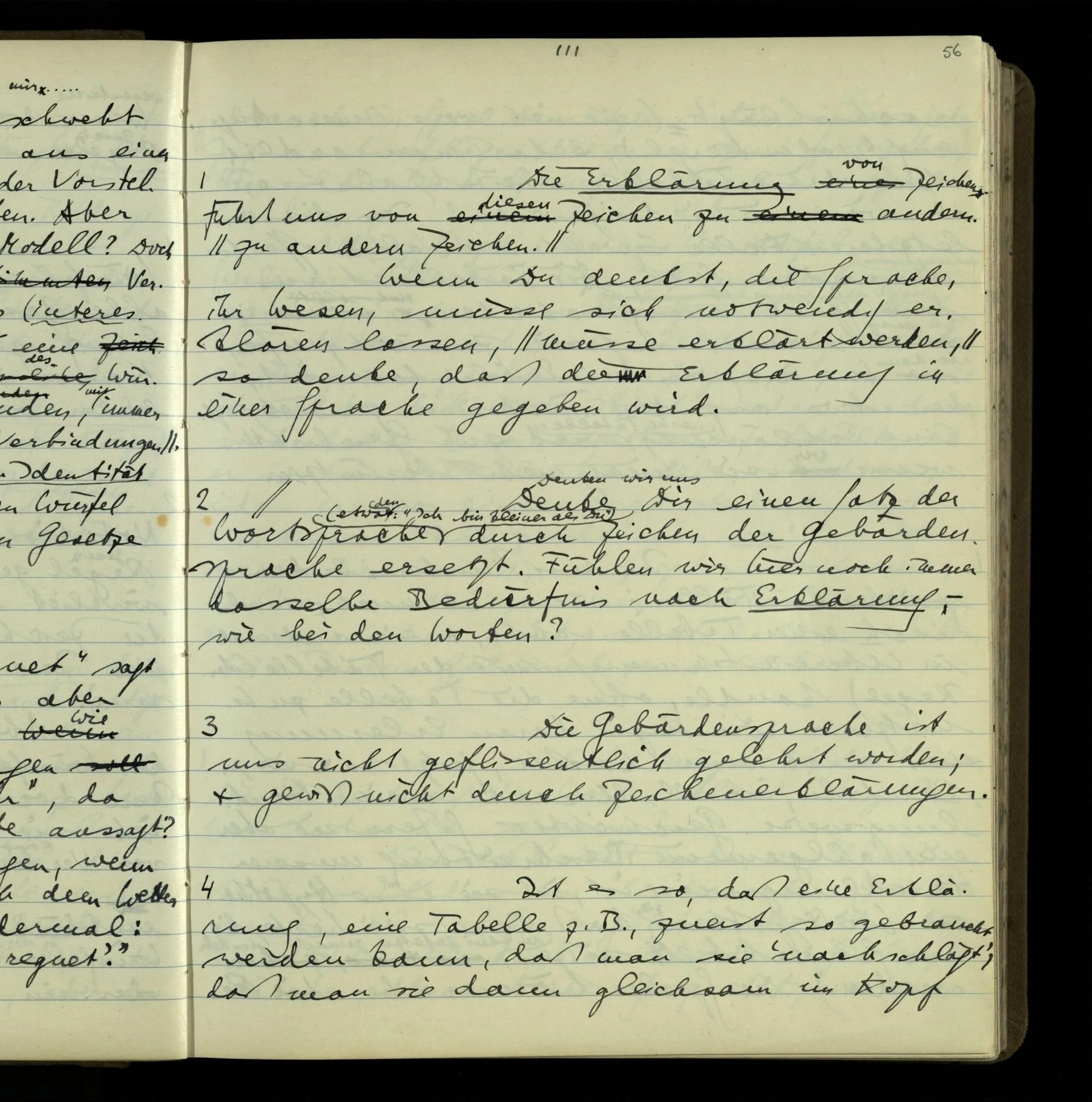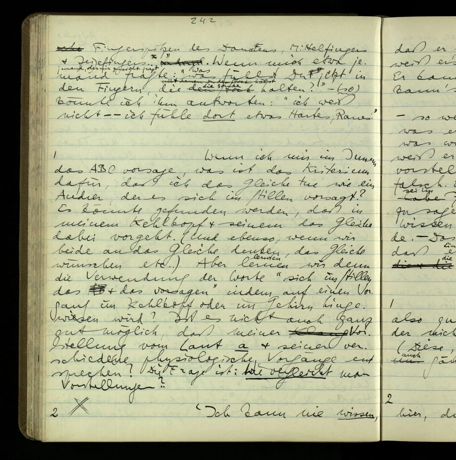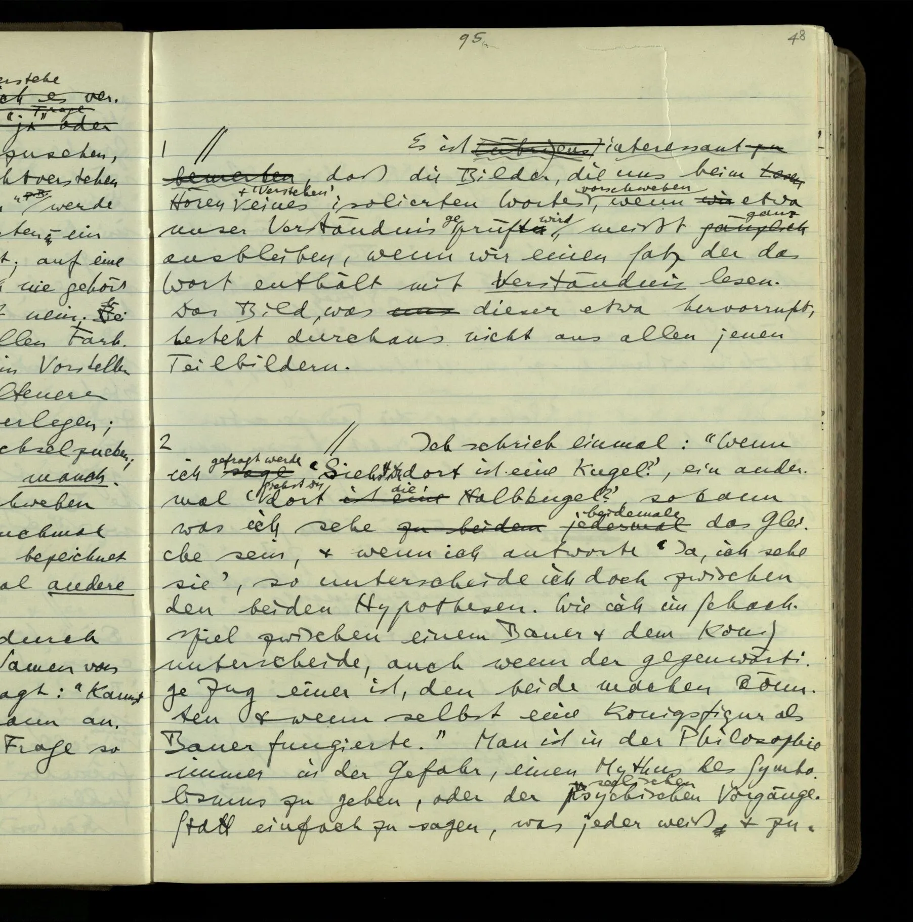 2 Geben wir denn den Worten, die uns gesagt werden, willkürlich Interpretationen? Kommt nicht das Erlebnis des Verstehens mit dem Erlebnis des Hörens (oder Sehens) der Zeichen, wenn wir die Sprache verstehen? Wenn mir jemand etwas sagt & ich verstehe (es), so geschieht mir dies, so wie, daß ich höre. Und hier ist also Verstehen das Phänomen, – die Phänomene, welche sich einstellen, wenn ich einen deutschen Satz höre, & die dieses Hören unterscheiden von dem eines Satzes einer mir unbekannten Sprache.