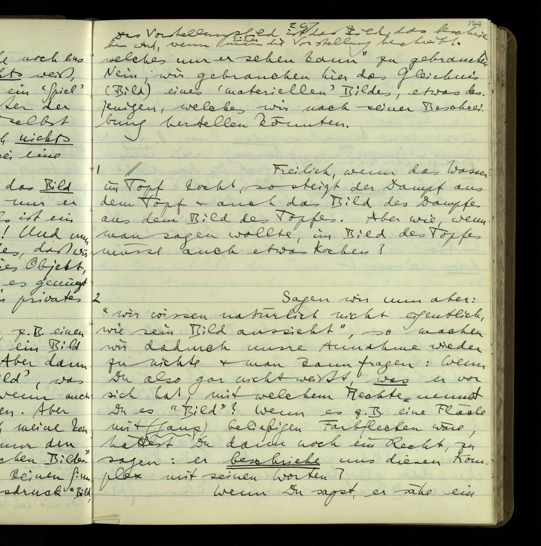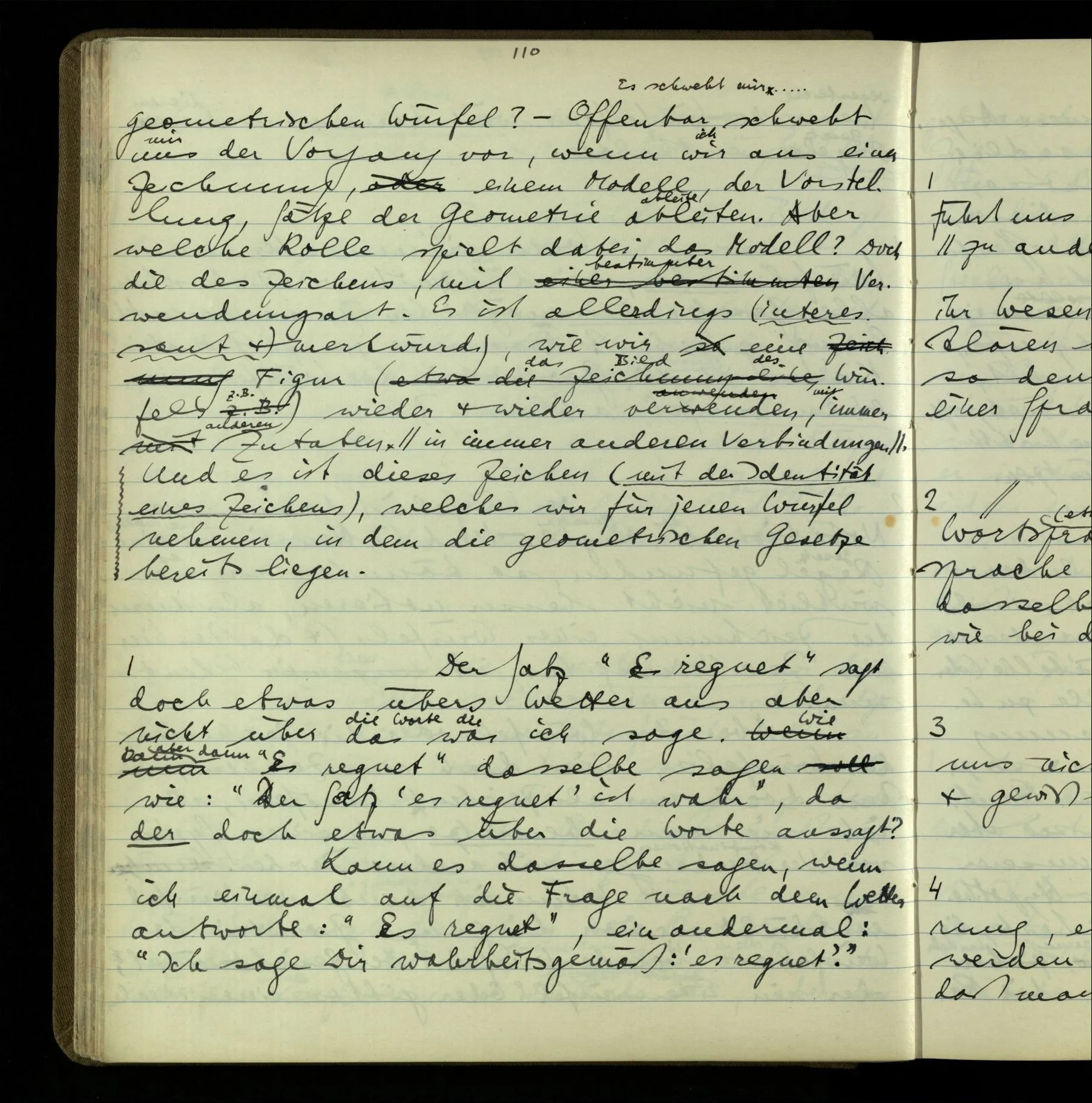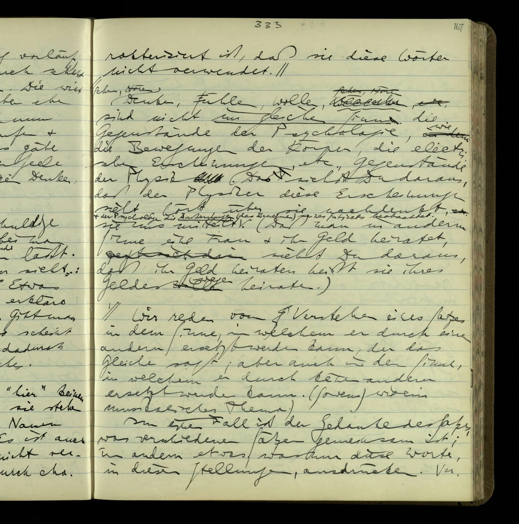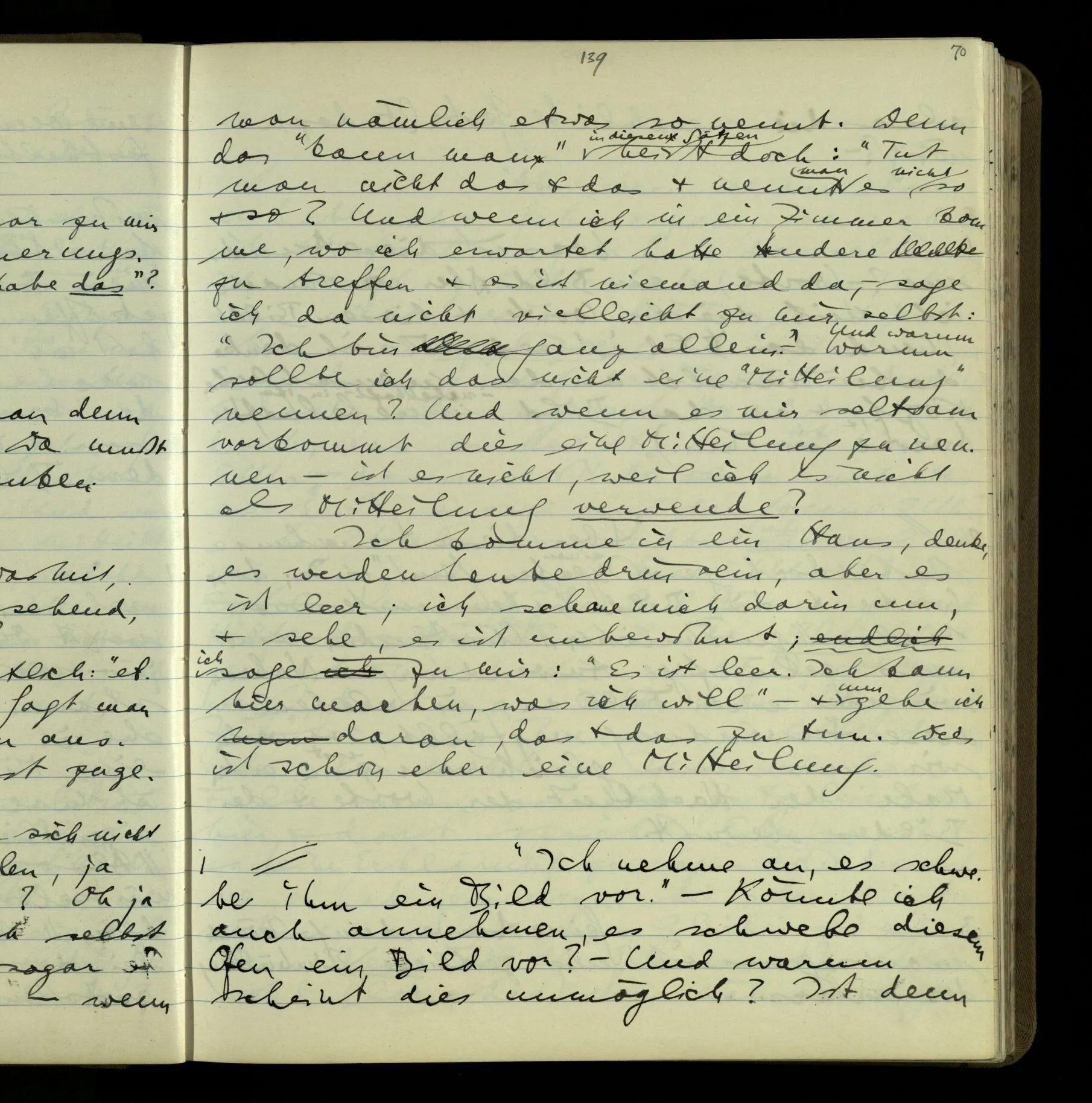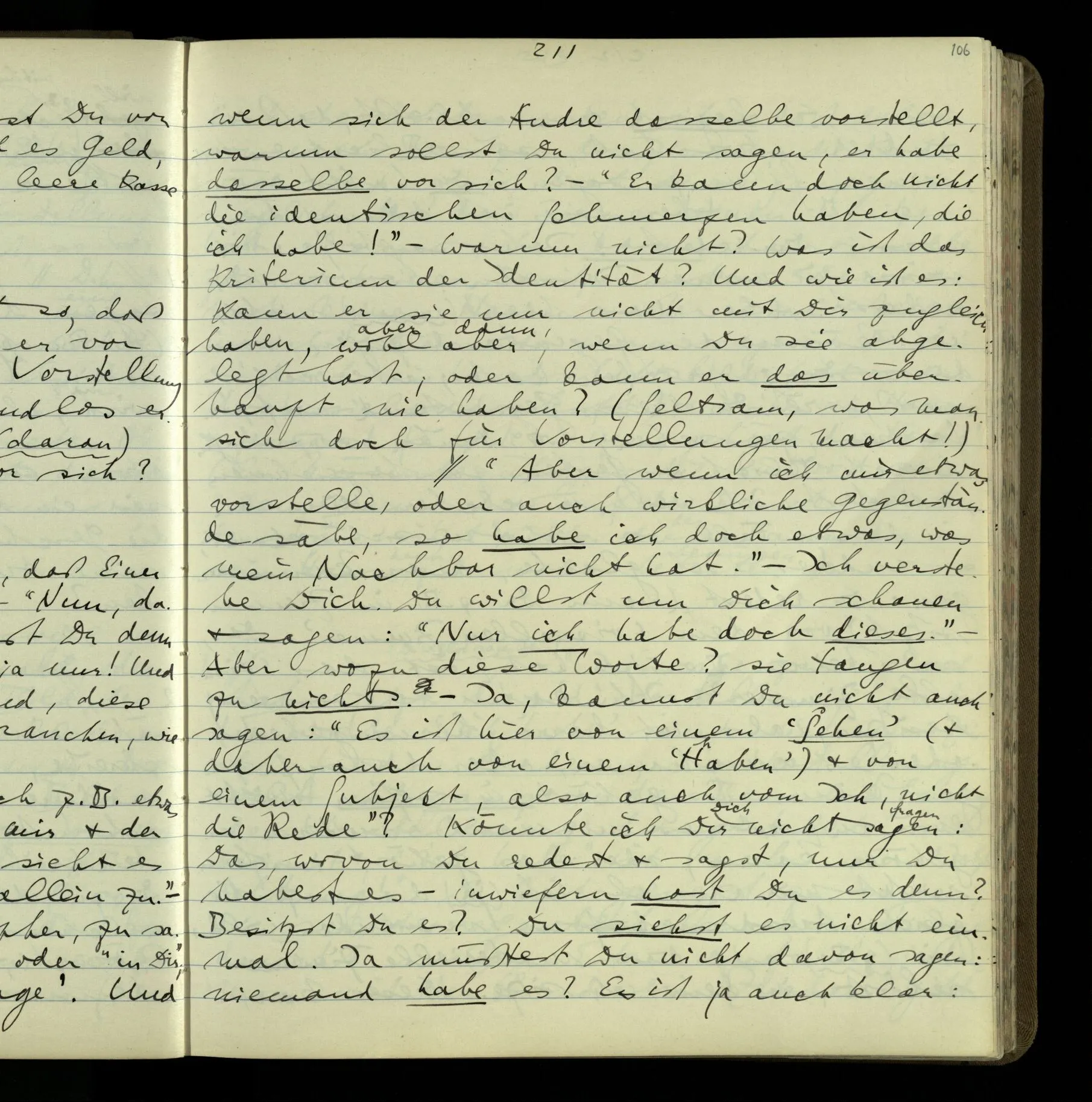 2 Geben wir denn den Worten, die uns gesagt werden, willkürlich Interpretationen? Kommt nicht das Erlebnis des Verstehens mit dem Erlebnis des Hörens (oder Sehens) der Zeichen, wenn wir die Sprache verstehen? Wenn mir jemand etwas sagt & ich verstehe (es), so geschieht mir dies, so wie, daß ich höre. Und hier ist also Verstehen das Phänomen, – die Phänomene, welche sich einstellen, wenn ich einen deutschen Satz höre, & die dieses Hören unterscheiden von dem eines Satzes einer mir unbekannten Sprache.