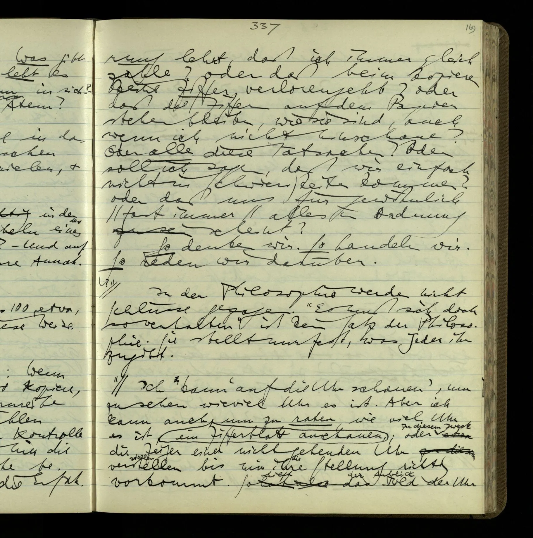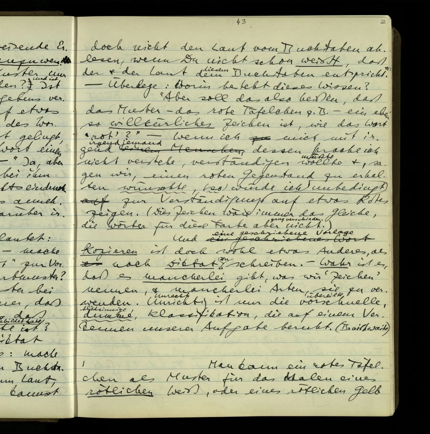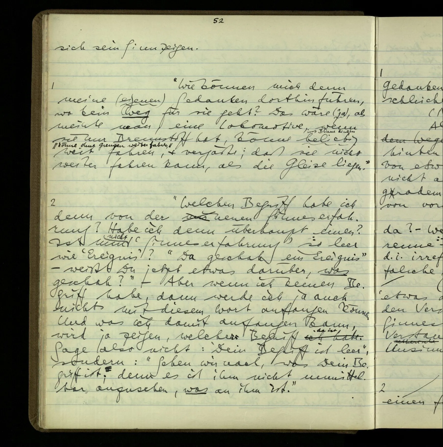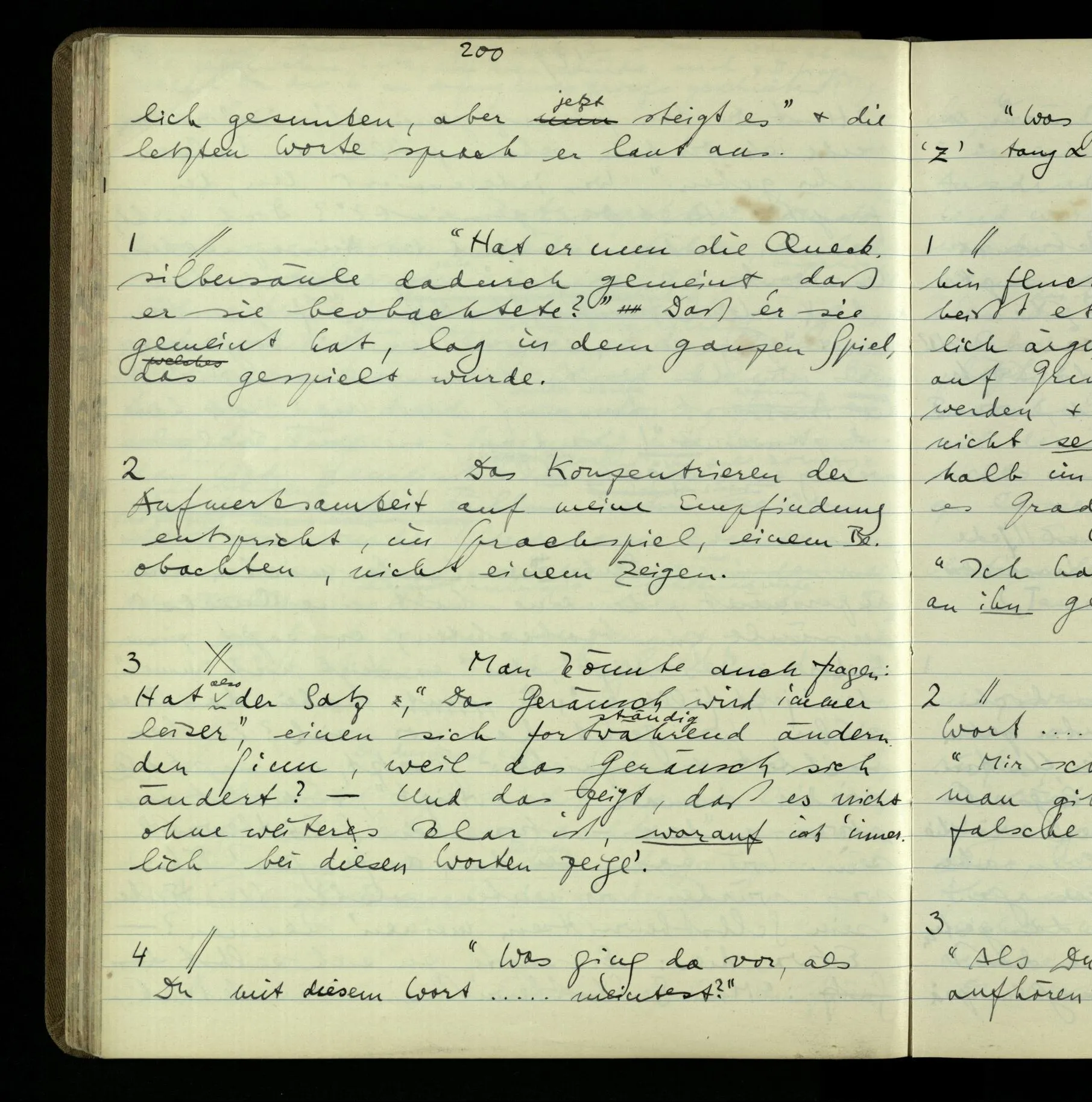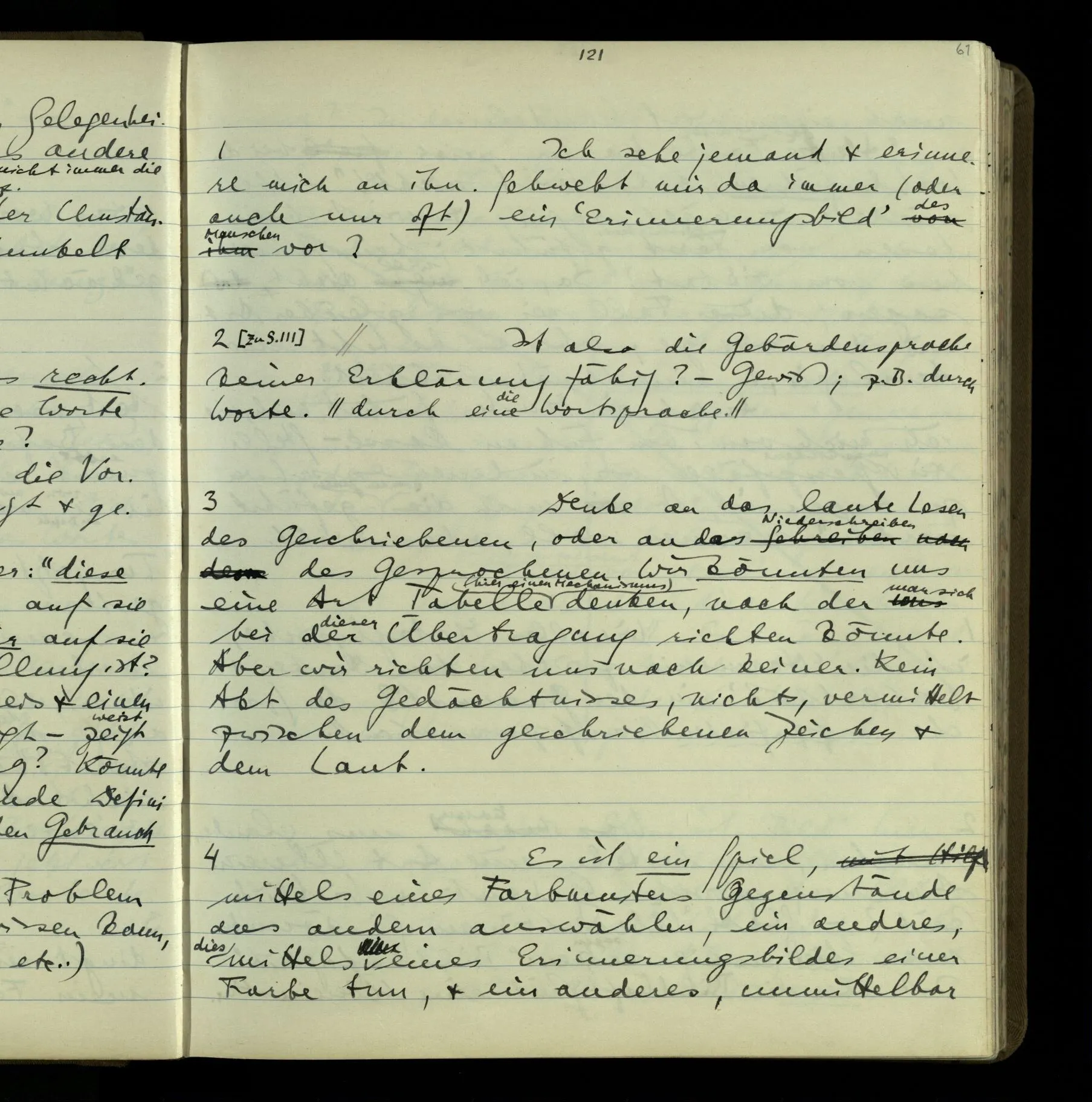 2 Geben wir denn den Worten, die uns gesagt werden, willkürlich Interpretationen? Kommt nicht das Erlebnis des Verstehens mit dem Erlebnis des Hörens (oder Sehens) der Zeichen, wenn wir die Sprache verstehen? Wenn mir jemand etwas sagt & ich verstehe (es), so geschieht mir dies, so wie, daß ich höre. Und hier ist also Verstehen das Phänomen, – die Phänomene, welche sich einstellen, wenn ich einen deutschen Satz höre, & die dieses Hören unterscheiden von dem eines Satzes einer mir unbekannten Sprache.