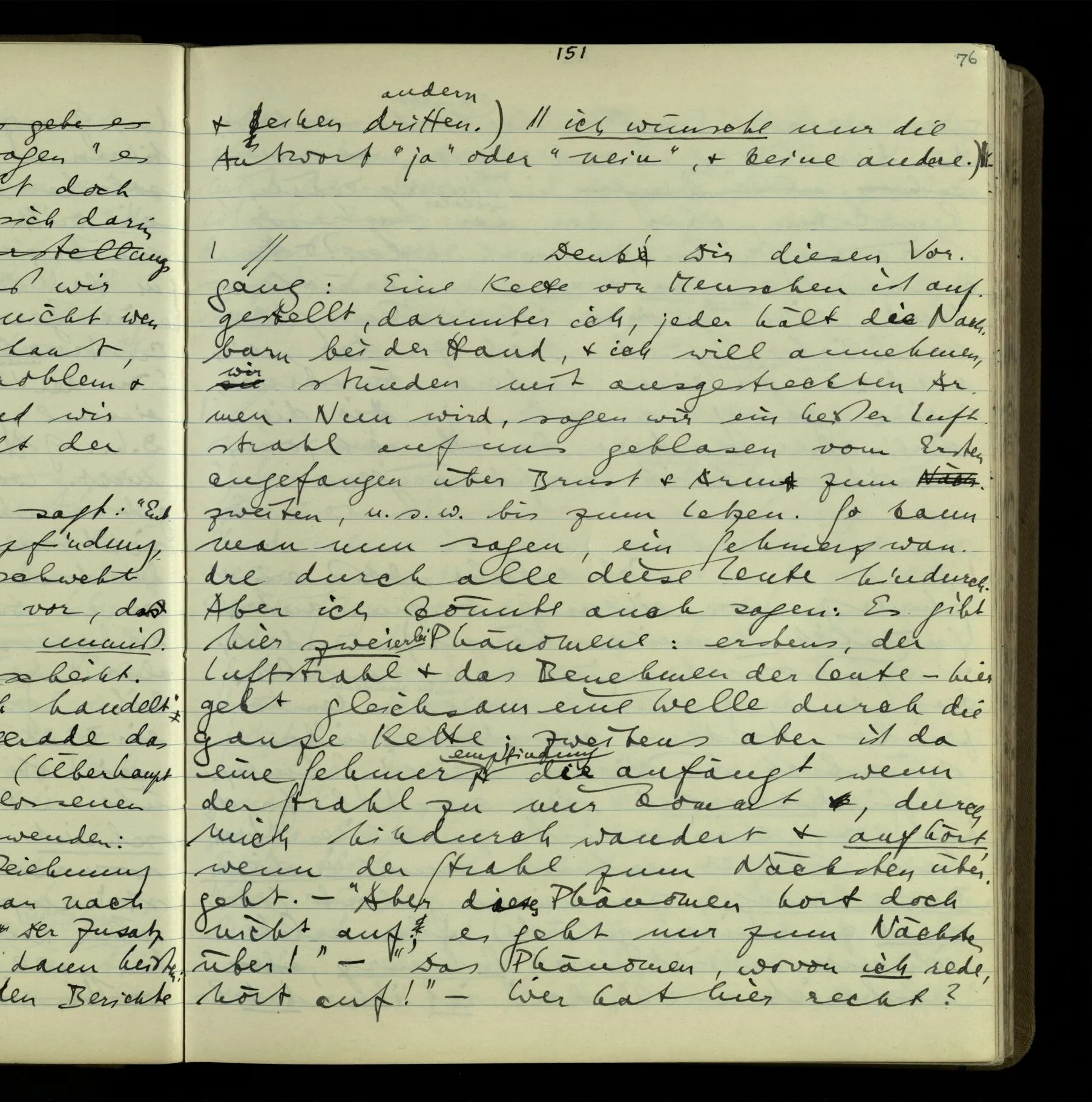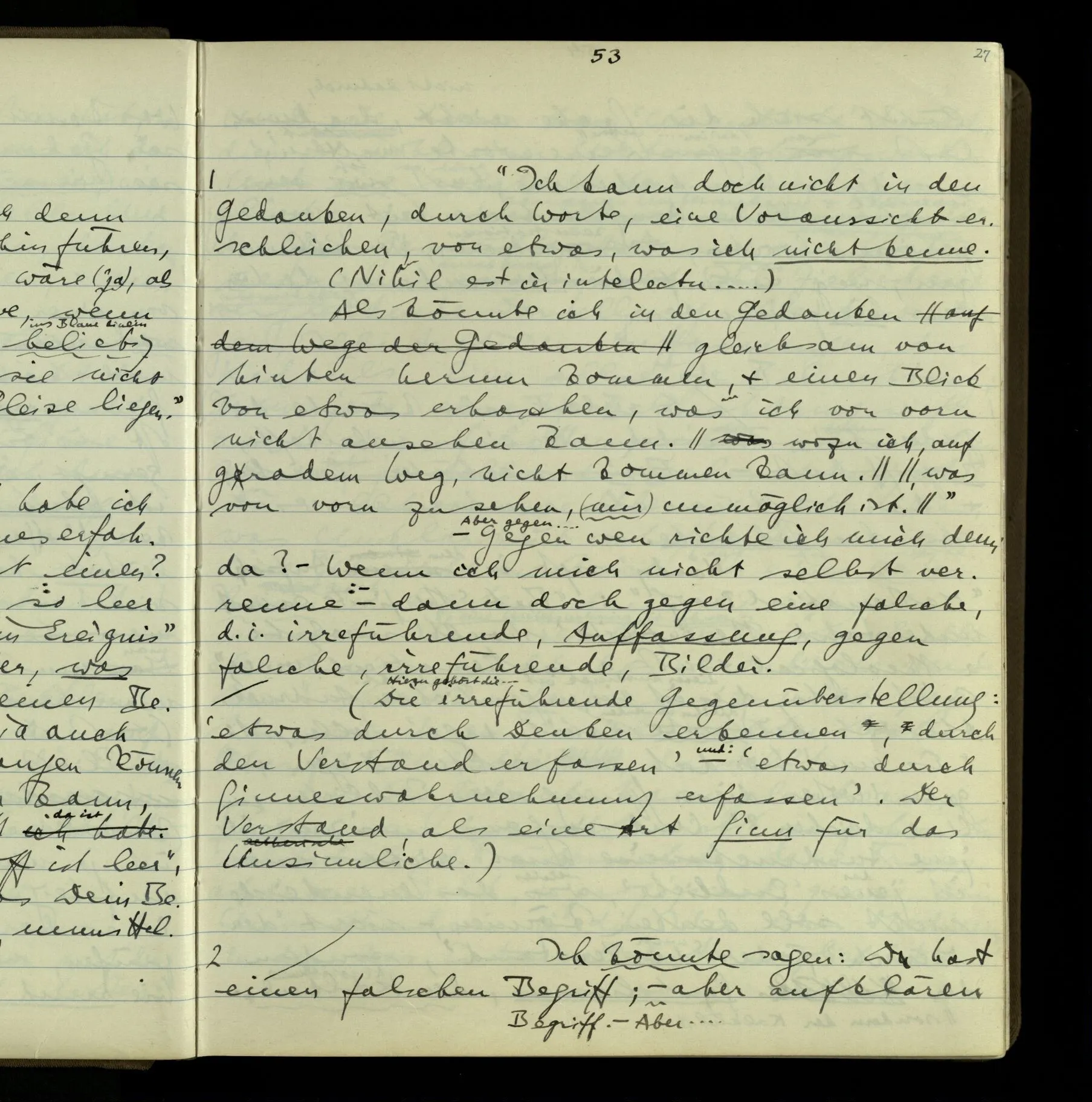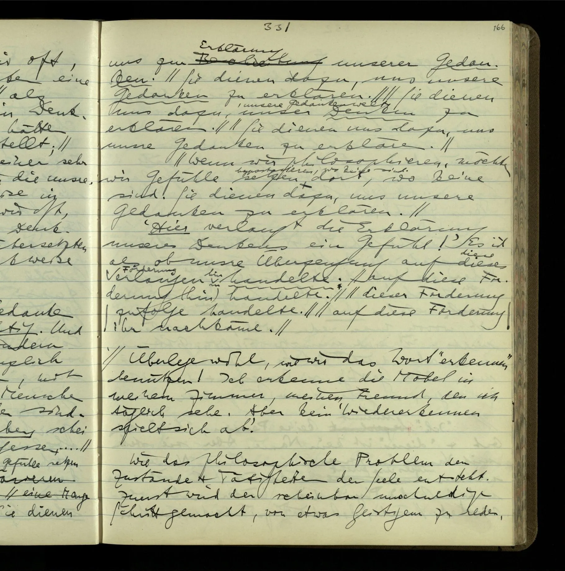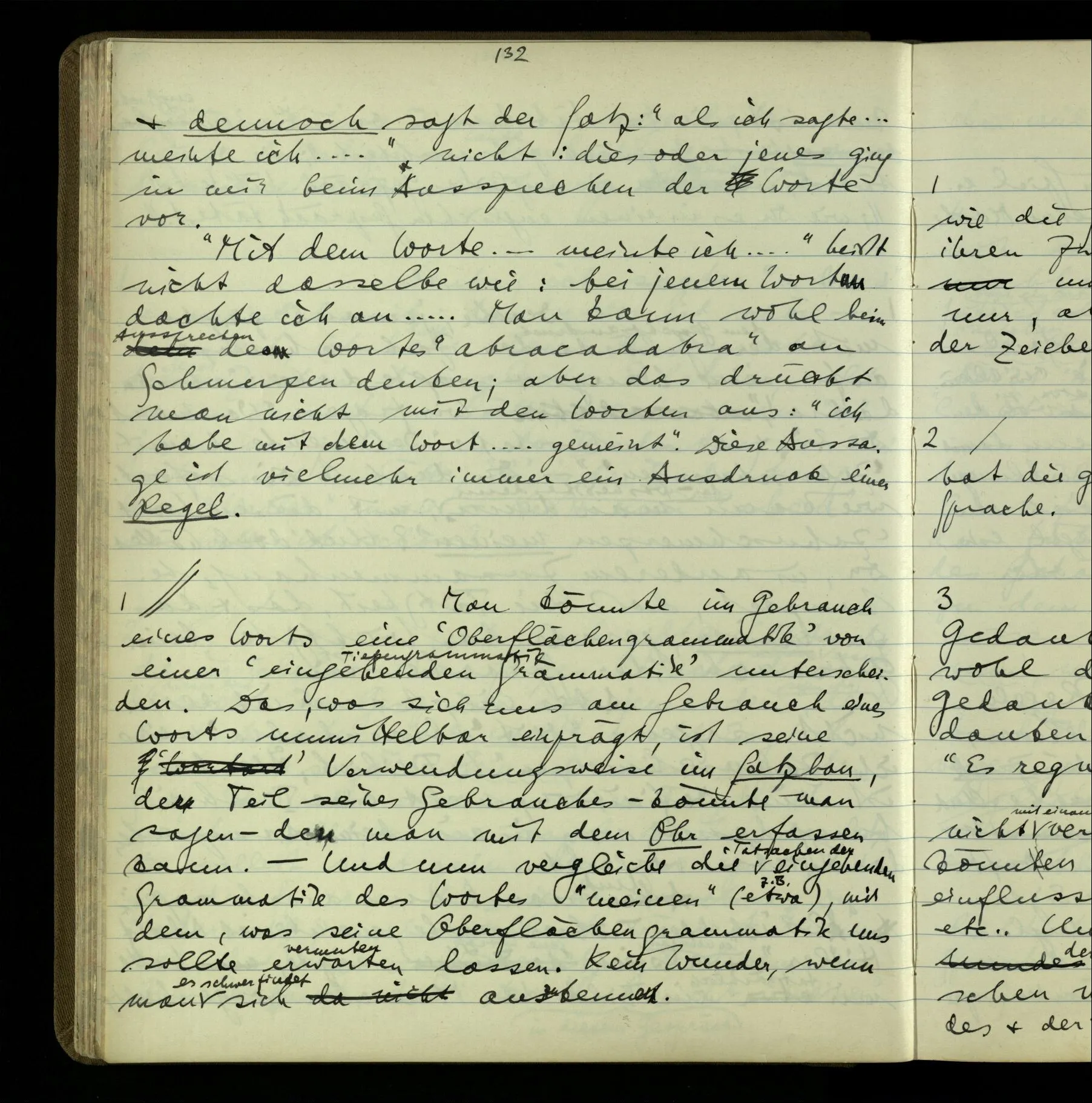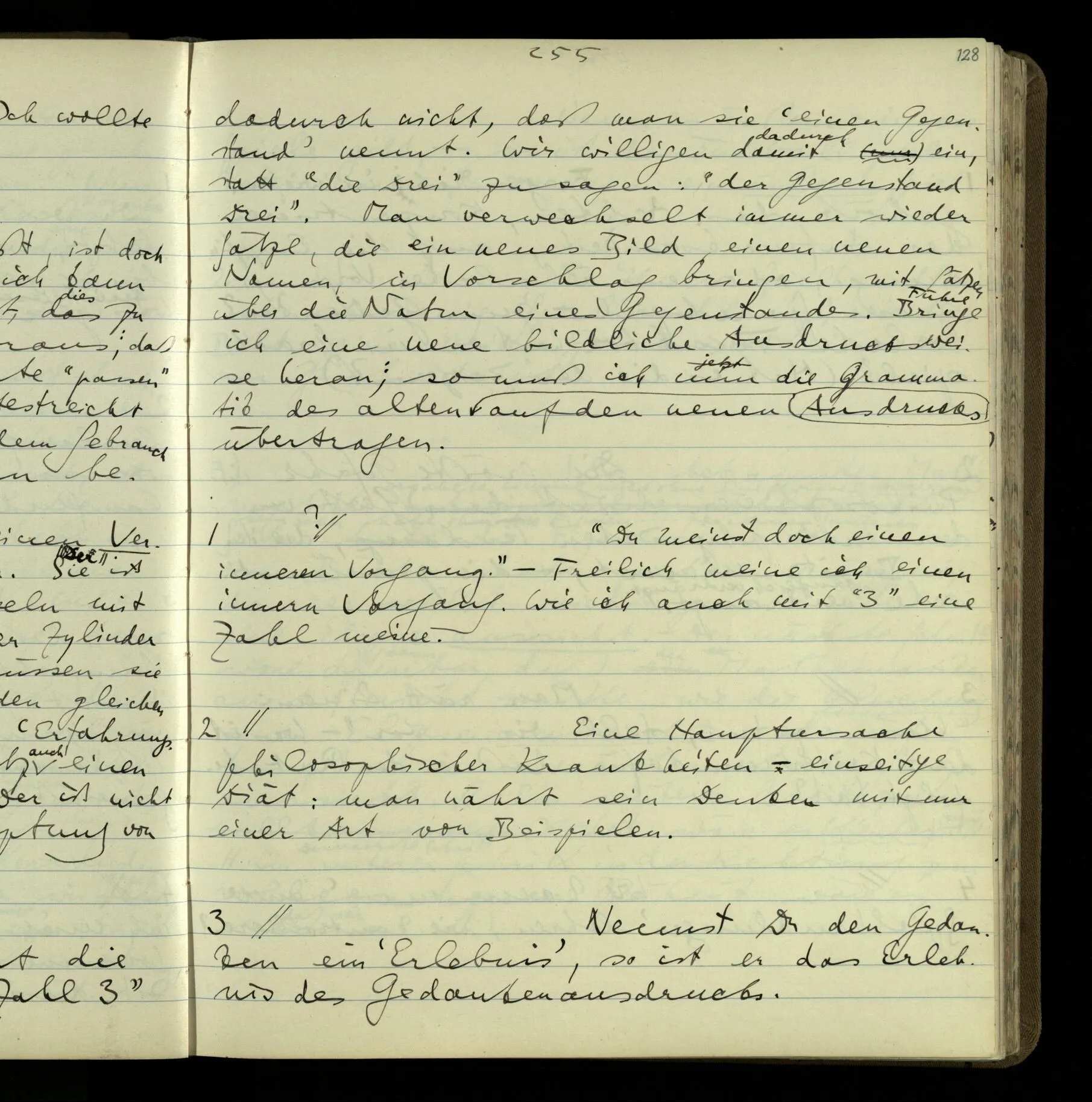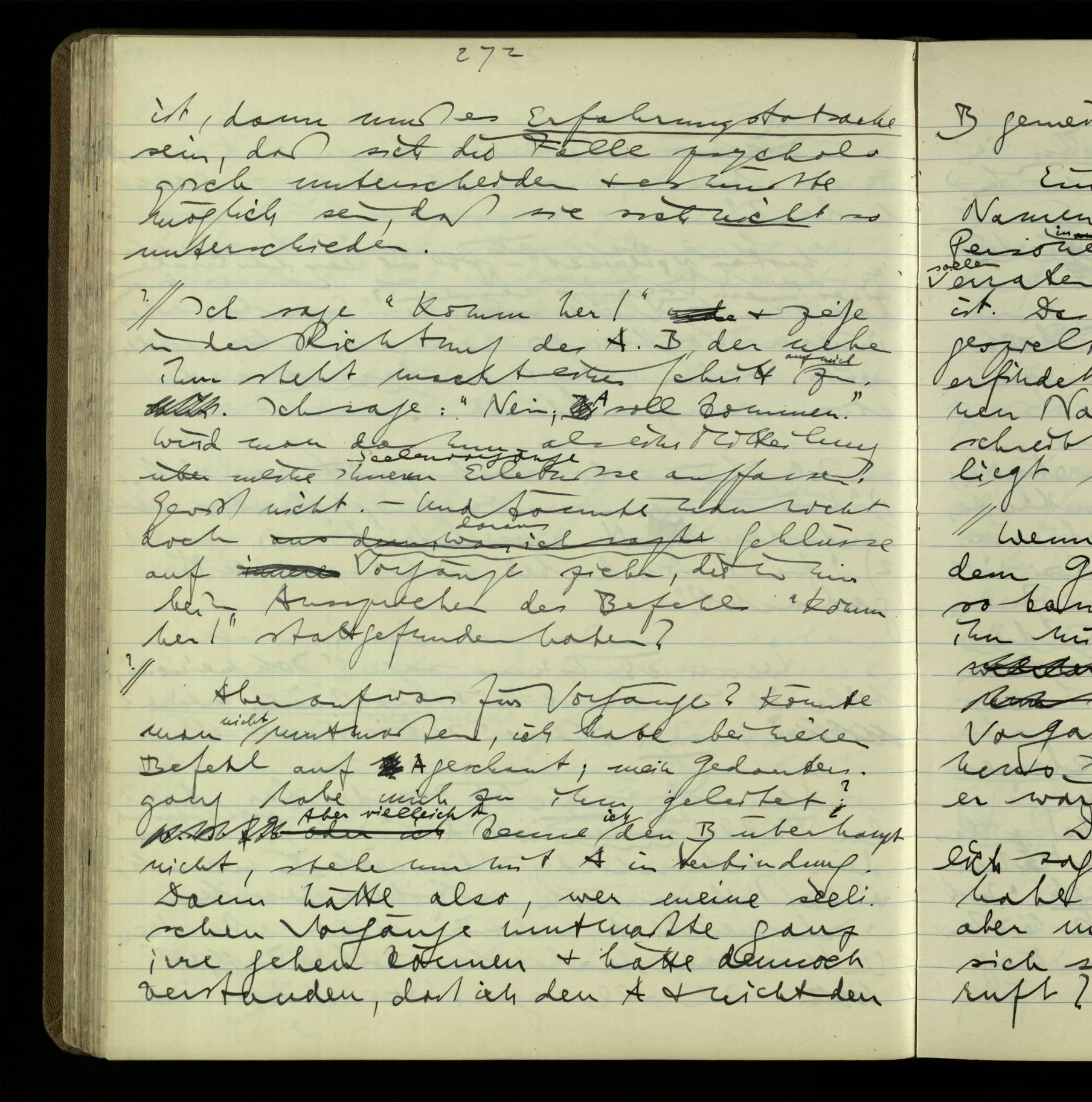 2 Geben wir denn den Worten, die uns gesagt werden, willkürlich Interpretationen? Kommt nicht das Erlebnis des Verstehens mit dem Erlebnis des Hörens (oder Sehens) der Zeichen, wenn wir die Sprache verstehen? Wenn mir jemand etwas sagt & ich verstehe (es), so geschieht mir dies, so wie, daß ich höre. Und hier ist also Verstehen das Phänomen, – die Phänomene, welche sich einstellen, wenn ich einen deutschen Satz höre, & die dieses Hören unterscheiden von dem eines Satzes einer mir unbekannten Sprache.