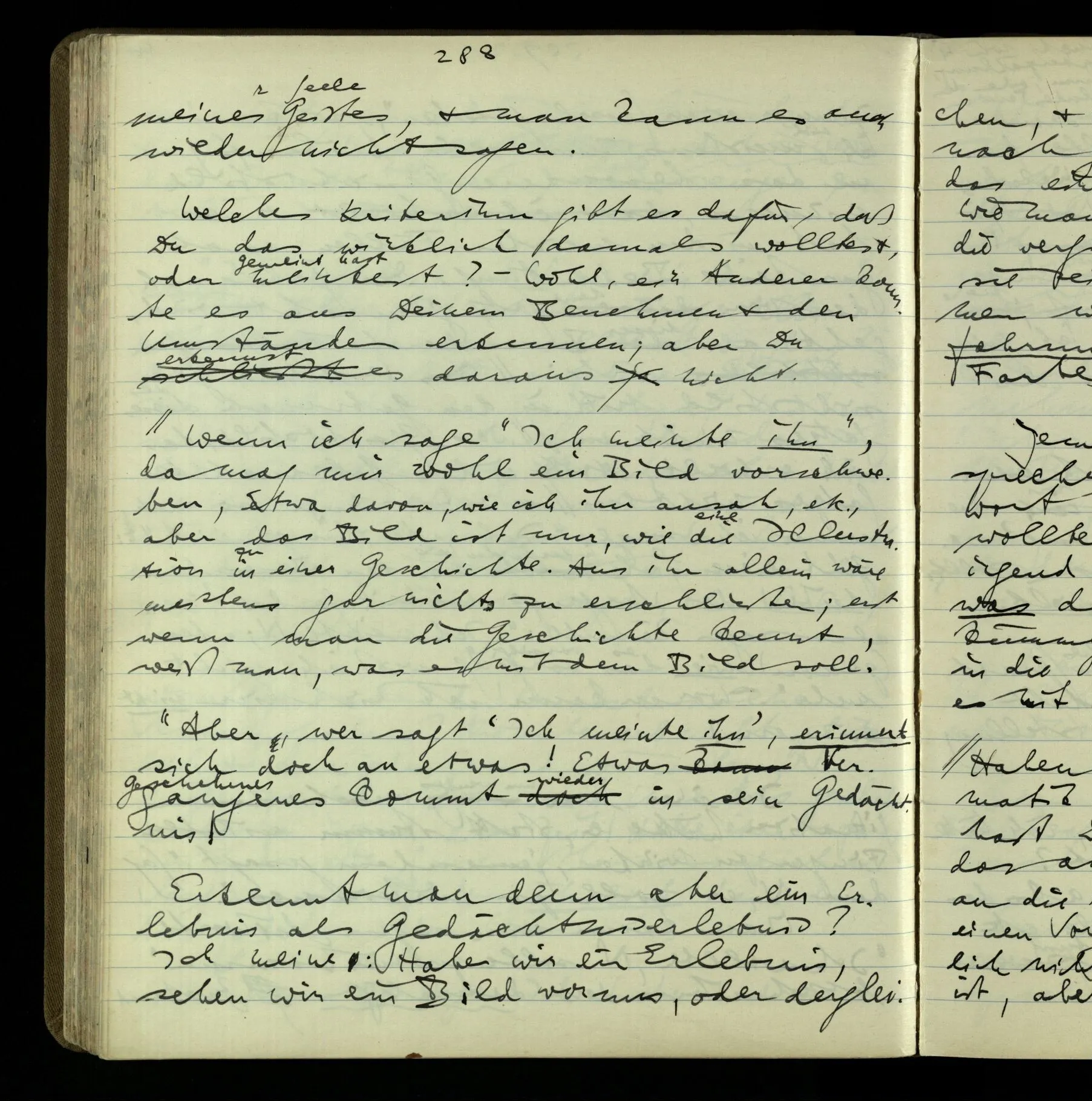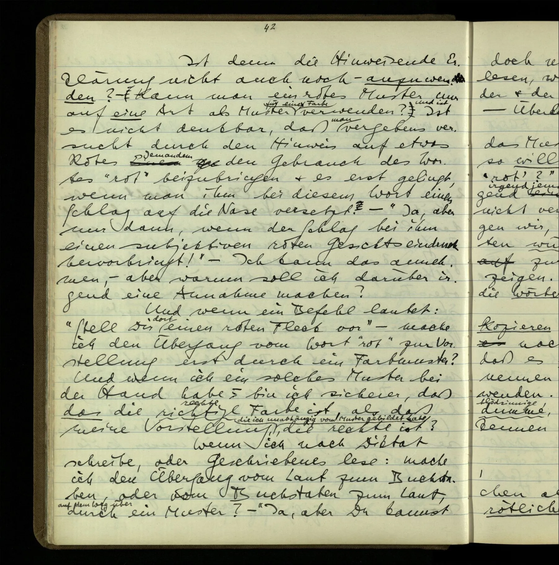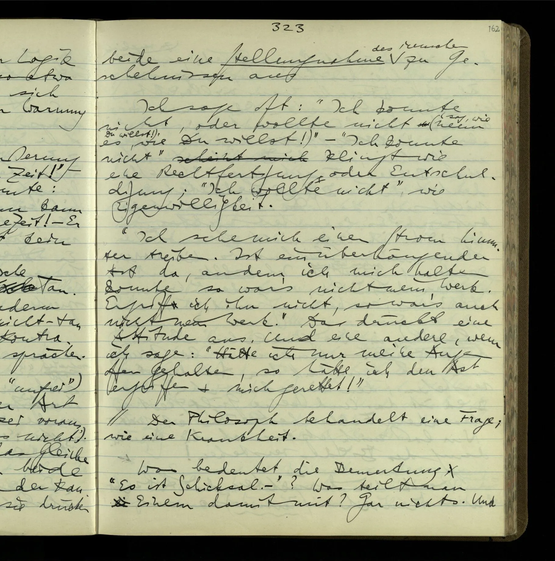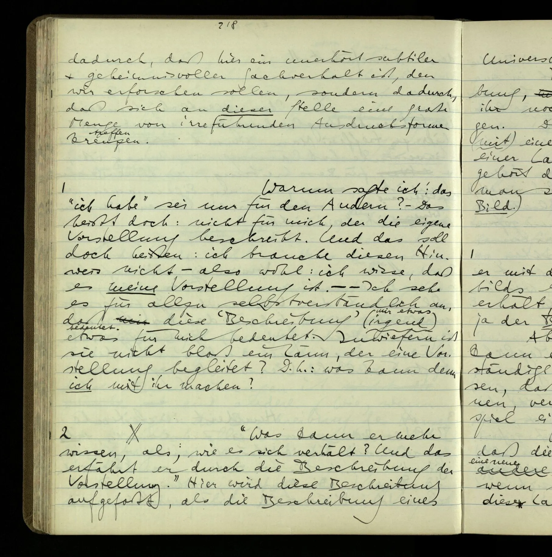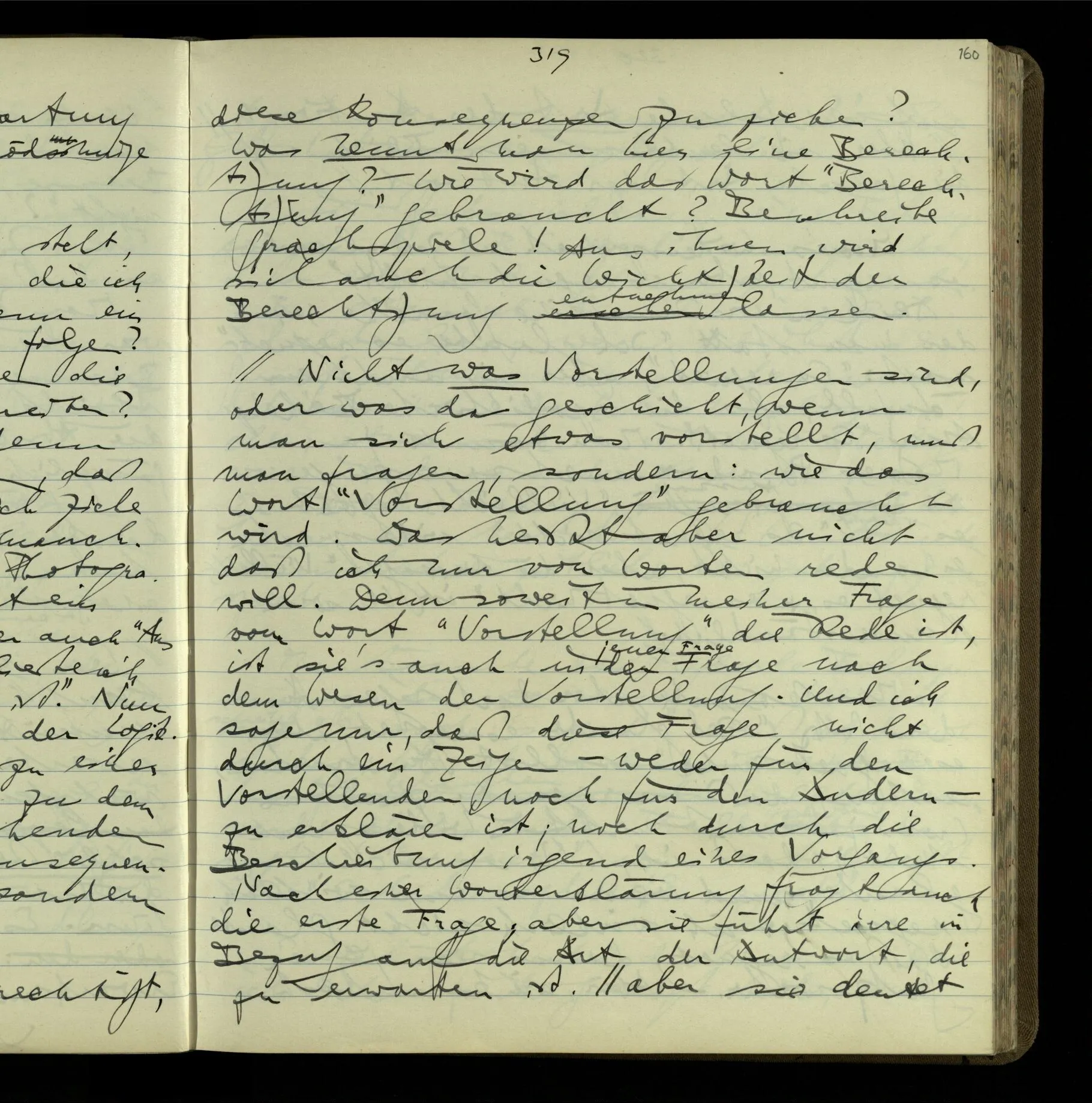 2 Geben wir denn den Worten, die uns gesagt werden, willkürlich Interpretationen? Kommt nicht das Erlebnis des Verstehens mit dem Erlebnis des Hörens (oder Sehens) der Zeichen, wenn wir die Sprache verstehen? Wenn mir jemand etwas sagt & ich verstehe (es), so geschieht mir dies, so wie, daß ich höre. Und hier ist also Verstehen das Phänomen, – die Phänomene, welche sich einstellen, wenn ich einen deutschen Satz höre, & die dieses Hören unterscheiden von dem eines Satzes einer mir unbekannten Sprache.