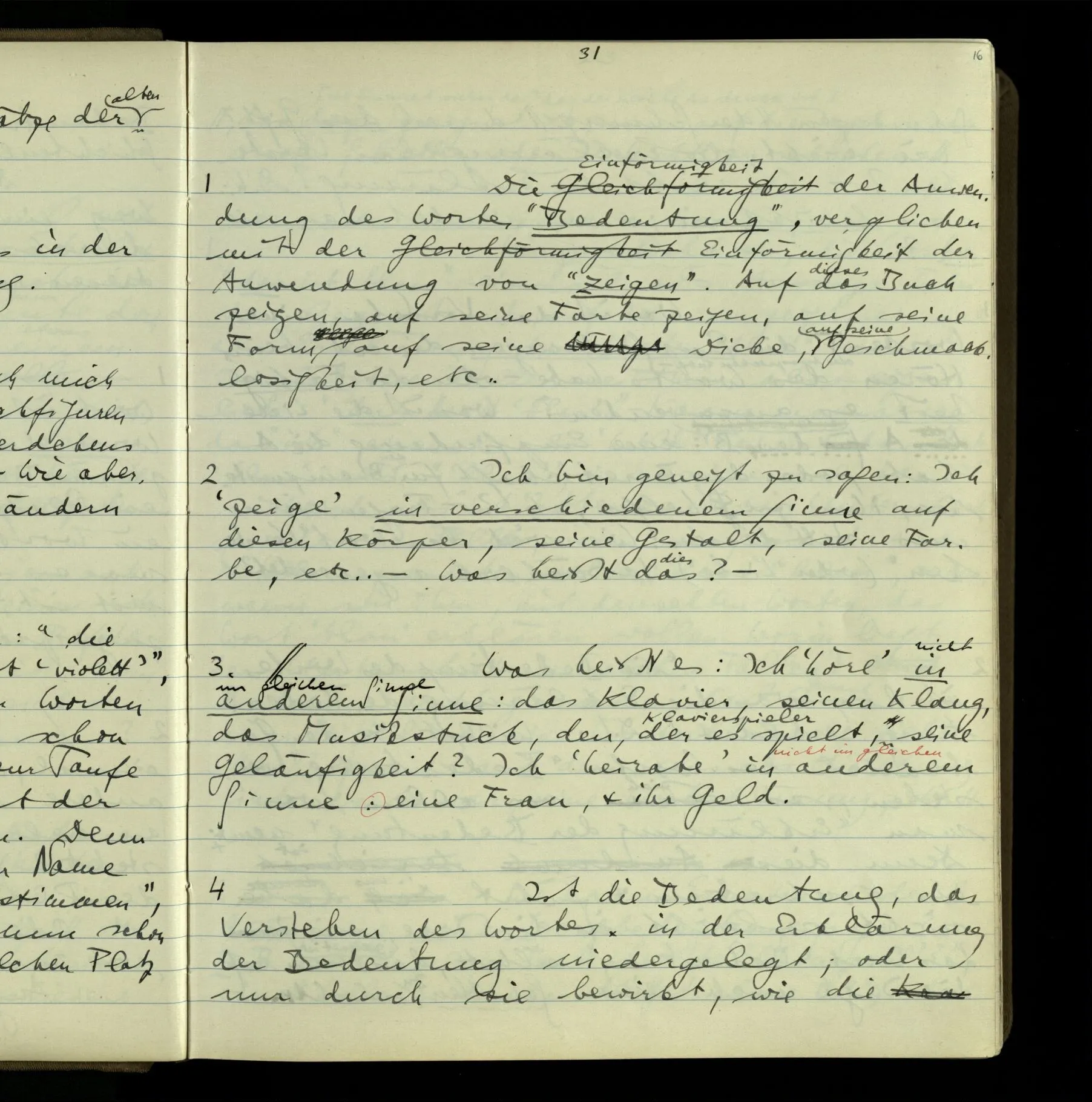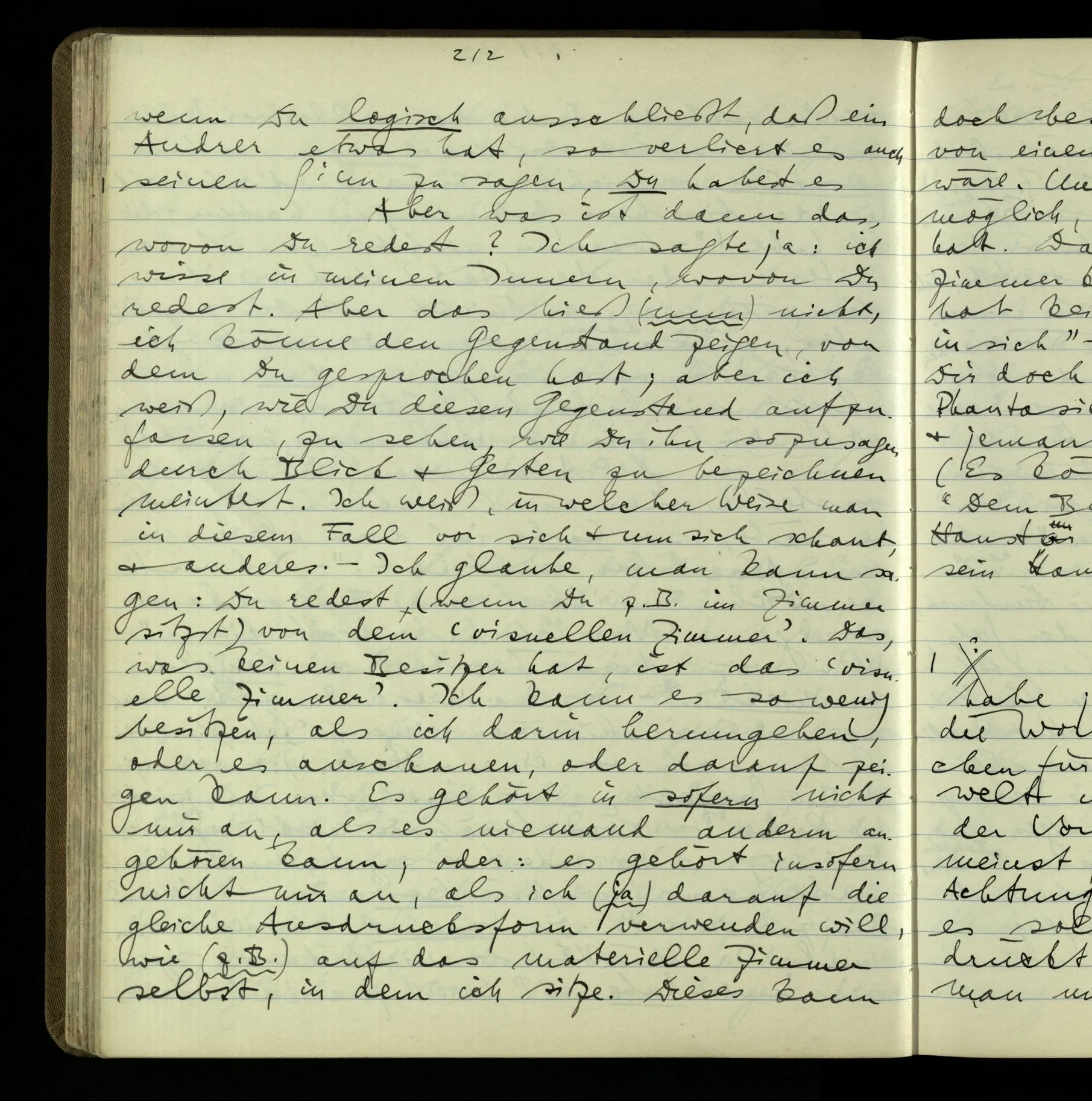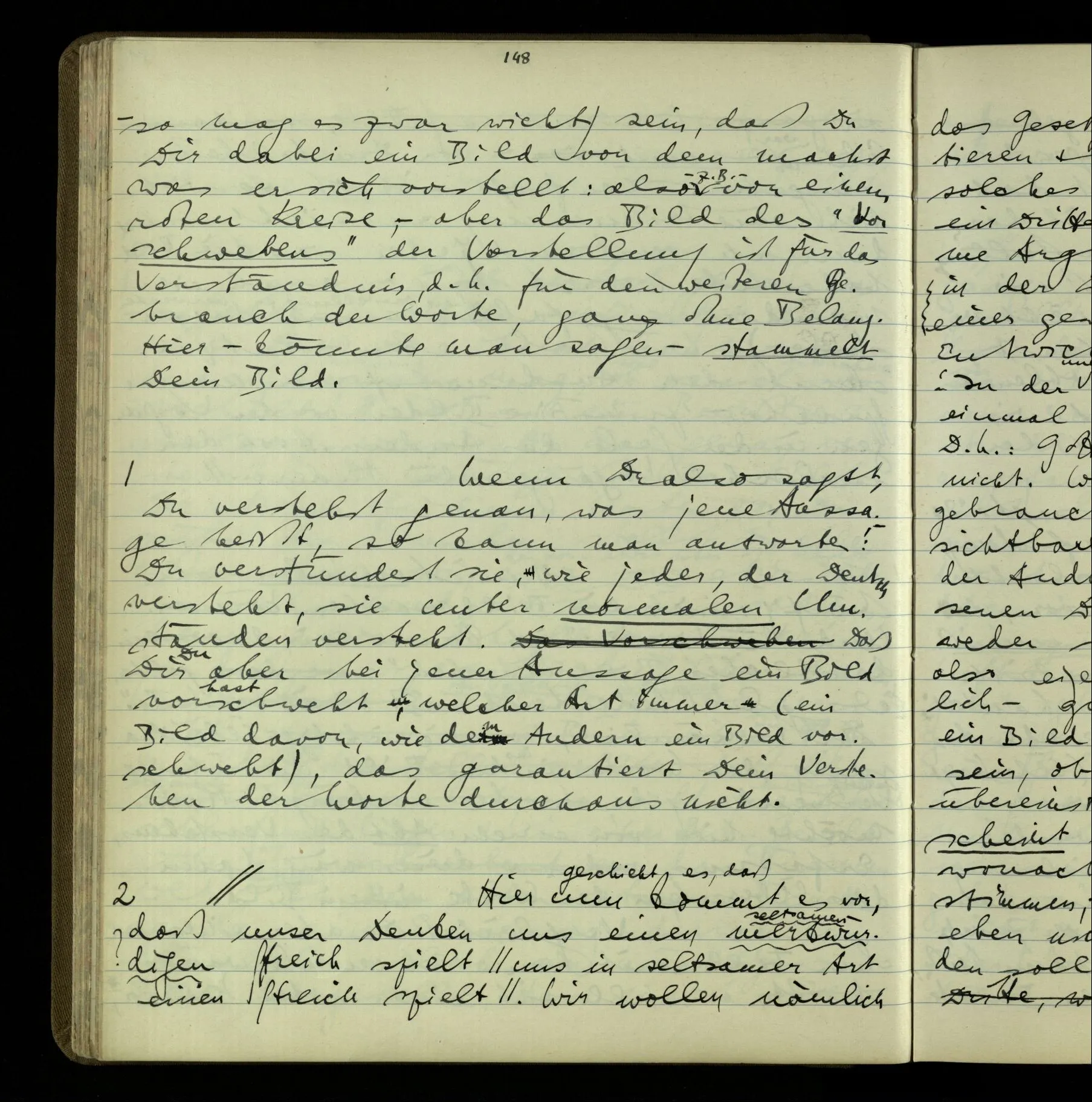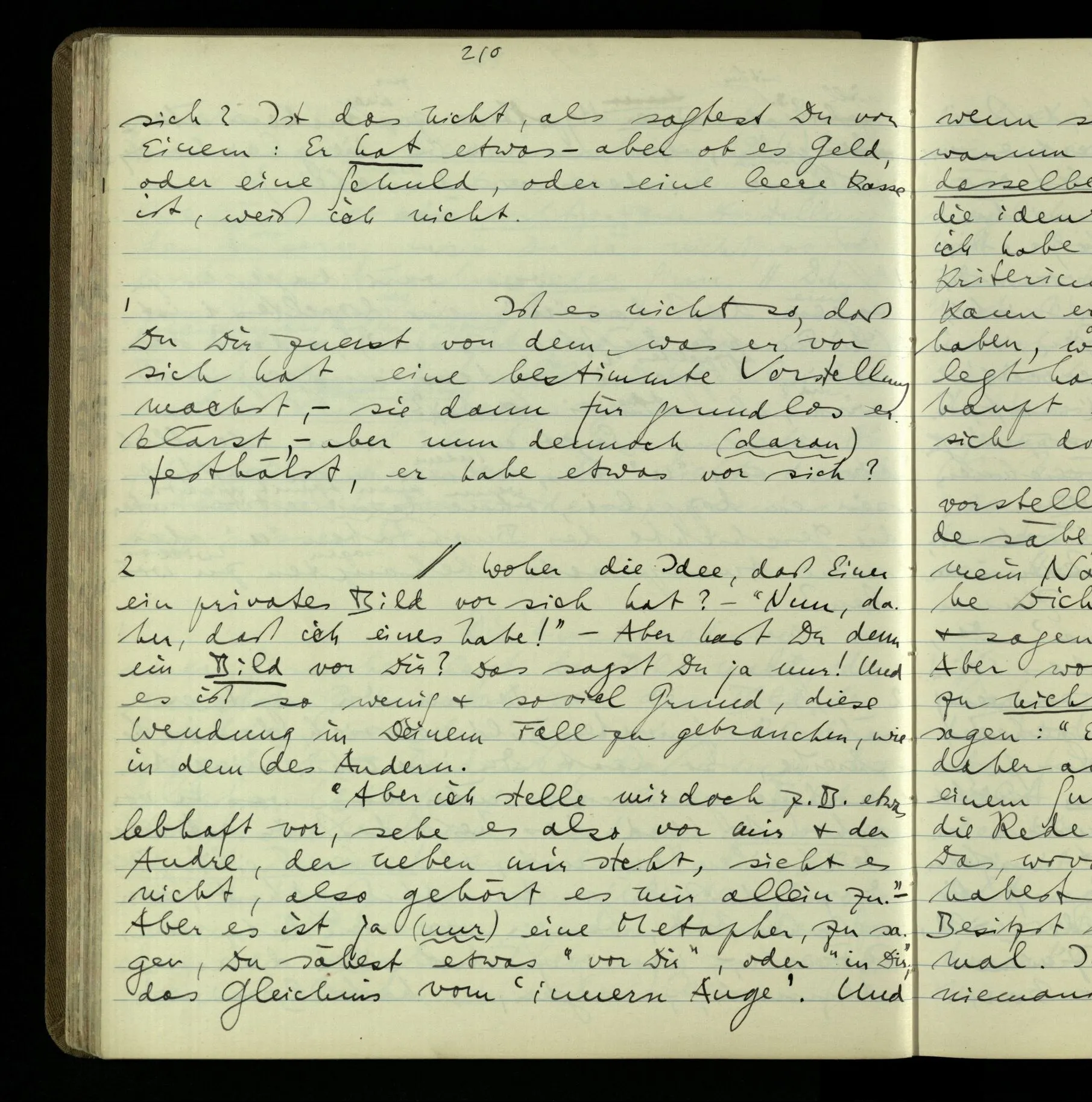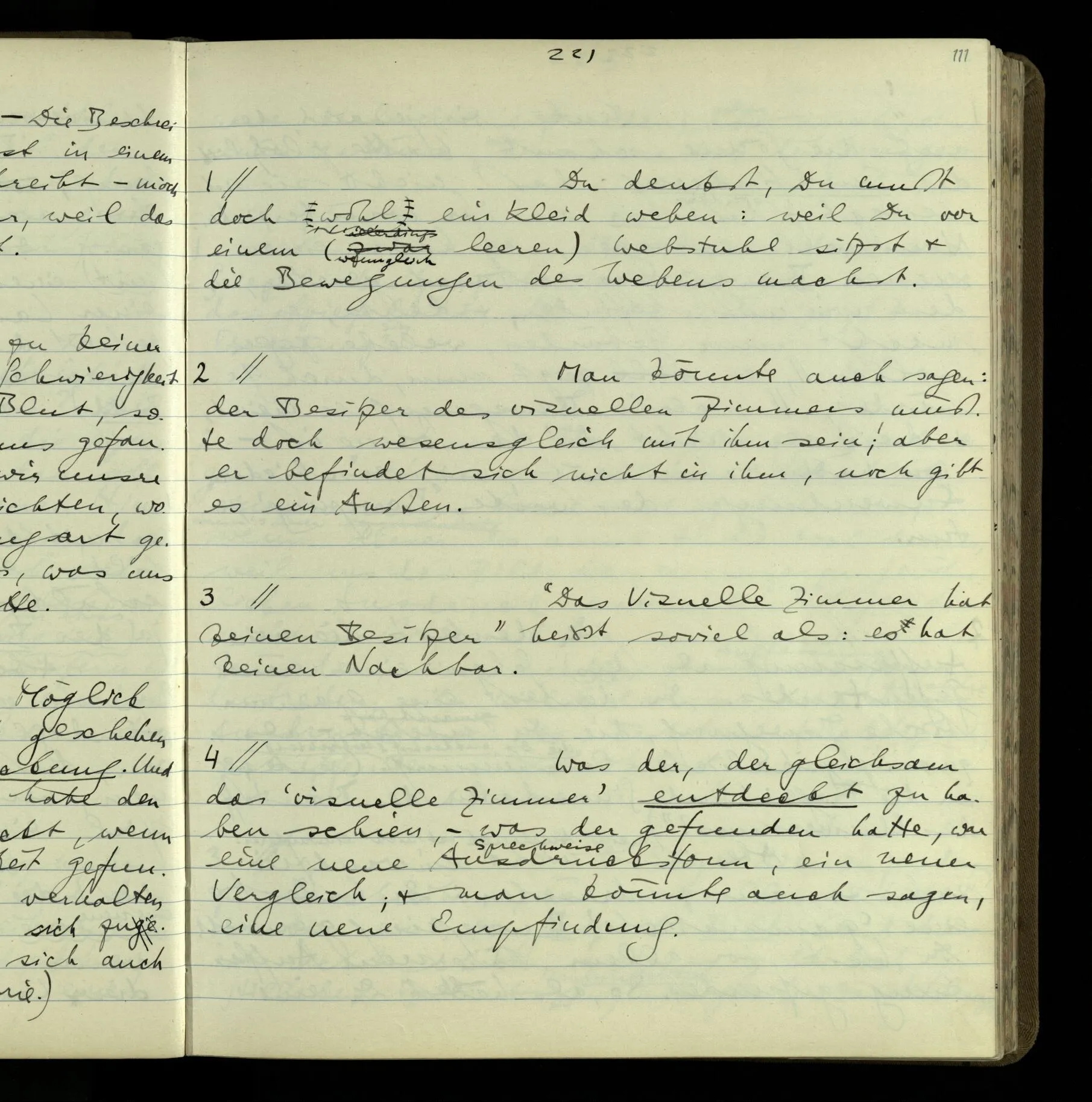 2 Geben wir denn den Worten, die uns gesagt werden, willkürlich Interpretationen? Kommt nicht das Erlebnis des Verstehens mit dem Erlebnis des Hörens (oder Sehens) der Zeichen, wenn wir die Sprache verstehen? Wenn mir jemand etwas sagt & ich verstehe (es), so geschieht mir dies, so wie, daß ich höre. Und hier ist also Verstehen das Phänomen, – die Phänomene, welche sich einstellen, wenn ich einen deutschen Satz höre, & die dieses Hören unterscheiden von dem eines Satzes einer mir unbekannten Sprache.