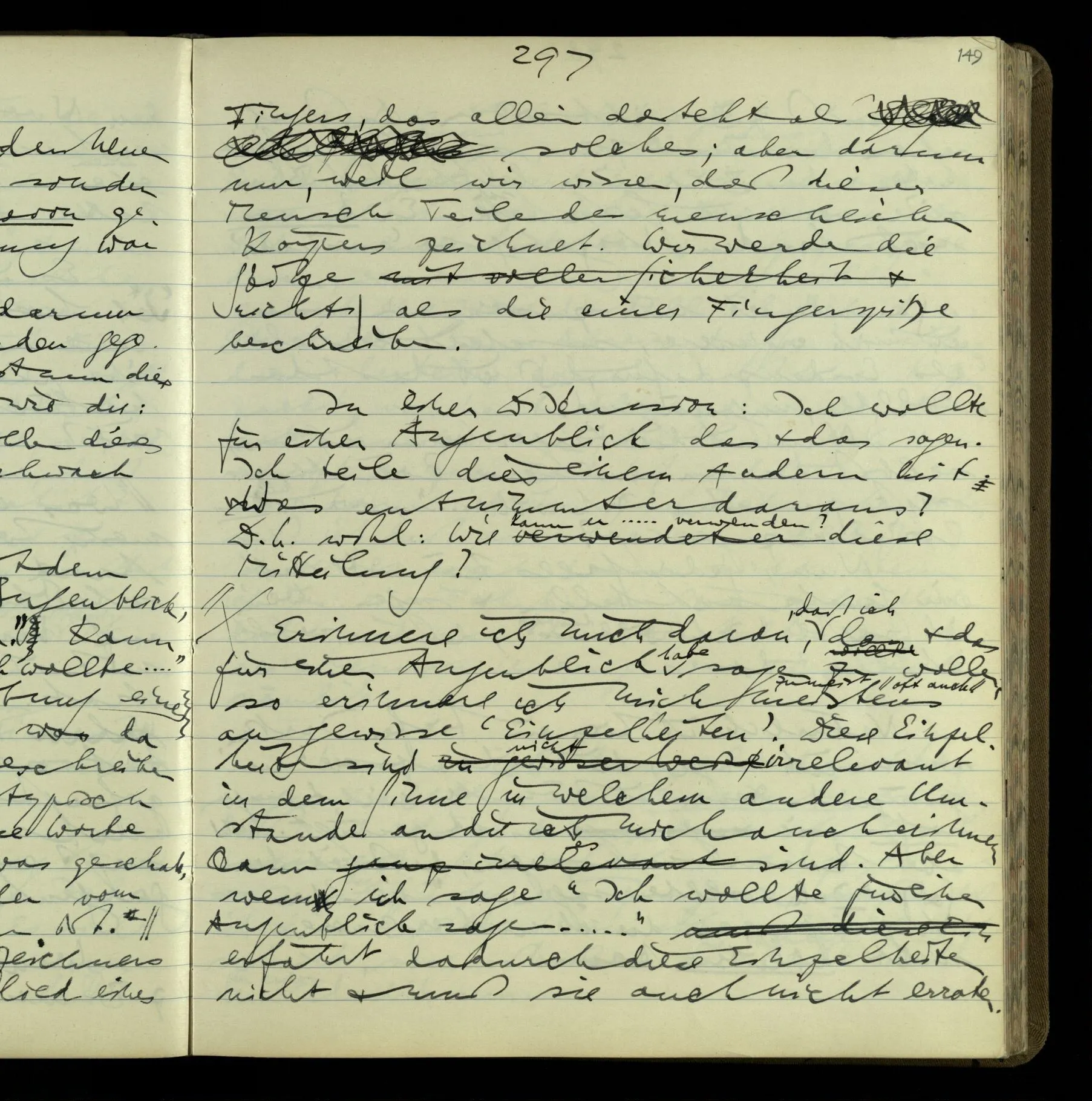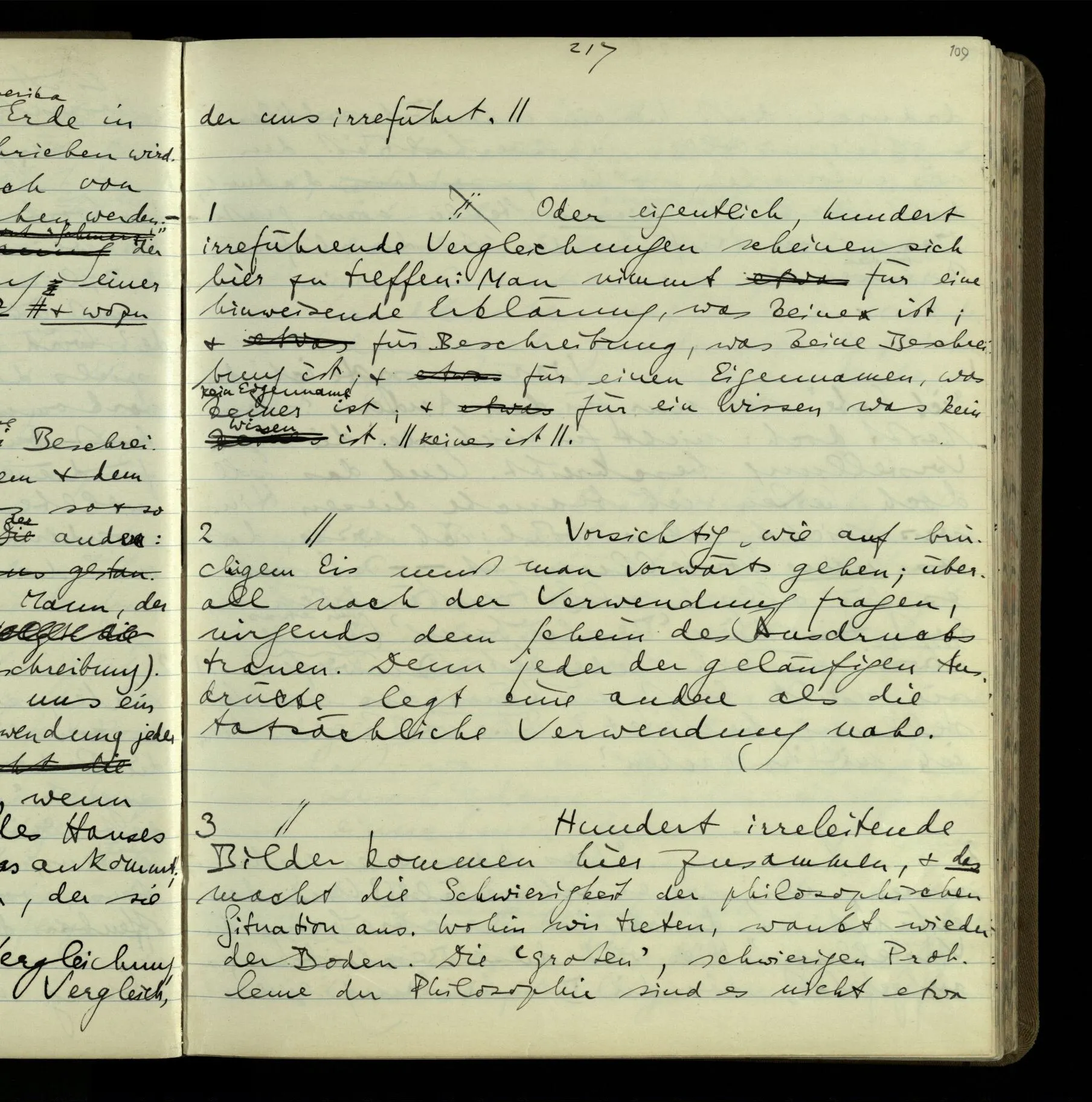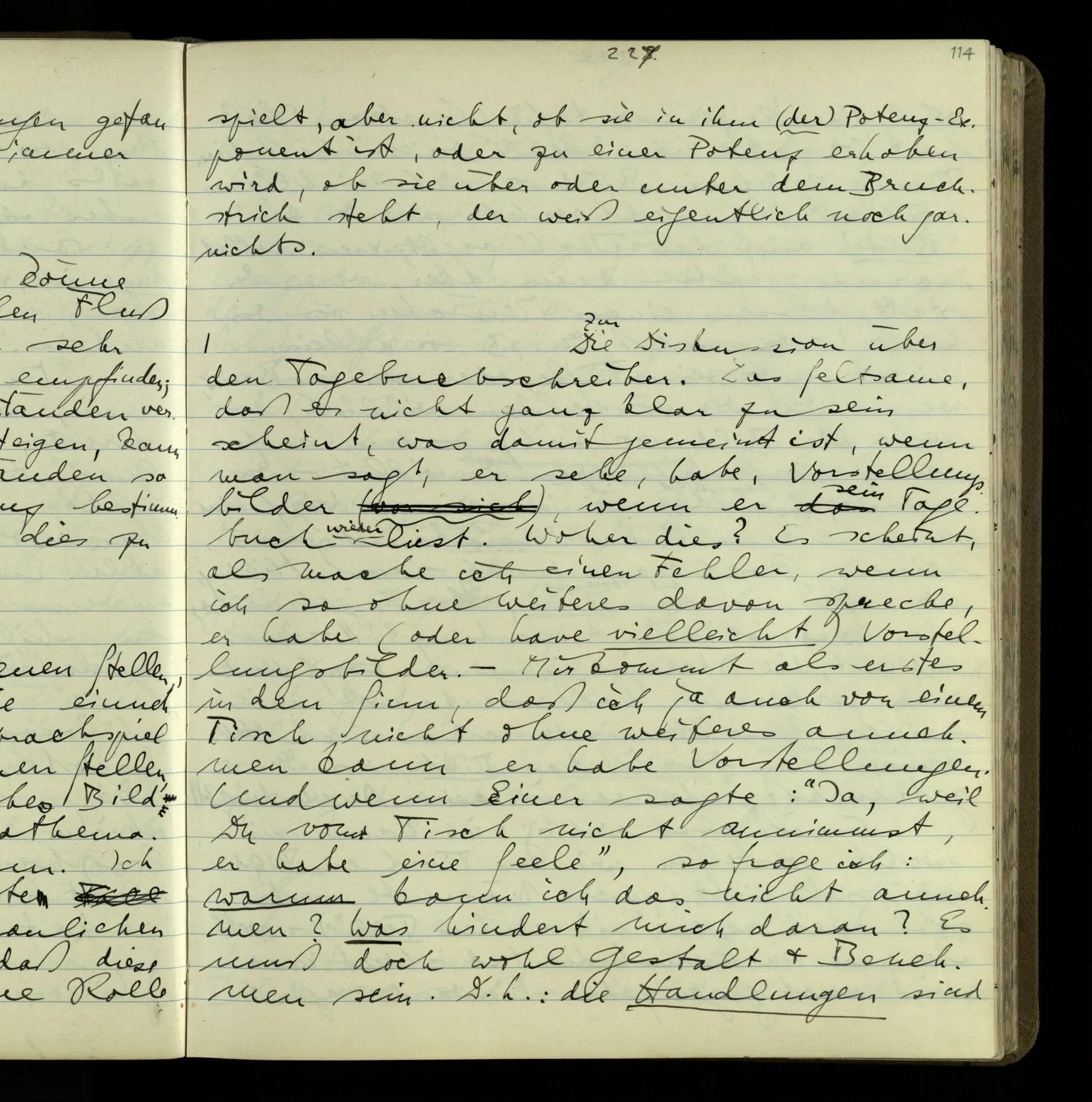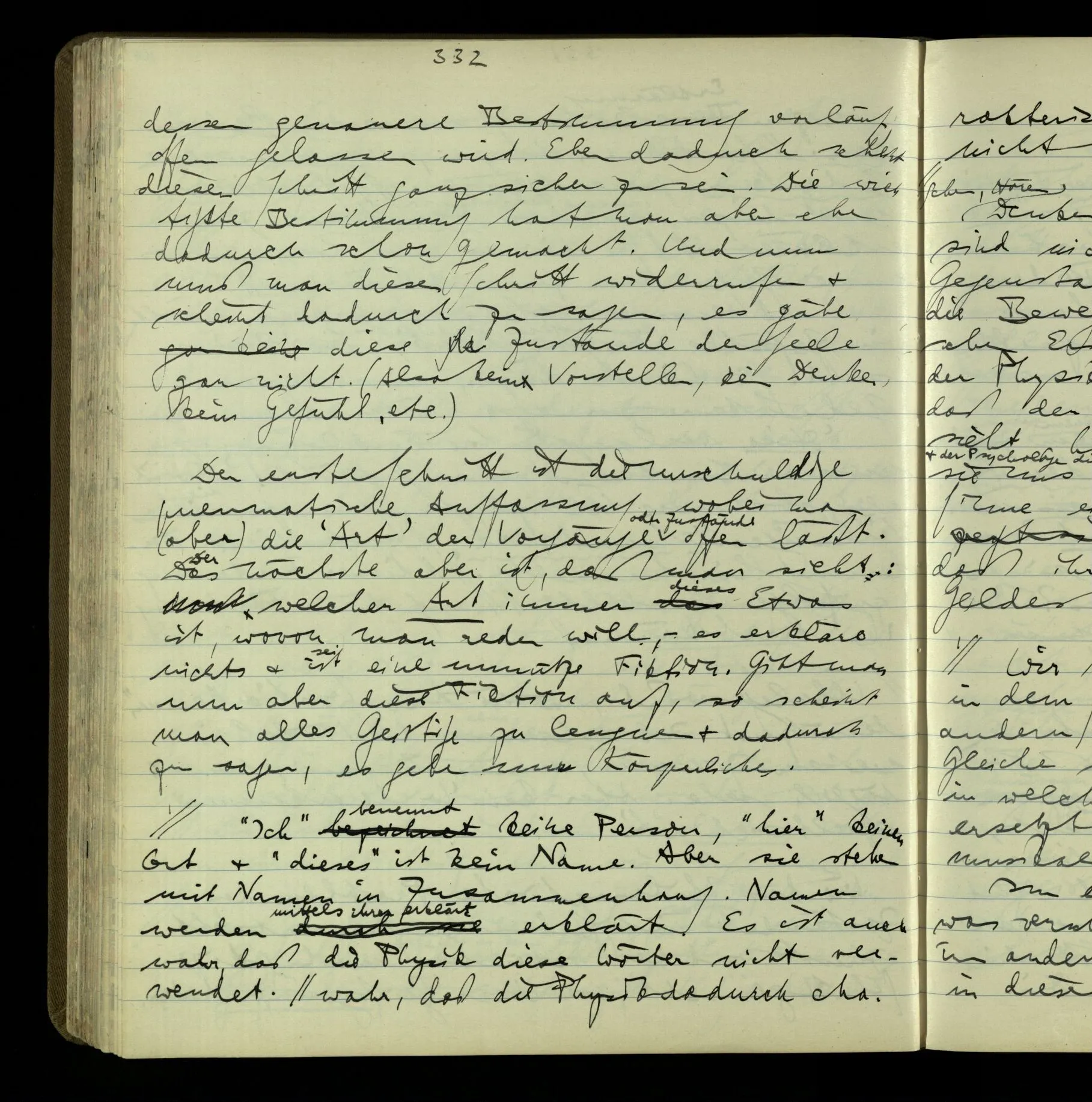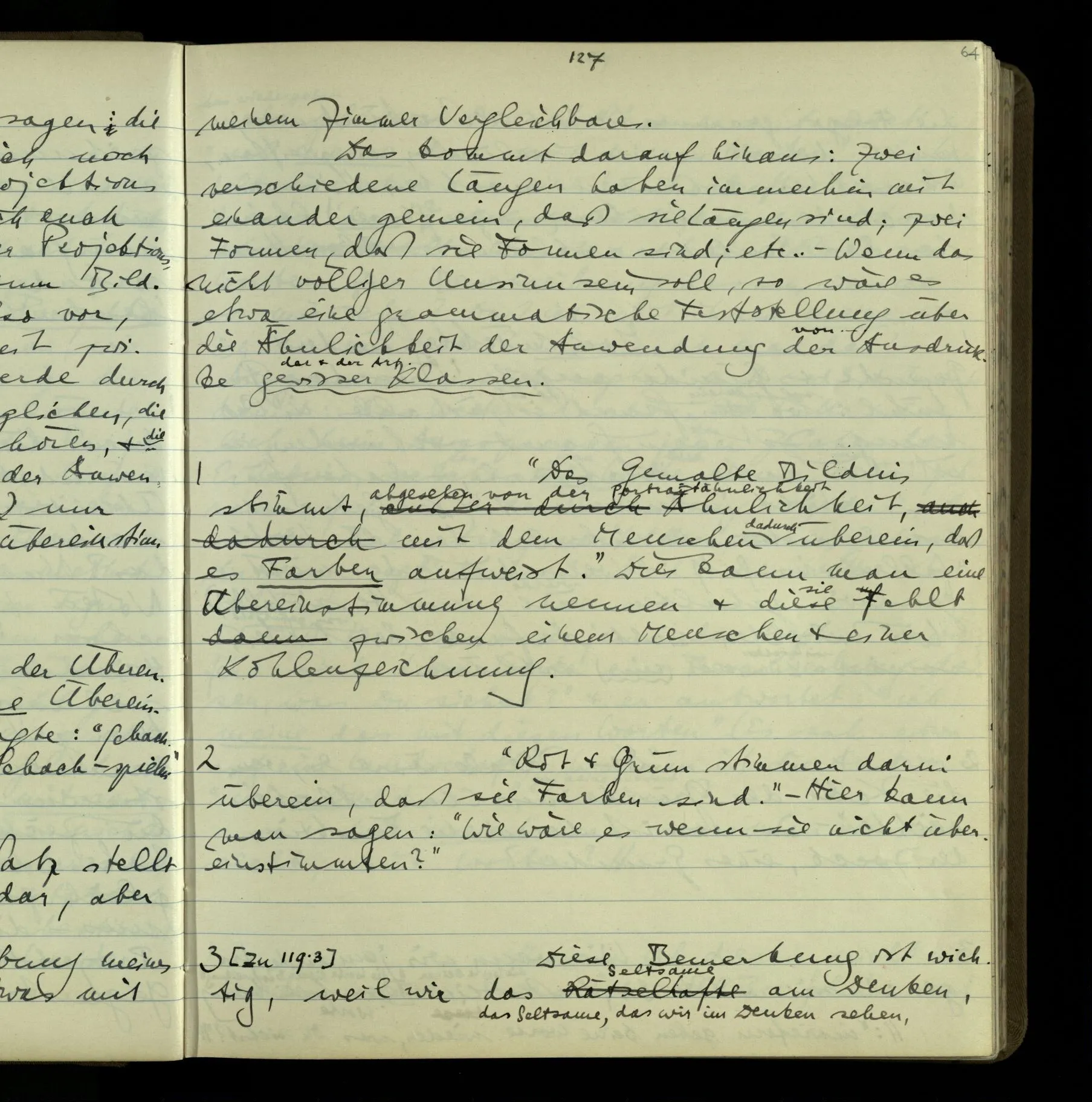 2 Geben wir denn den Worten, die uns gesagt werden, willkürlich Interpretationen? Kommt nicht das Erlebnis des Verstehens mit dem Erlebnis des Hörens (oder Sehens) der Zeichen, wenn wir die Sprache verstehen? Wenn mir jemand etwas sagt & ich verstehe (es), so geschieht mir dies, so wie, daß ich höre. Und hier ist also Verstehen das Phänomen, – die Phänomene, welche sich einstellen, wenn ich einen deutschen Satz höre, & die dieses Hören unterscheiden von dem eines Satzes einer mir unbekannten Sprache.