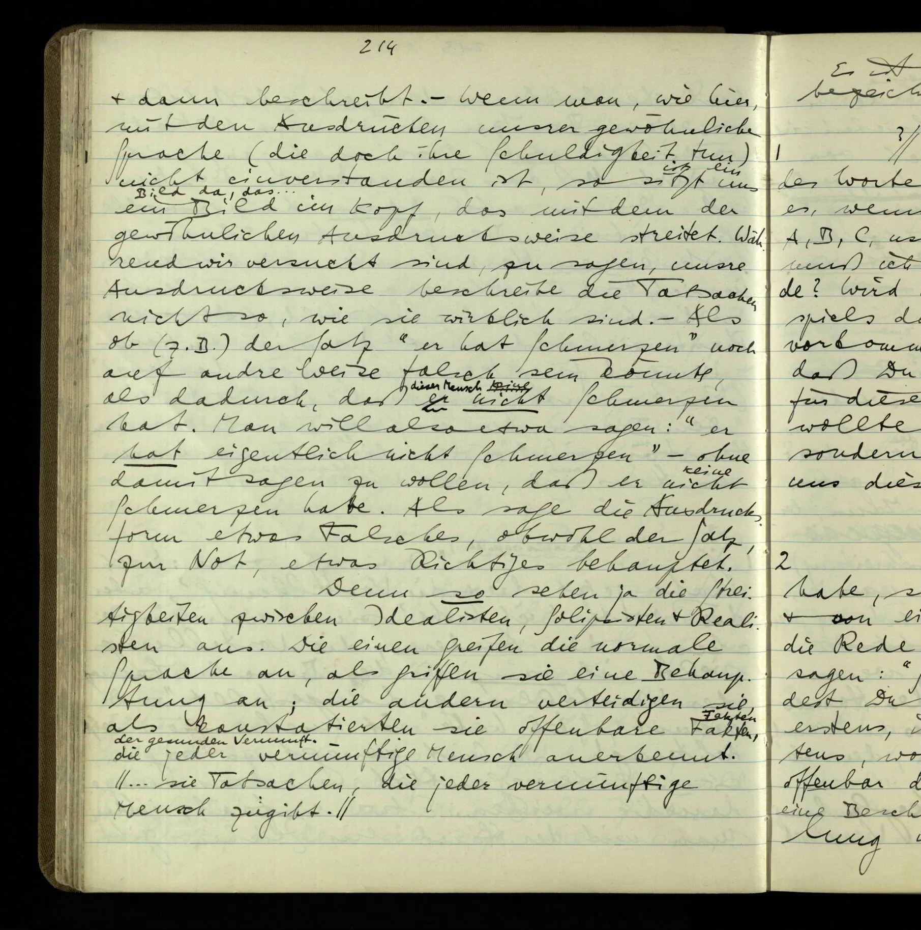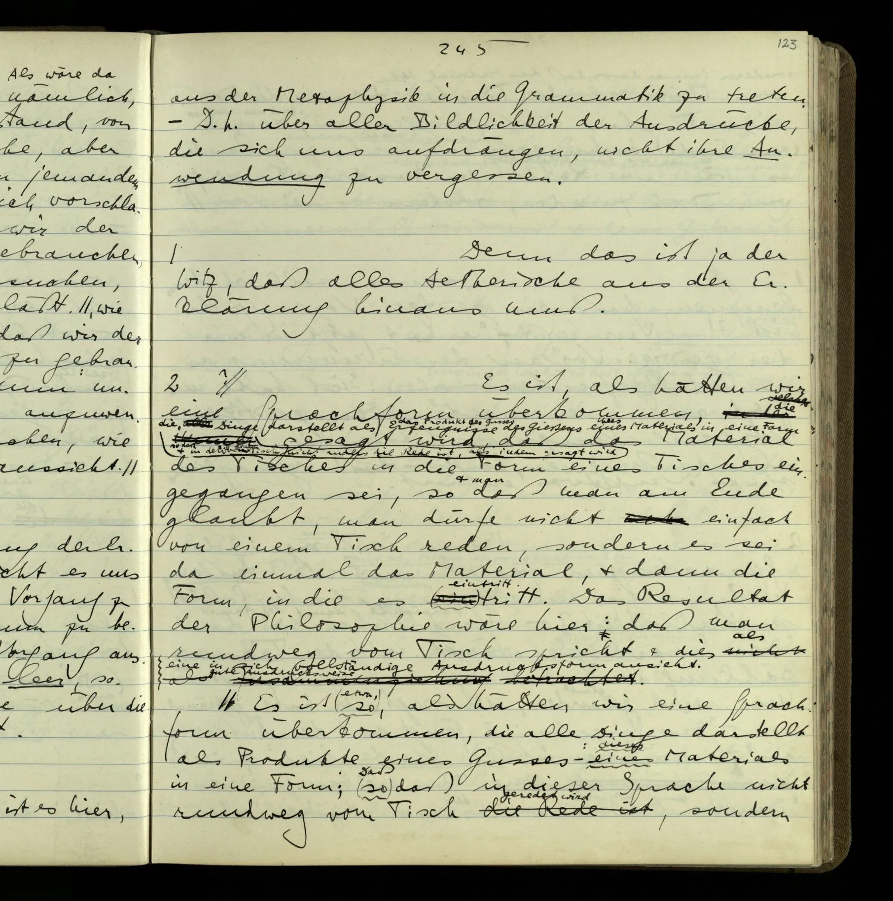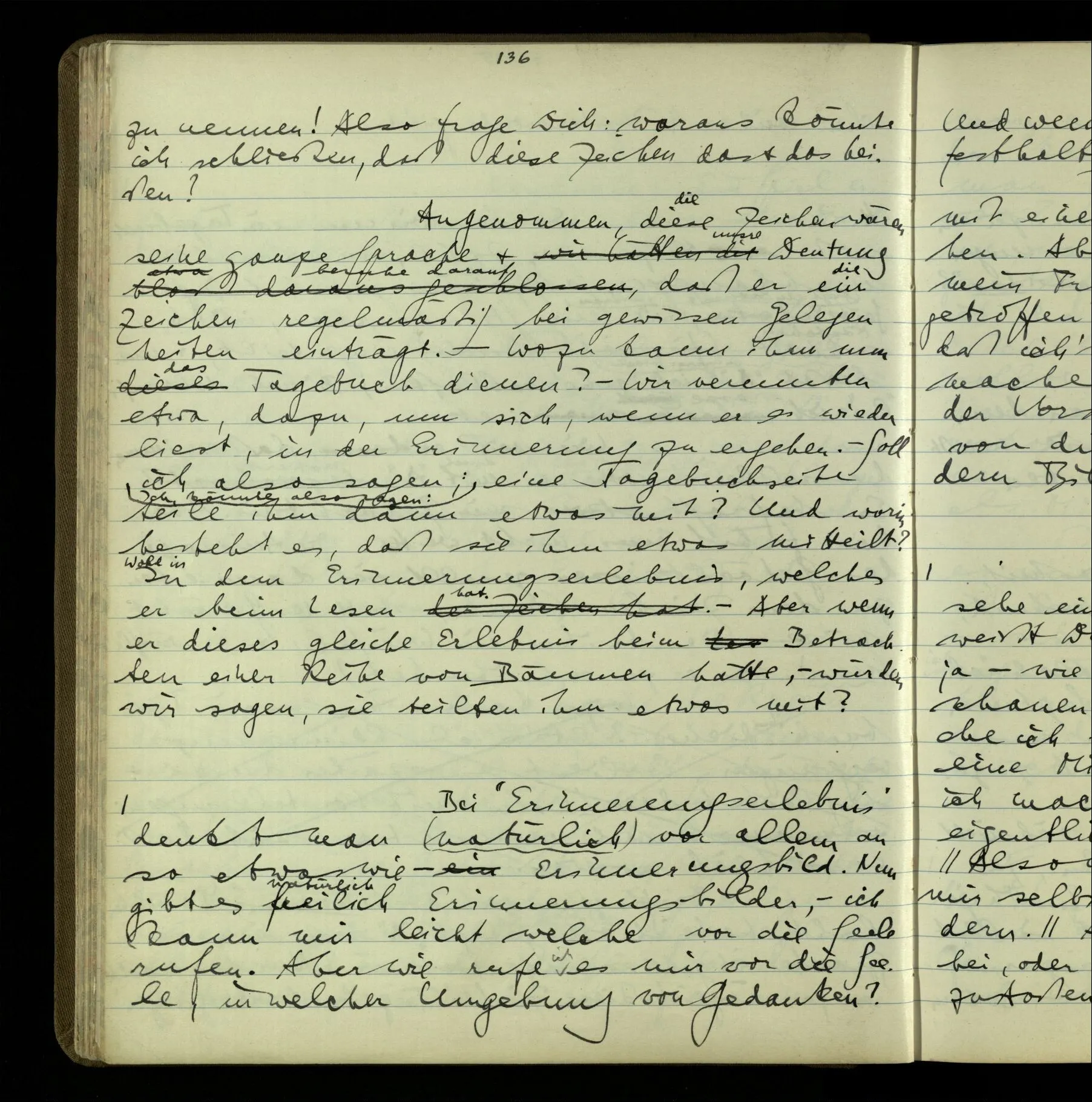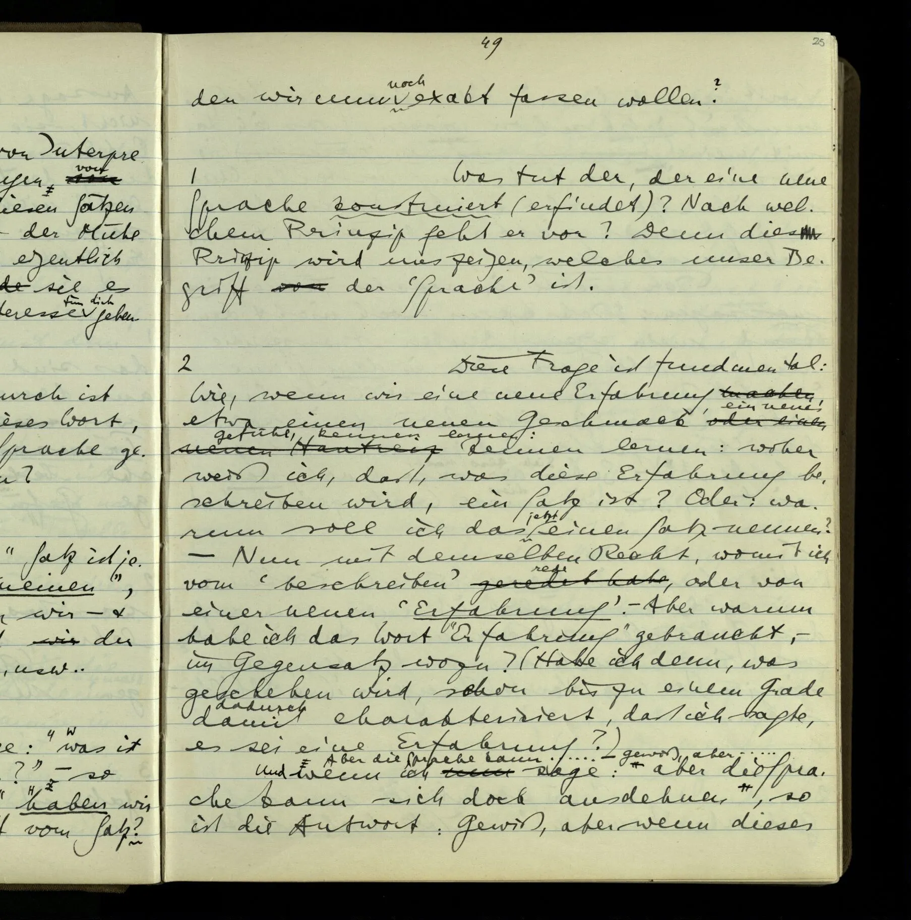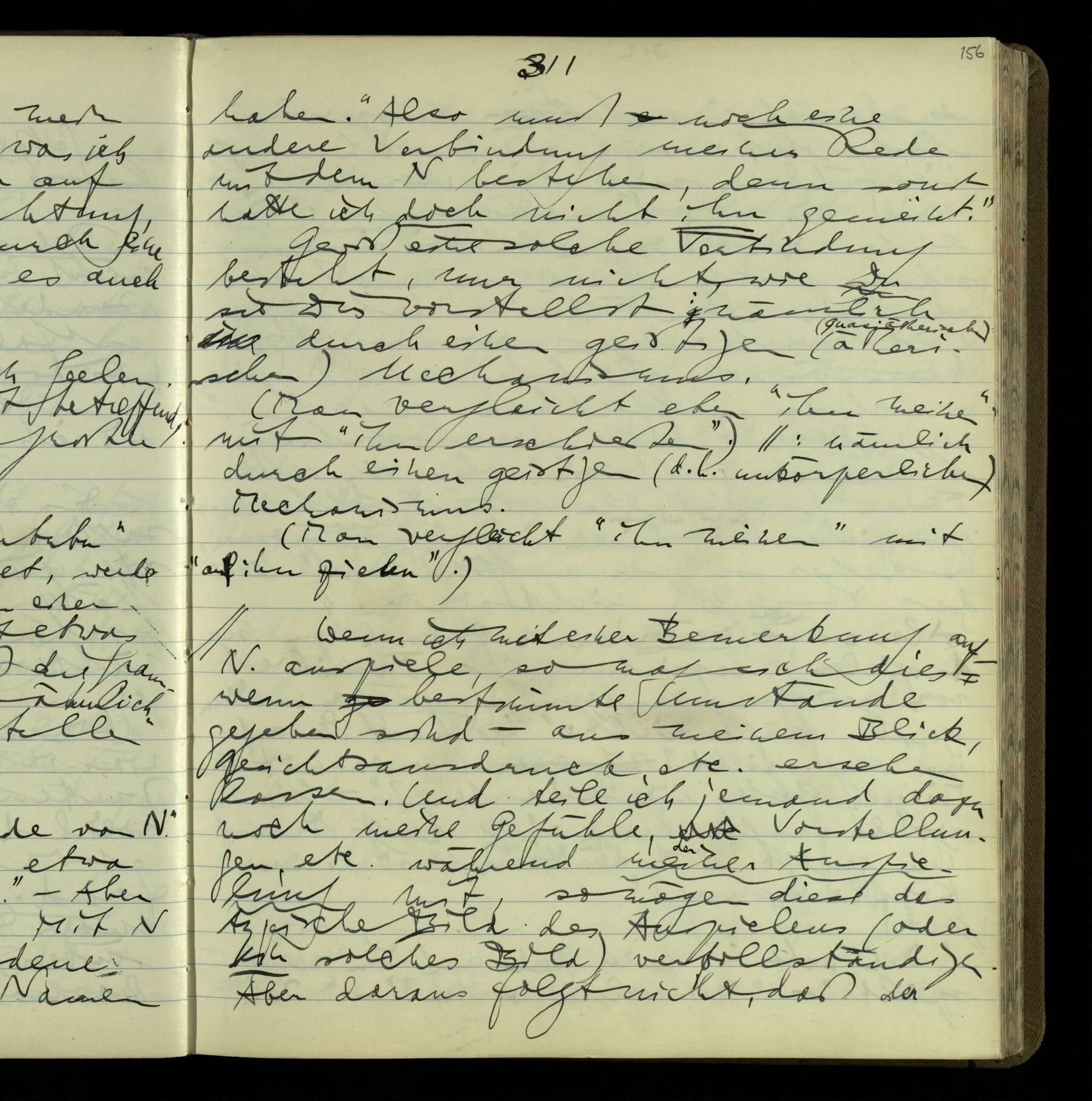 2 Geben wir denn den Worten, die uns gesagt werden, willkürlich Interpretationen? Kommt nicht das Erlebnis des Verstehens mit dem Erlebnis des Hörens (oder Sehens) der Zeichen, wenn wir die Sprache verstehen? Wenn mir jemand etwas sagt & ich verstehe (es), so geschieht mir dies, so wie, daß ich höre. Und hier ist also Verstehen das Phänomen, – die Phänomene, welche sich einstellen, wenn ich einen deutschen Satz höre, & die dieses Hören unterscheiden von dem eines Satzes einer mir unbekannten Sprache.