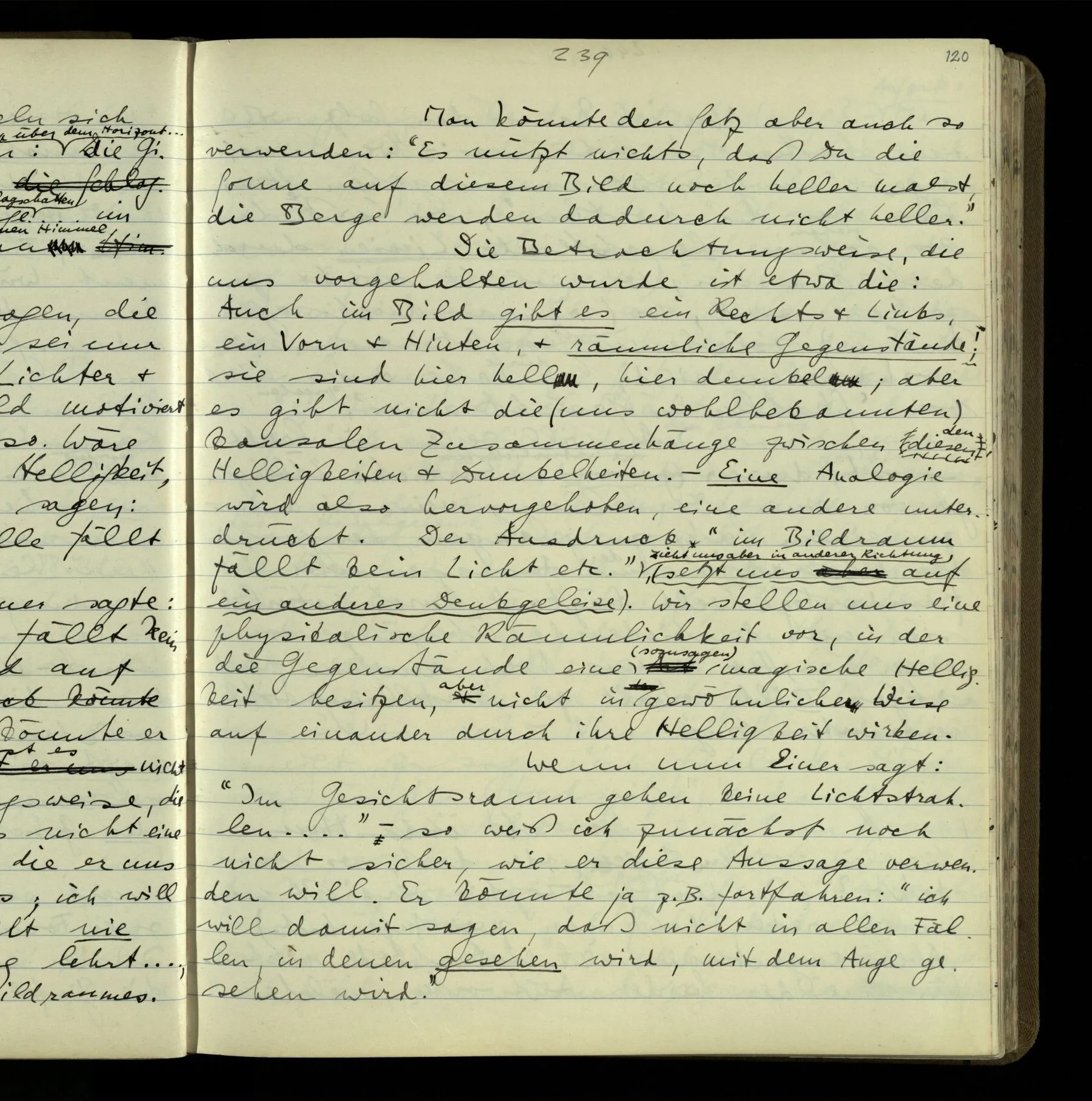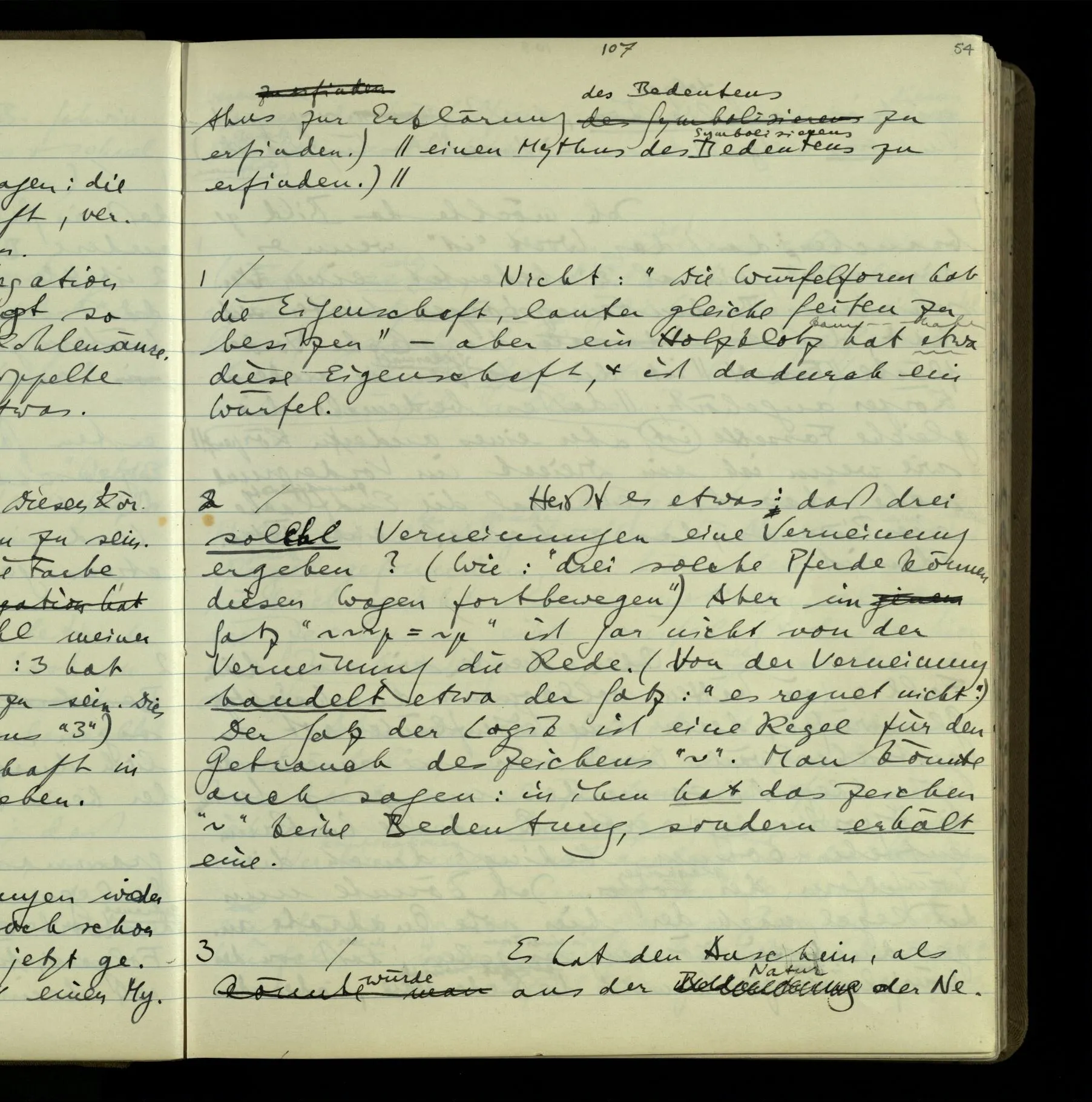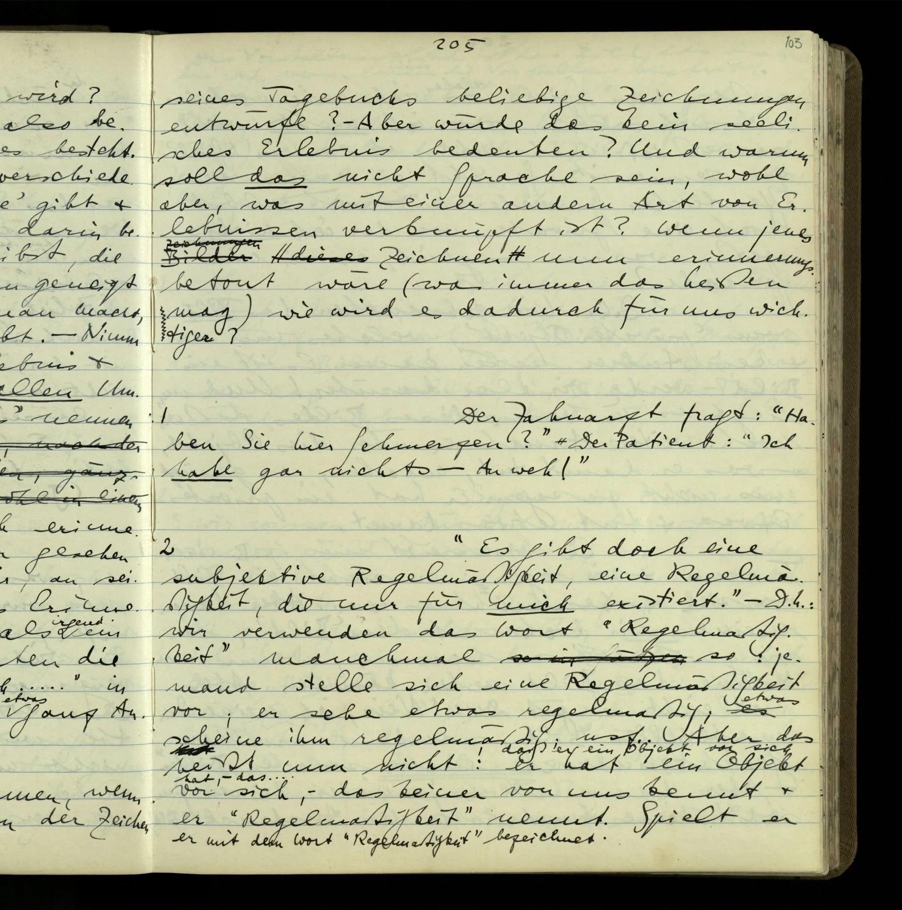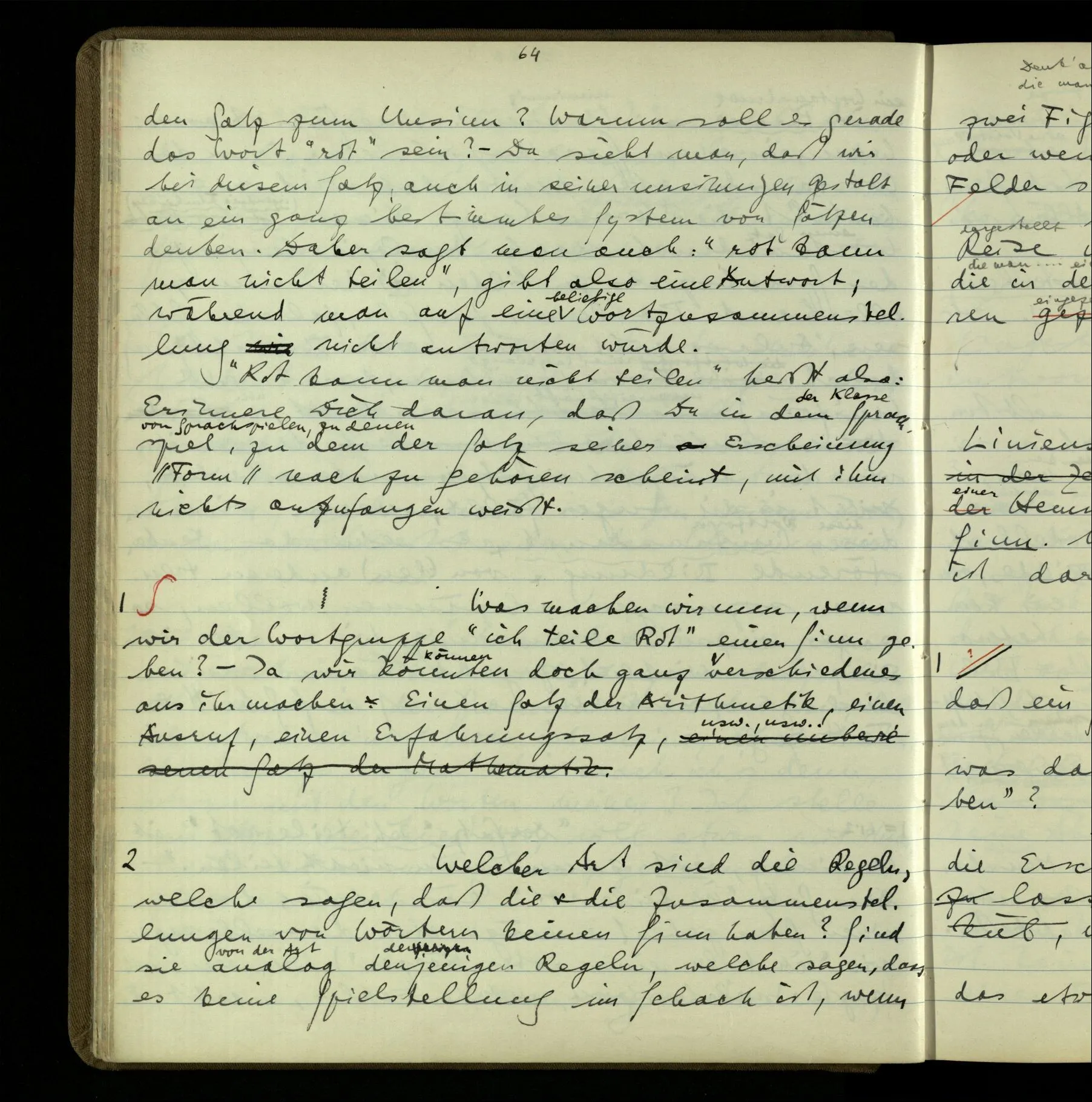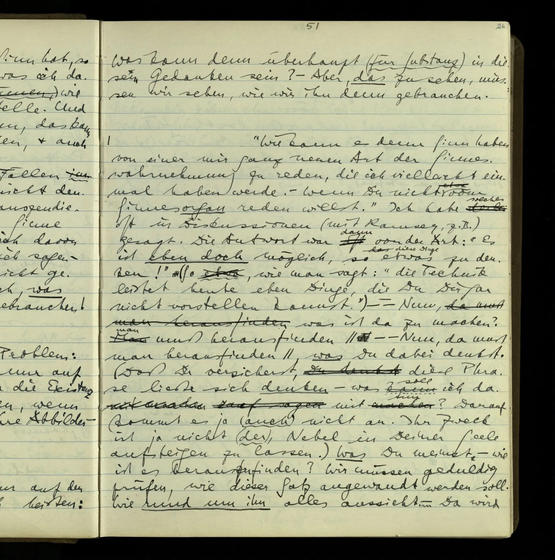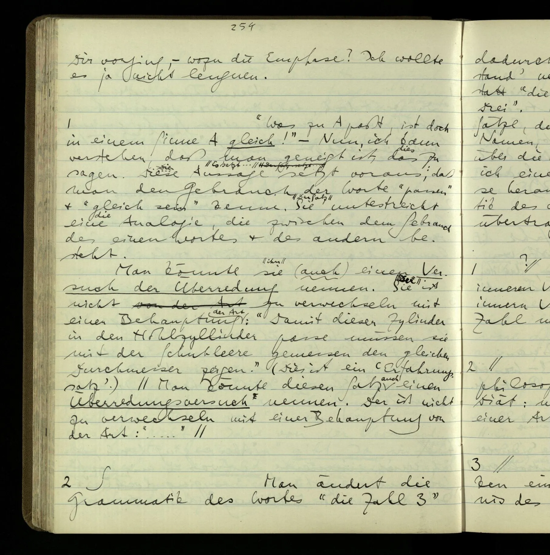2 Geben wir denn den Worten, die uns gesagt werden, willkürlich Interpretationen? Kommt nicht das Erlebnis des Verstehens mit dem Erlebnis des Hörens (oder Sehens) der Zeichen, wenn wir die Sprache verstehen? Wenn mir jemand etwas sagt & ich verstehe (es), so geschieht mir dies, so wie, daß ich höre. Und hier ist also Verstehen das Phänomen, – die Phänomene, welche sich einstellen, wenn ich einen deutschen Satz höre, & die dieses Hören unterscheiden von dem eines Satzes einer mir unbekannten Sprache.