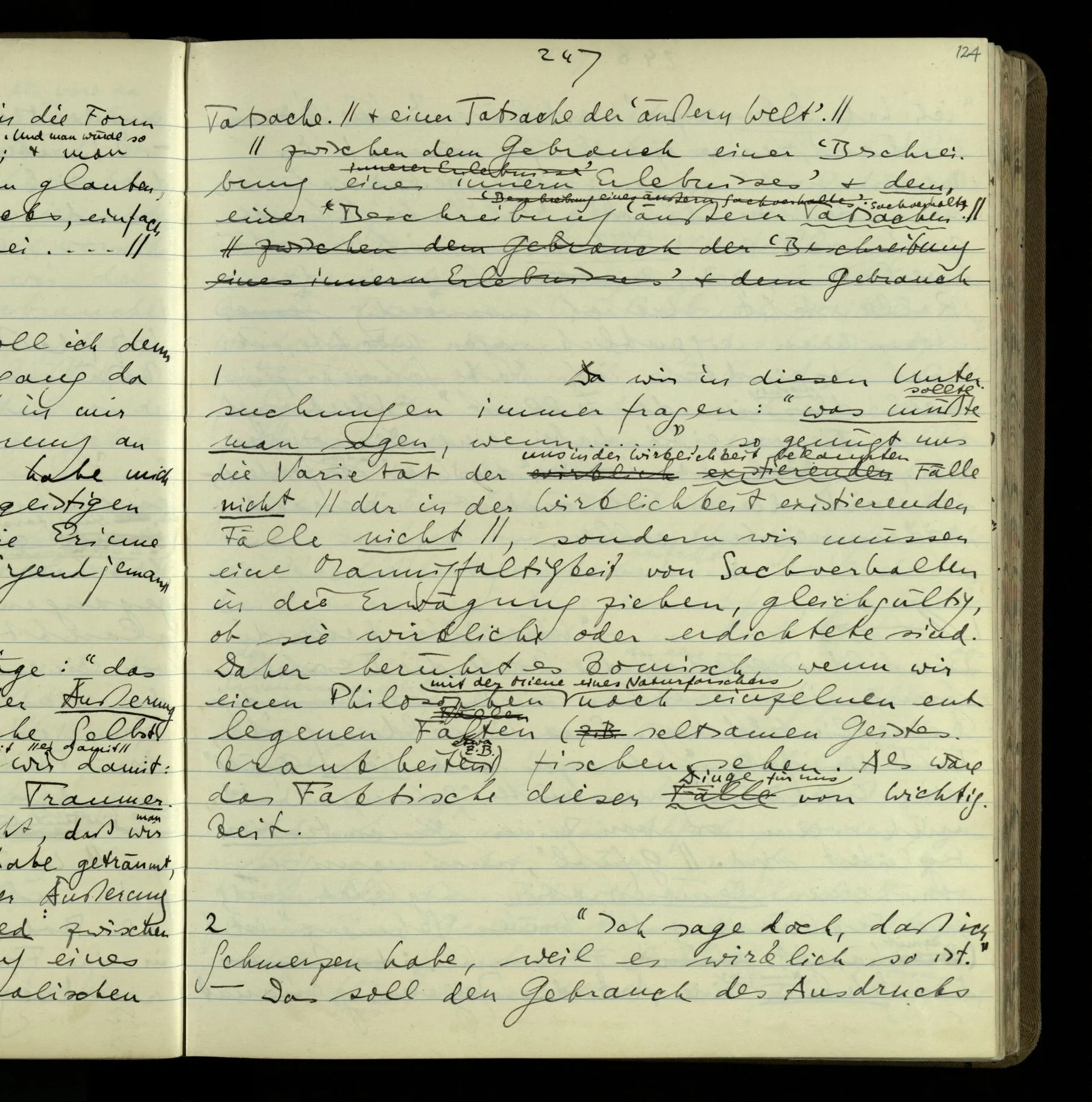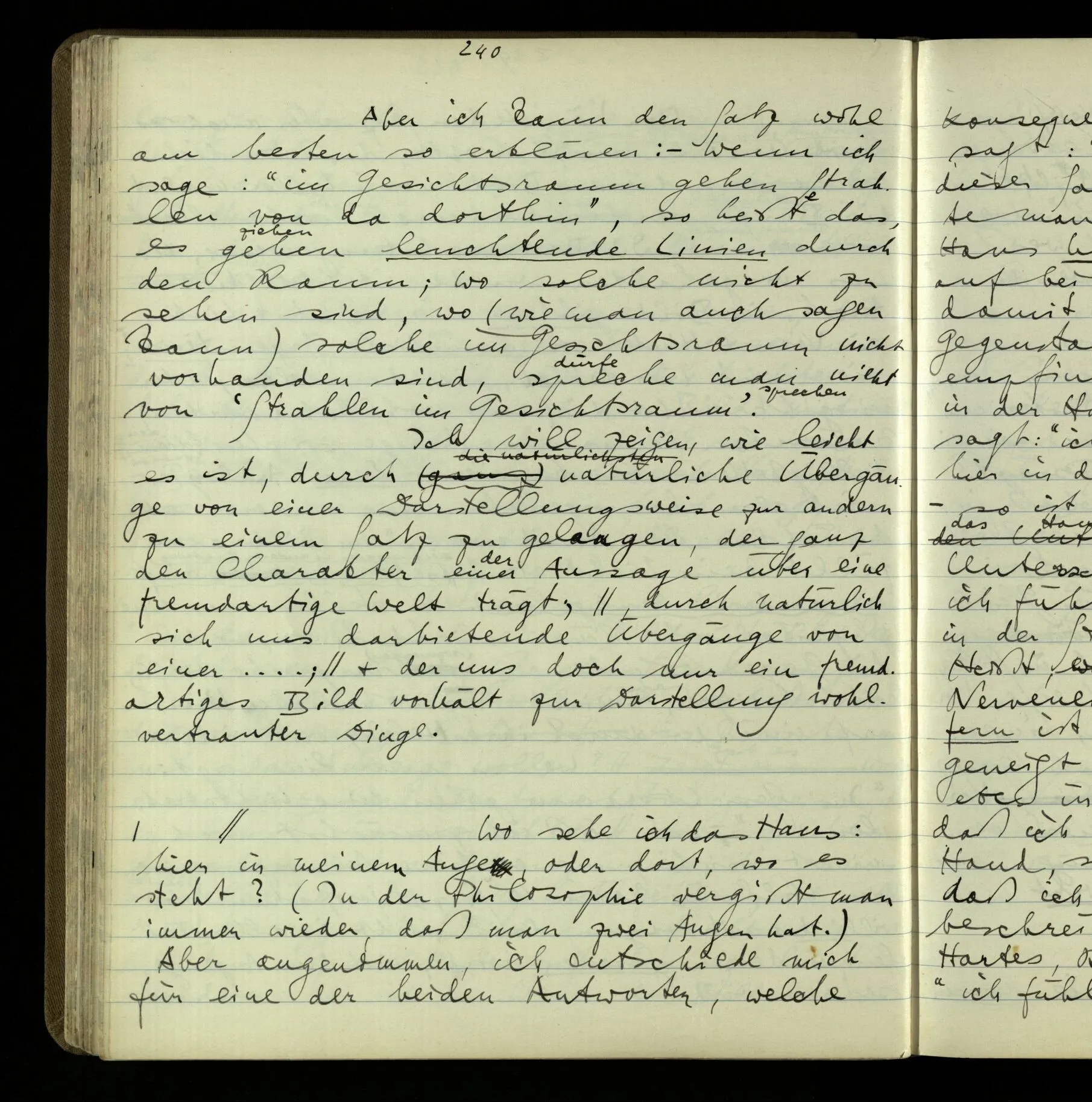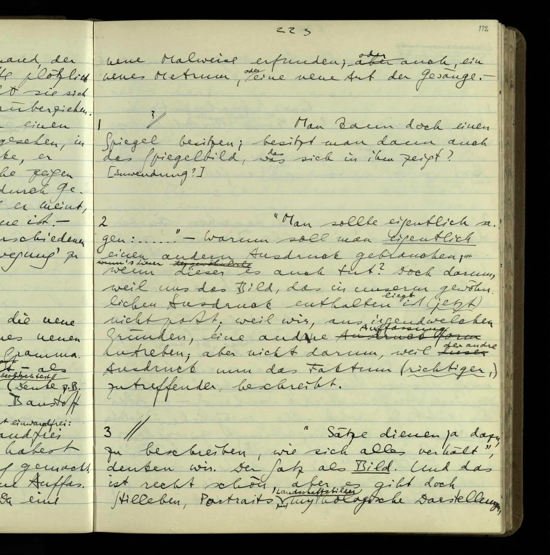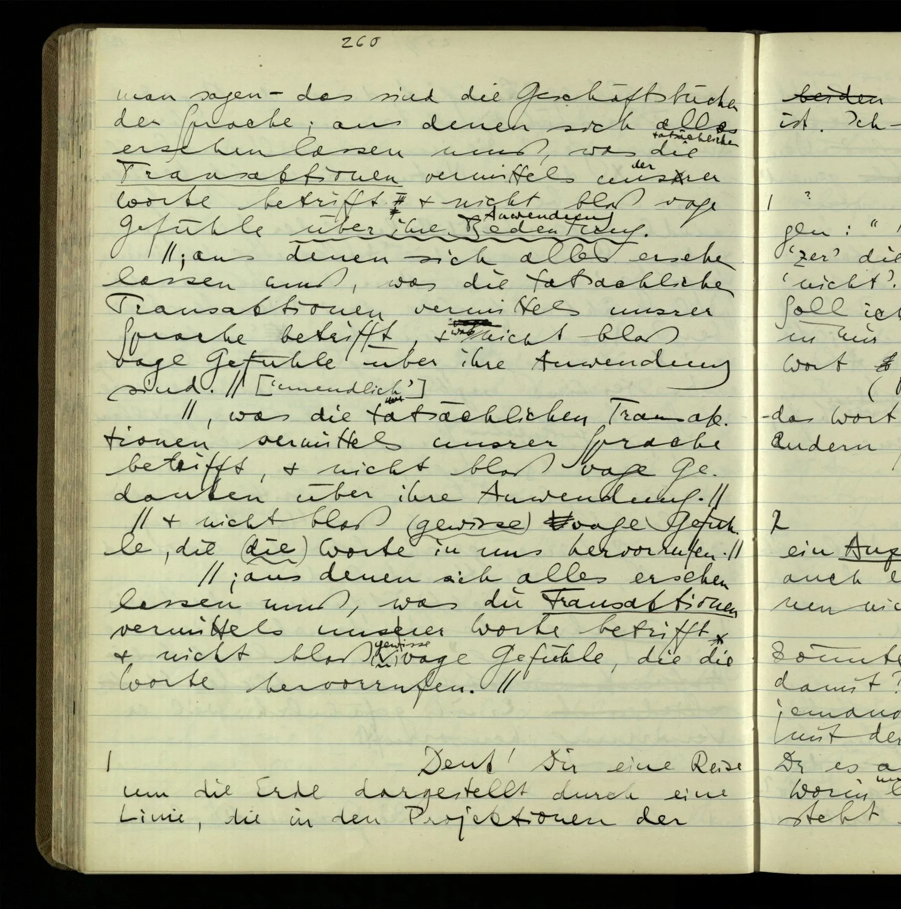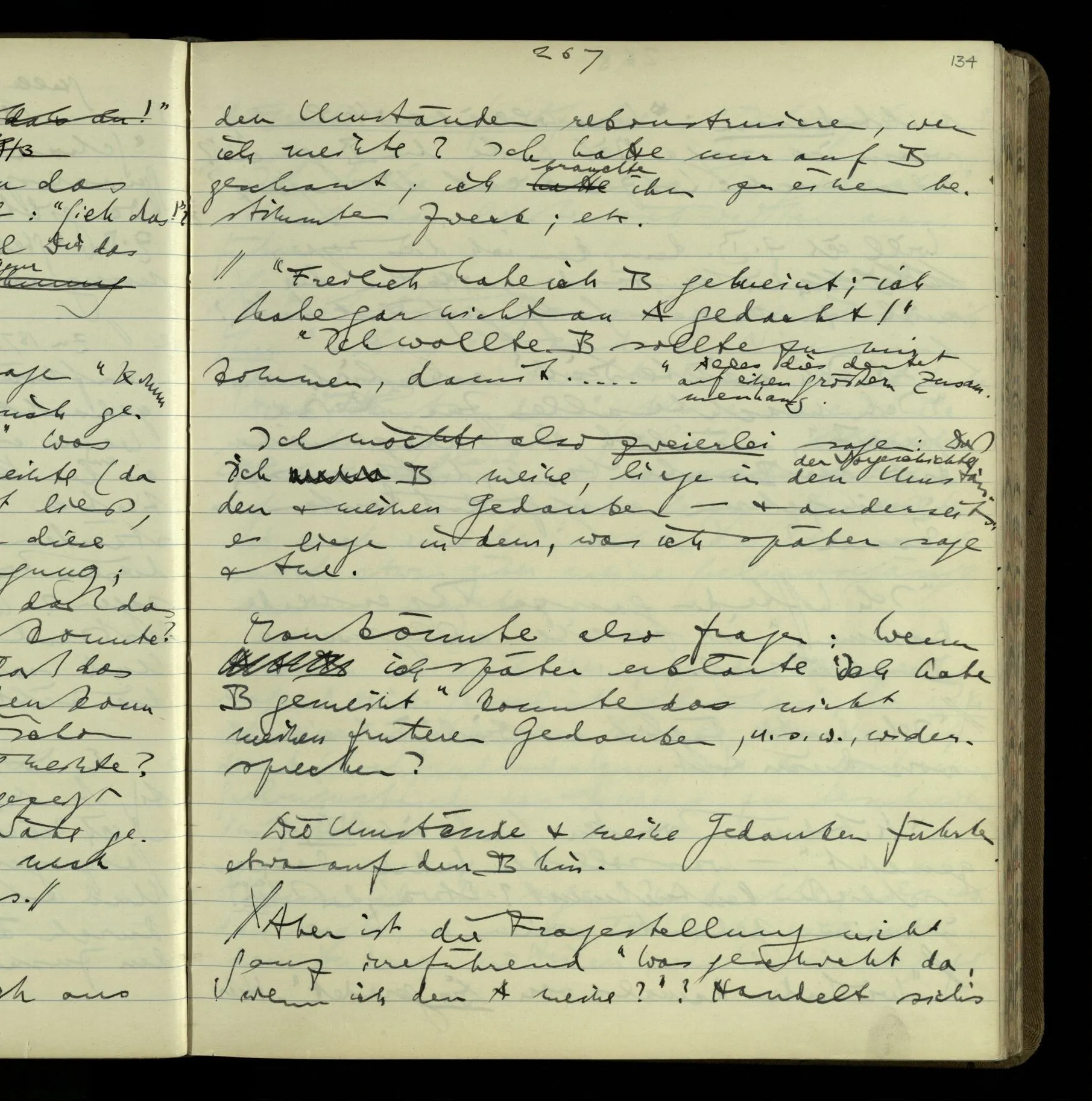 2 Geben wir denn den Worten, die uns gesagt werden, willkürlich Interpretationen? Kommt nicht das Erlebnis des Verstehens mit dem Erlebnis des Hörens (oder Sehens) der Zeichen, wenn wir die Sprache verstehen? Wenn mir jemand etwas sagt & ich verstehe (es), so geschieht mir dies, so wie, daß ich höre. Und hier ist also Verstehen das Phänomen, – die Phänomene, welche sich einstellen, wenn ich einen deutschen Satz höre, & die dieses Hören unterscheiden von dem eines Satzes einer mir unbekannten Sprache.