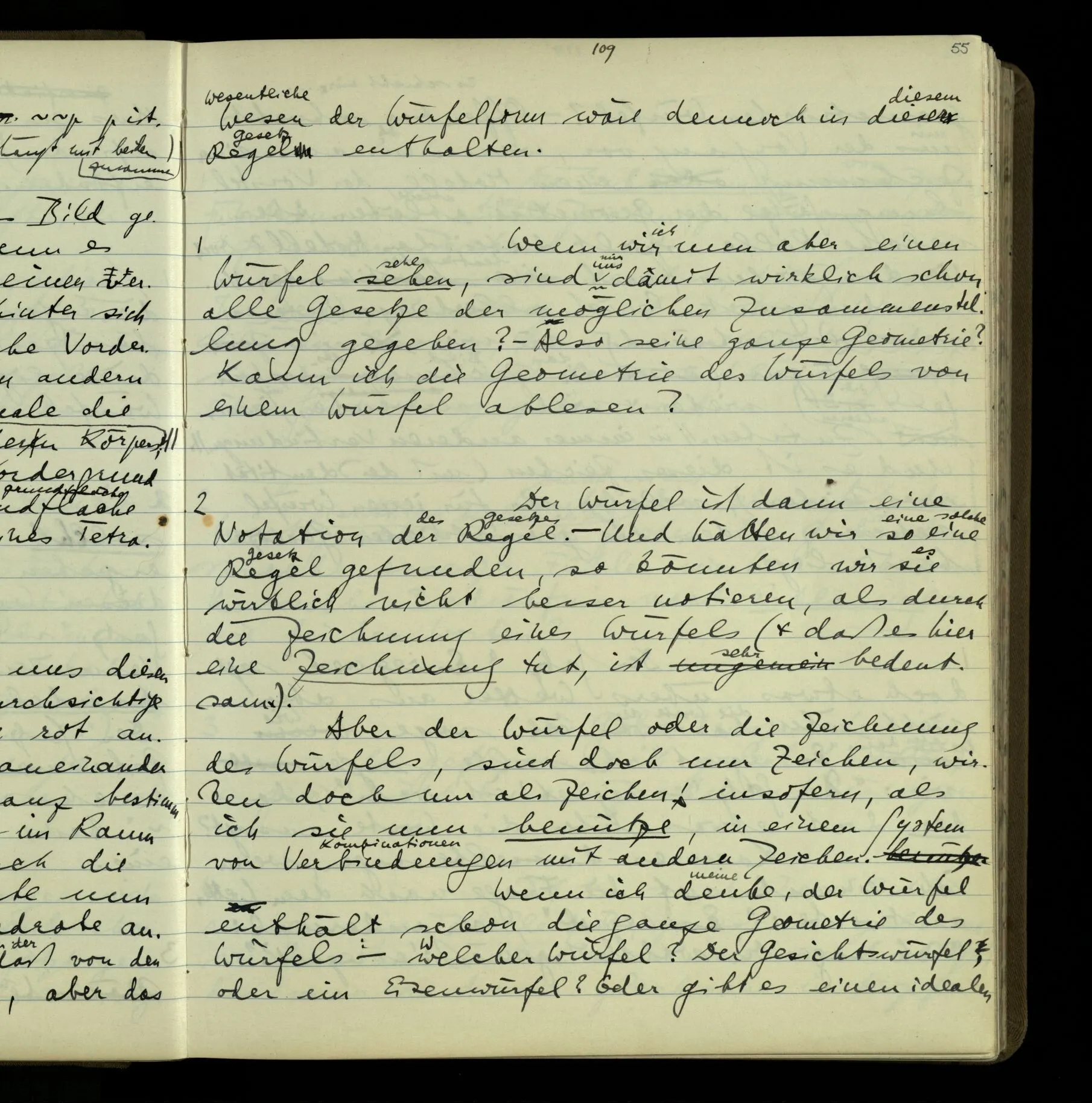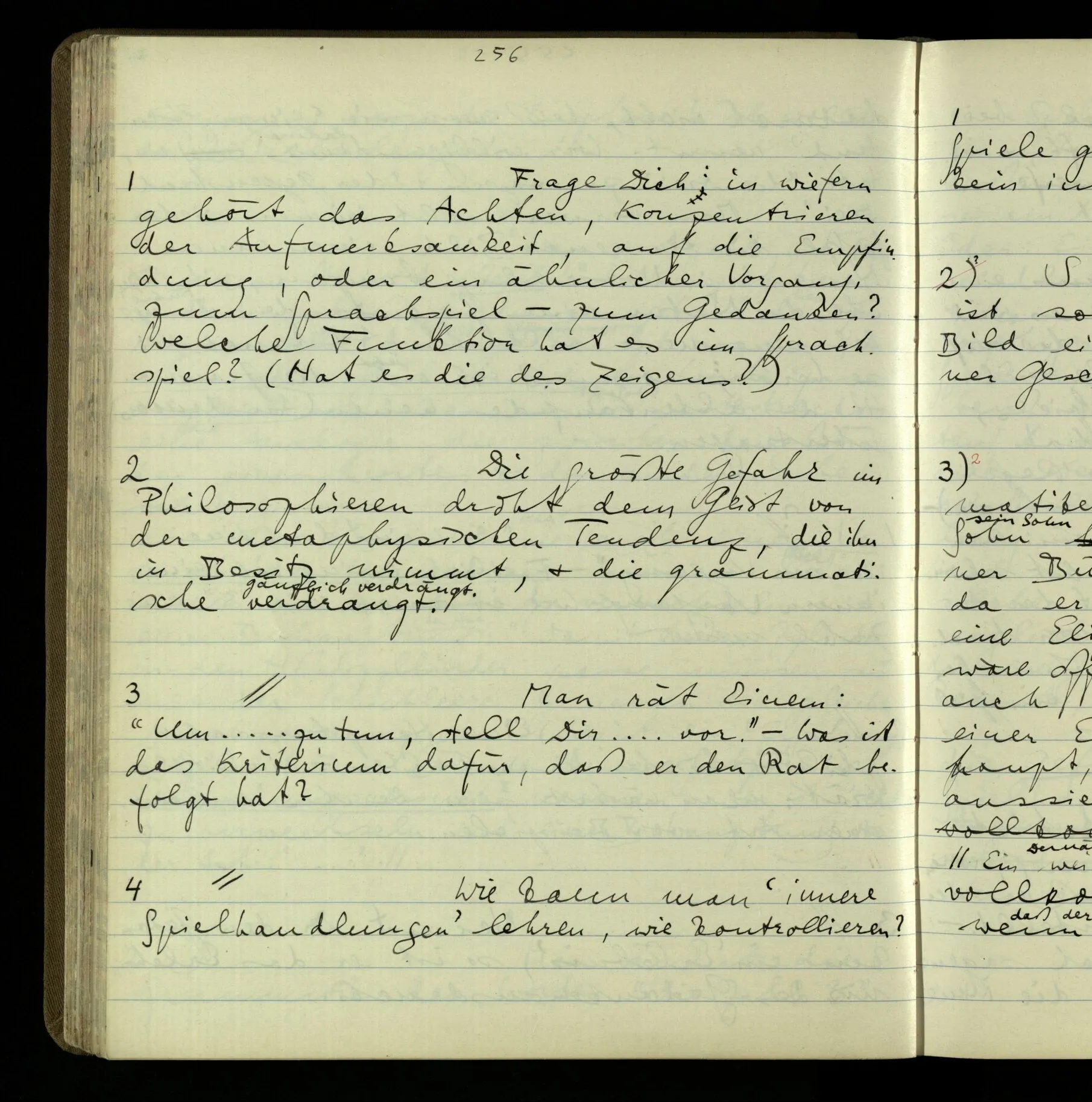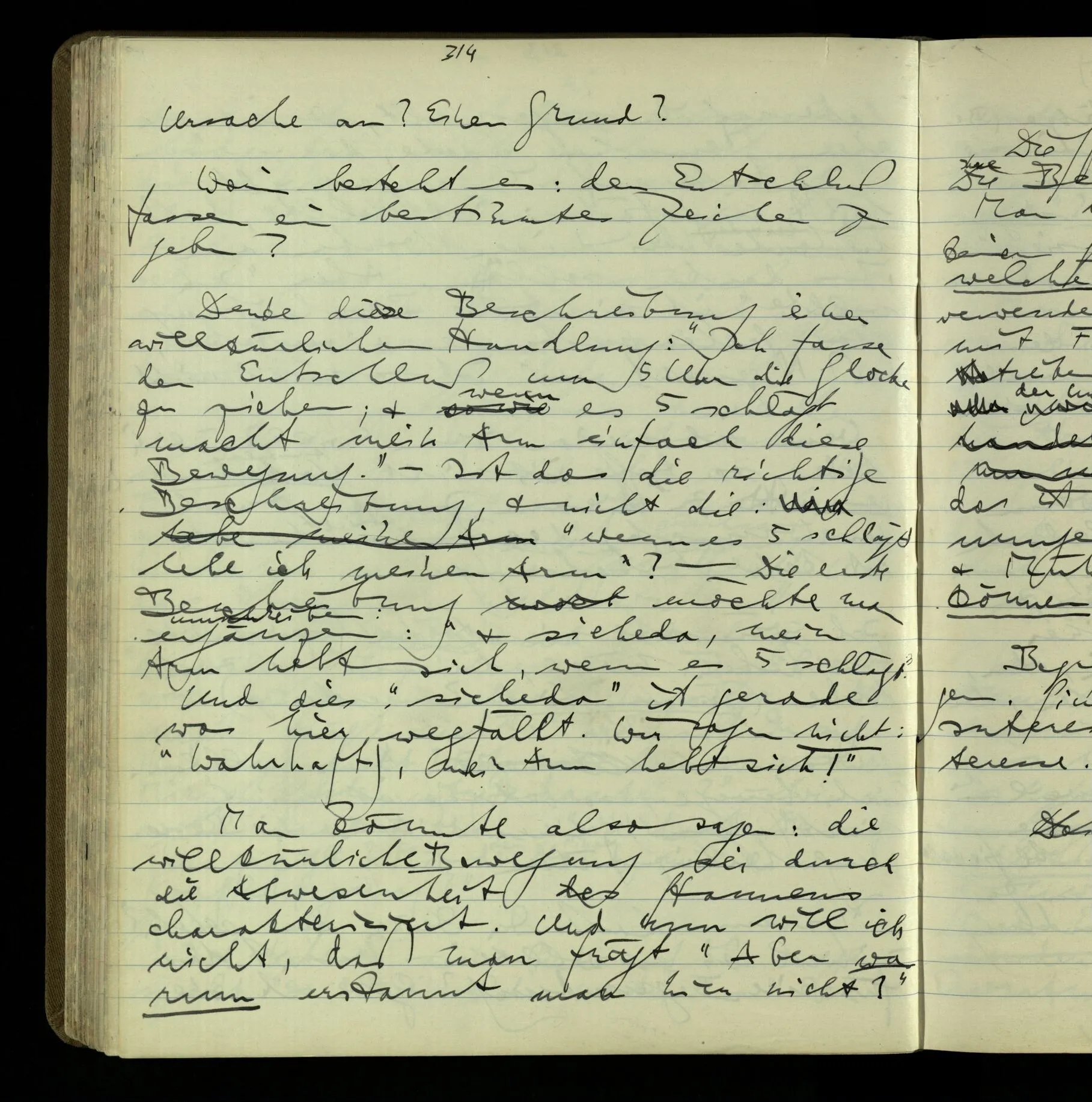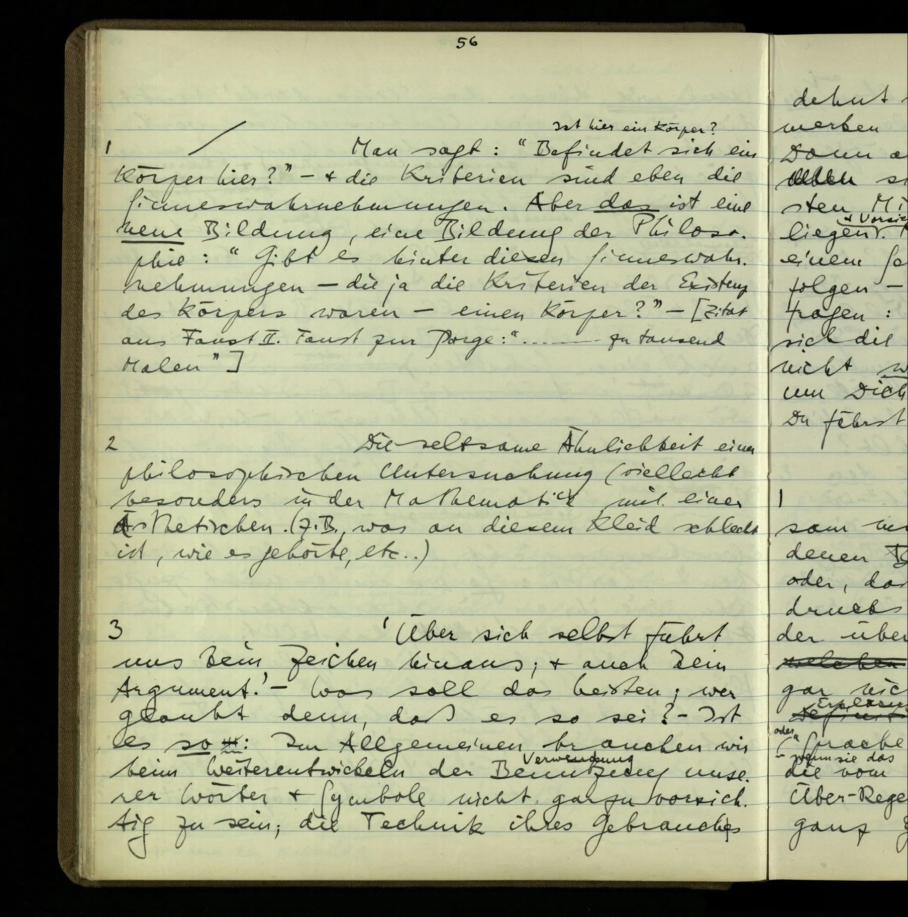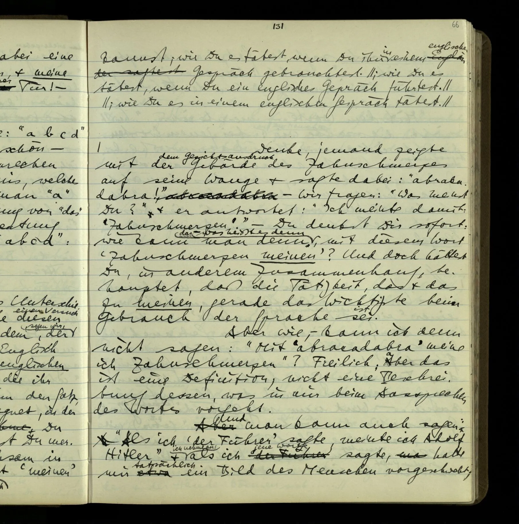 2 Geben wir denn den Worten, die uns gesagt werden, willkürlich Interpretationen? Kommt nicht das Erlebnis des Verstehens mit dem Erlebnis des Hörens (oder Sehens) der Zeichen, wenn wir die Sprache verstehen? Wenn mir jemand etwas sagt & ich verstehe (es), so geschieht mir dies, so wie, daß ich höre. Und hier ist also Verstehen das Phänomen, – die Phänomene, welche sich einstellen, wenn ich einen deutschen Satz höre, & die dieses Hören unterscheiden von dem eines Satzes einer mir unbekannten Sprache.