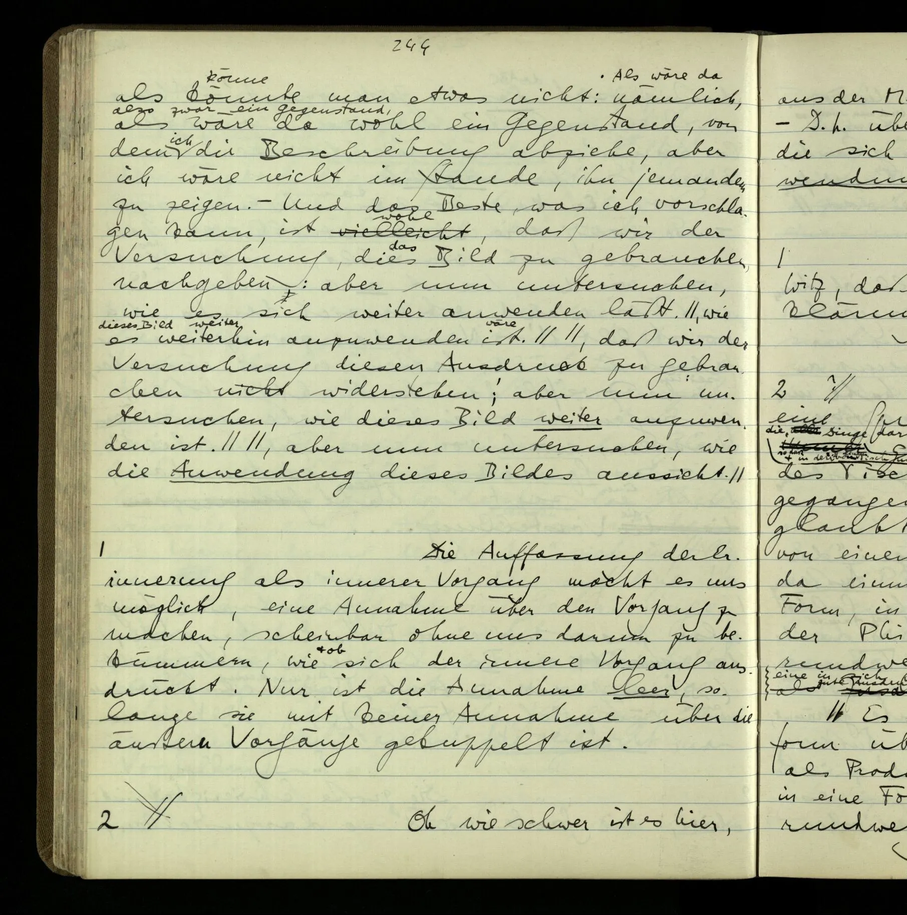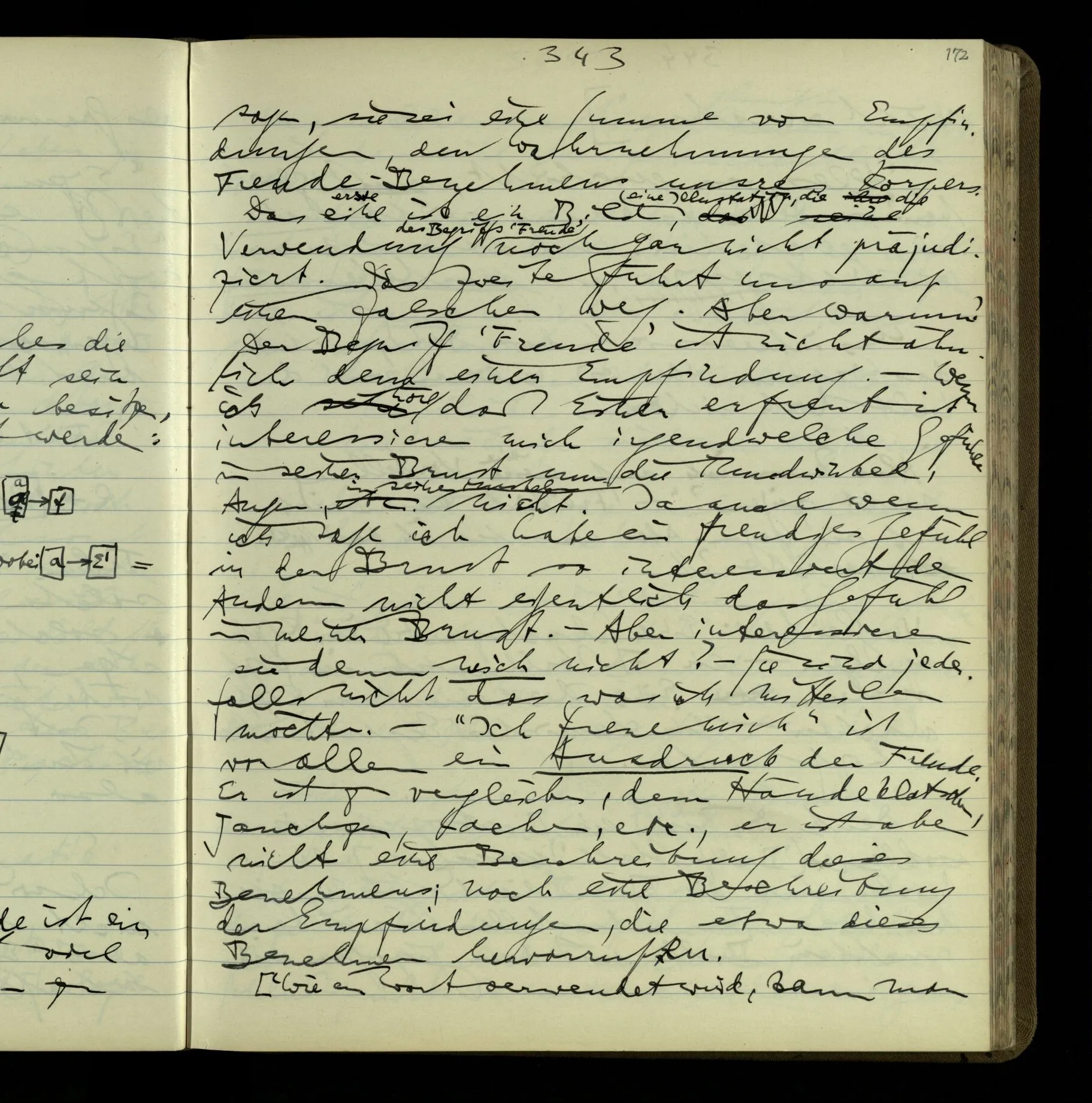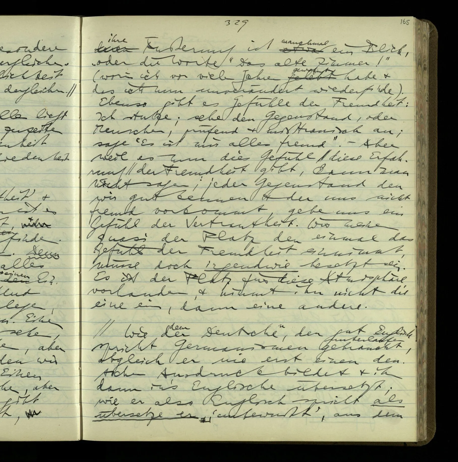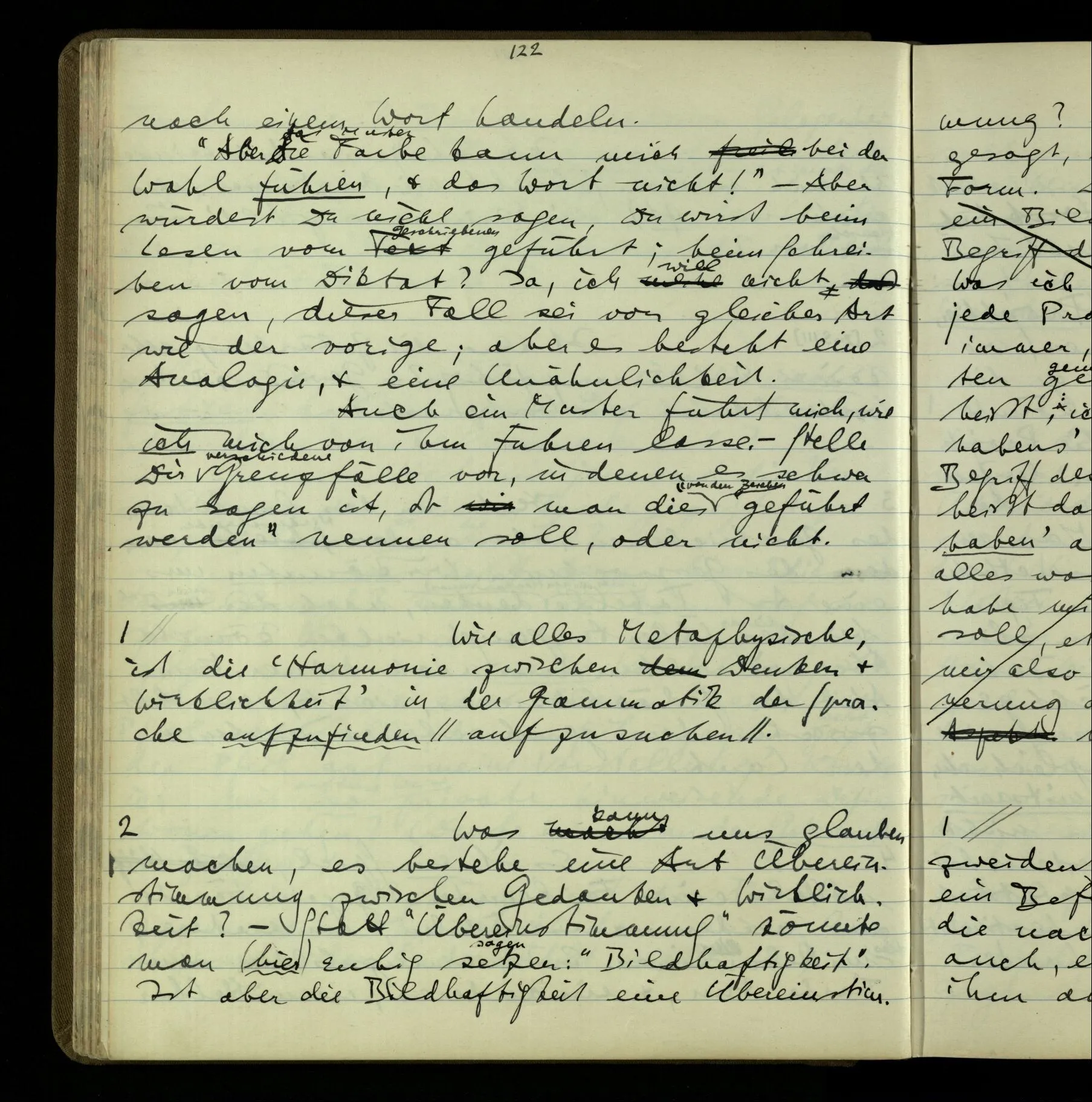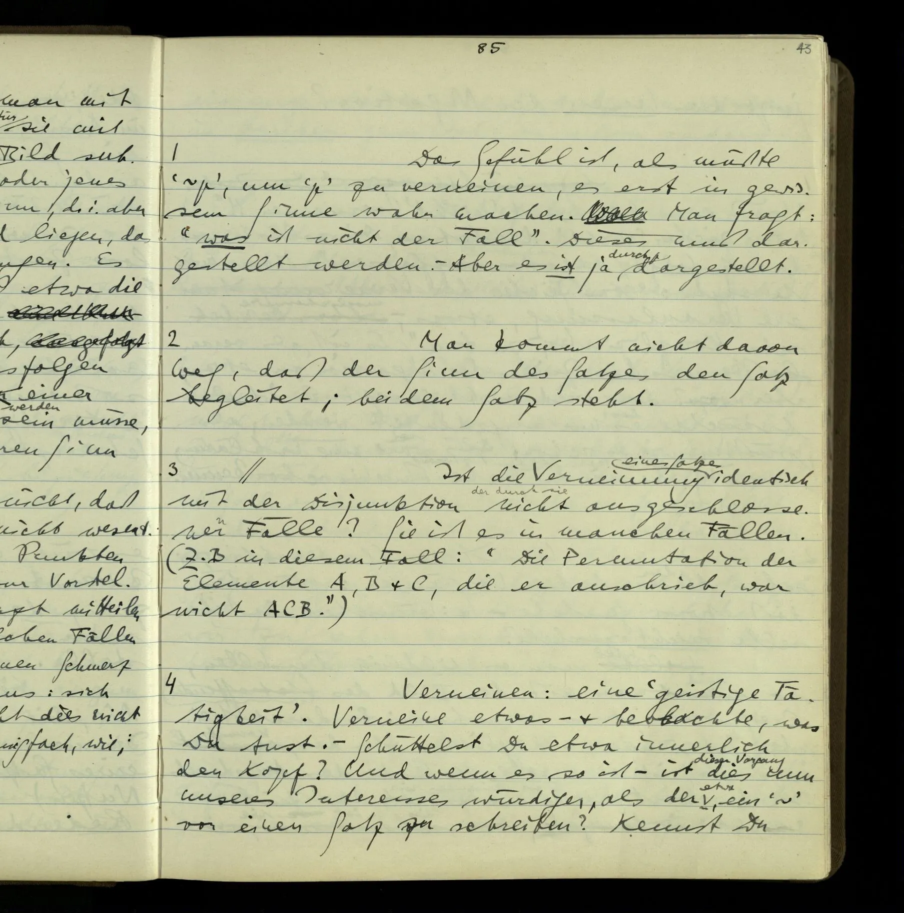 2 Geben wir denn den Worten, die uns gesagt werden, willkürlich Interpretationen? Kommt nicht das Erlebnis des Verstehens mit dem Erlebnis des Hörens (oder Sehens) der Zeichen, wenn wir die Sprache verstehen? Wenn mir jemand etwas sagt & ich verstehe (es), so geschieht mir dies, so wie, daß ich höre. Und hier ist also Verstehen das Phänomen, – die Phänomene, welche sich einstellen, wenn ich einen deutschen Satz höre, & die dieses Hören unterscheiden von dem eines Satzes einer mir unbekannten Sprache.