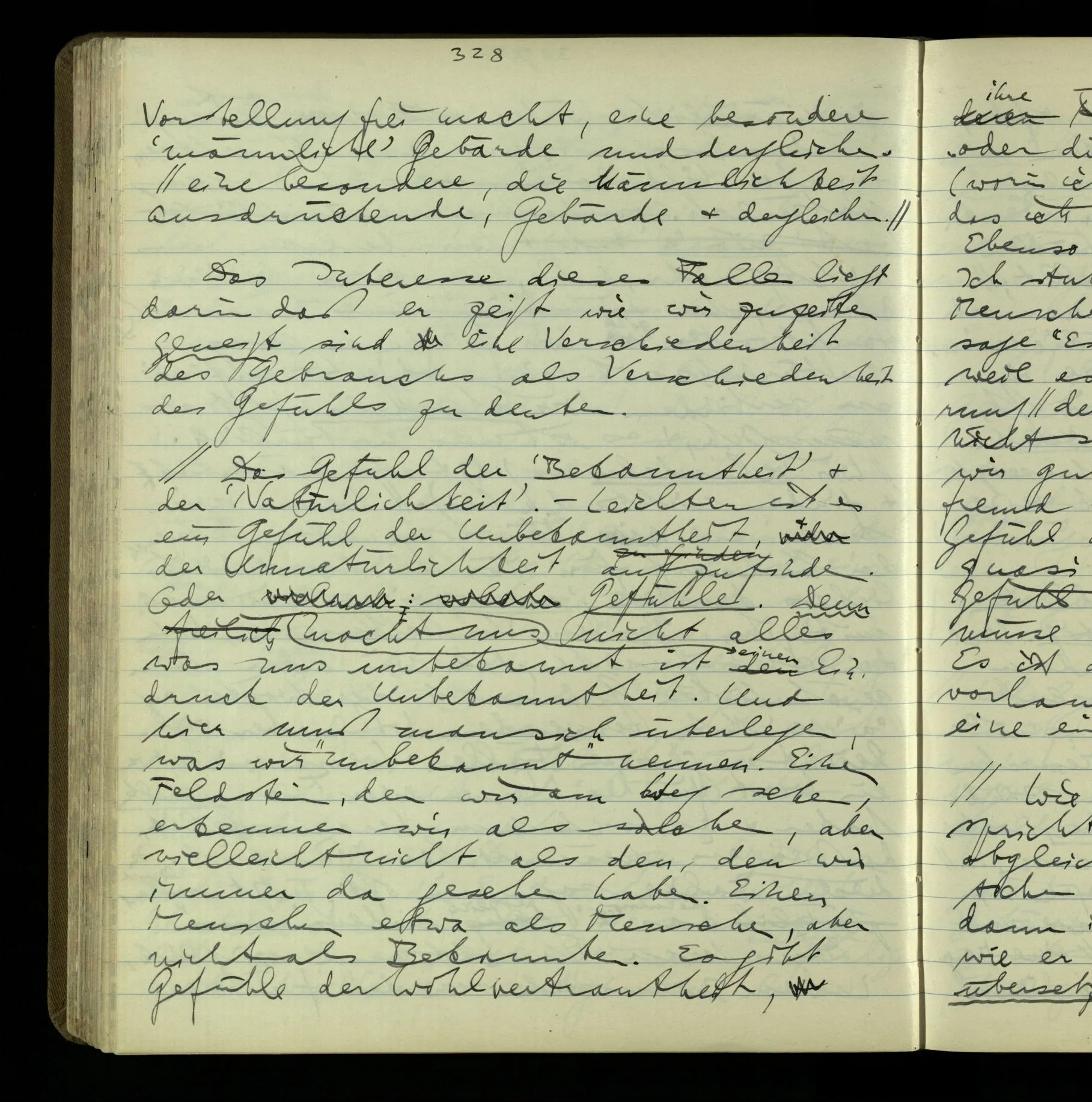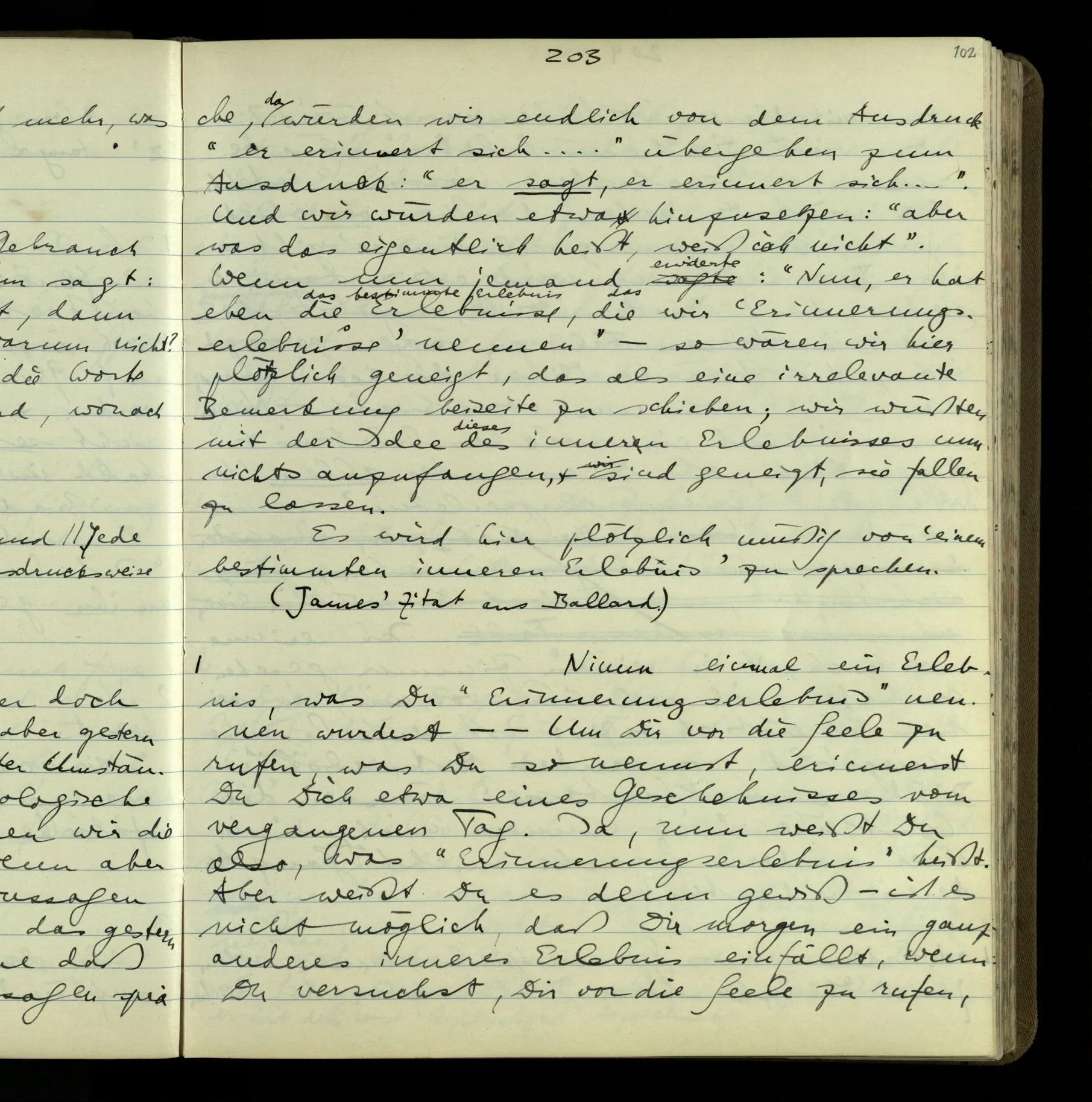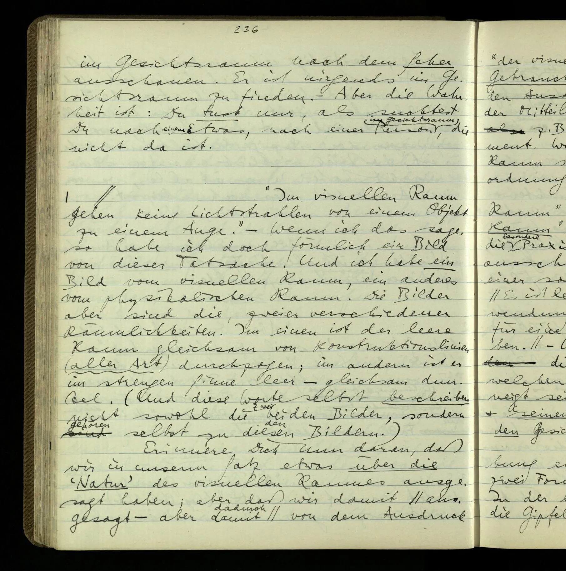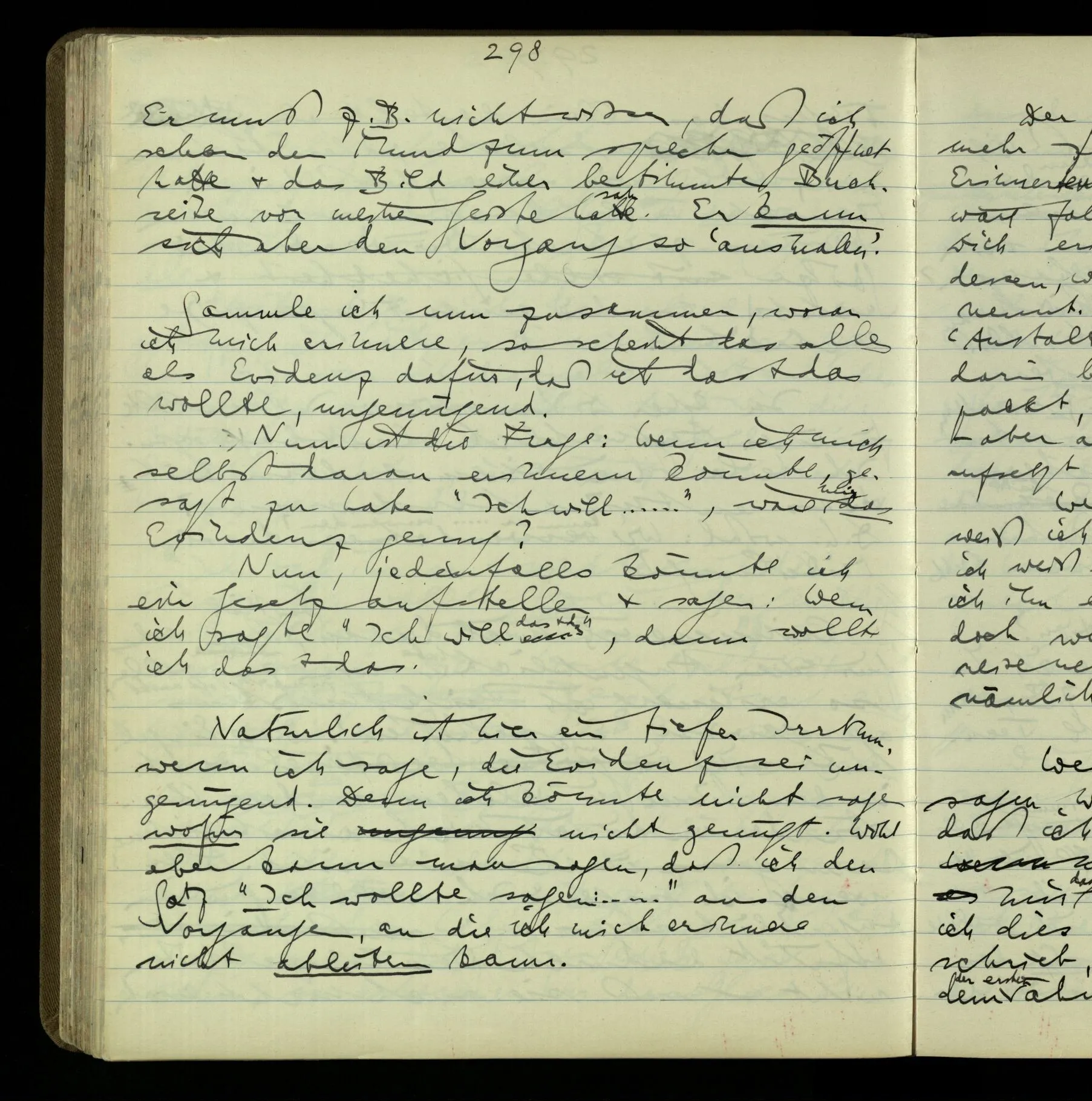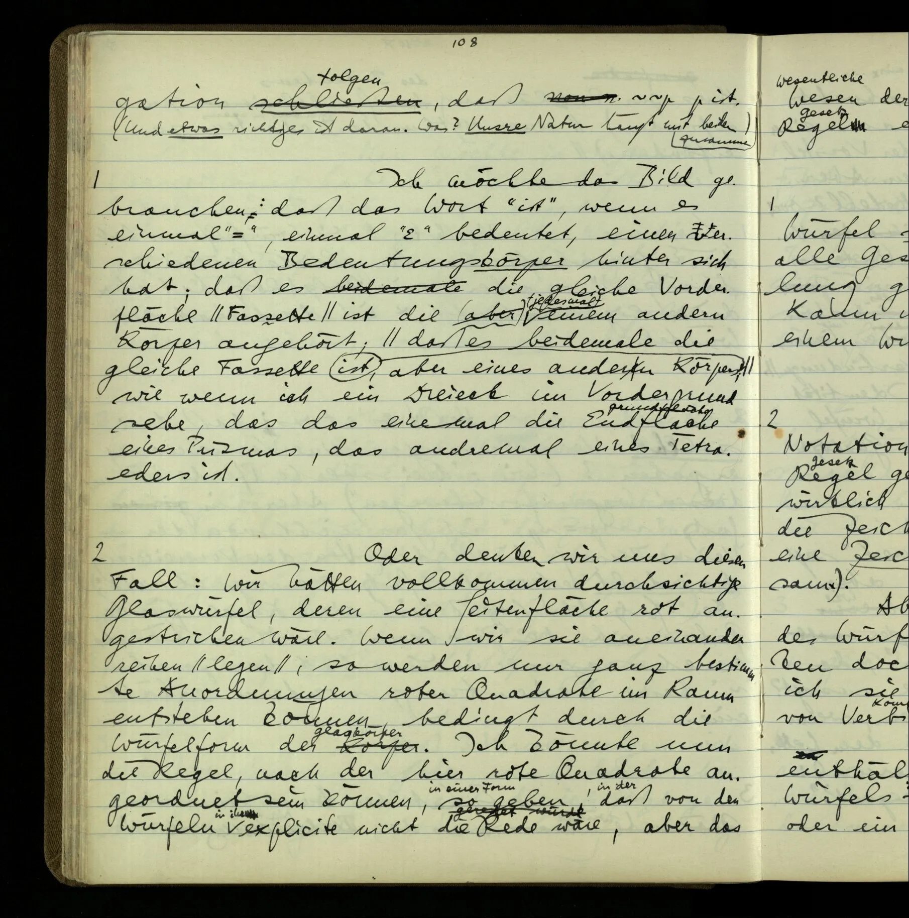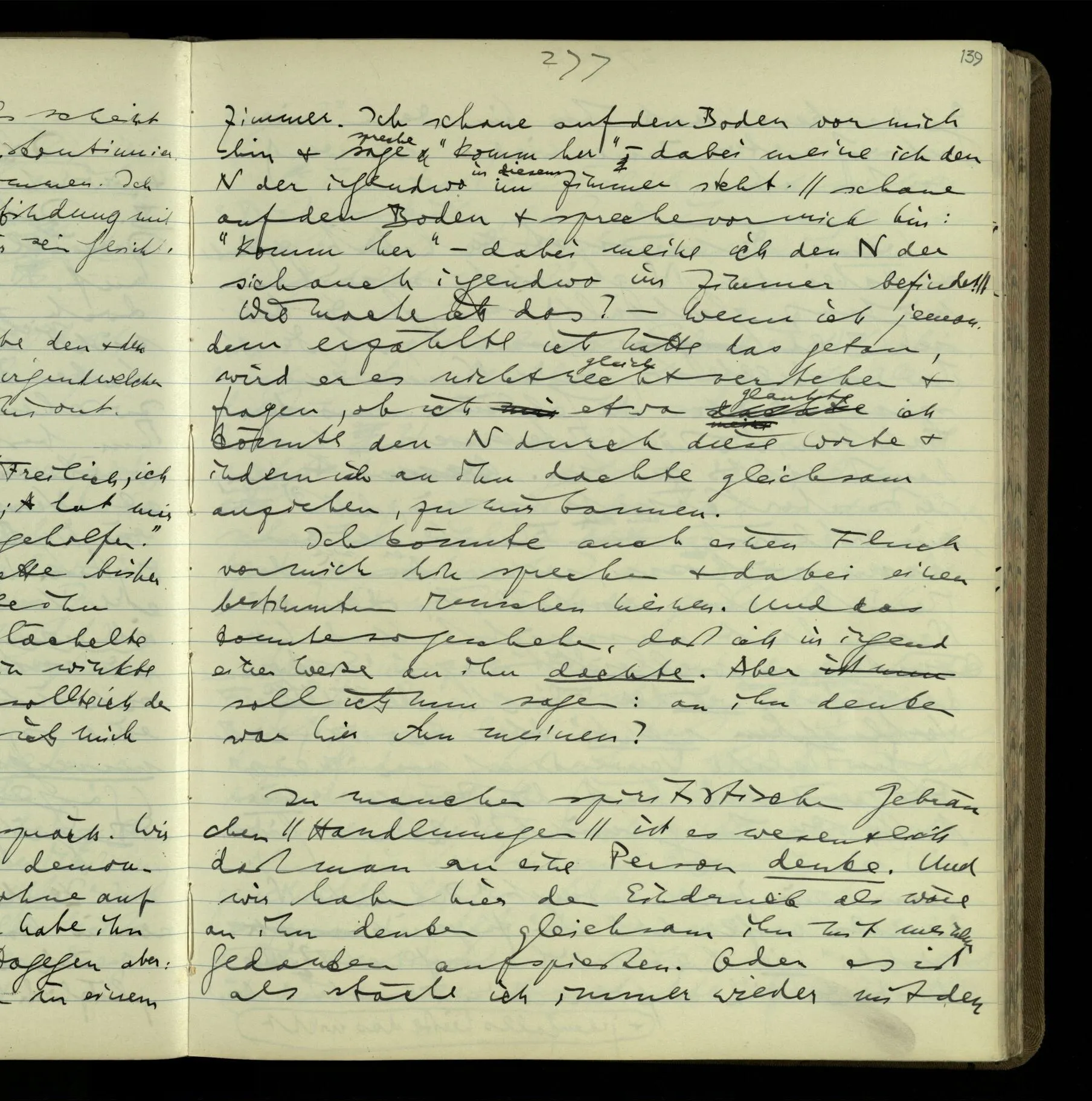 2 Geben wir denn den Worten, die uns gesagt werden, willkürlich Interpretationen? Kommt nicht das Erlebnis des Verstehens mit dem Erlebnis des Hörens (oder Sehens) der Zeichen, wenn wir die Sprache verstehen? Wenn mir jemand etwas sagt & ich verstehe (es), so geschieht mir dies, so wie, daß ich höre. Und hier ist also Verstehen das Phänomen, – die Phänomene, welche sich einstellen, wenn ich einen deutschen Satz höre, & die dieses Hören unterscheiden von dem eines Satzes einer mir unbekannten Sprache.