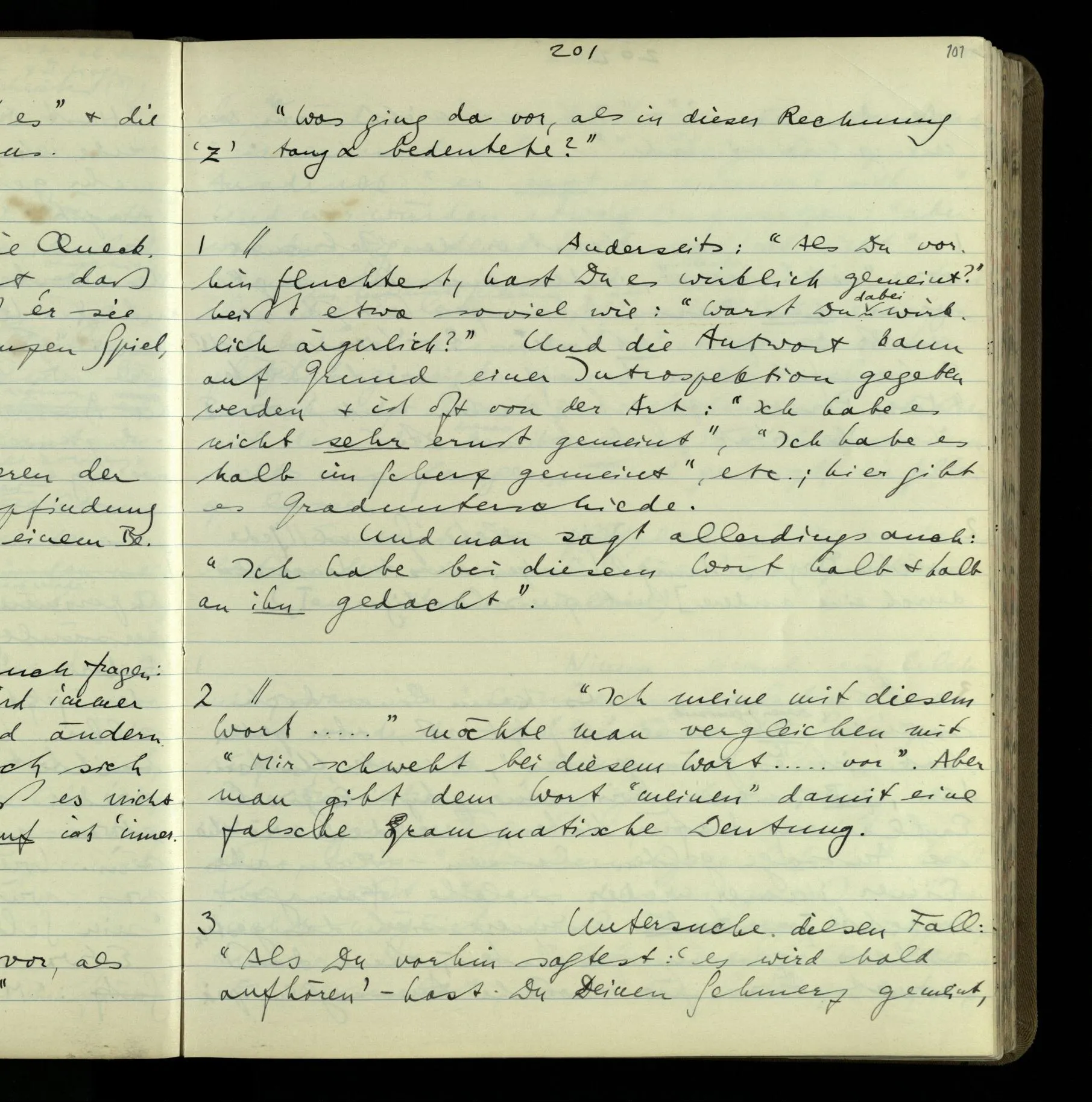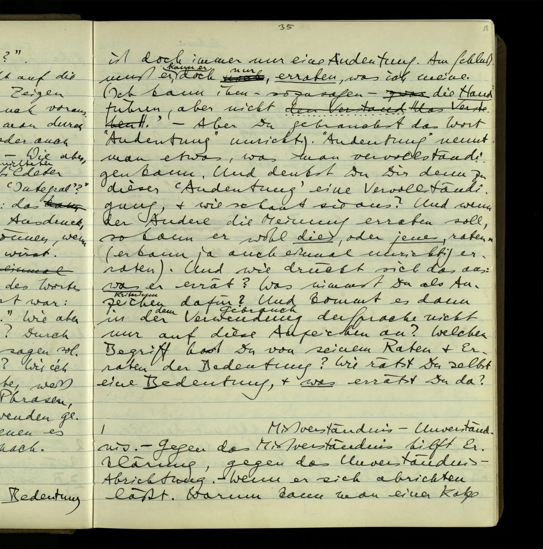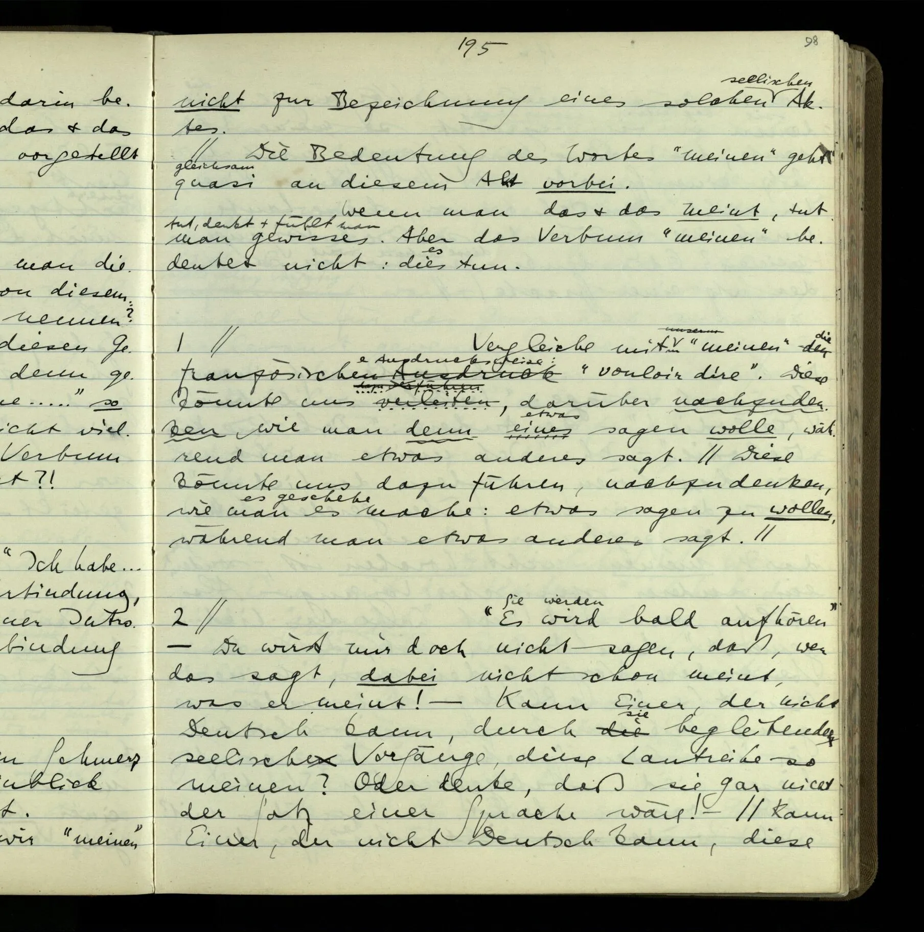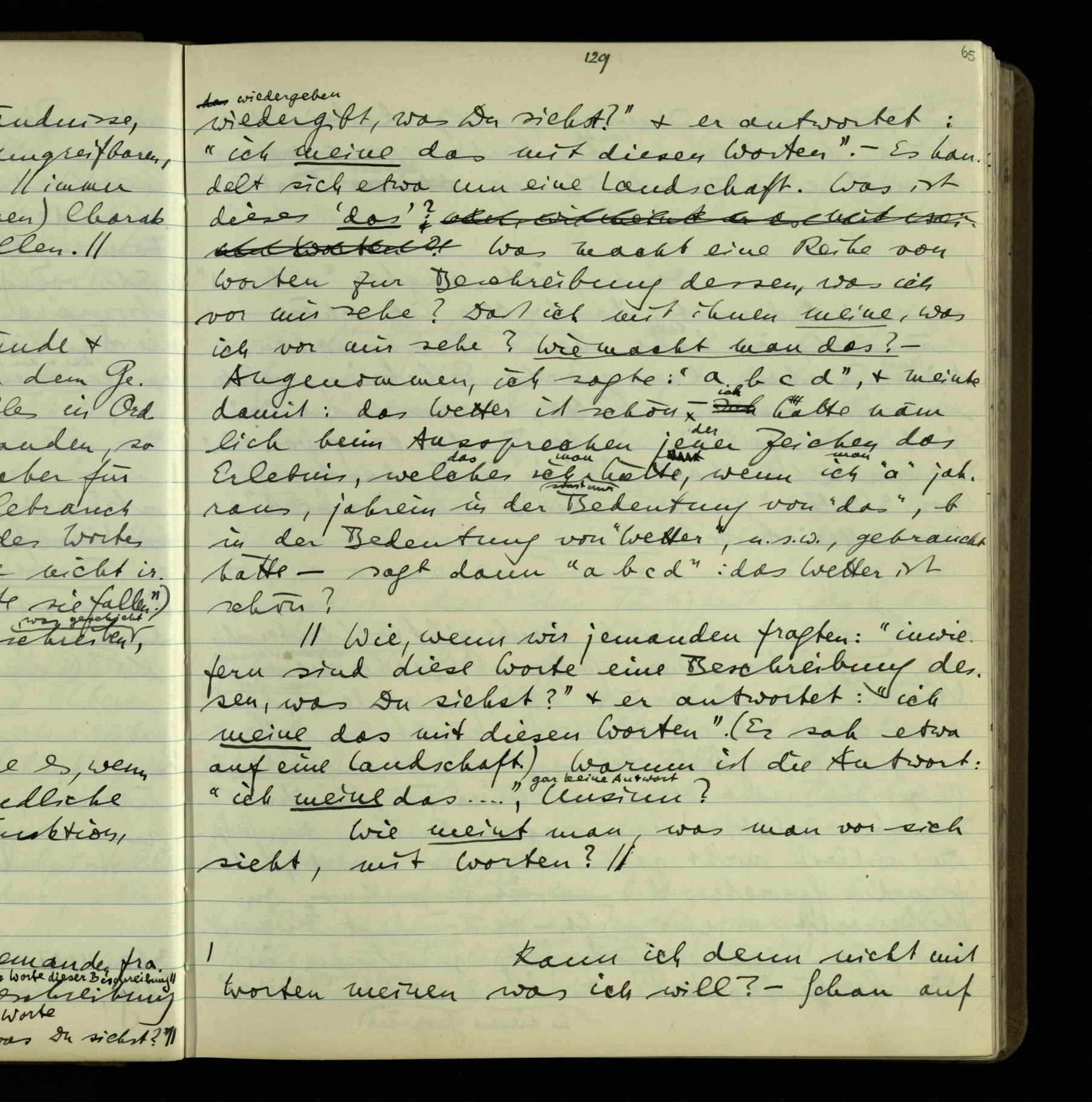 1 “Du hast mit der Hand eine Bewegung gemacht; hast Du etwas damit gemeint? – Ich dachte, Du meintest, ich solle zu Dir kommen.” Also er konnte etwas meinen, oder auch nichts meinen. Und wenn das erstere: dann, was er auch ausdrückte, oder etwas Anderes? Hat er mit seinem Ausdruck etwas anderes, als diesen, gemeint, oder hat er nur seinen Ausdruck – gemeint?
