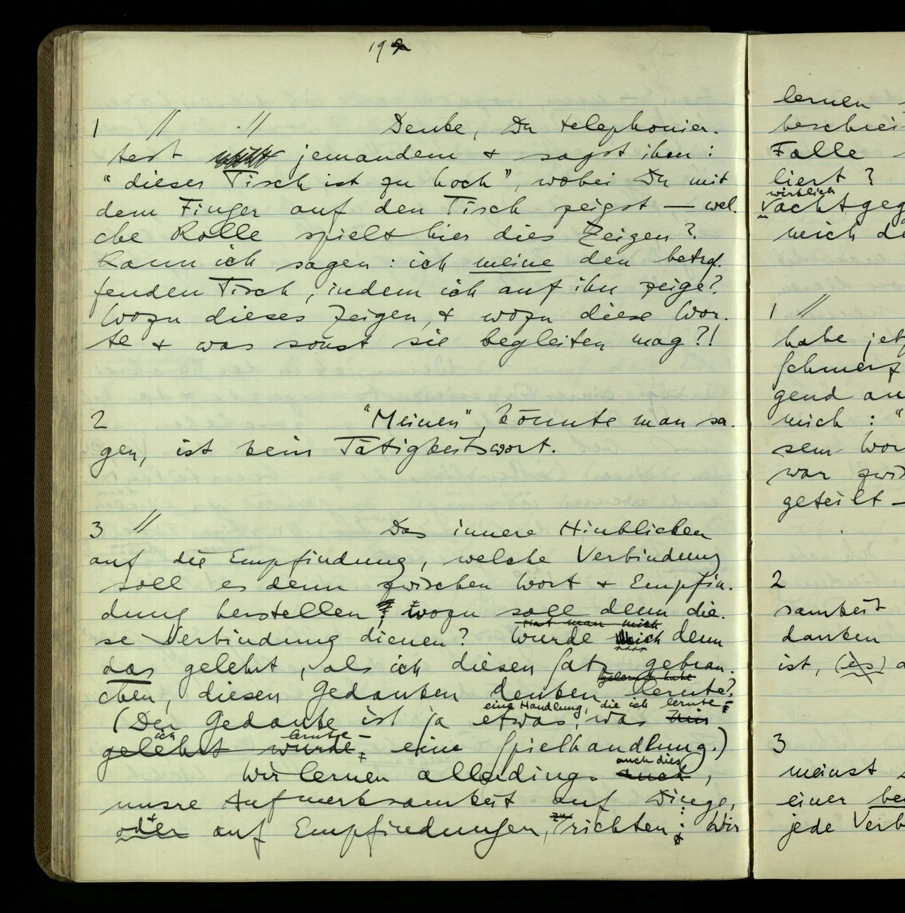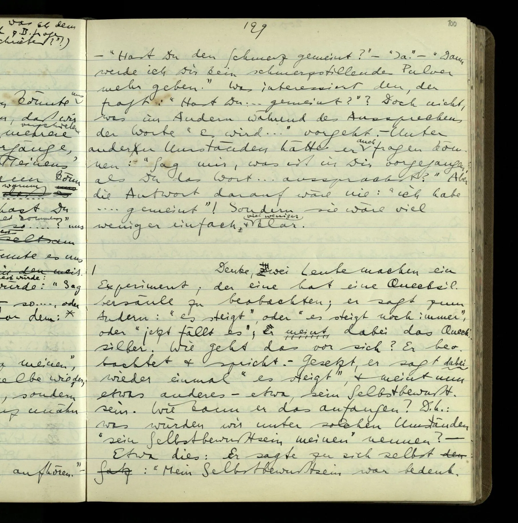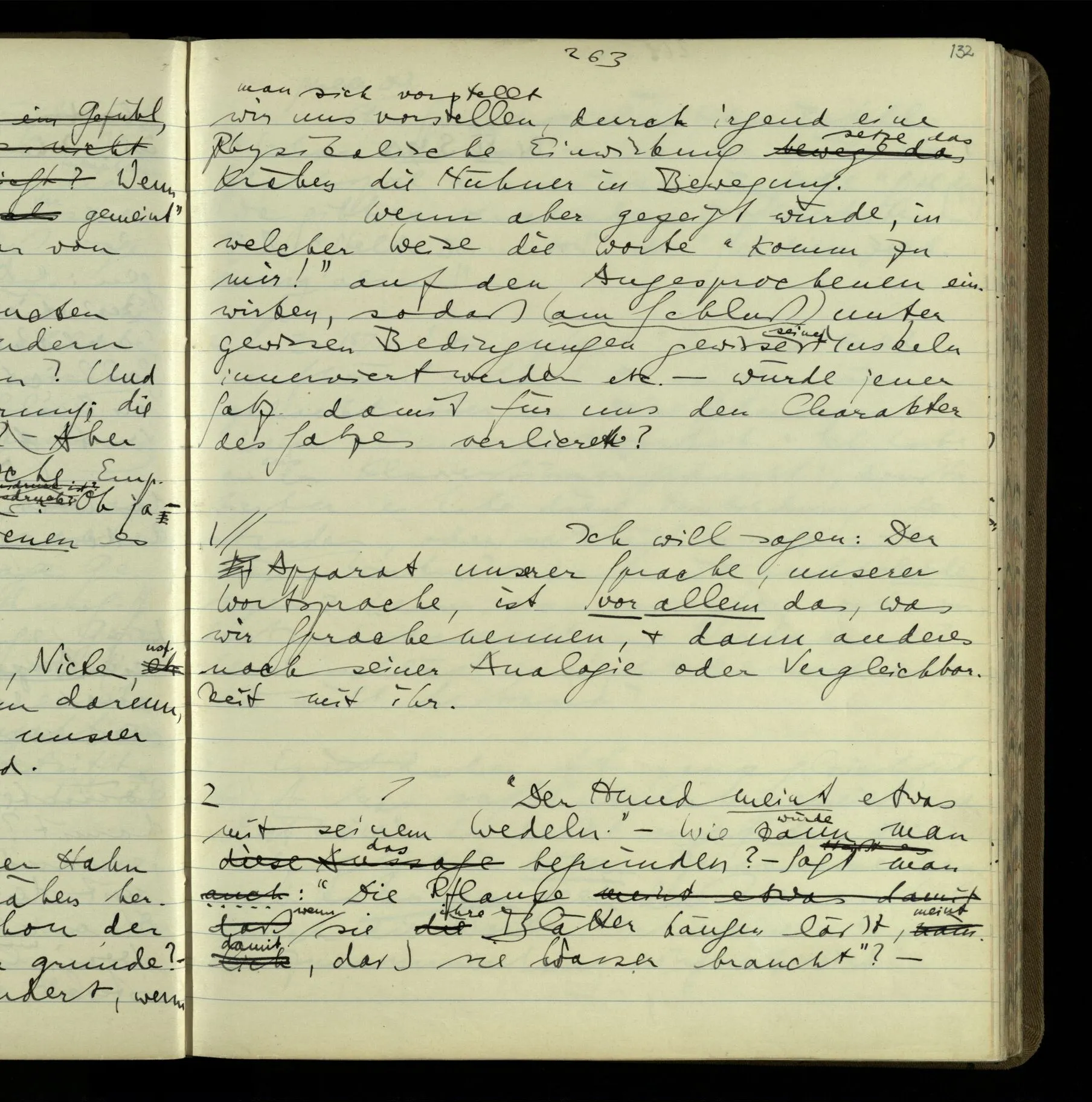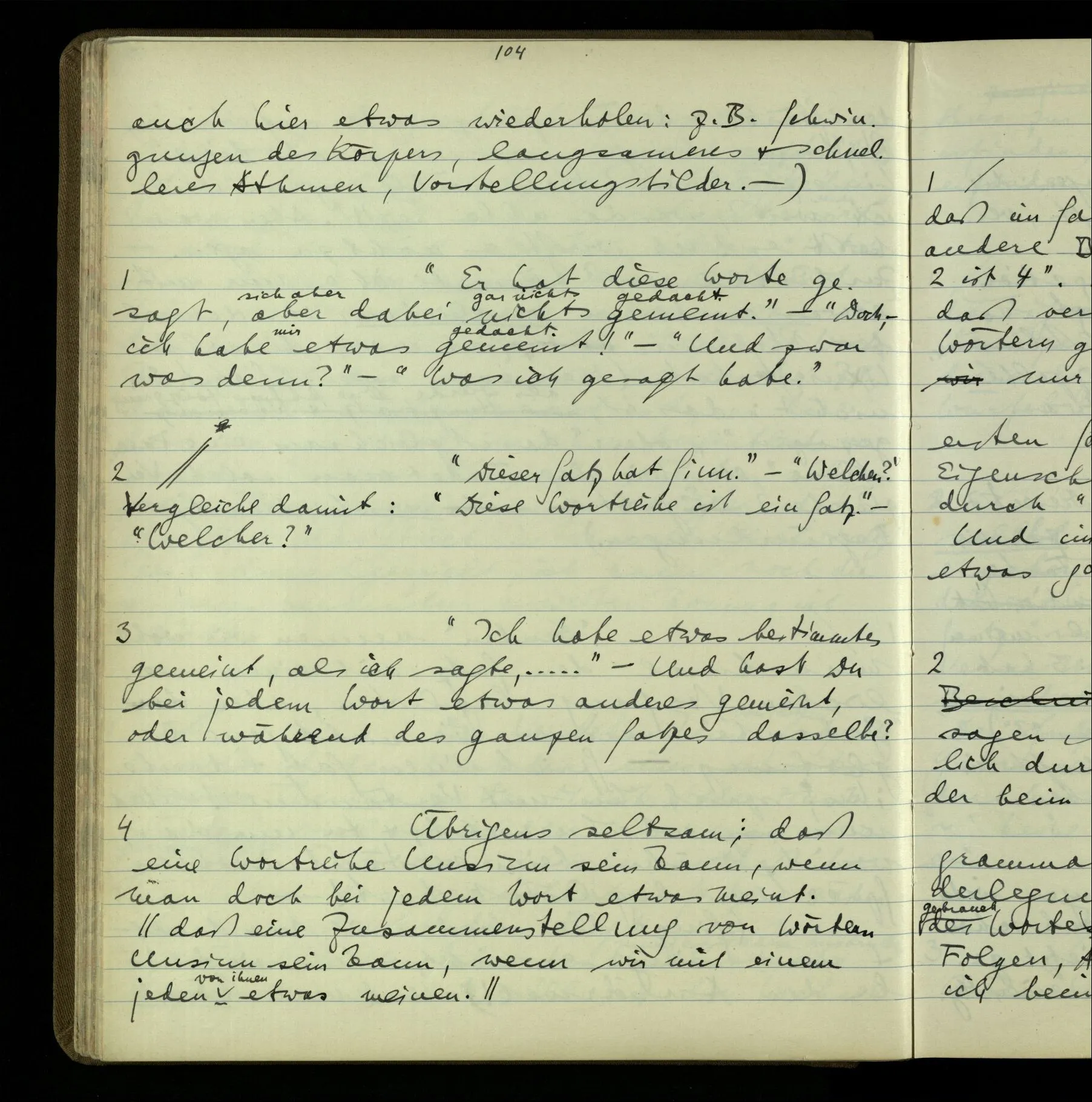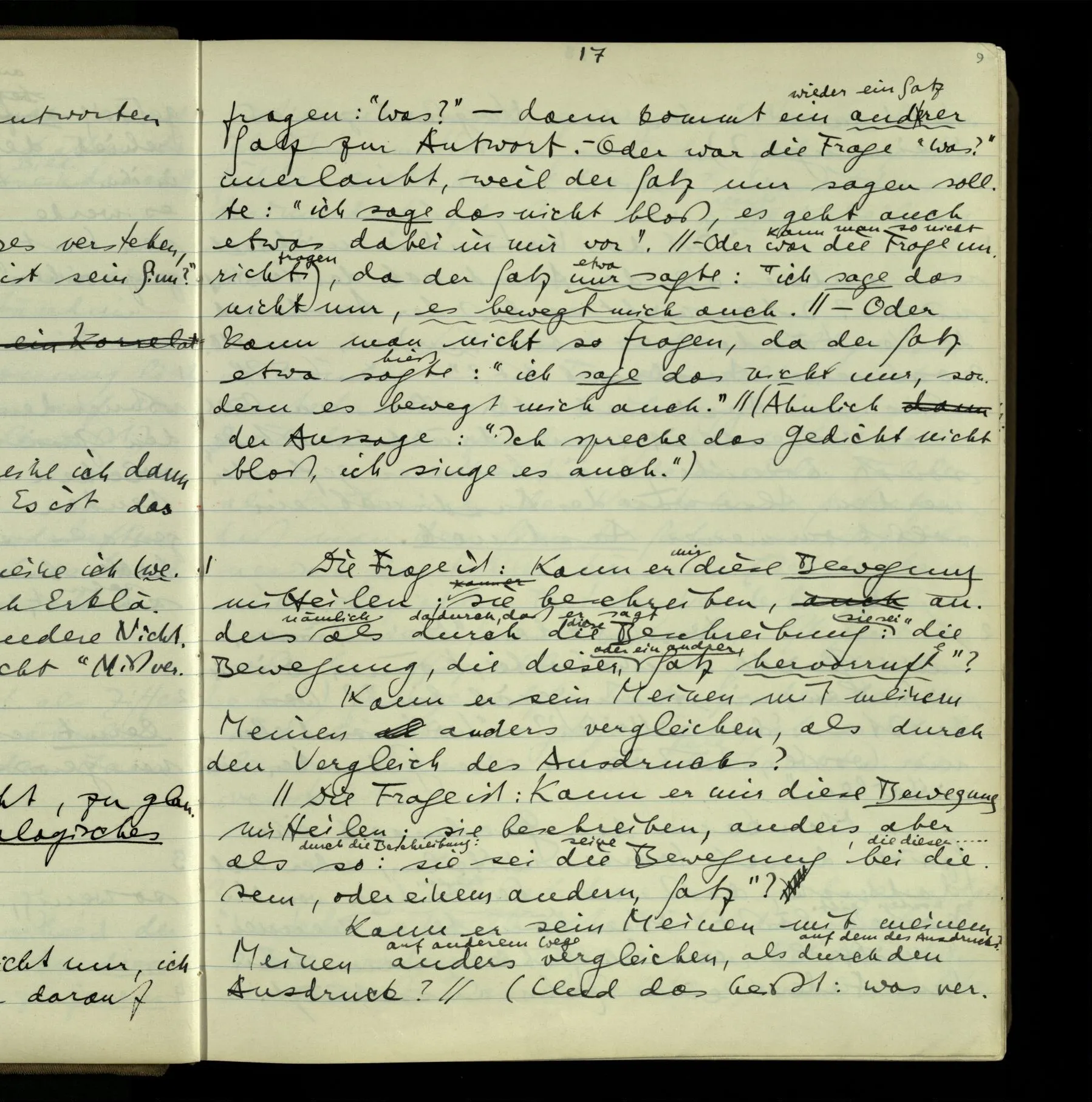 1 “Du hast mit der Hand eine Bewegung gemacht; hast Du etwas damit gemeint? – Ich dachte, Du meintest, ich solle zu Dir kommen.” Also er konnte etwas meinen, oder auch nichts meinen. Und wenn das erstere: dann, was er auch ausdrückte, oder etwas Anderes? Hat er mit seinem Ausdruck etwas anderes, als diesen, gemeint, oder hat er nur seinen Ausdruck – gemeint?