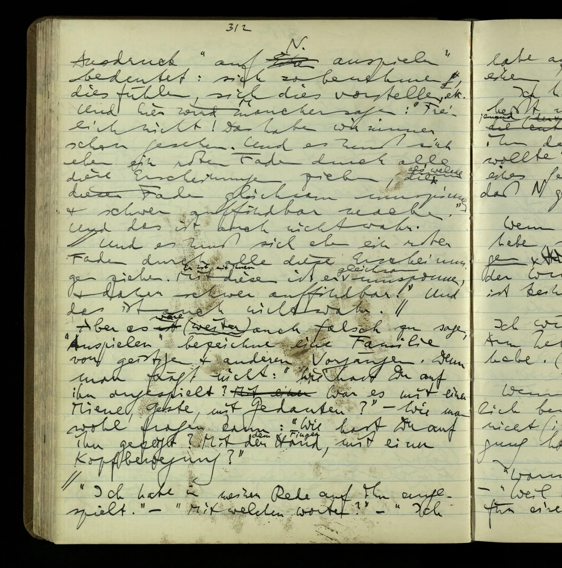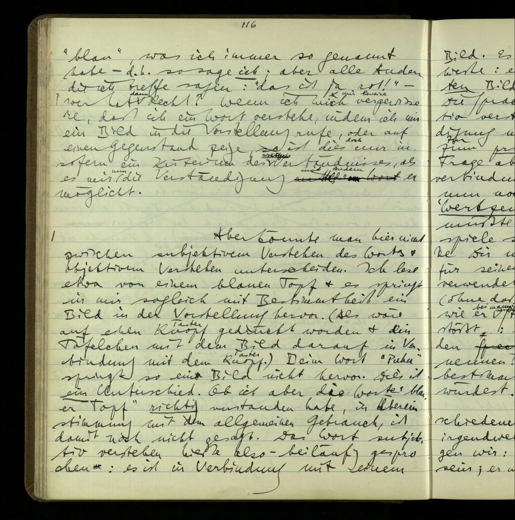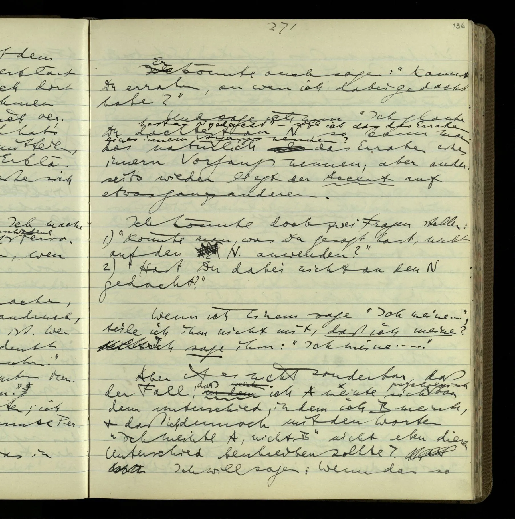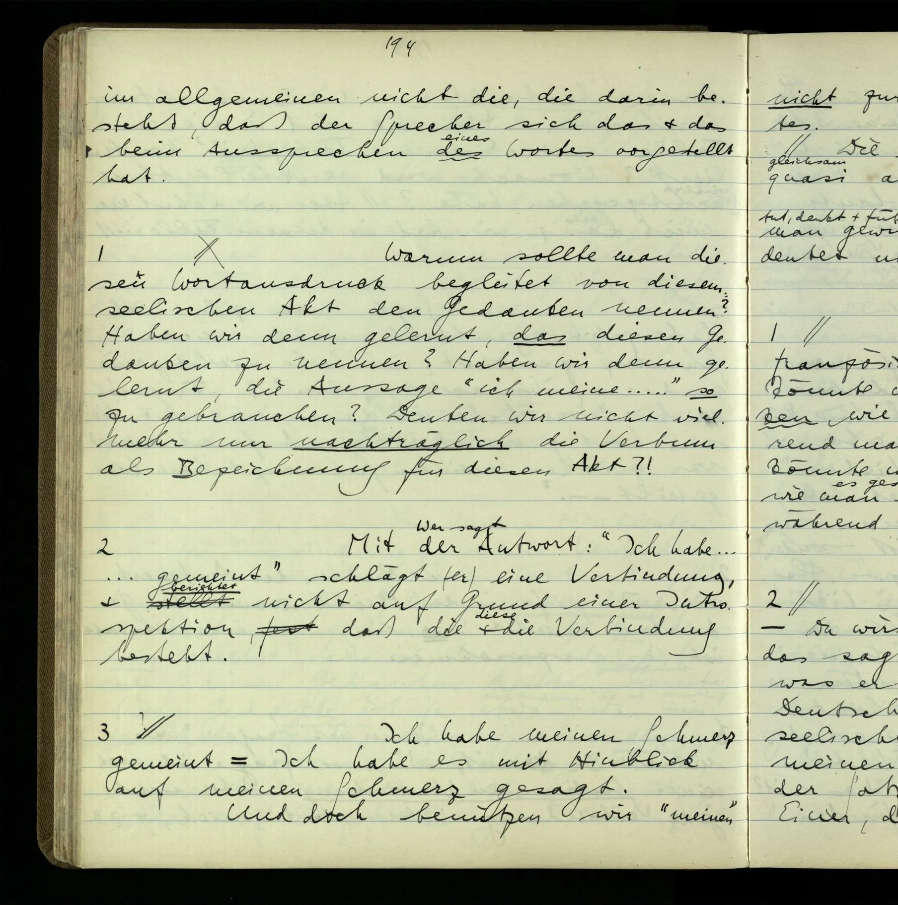 1 “Du hast mit der Hand eine Bewegung gemacht; hast Du etwas damit gemeint? – Ich dachte, Du meintest, ich solle zu Dir kommen.” Also er konnte etwas meinen, oder auch nichts meinen. Und wenn das erstere: dann, was er auch ausdrückte, oder etwas Anderes? Hat er mit seinem Ausdruck etwas anderes, als diesen, gemeint, oder hat er nur seinen Ausdruck – gemeint?