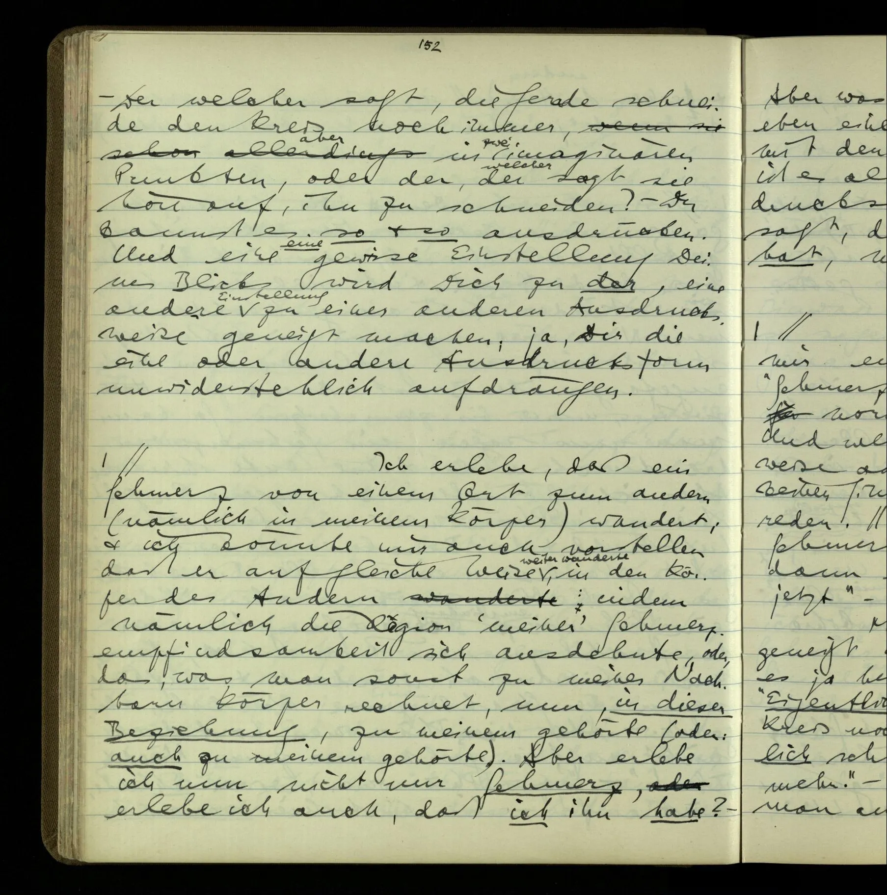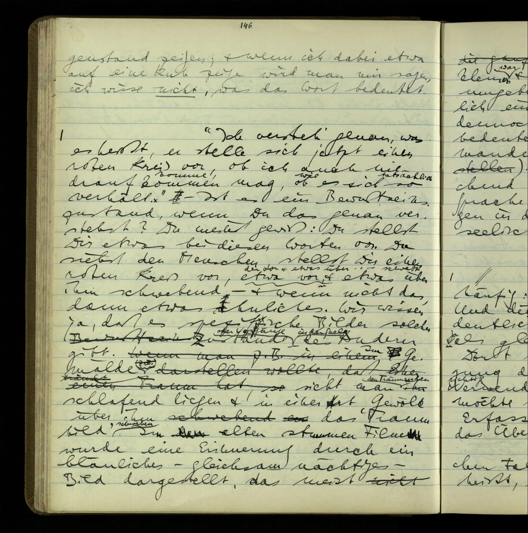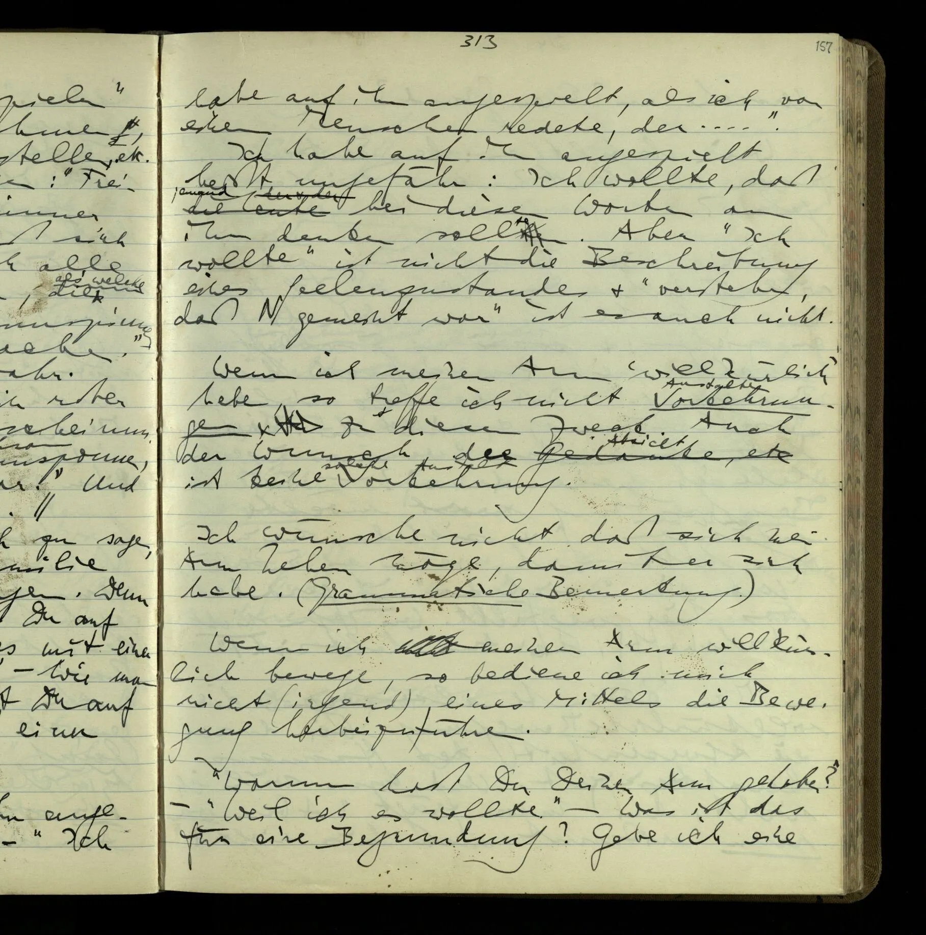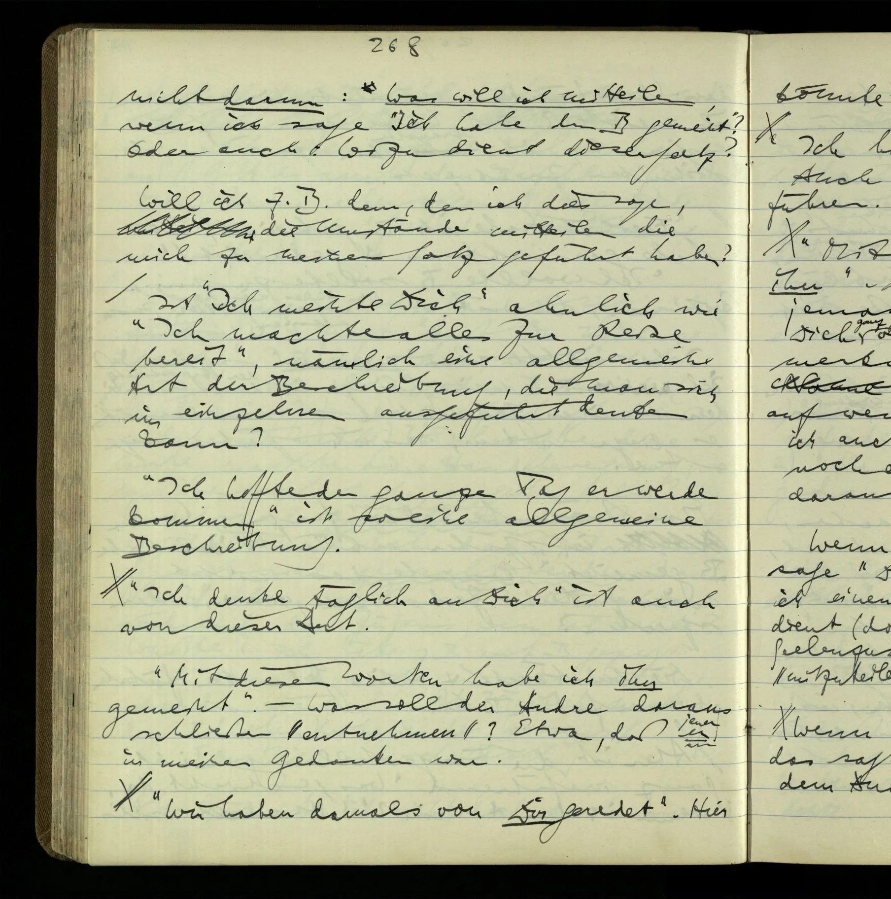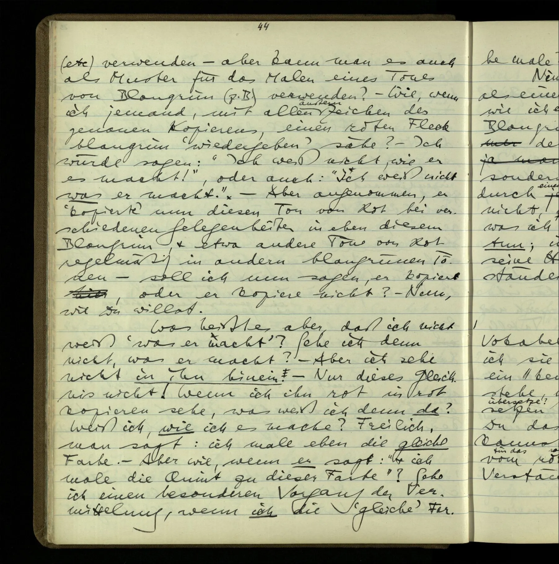 1 “Du hast mit der Hand eine Bewegung gemacht; hast Du etwas damit gemeint? – Ich dachte, Du meintest, ich solle zu Dir kommen.” Also er konnte etwas meinen, oder auch nichts meinen. Und wenn das erstere: dann, was er auch ausdrückte, oder etwas Anderes? Hat er mit seinem Ausdruck etwas anderes, als diesen, gemeint, oder hat er nur seinen Ausdruck – gemeint?