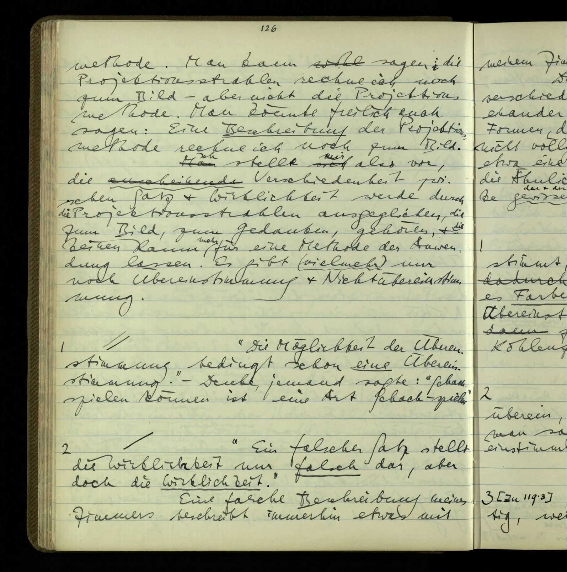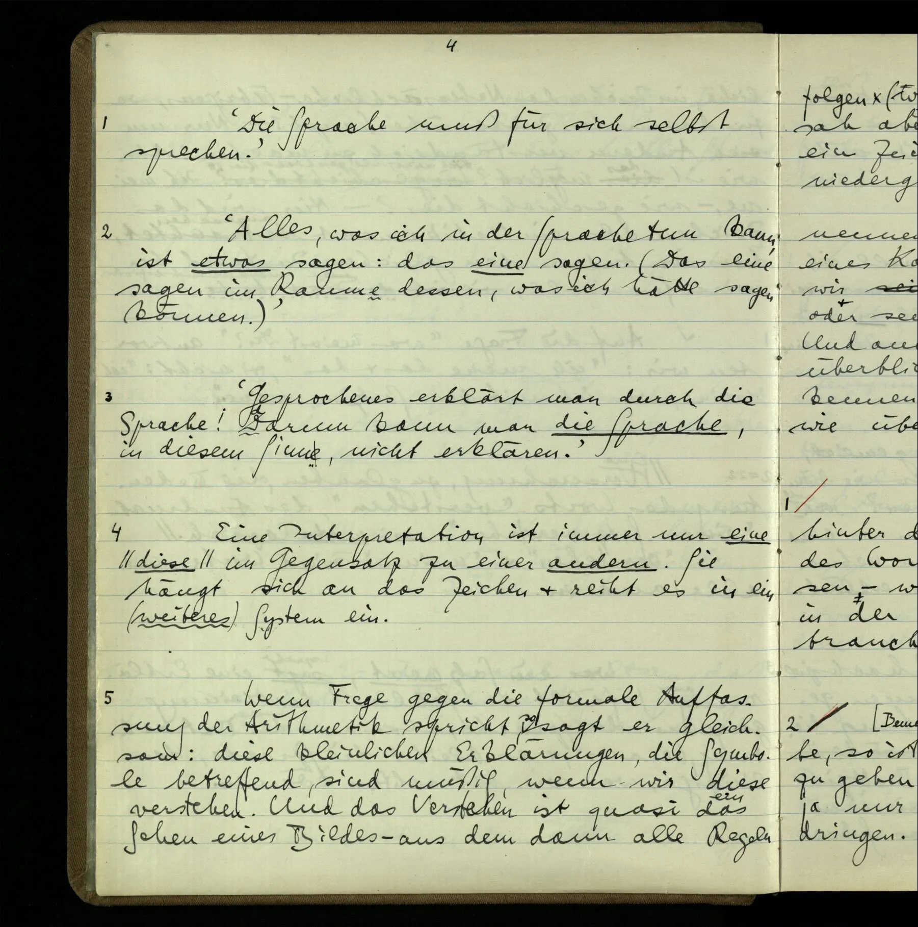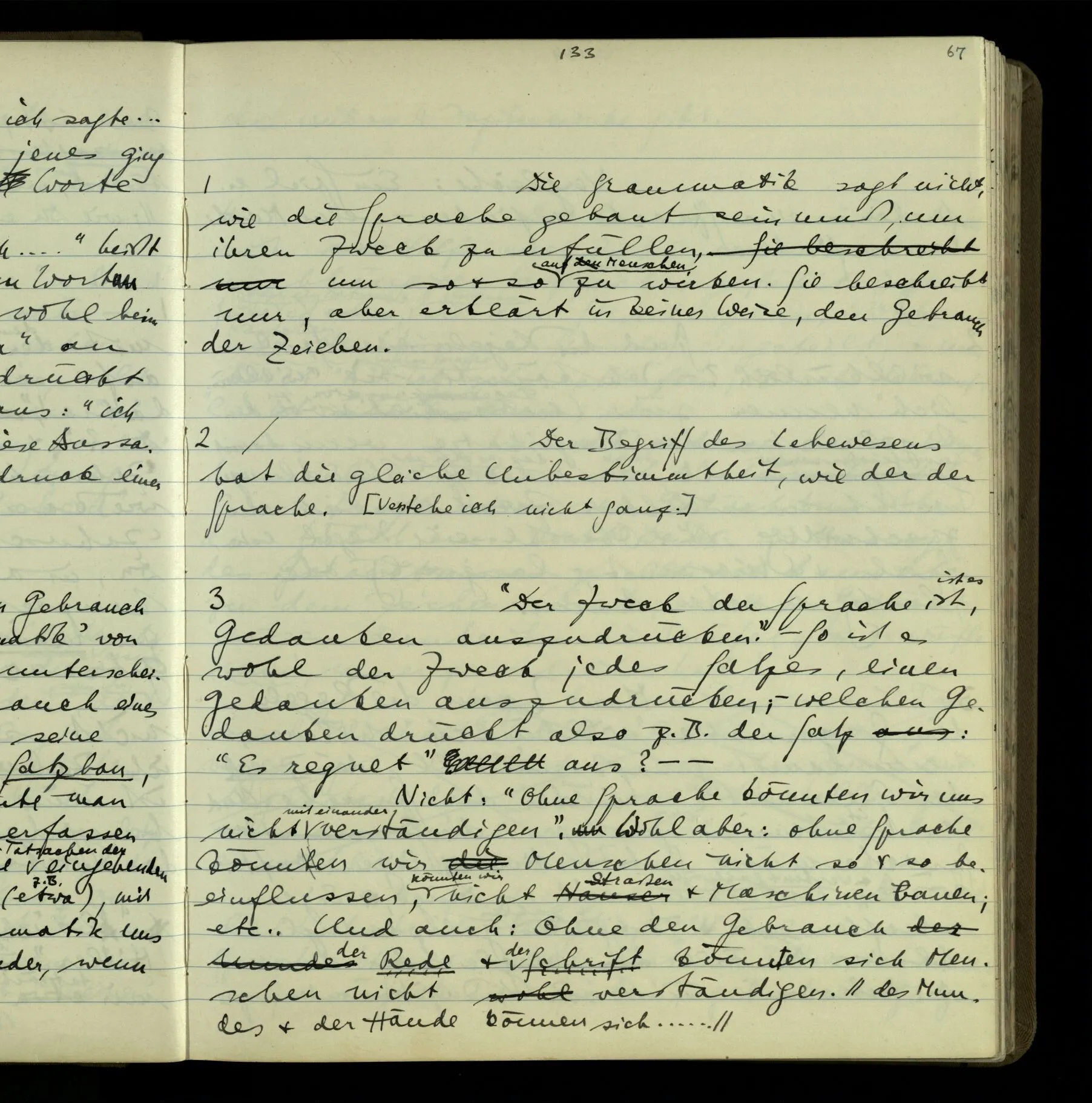 3 Was ein Satz meint, spricht eine Erklärung aus. So fällt am Schluß die Meinung ganz aus der Sprache, also aus der Betrachtung, heraus; & es bleibt die Sprache, das Einzige, was wir betrachten können.