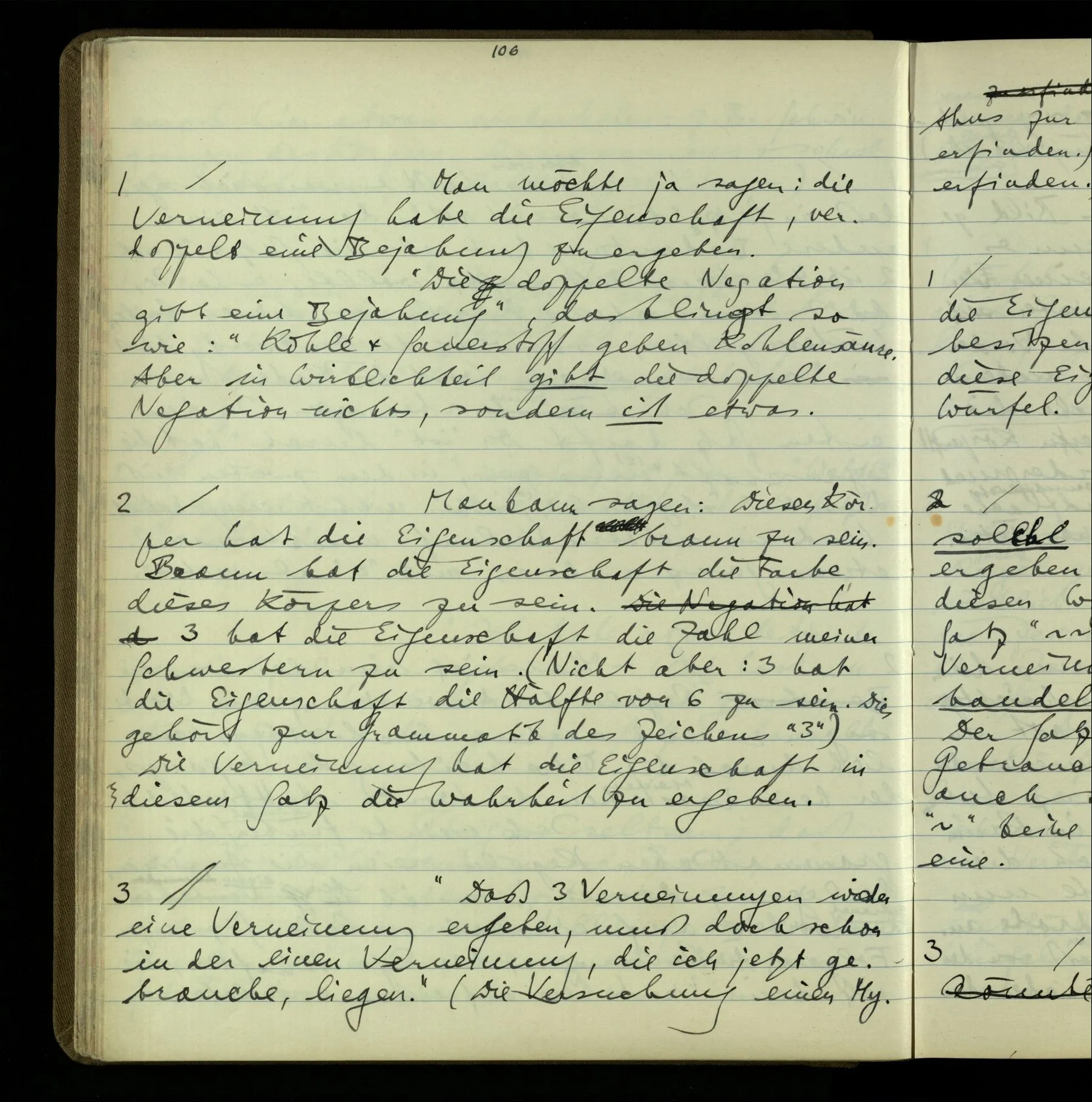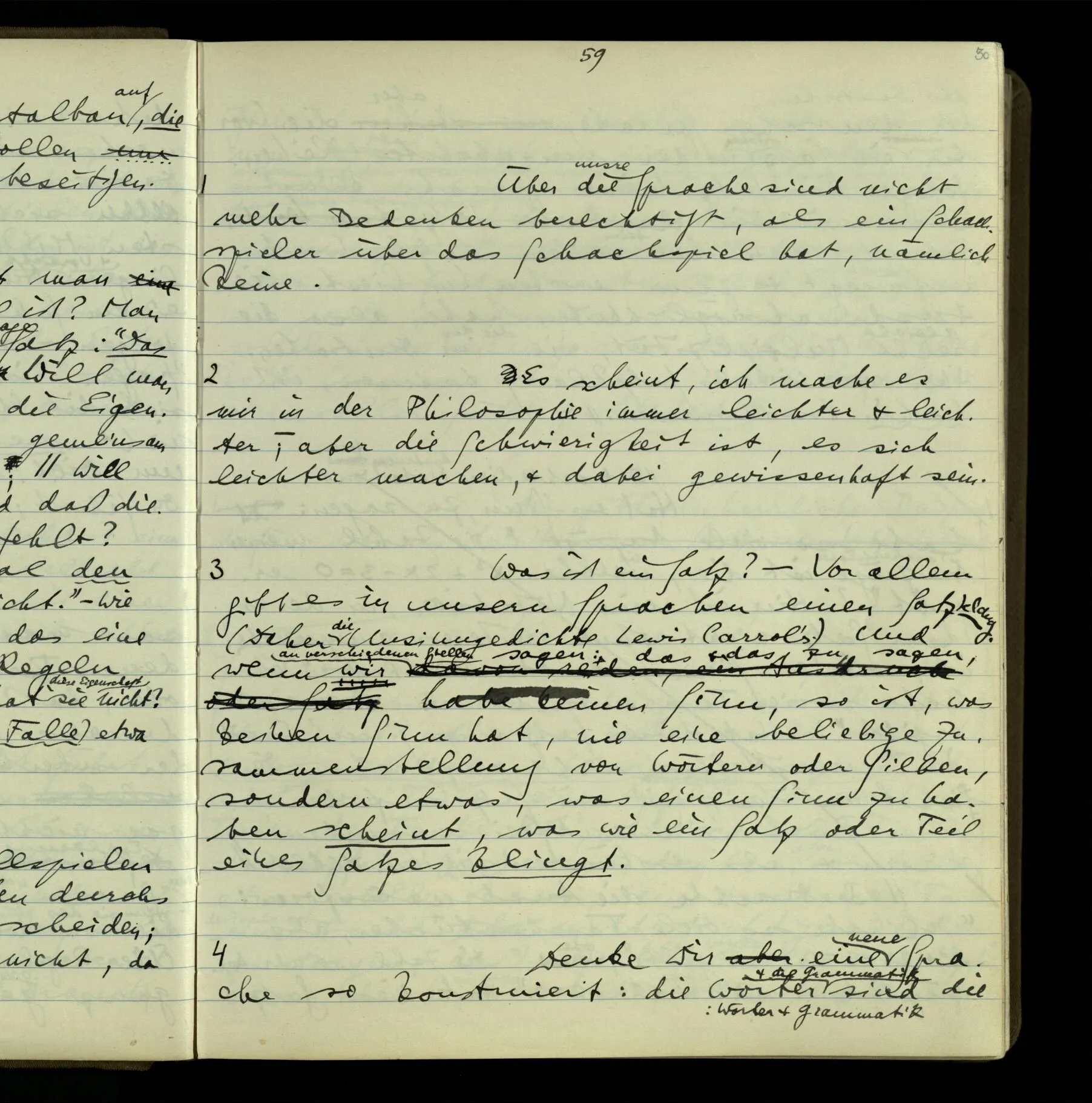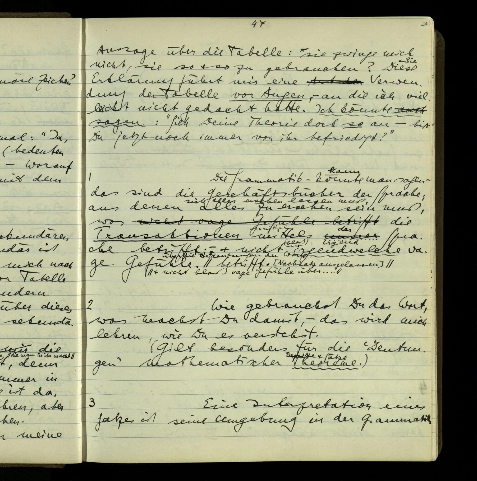 3 Was ein Satz meint, spricht eine Erklärung aus. So fällt am Schluß die Meinung ganz aus der Sprache, also aus der Betrachtung, heraus; & es bleibt die Sprache, das Einzige, was wir betrachten können.