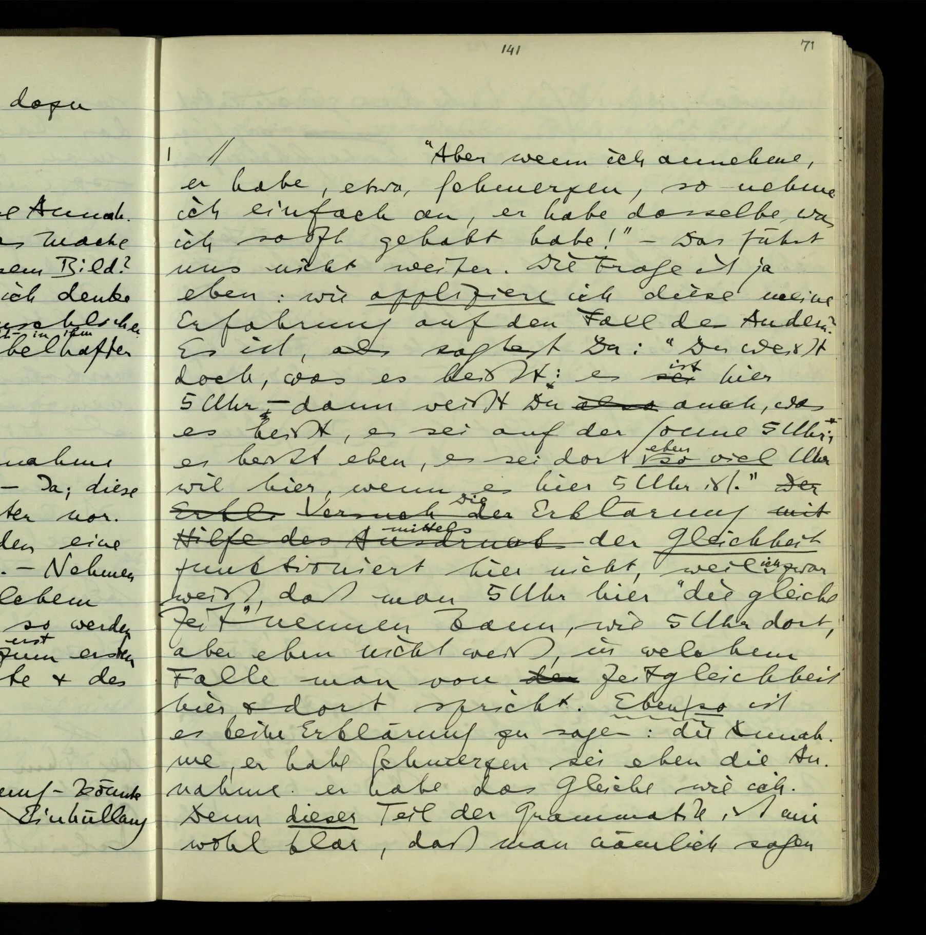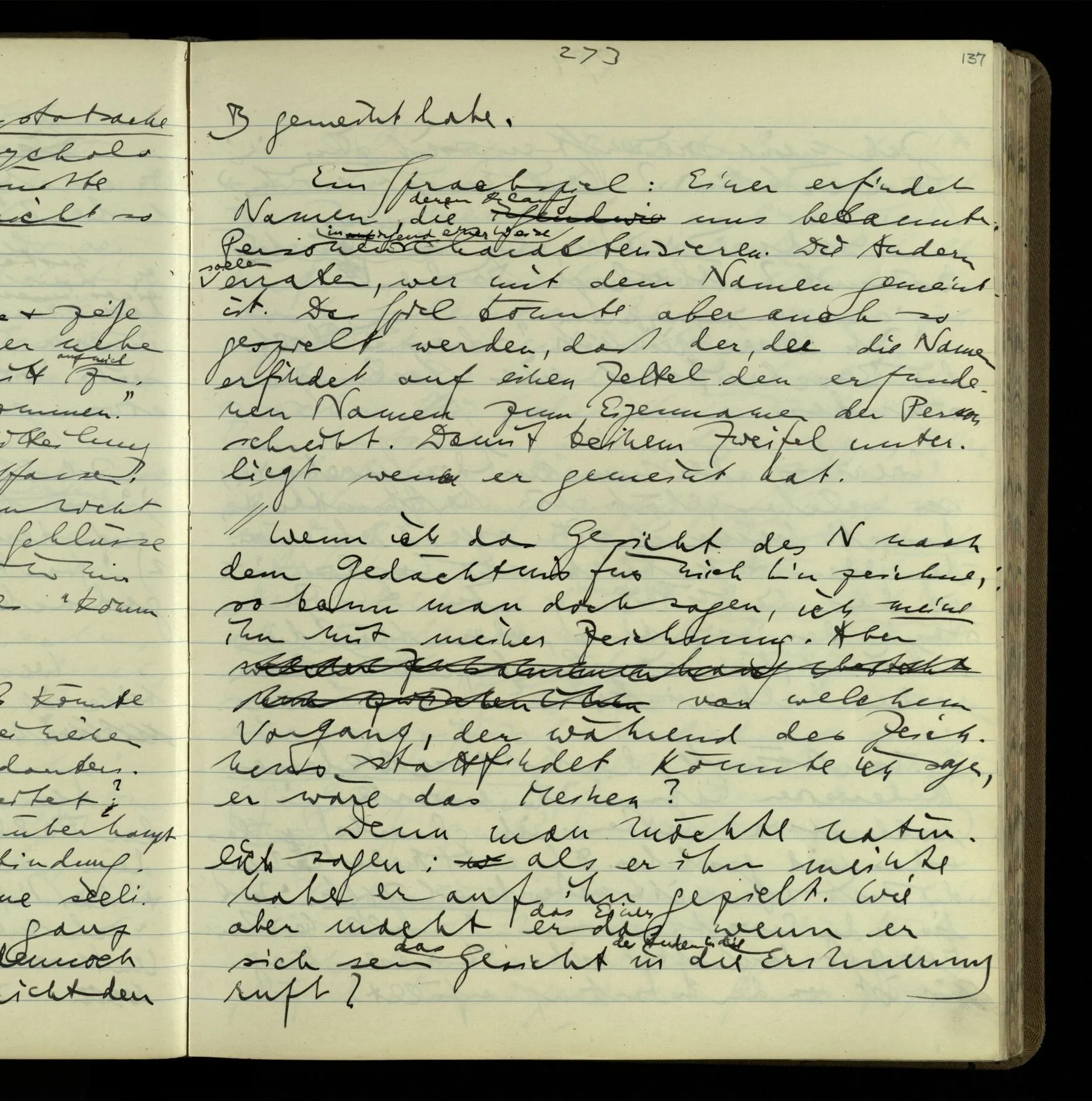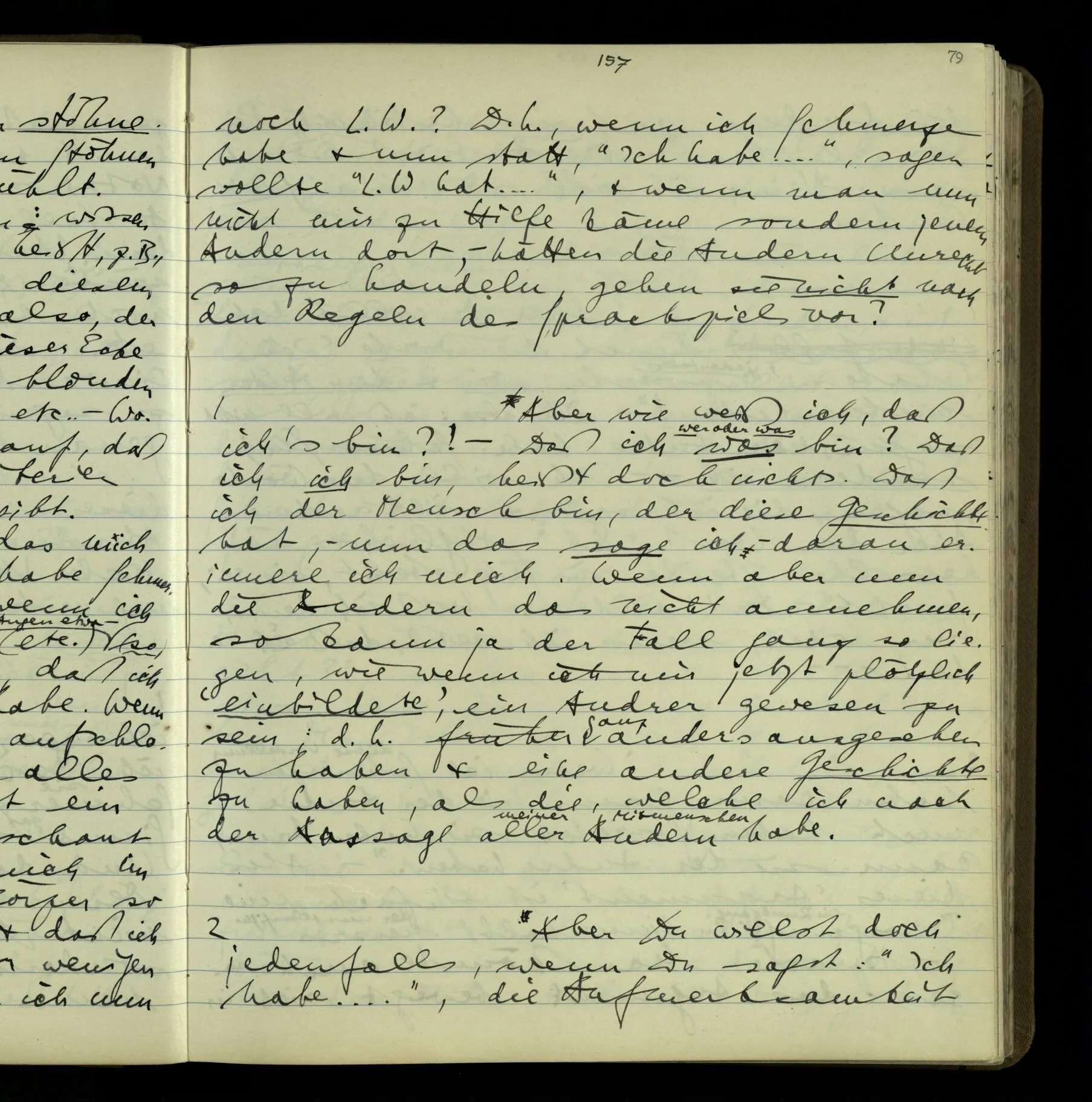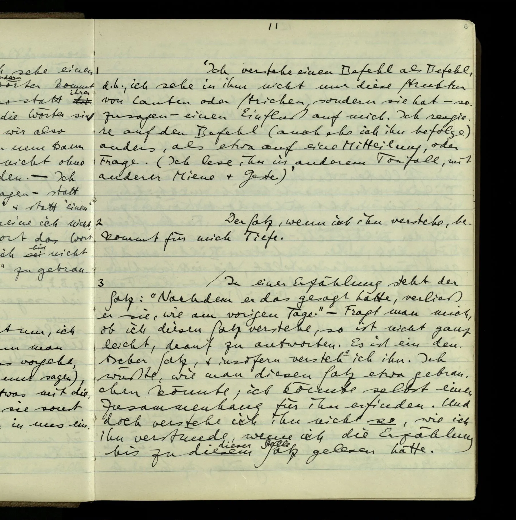 1 In einer Erzählung steht der Satz: “Nachdem er das gesagt hatte, verließ er sie, wie am vorigen Tage.” – Fragt man mich, ob ich diesen Satz verstehe, so ist nicht ganz leicht, drauf zu antworten. Es ist ein deutscher Satz, & insofern verstehe ich ihn. Ich wüßte, wie man diesen Satz etwa gebrauchen könnte; ich könnte selbst einen Zusammenhang für ihn erfinden. Und doch verstehe ich ihn nicht so, wie ich ihn verstünde, wenn ich die Erzählung bis zu diesem Satz gelesen hätte.