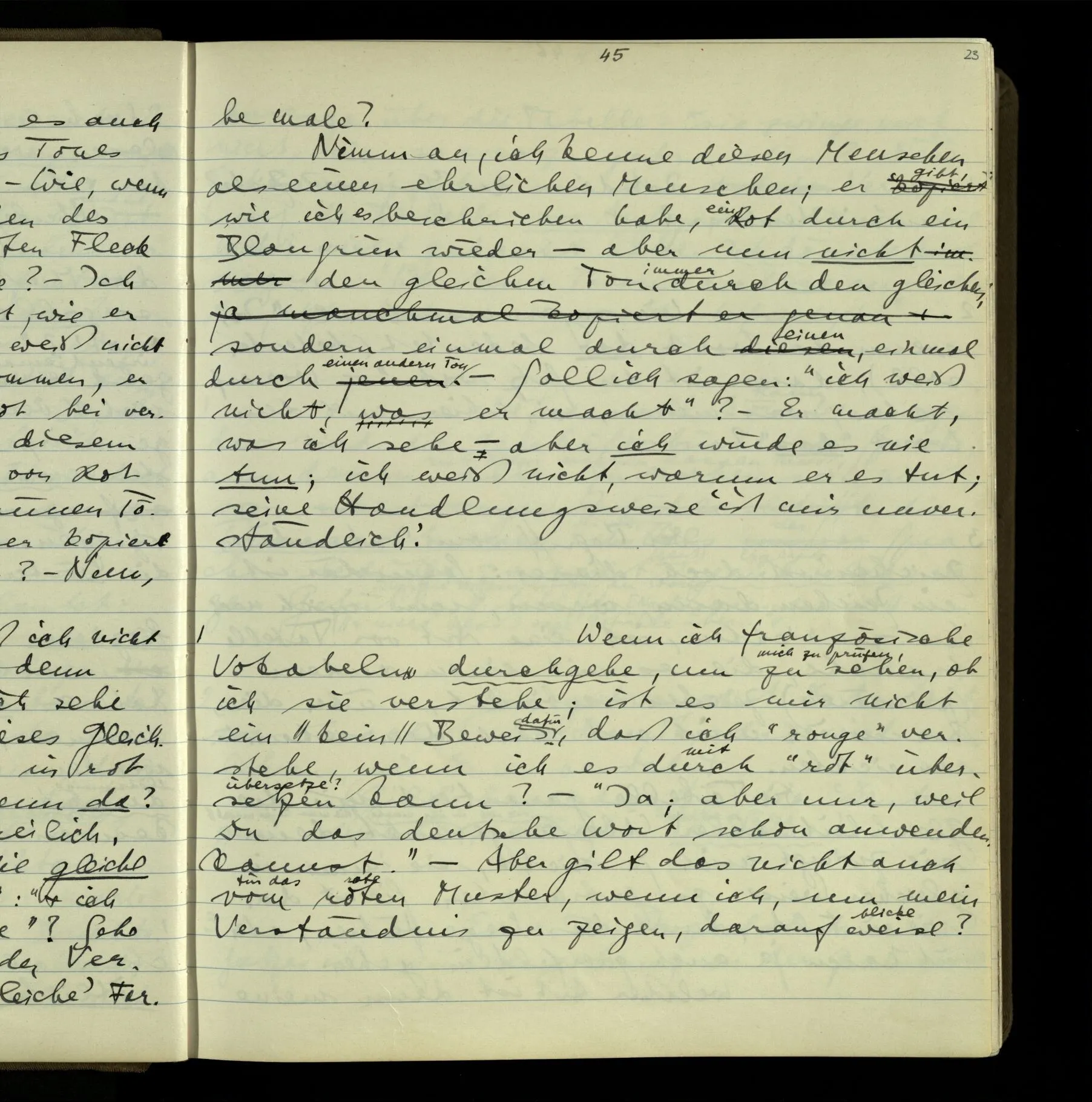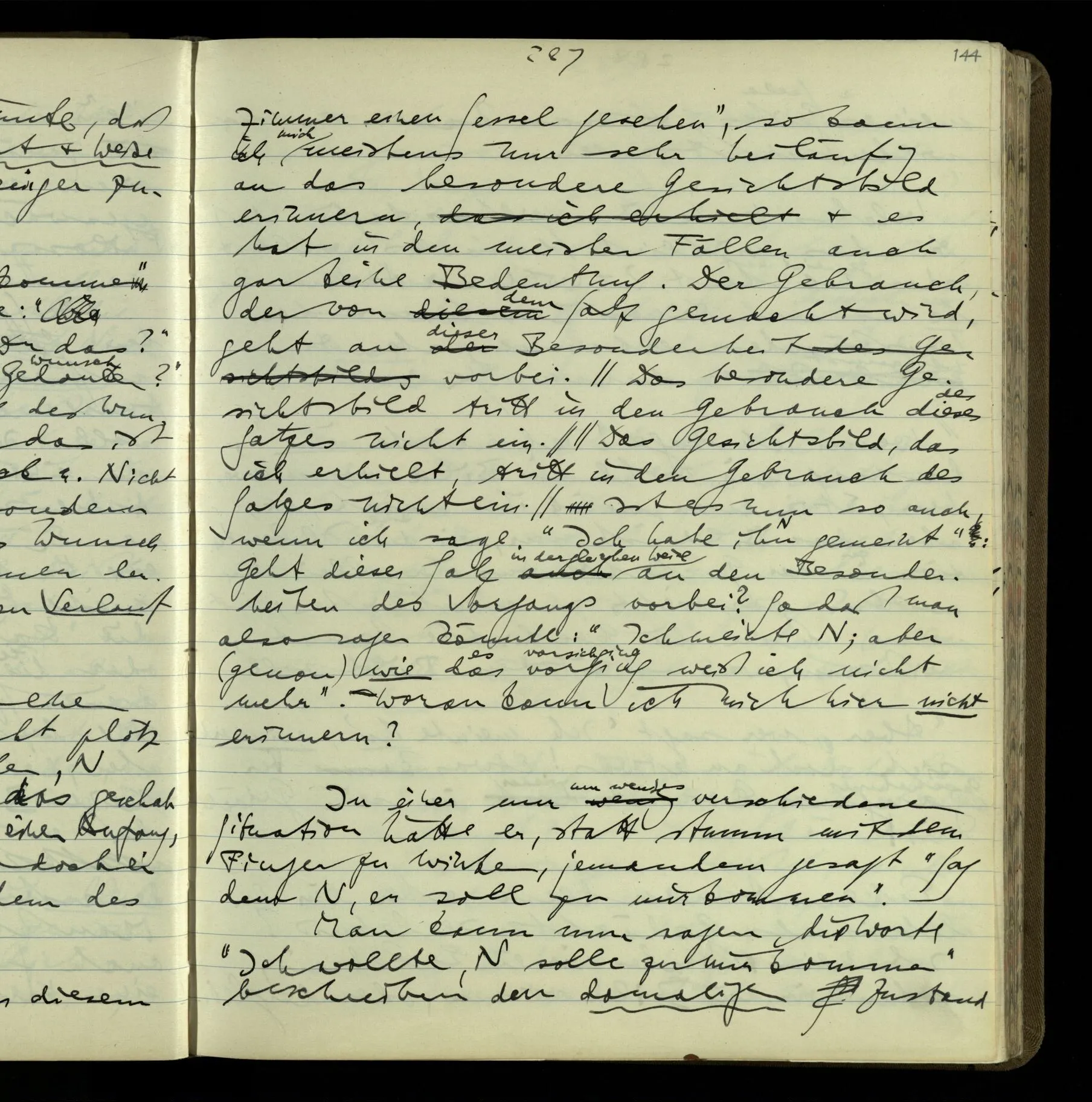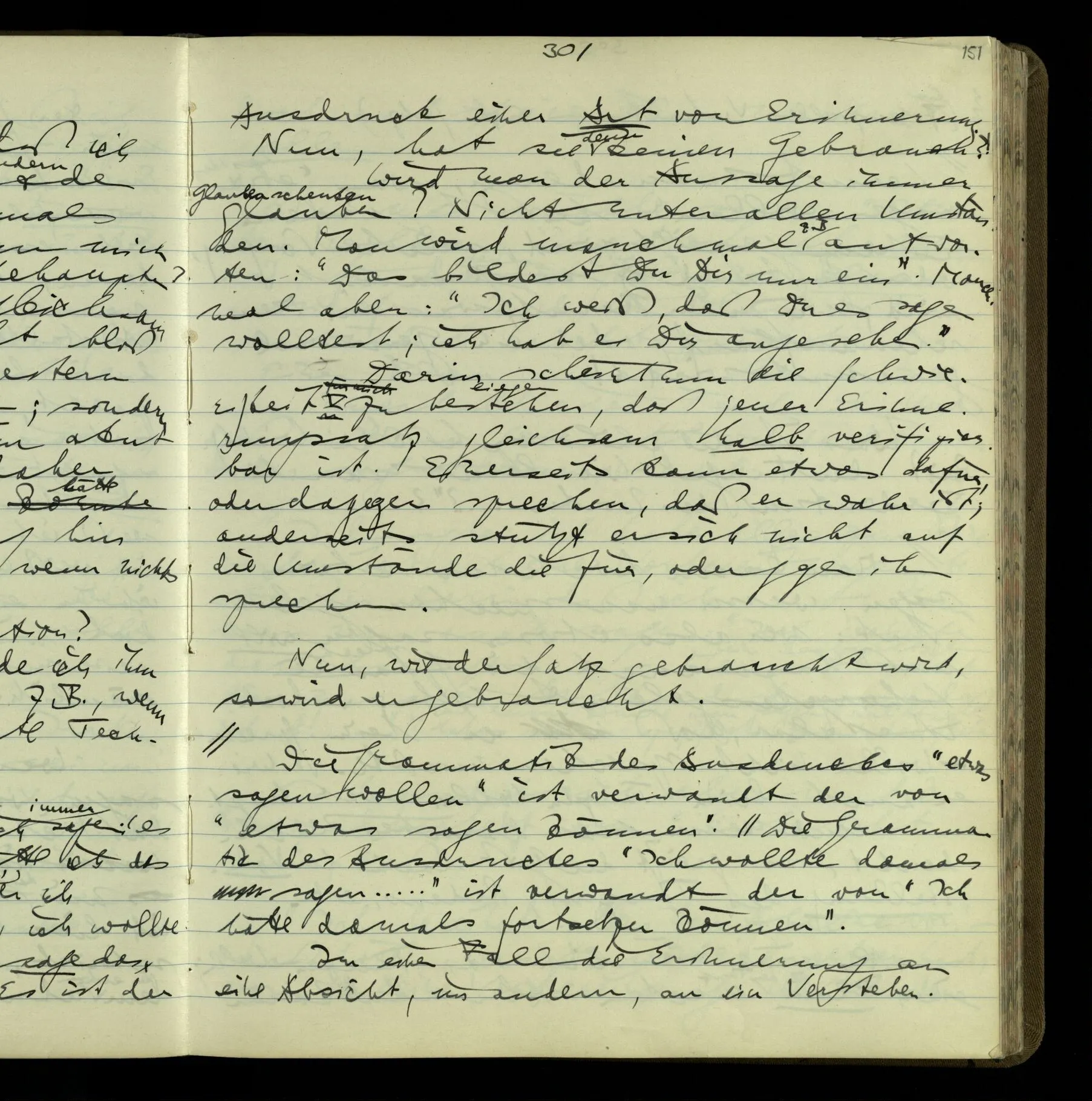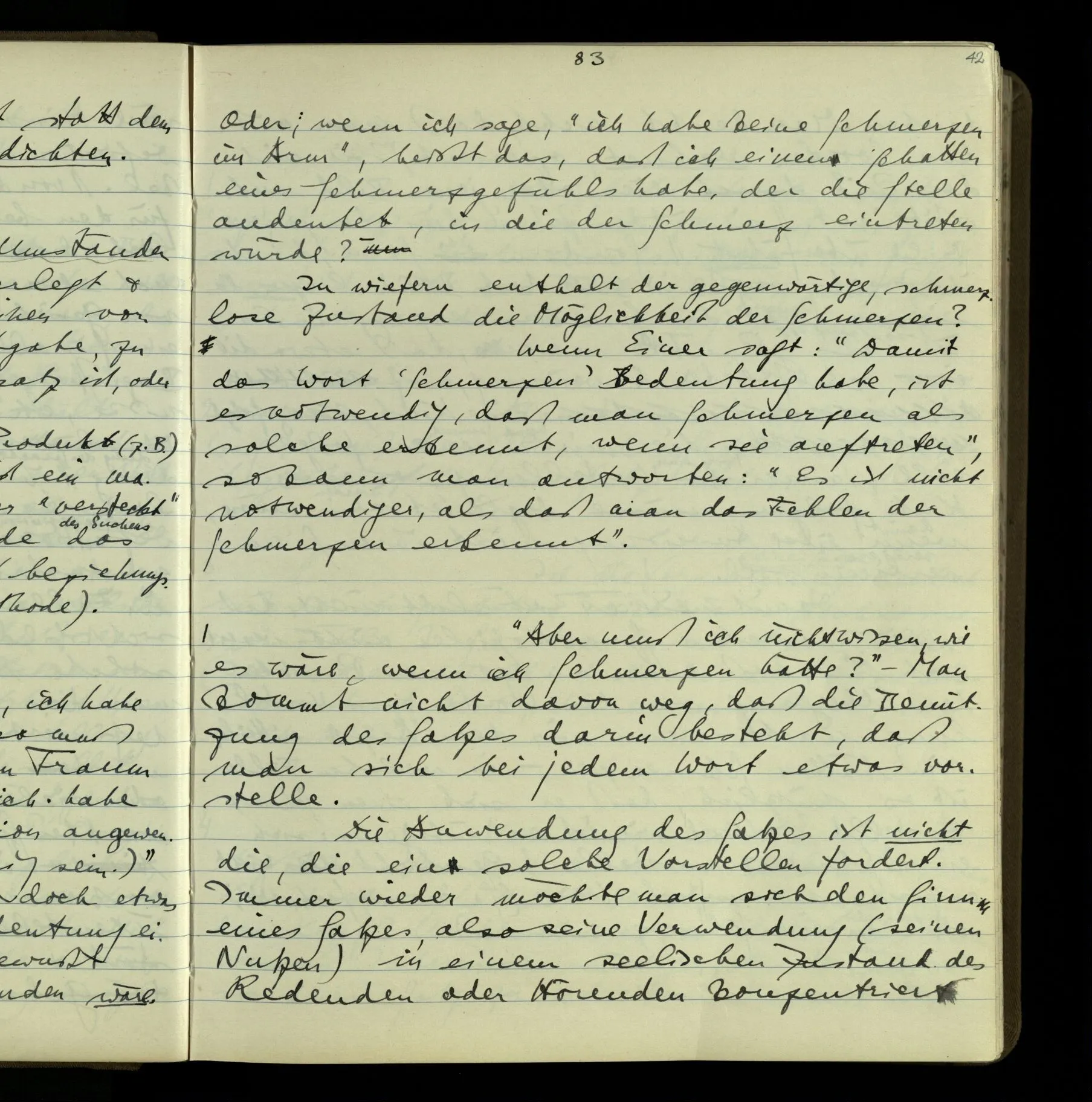 1 In einer Erzählung steht der Satz: “Nachdem er das gesagt hatte, verließ er sie, wie am vorigen Tage.” – Fragt man mich, ob ich diesen Satz verstehe, so ist nicht ganz leicht, drauf zu antworten. Es ist ein deutscher Satz, & insofern verstehe ich ihn. Ich wüßte, wie man diesen Satz etwa gebrauchen könnte; ich könnte selbst einen Zusammenhang für ihn erfinden. Und doch verstehe ich ihn nicht so, wie ich ihn verstünde, wenn ich die Erzählung bis zu diesem Satz gelesen hätte.
