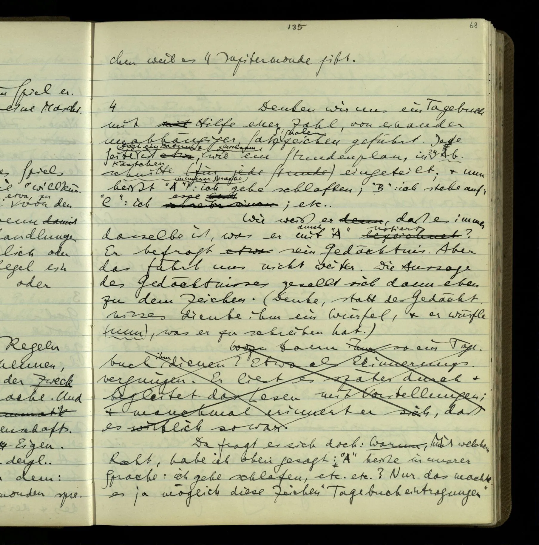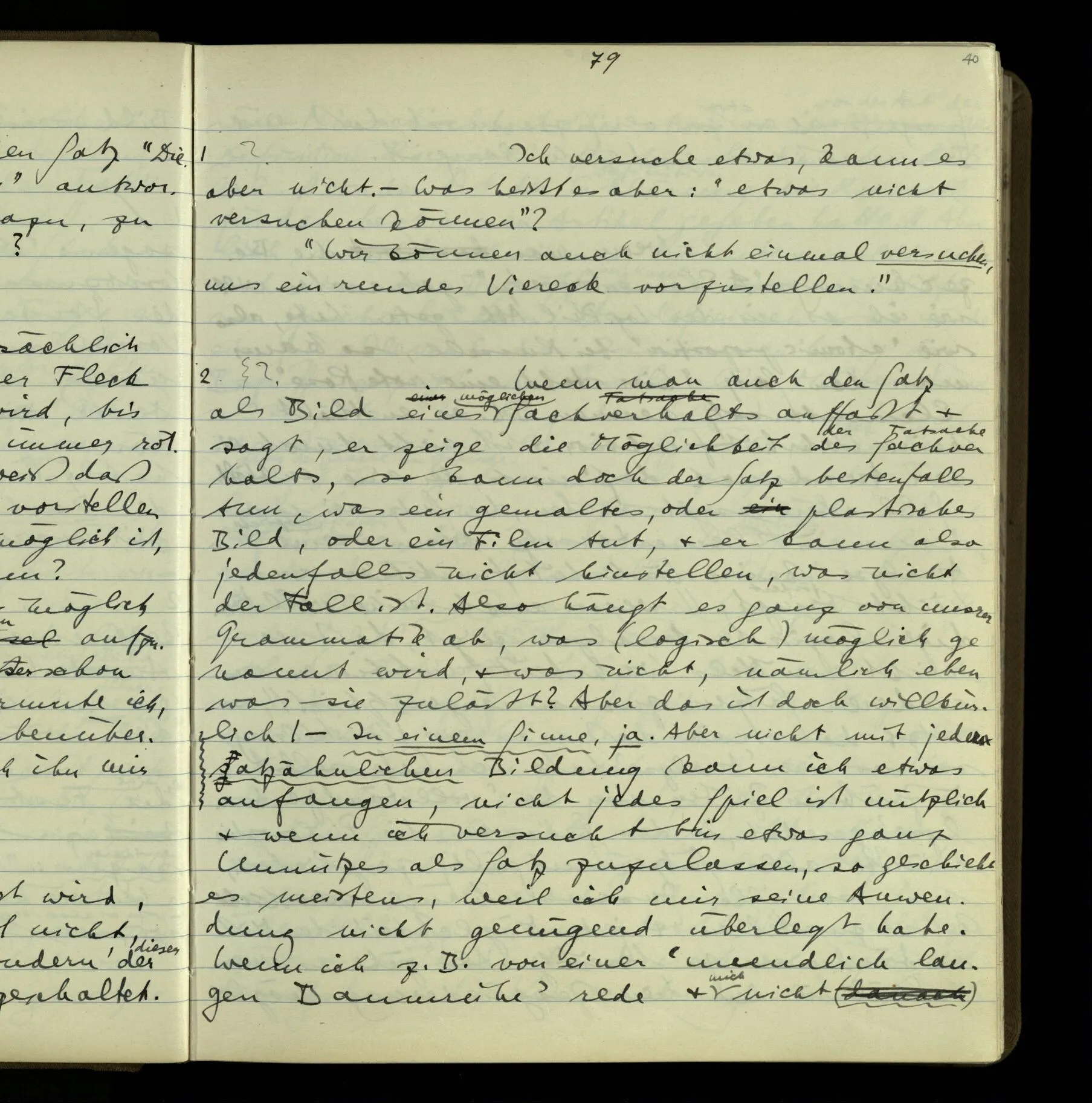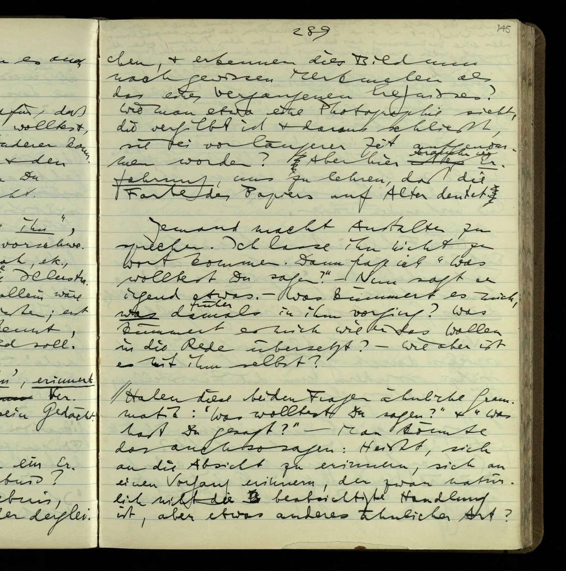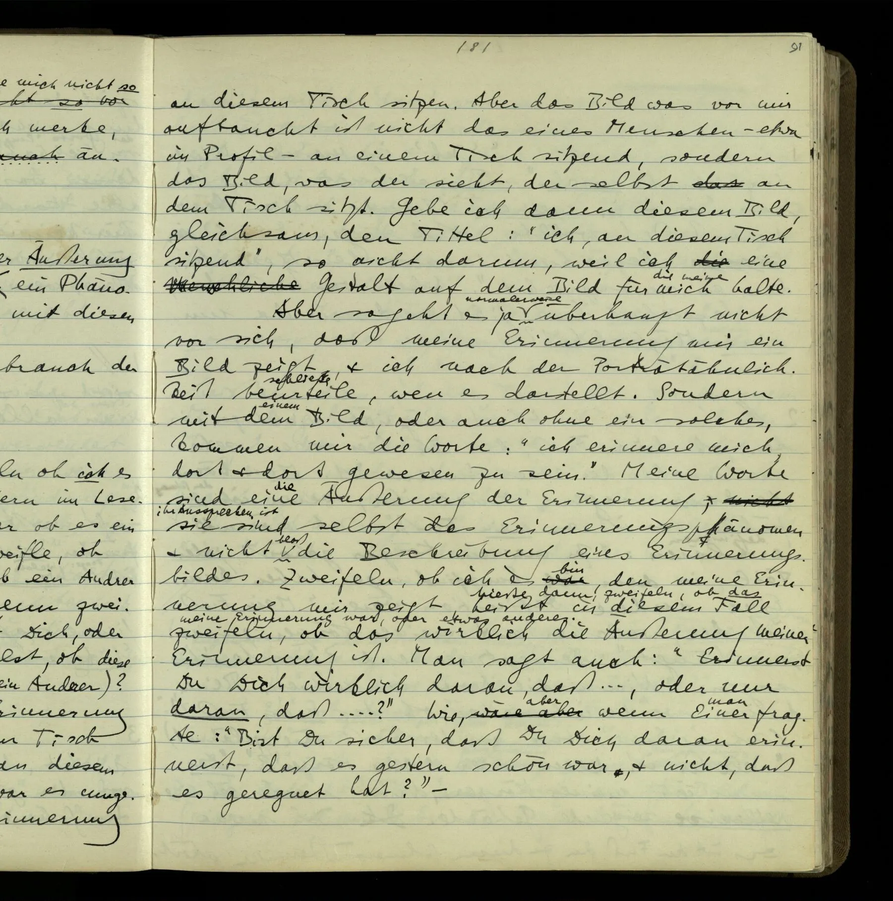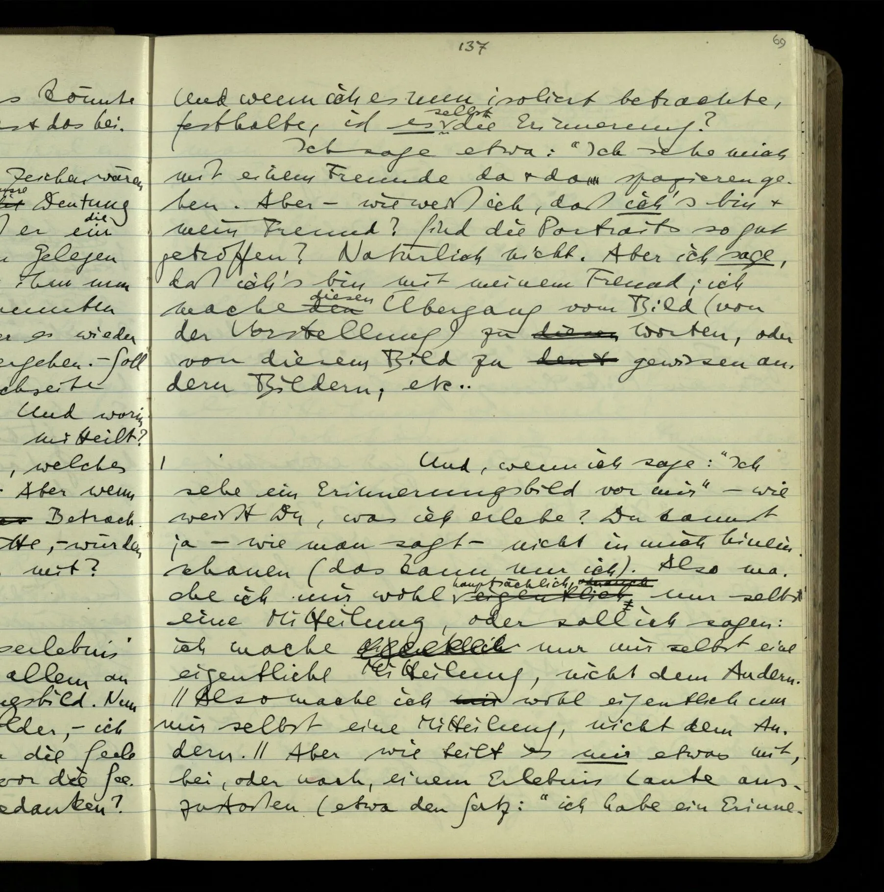 1 In einer Erzählung steht der Satz: “Nachdem er das gesagt hatte, verließ er sie, wie am vorigen Tage.” – Fragt man mich, ob ich diesen Satz verstehe, so ist nicht ganz leicht, drauf zu antworten. Es ist ein deutscher Satz, & insofern verstehe ich ihn. Ich wüßte, wie man diesen Satz etwa gebrauchen könnte; ich könnte selbst einen Zusammenhang für ihn erfinden. Und doch verstehe ich ihn nicht so, wie ich ihn verstünde, wenn ich die Erzählung bis zu diesem Satz gelesen hätte.