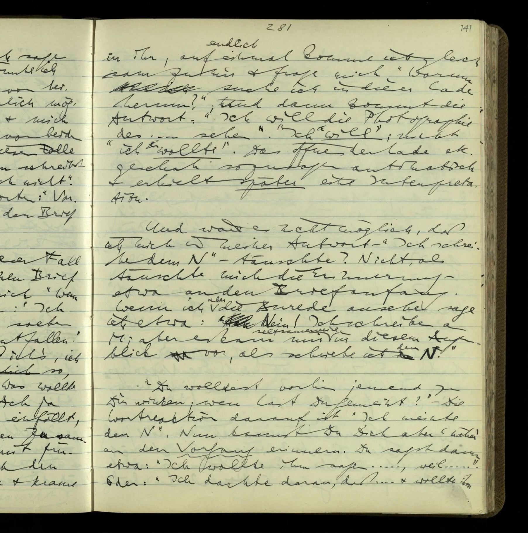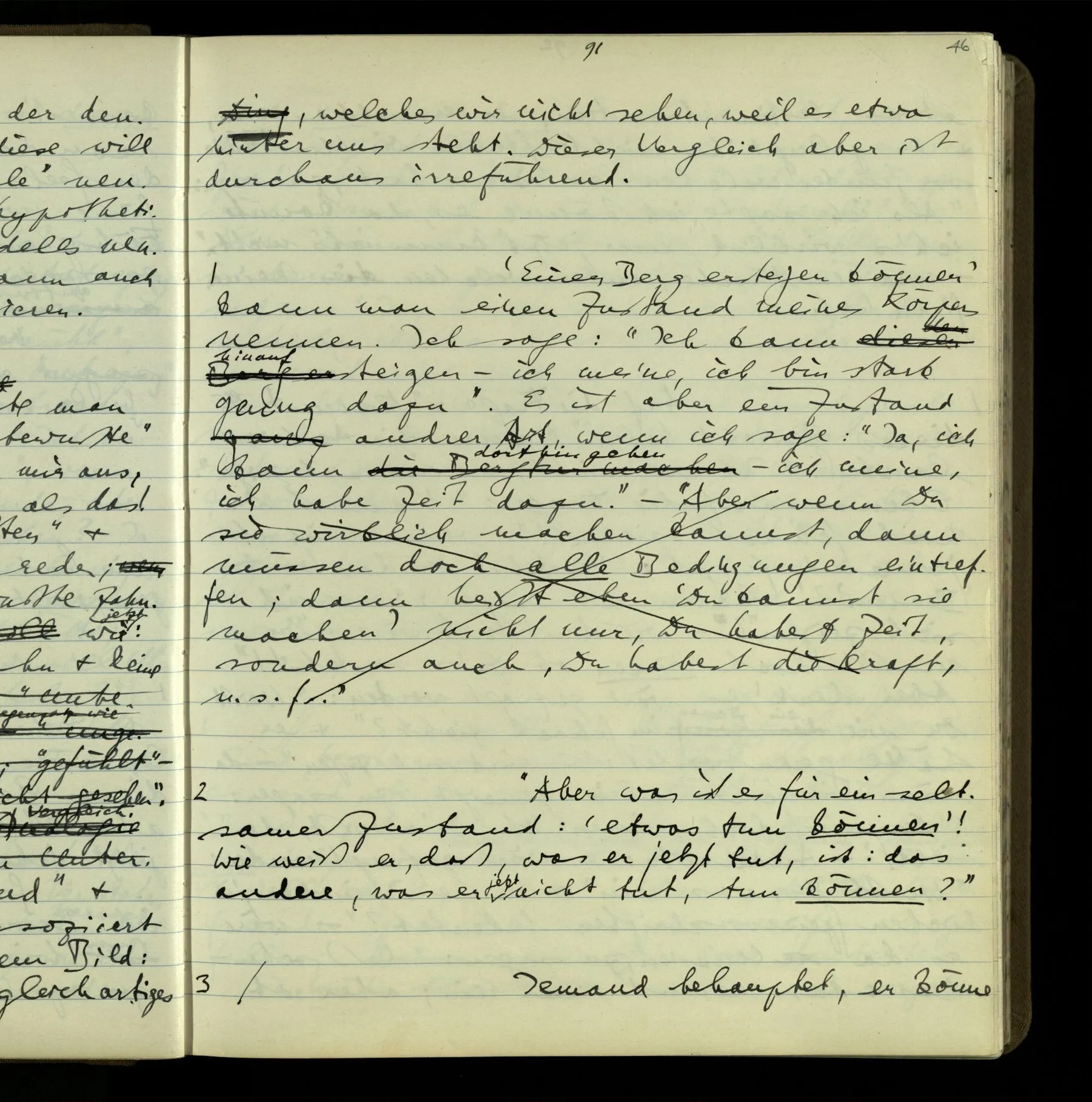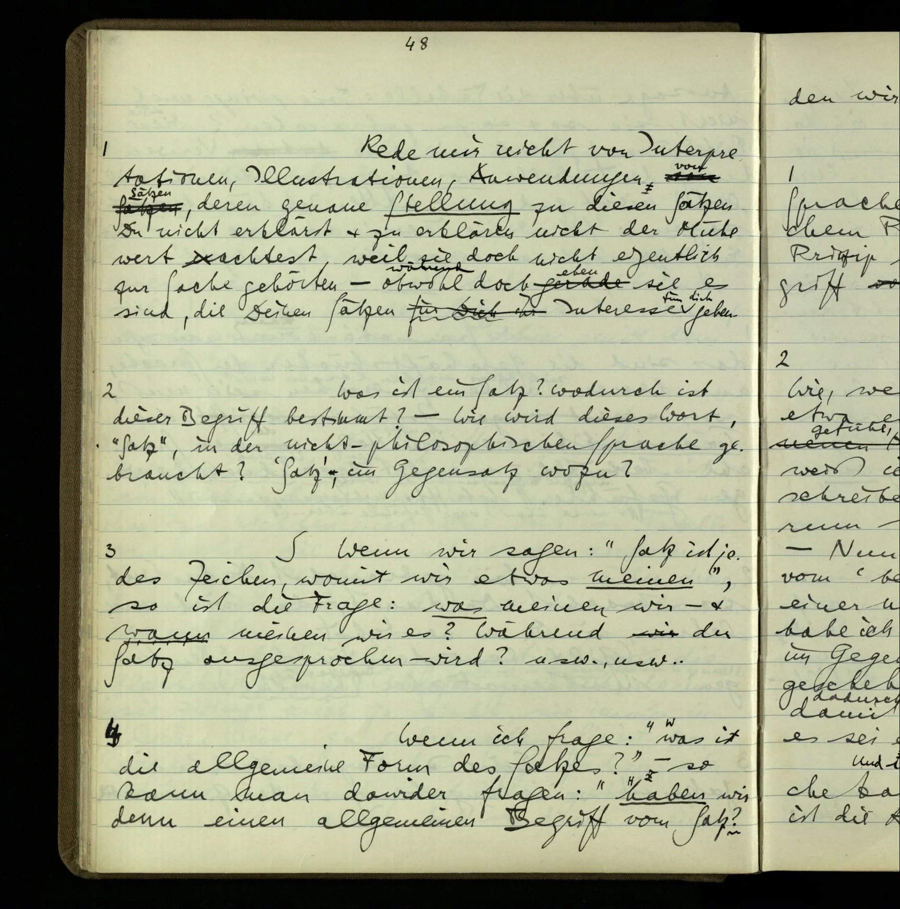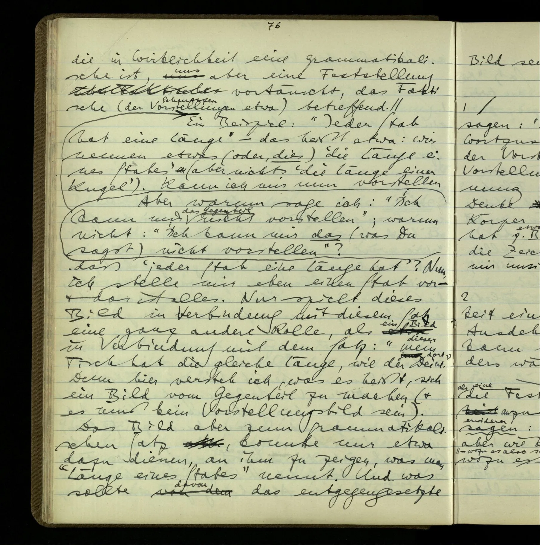 1 In einer Erzählung steht der Satz: “Nachdem er das gesagt hatte, verließ er sie, wie am vorigen Tage.” – Fragt man mich, ob ich diesen Satz verstehe, so ist nicht ganz leicht, drauf zu antworten. Es ist ein deutscher Satz, & insofern verstehe ich ihn. Ich wüßte, wie man diesen Satz etwa gebrauchen könnte; ich könnte selbst einen Zusammenhang für ihn erfinden. Und doch verstehe ich ihn nicht so, wie ich ihn verstünde, wenn ich die Erzählung bis zu diesem Satz gelesen hätte.