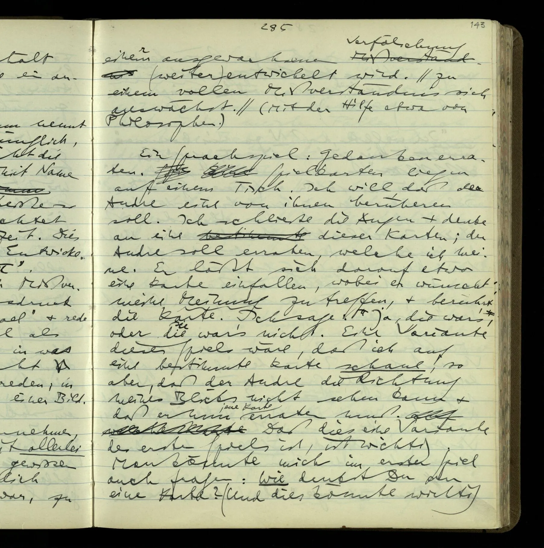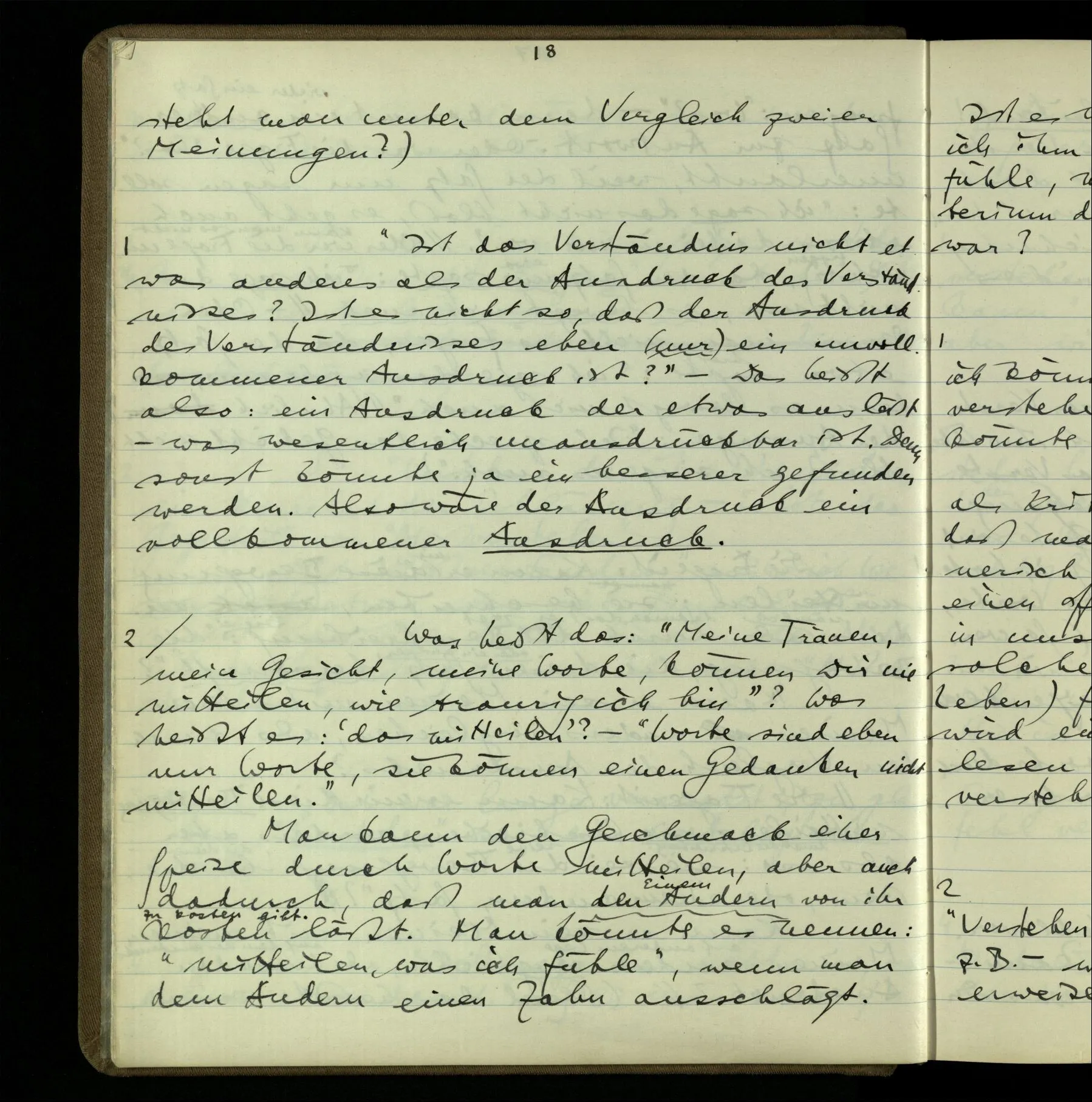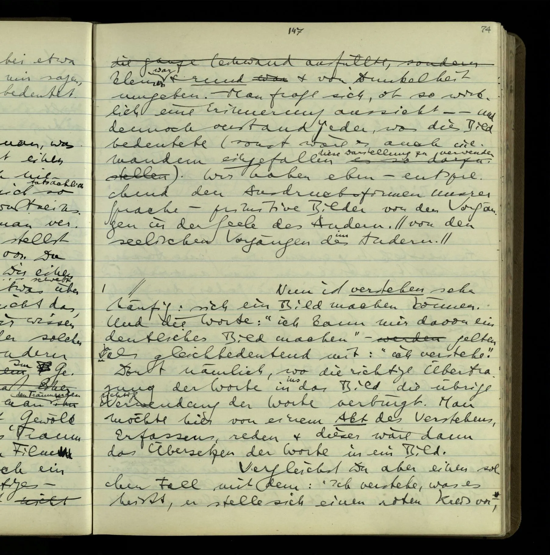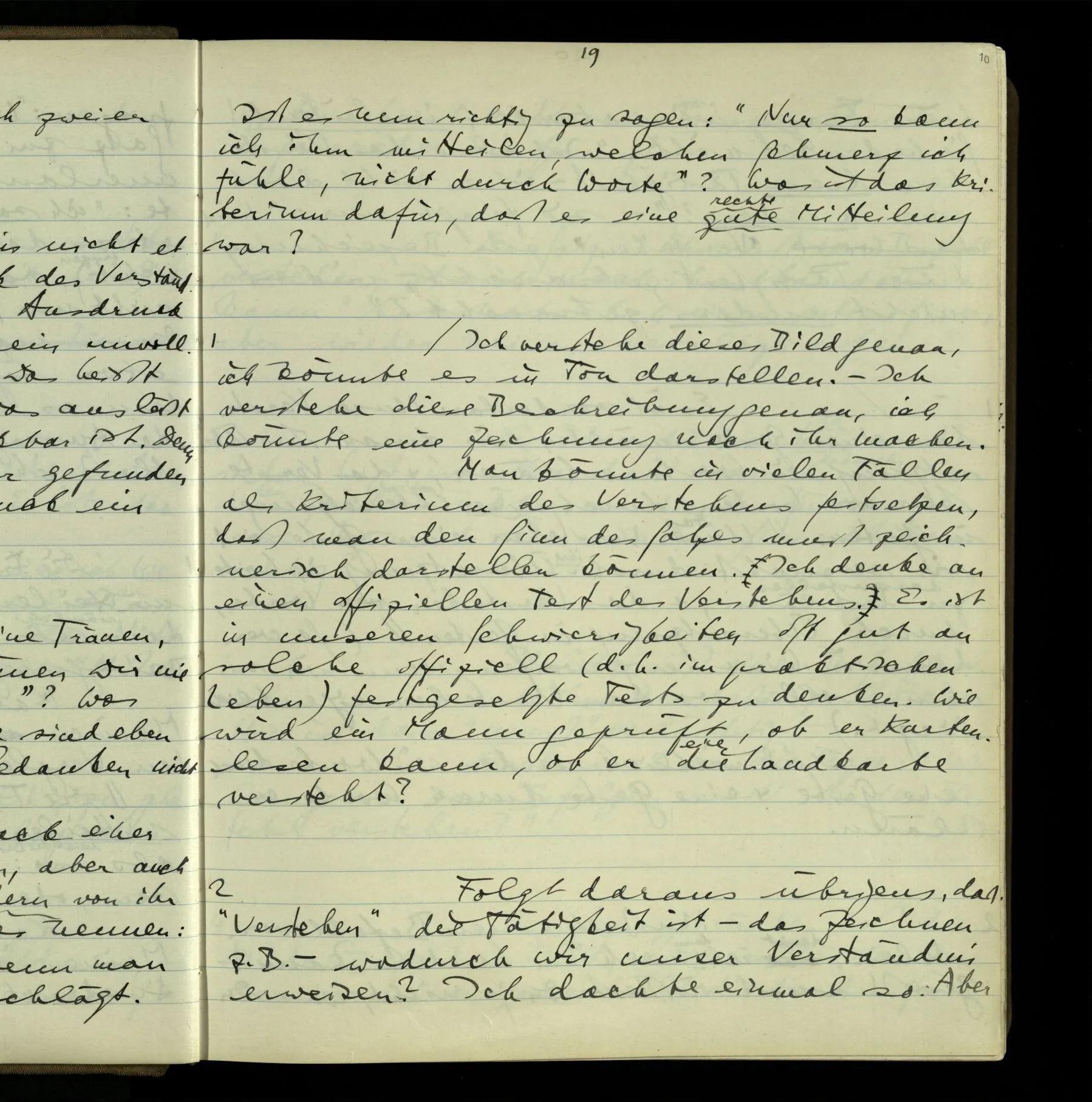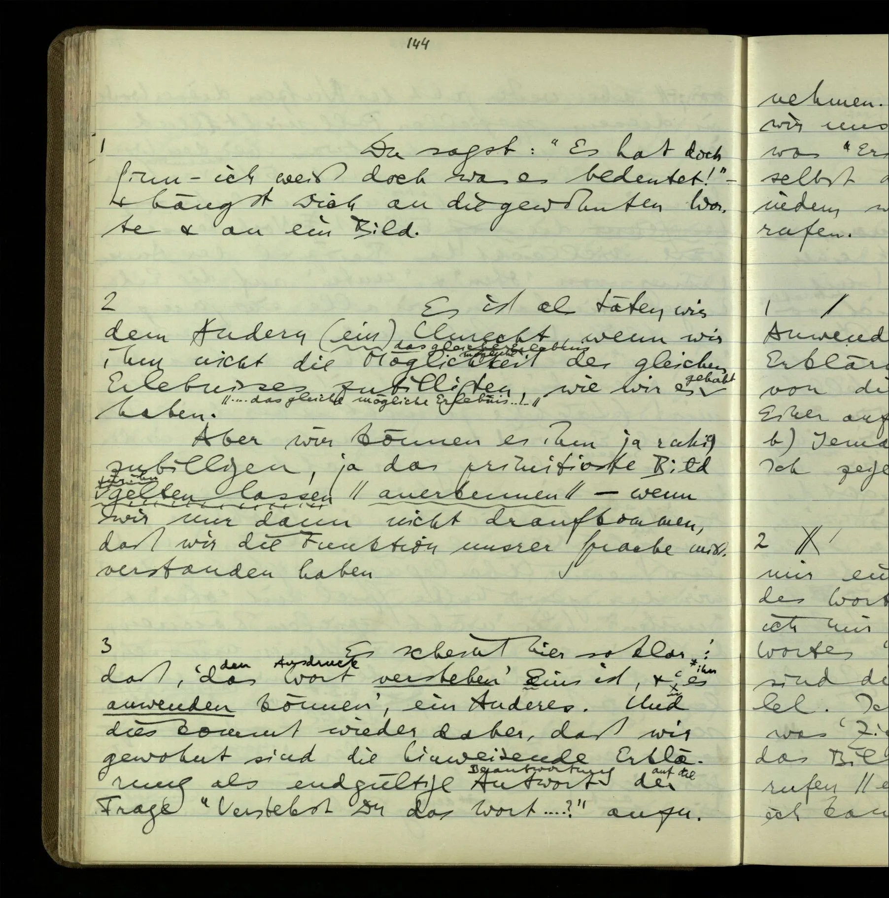 So hat also “verstehen” hier zwei verschiedene Bedeutungen? – Ich möchte sagen, diese Gebrauchsarten von “verstehen” bilden seine Bedeutung, meinen Begriff des Verstehens. Denn ich will “verstehen” auf alles das anwenden.