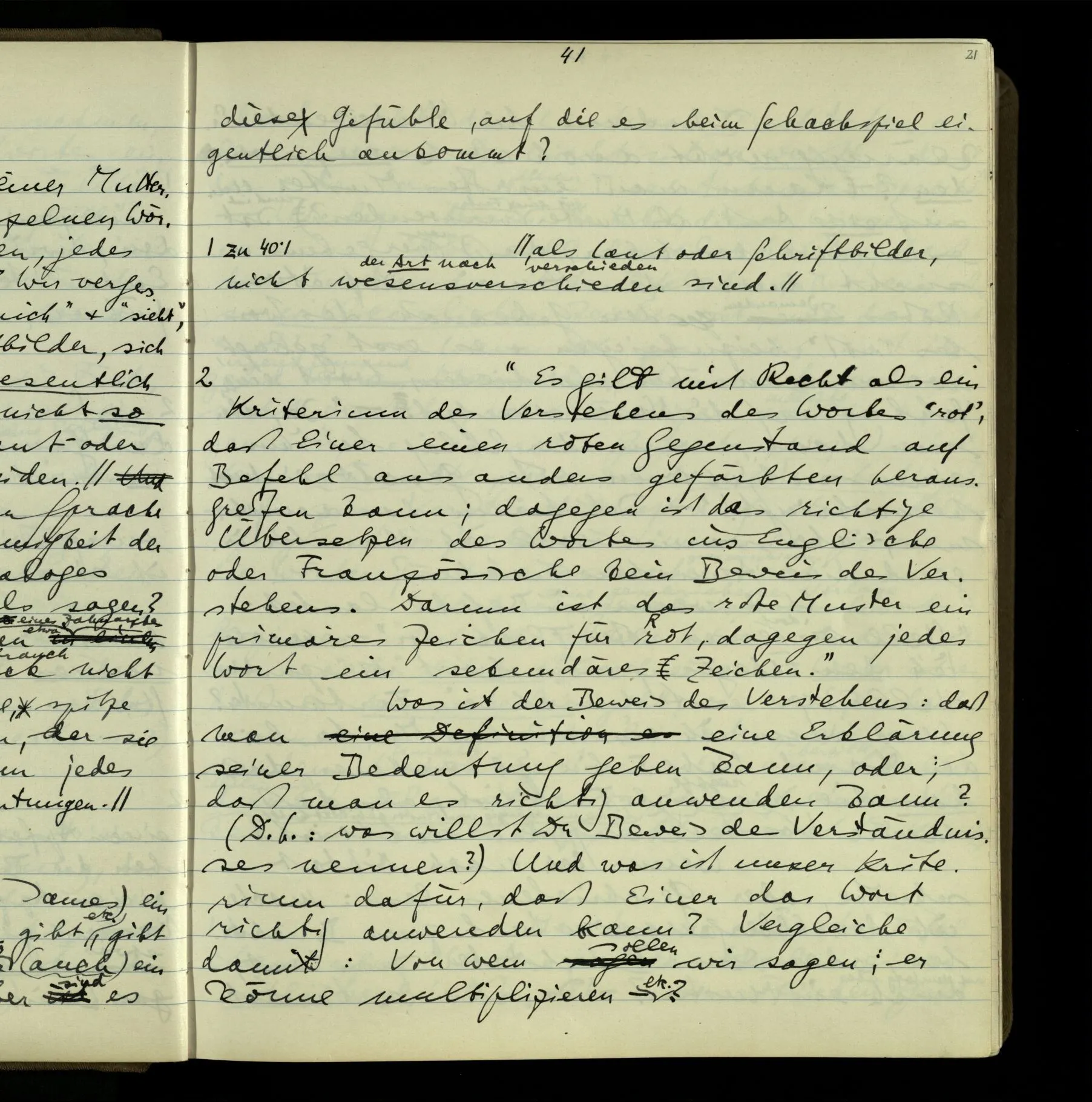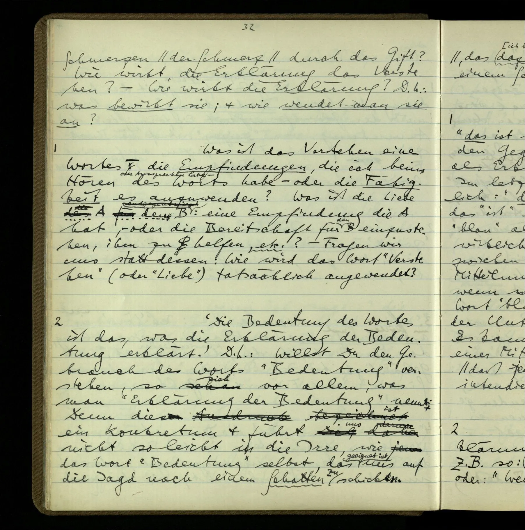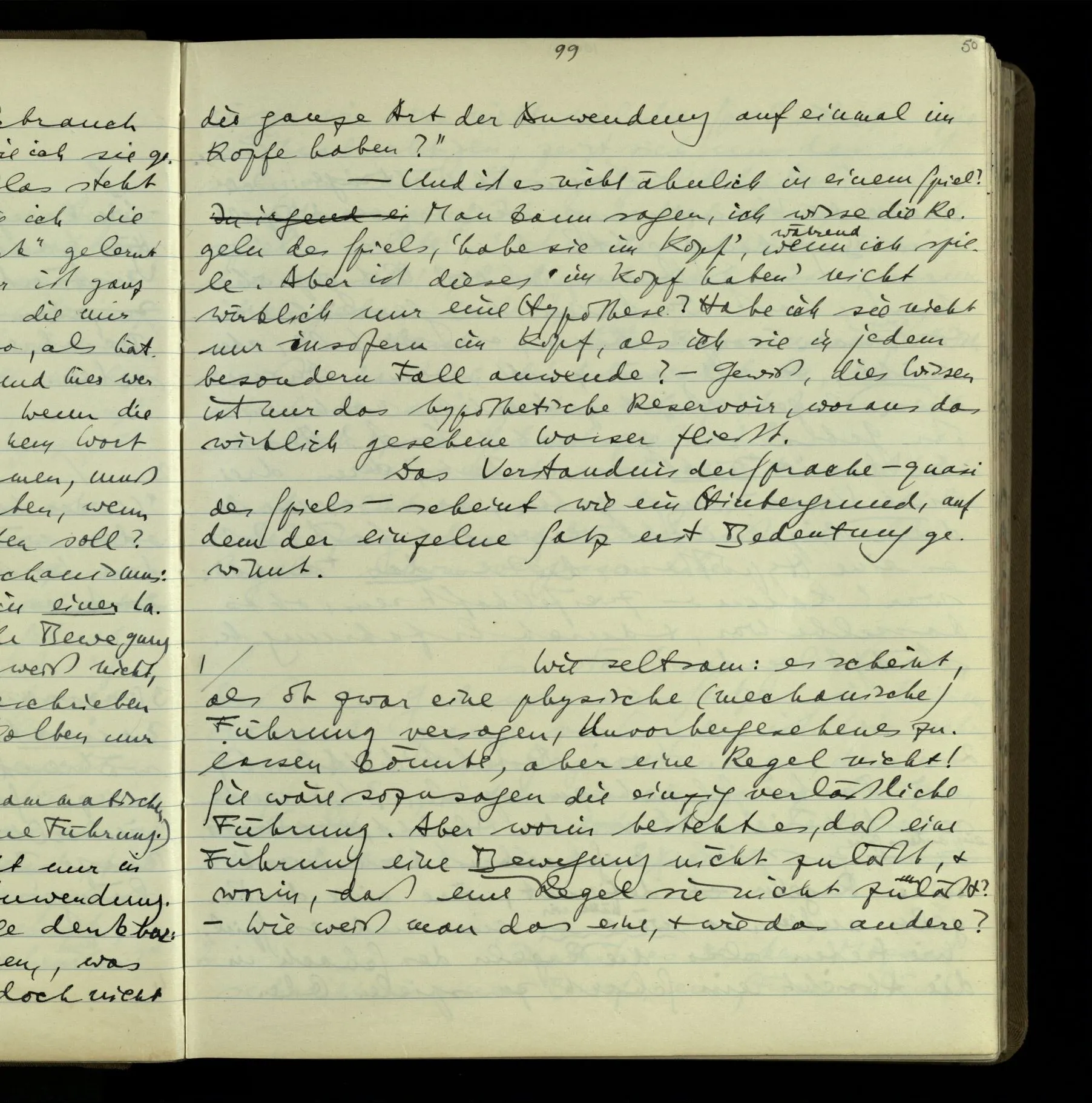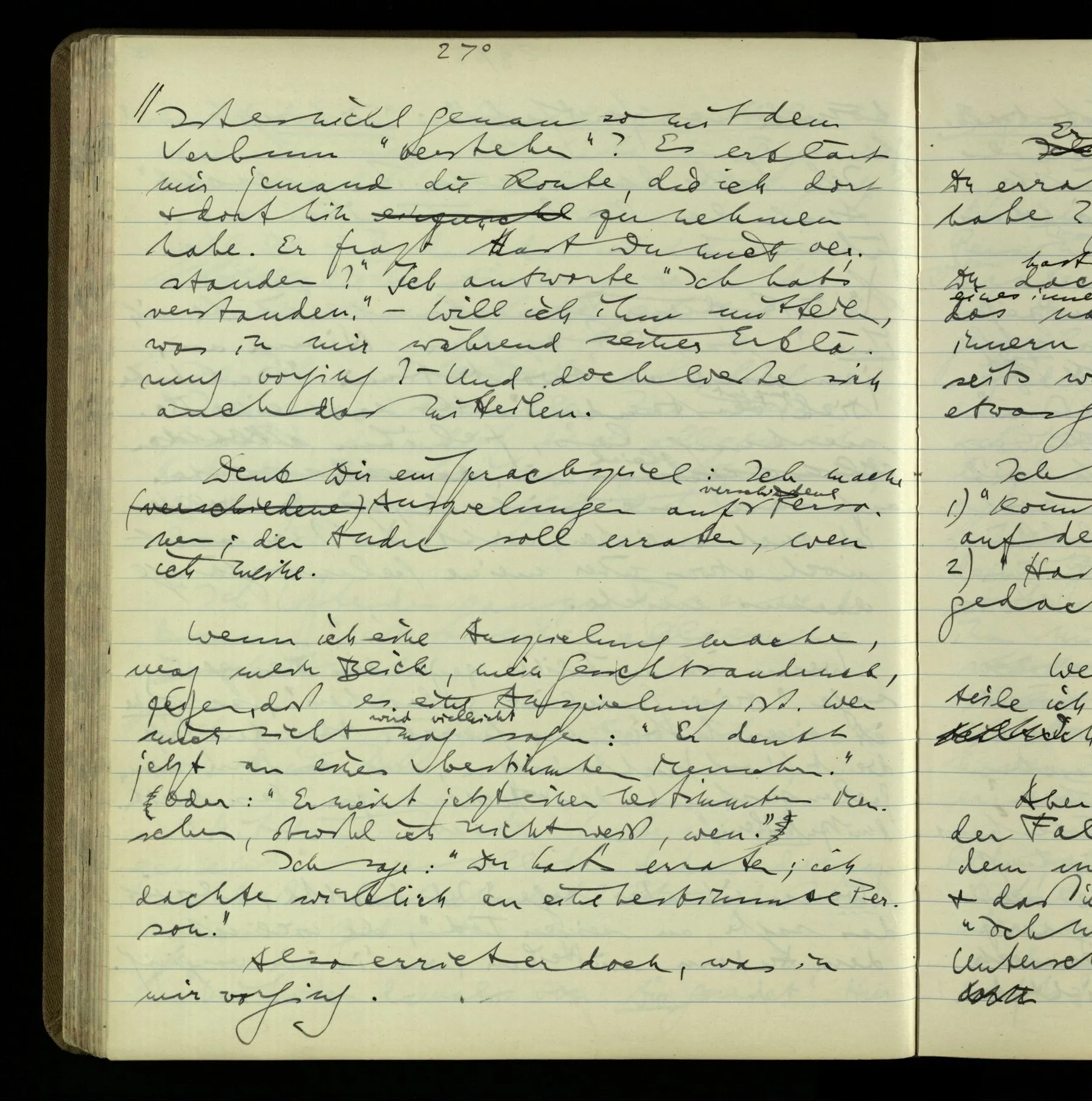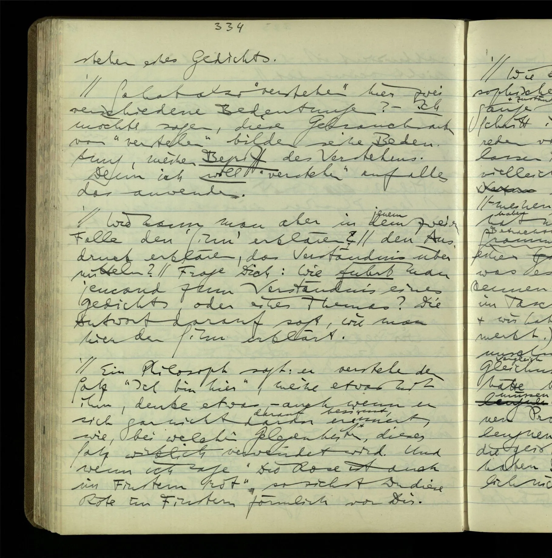 So hat also “verstehen” hier zwei verschiedene Bedeutungen? – Ich möchte sagen, diese Gebrauchsarten von “verstehen” bilden seine Bedeutung, meinen Begriff des Verstehens. Denn ich will “verstehen” auf alles das anwenden.