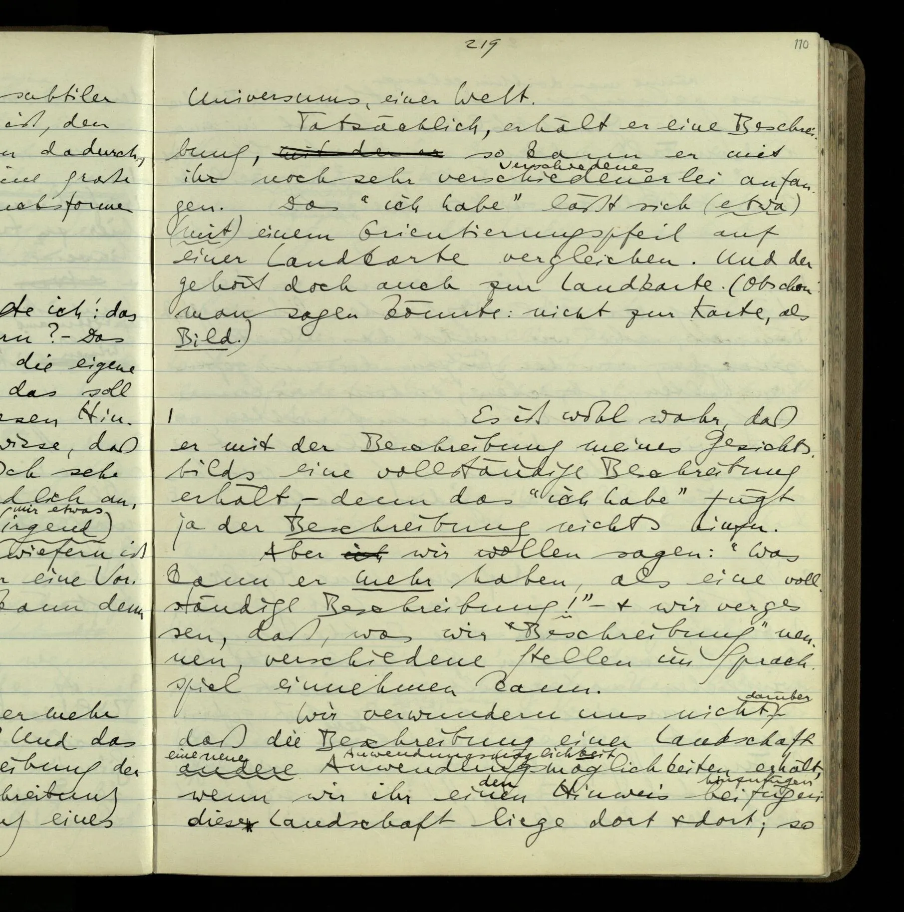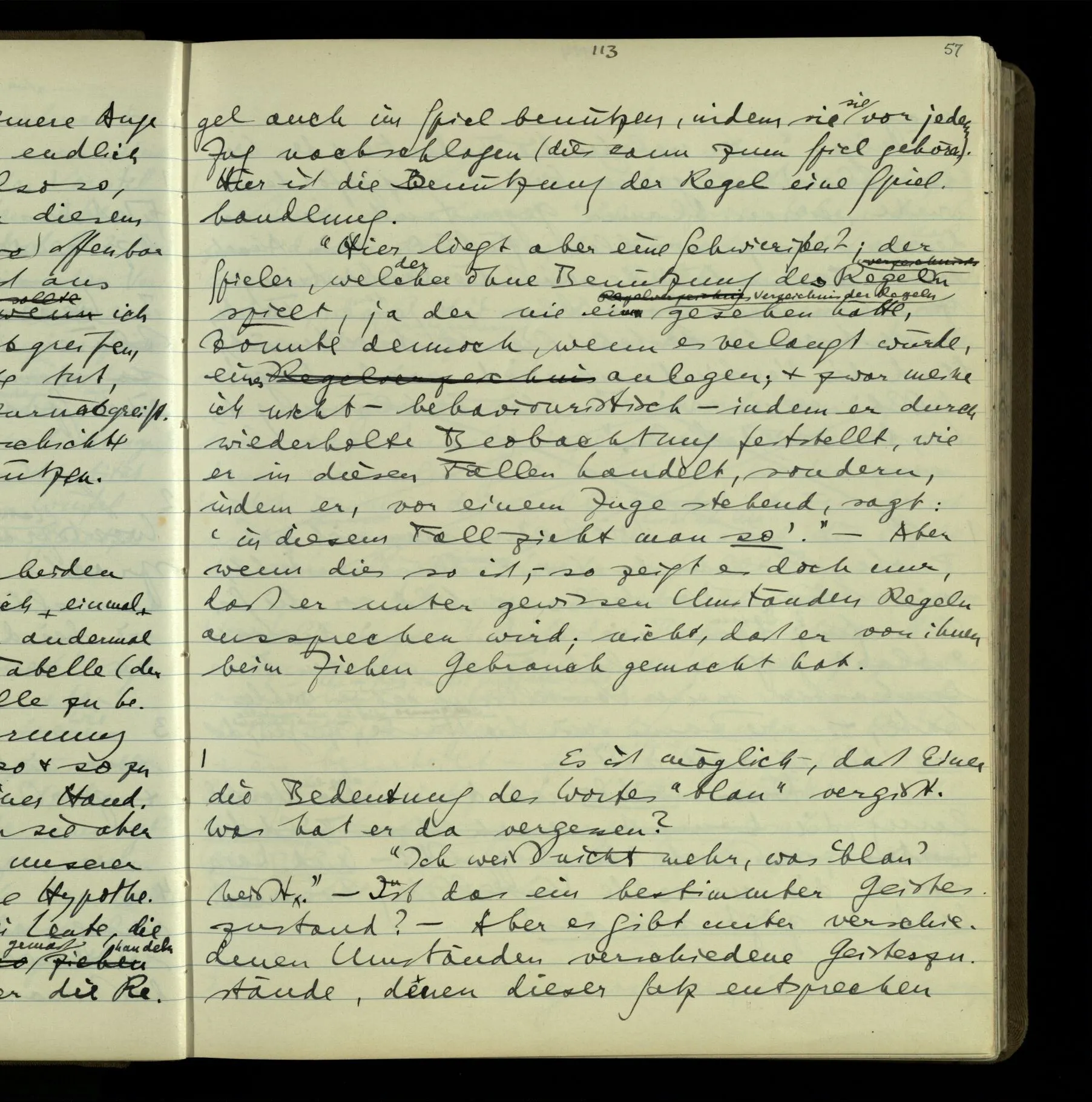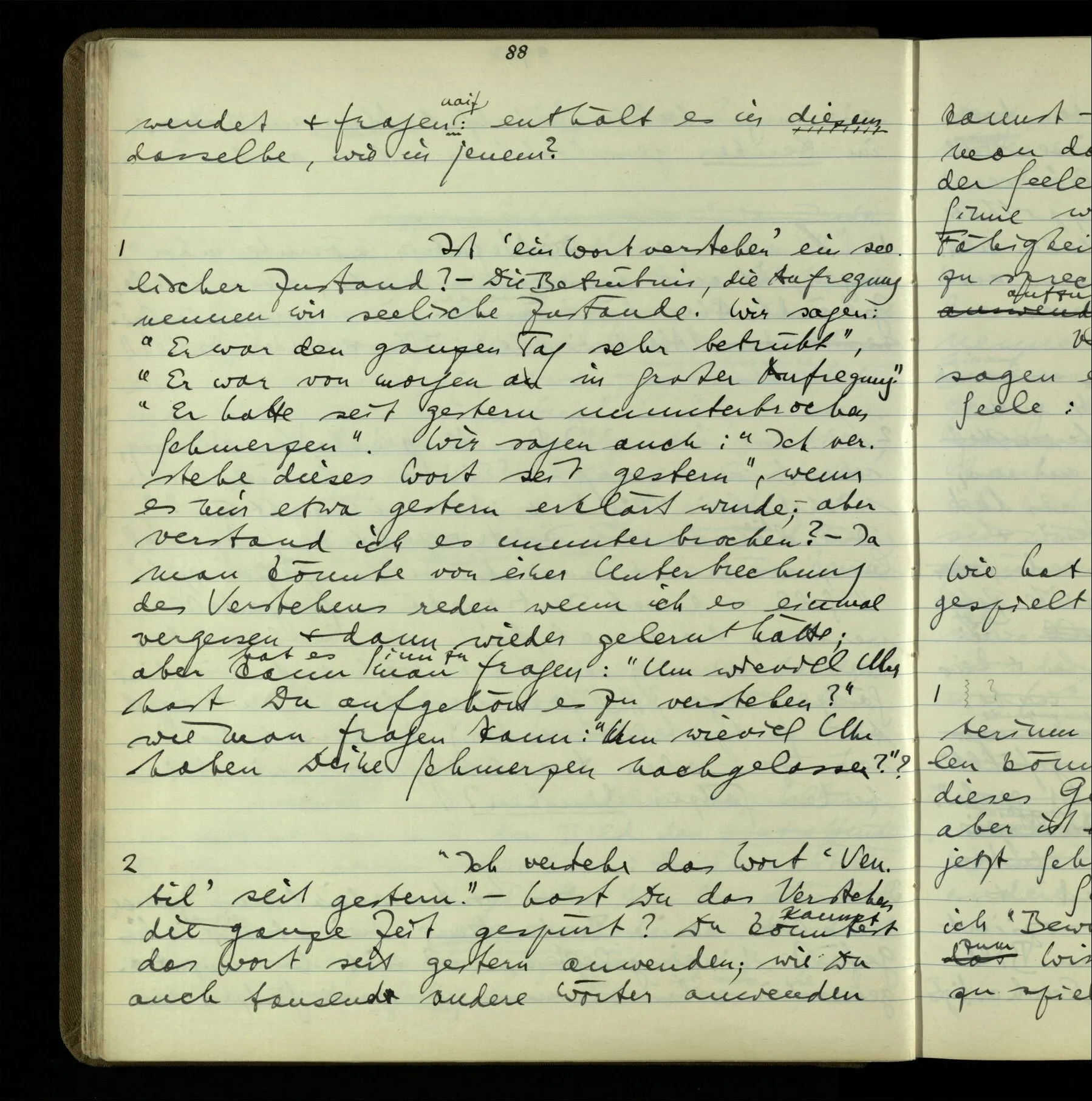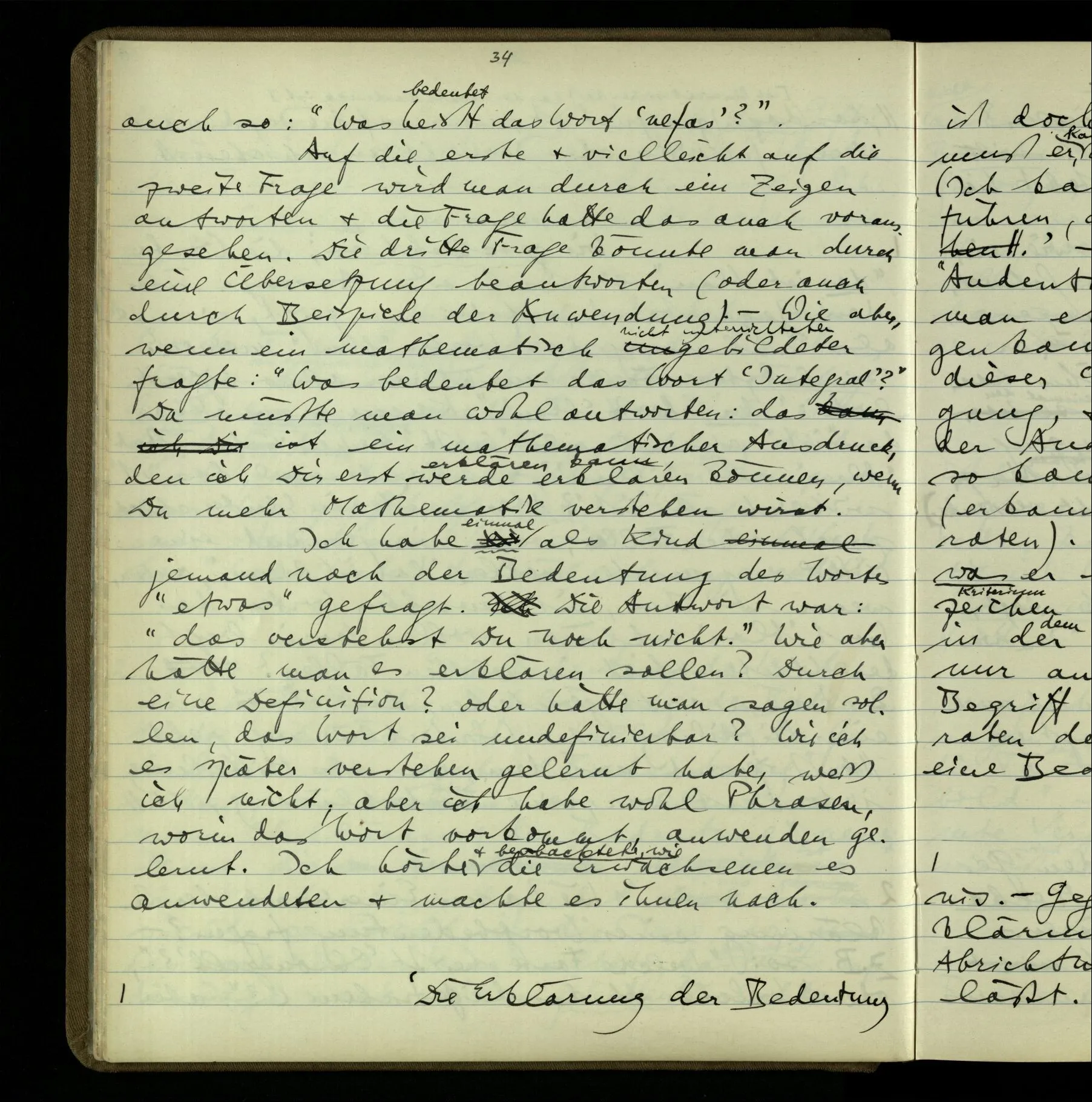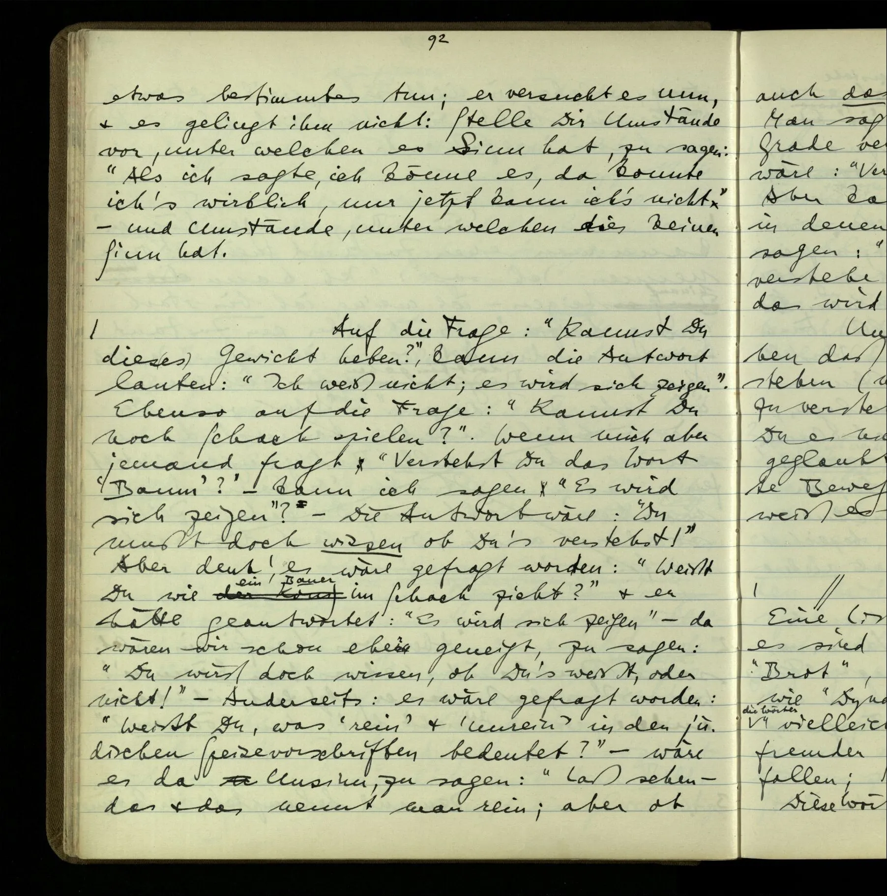 So hat also “verstehen” hier zwei verschiedene Bedeutungen? – Ich möchte sagen, diese Gebrauchsarten von “verstehen” bilden seine Bedeutung, meinen Begriff des Verstehens. Denn ich will “verstehen” auf alles das anwenden.