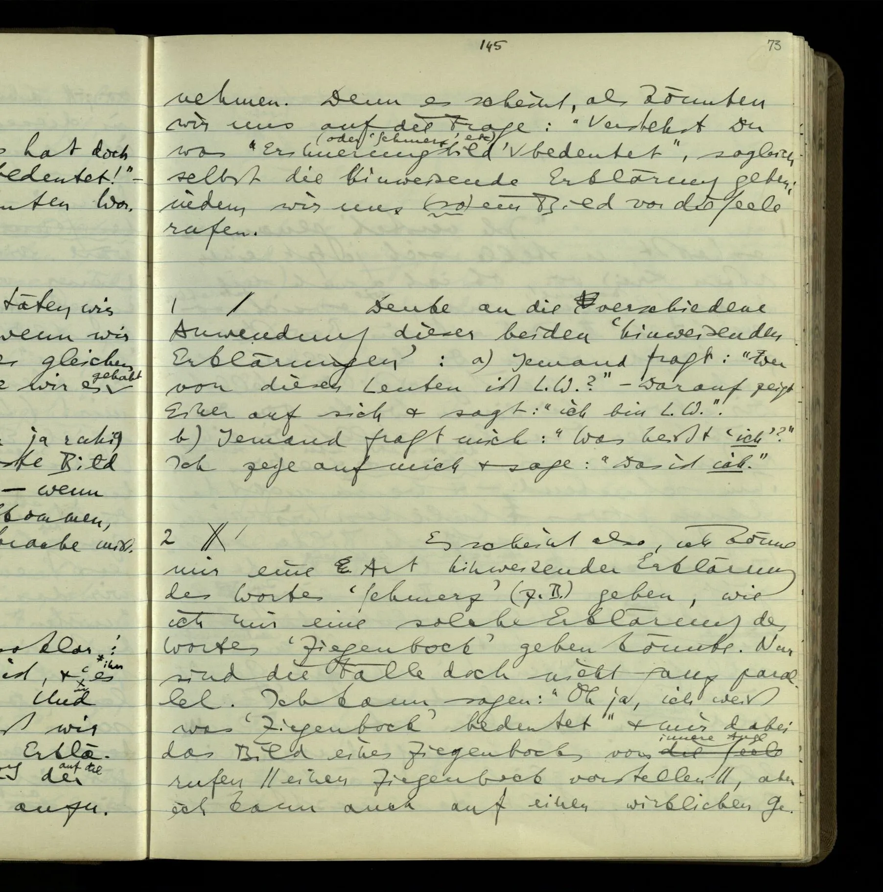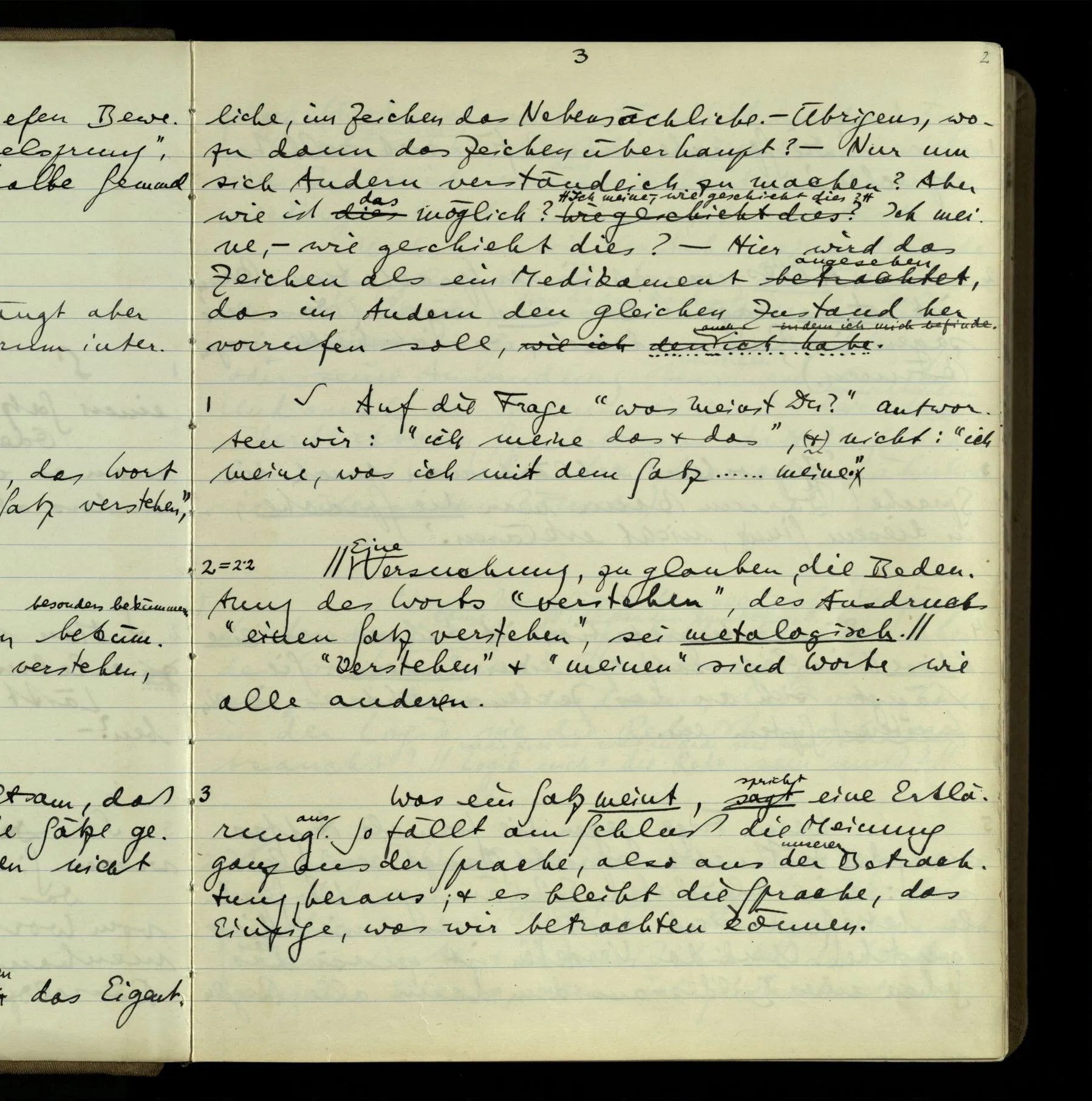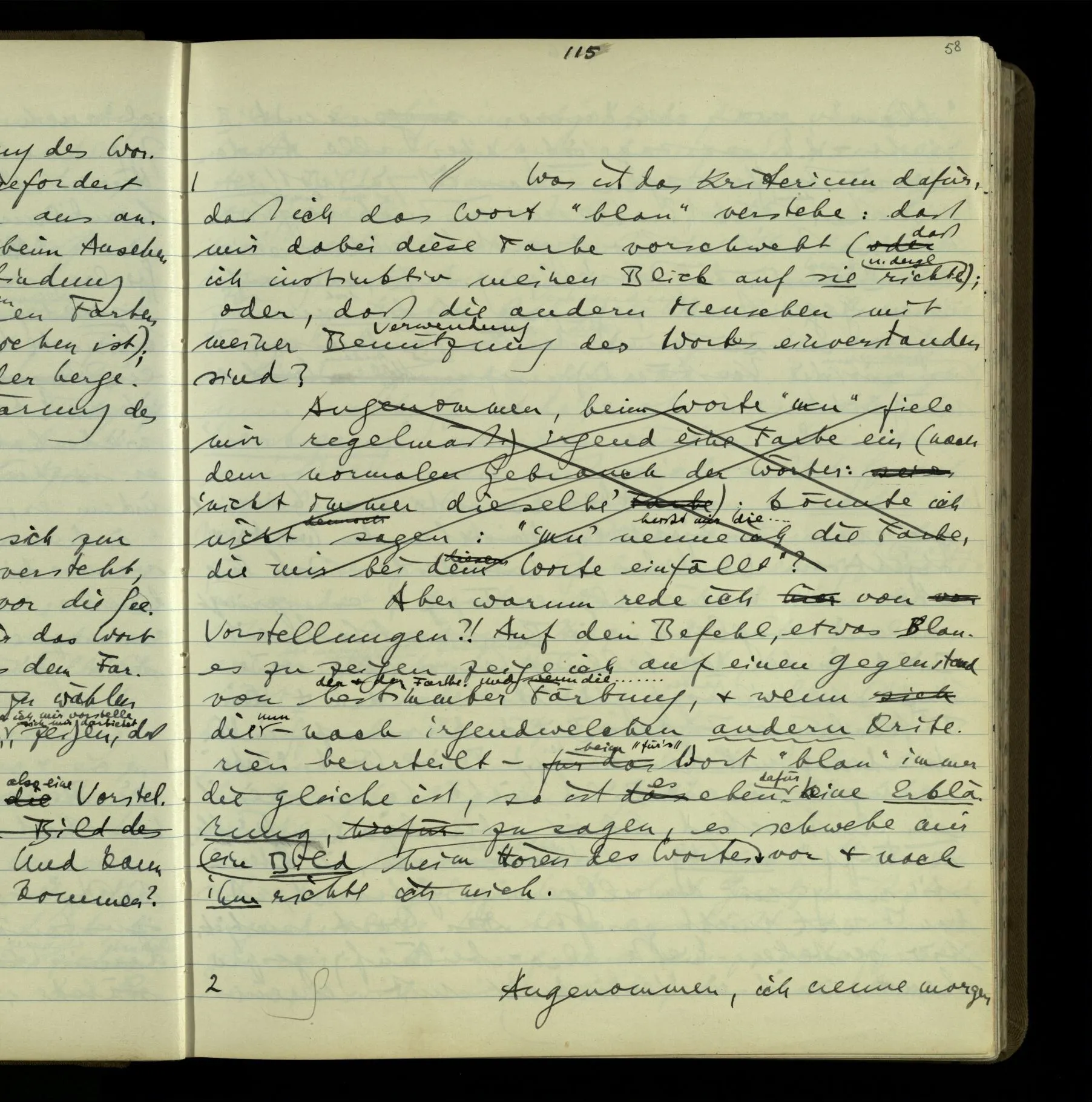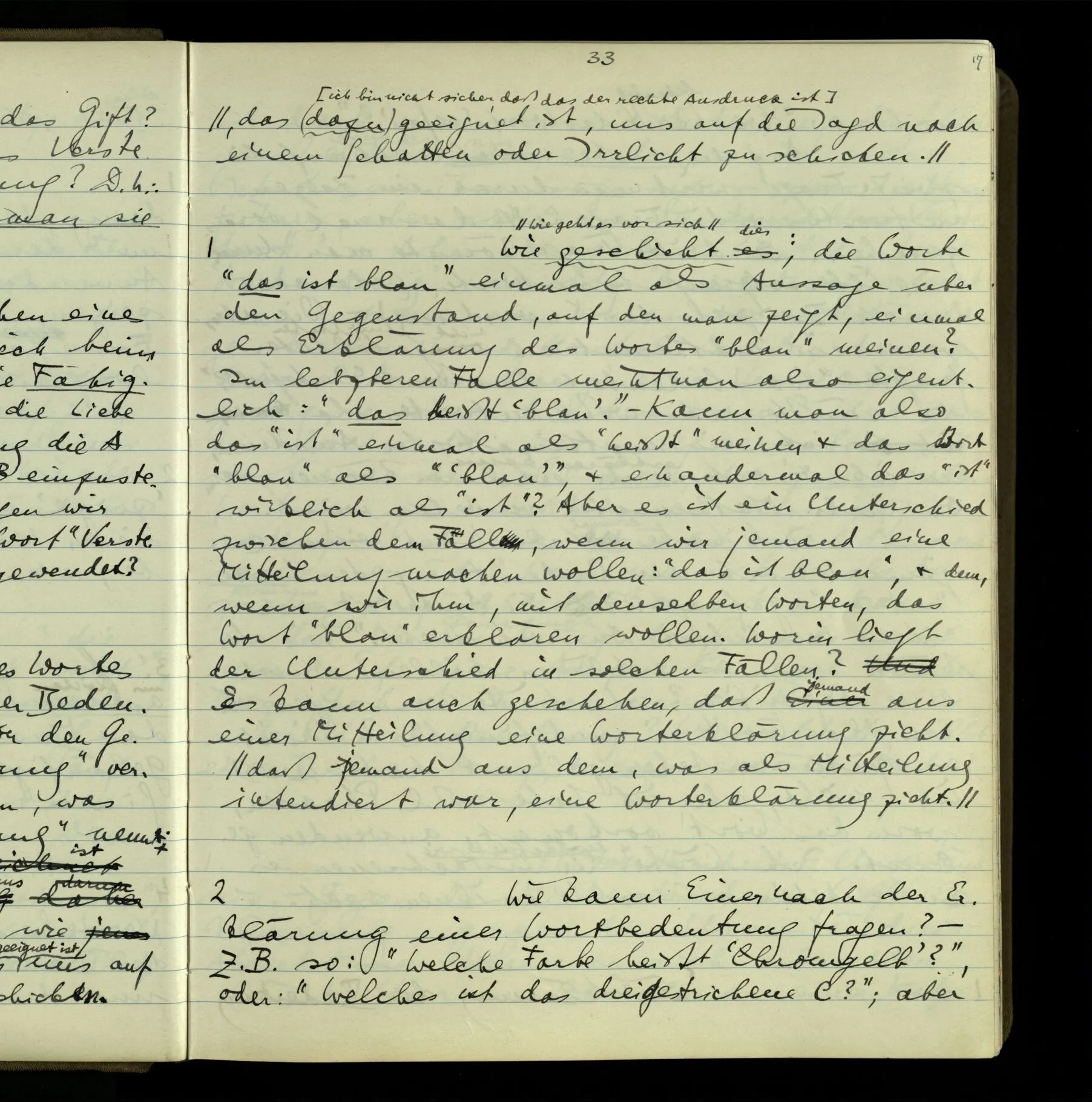 2 “Etwas habe ich aber doch gemeint, als ich das sagte!” – Wohl, aber wie können wir, was es ist, herausbringen? Doch wohl nur, indem er es uns sagt. Wenn wir nicht sein übriges Verhalten als Kriterium nehmen sollen, dann also (das), was er uns erklärt.
