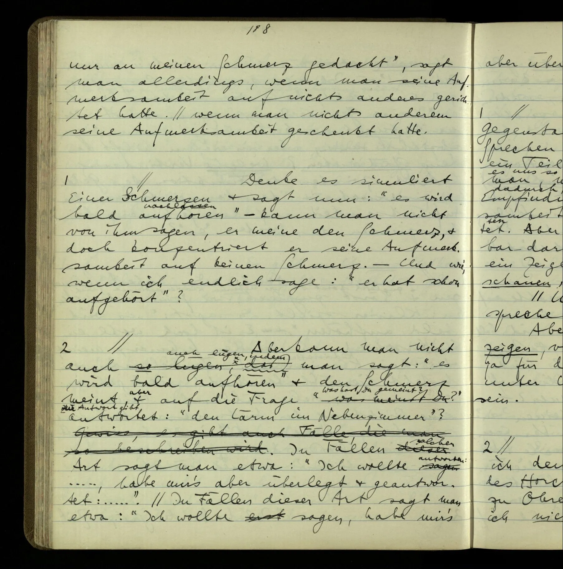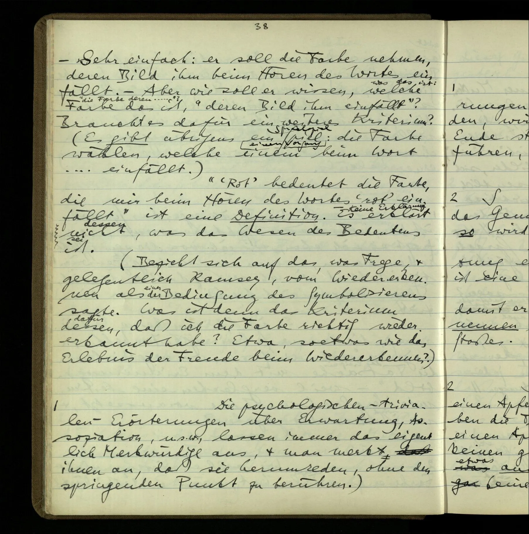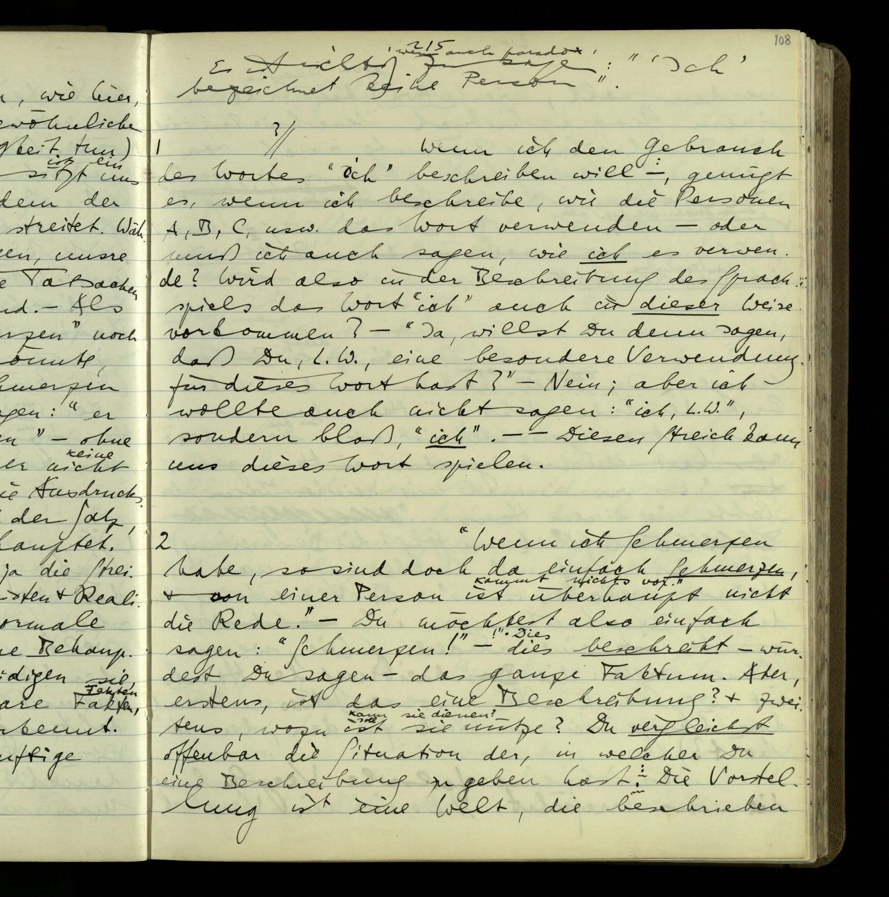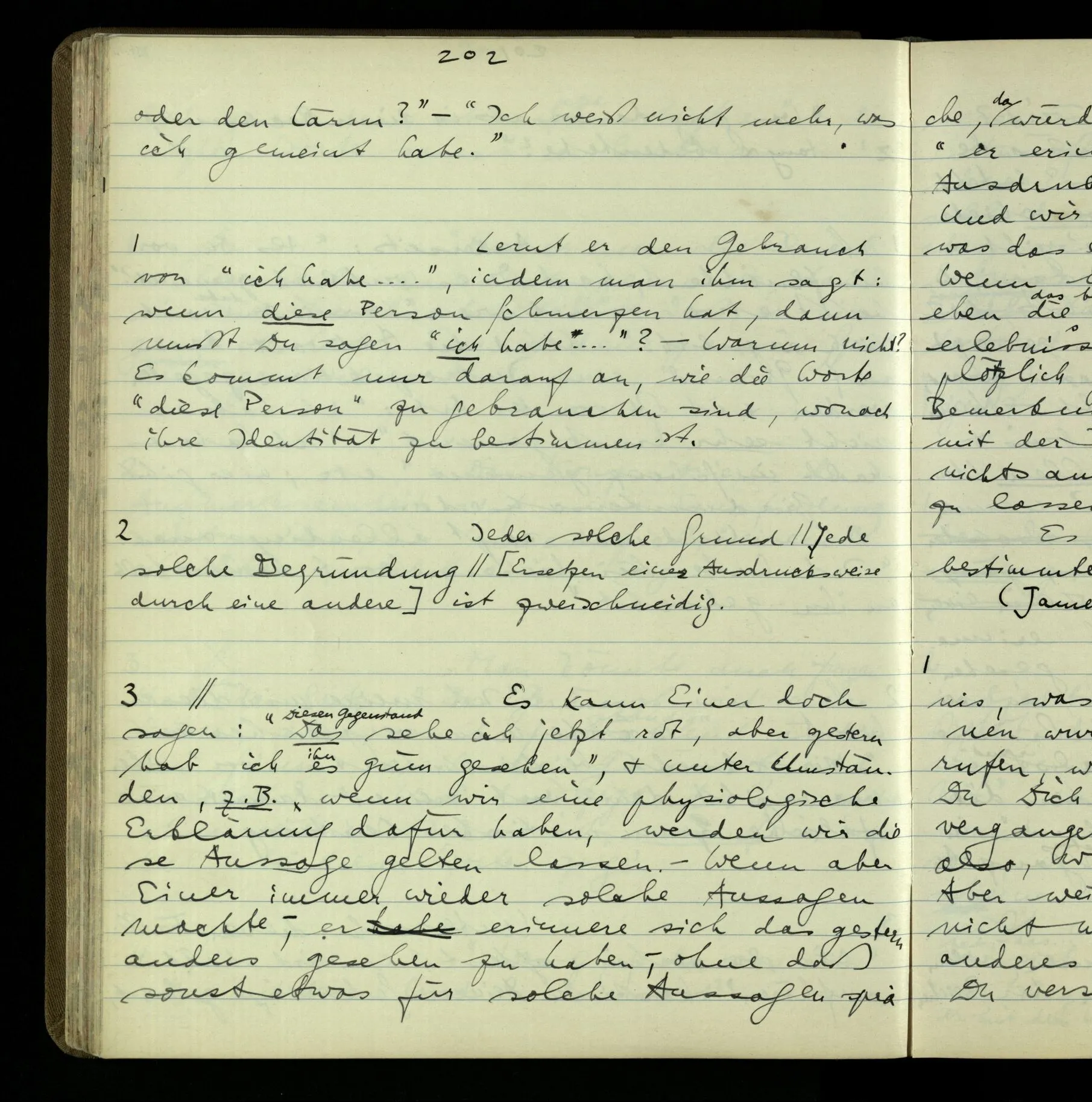 2 “Etwas habe ich aber doch gemeint, als ich das sagte!” – Wohl, aber wie können wir, was es ist, herausbringen? Doch wohl nur, indem er es uns sagt. Wenn wir nicht sein übriges Verhalten als Kriterium nehmen sollen, dann also (das), was er uns erklärt.