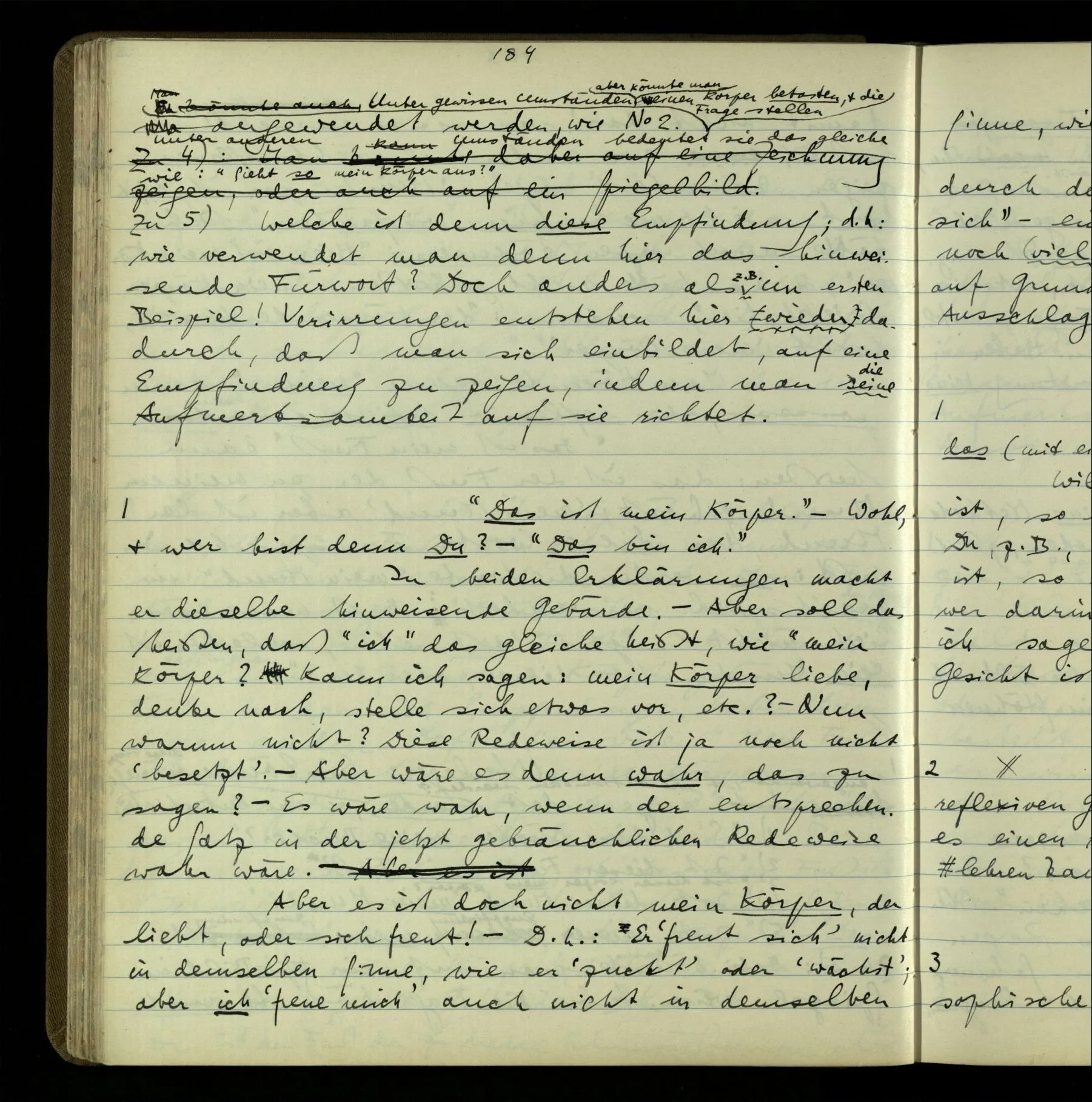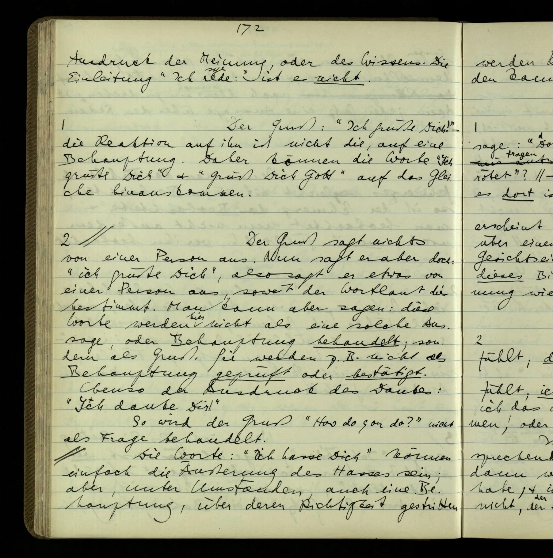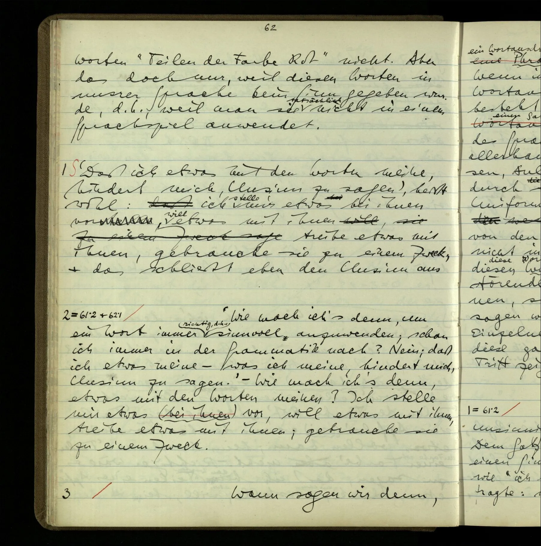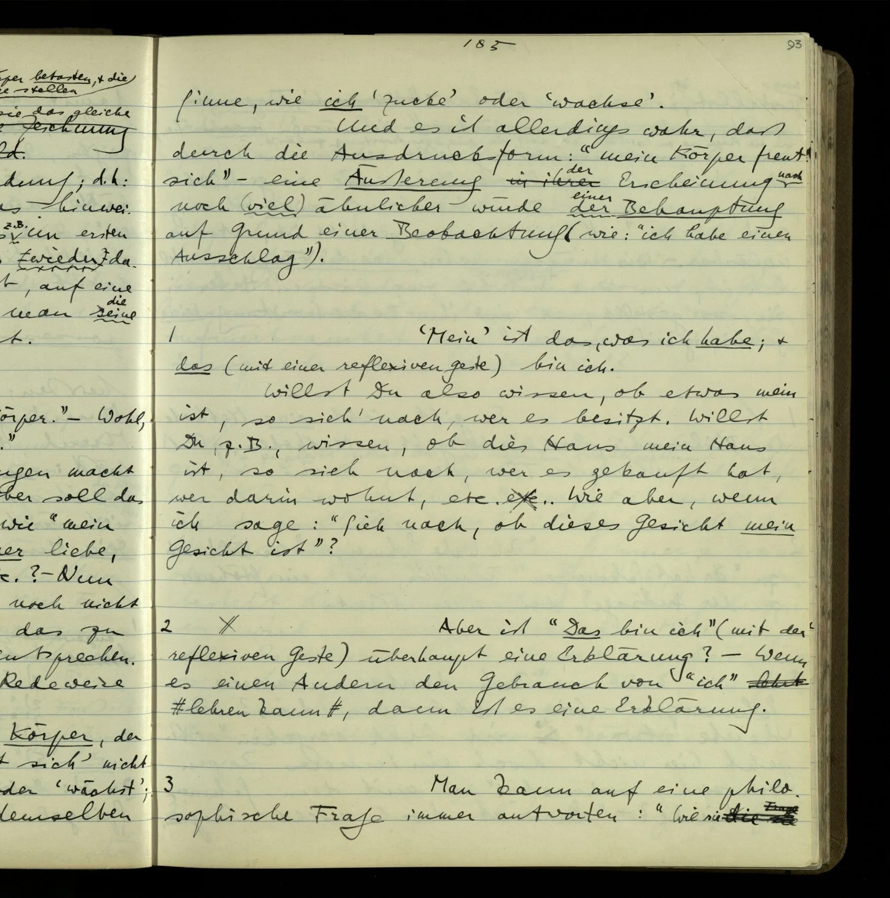 2 “Etwas habe ich aber doch gemeint, als ich das sagte!” – Wohl, aber wie können wir, was es ist, herausbringen? Doch wohl nur, indem er es uns sagt. Wenn wir nicht sein übriges Verhalten als Kriterium nehmen sollen, dann also (das), was er uns erklärt.