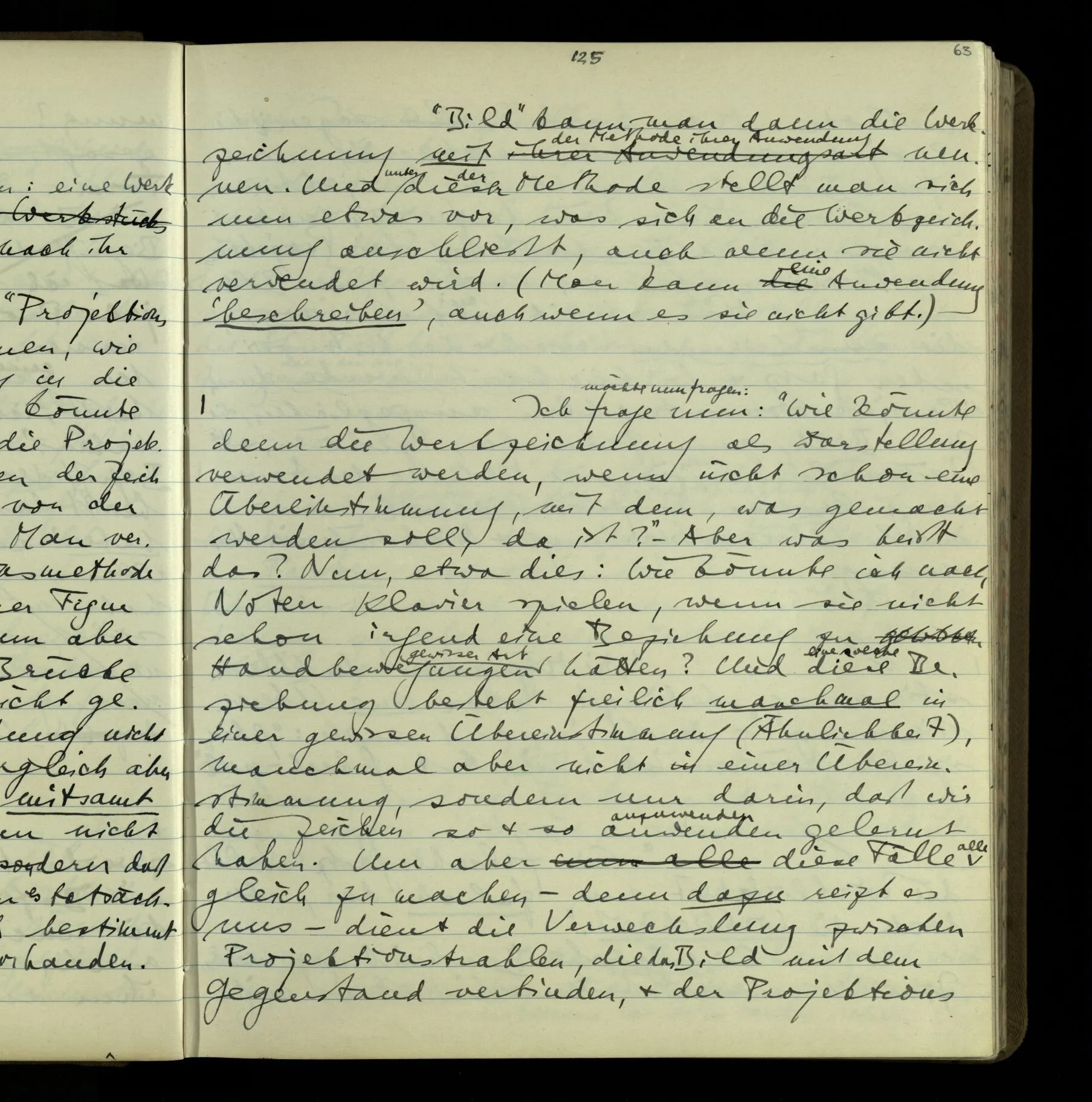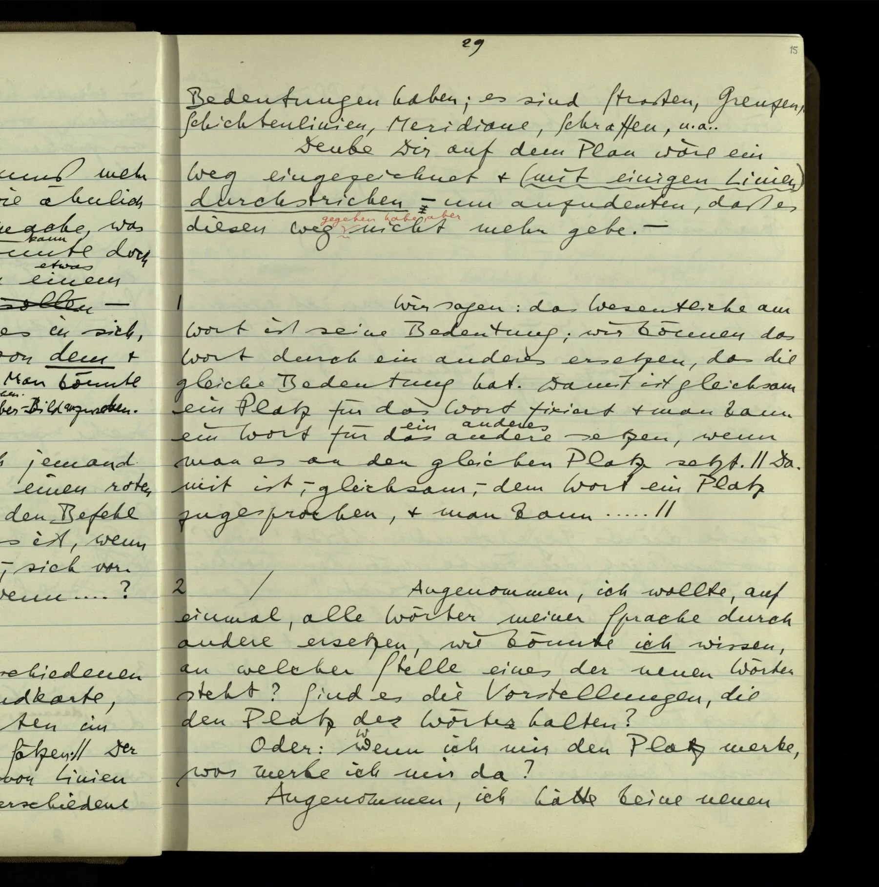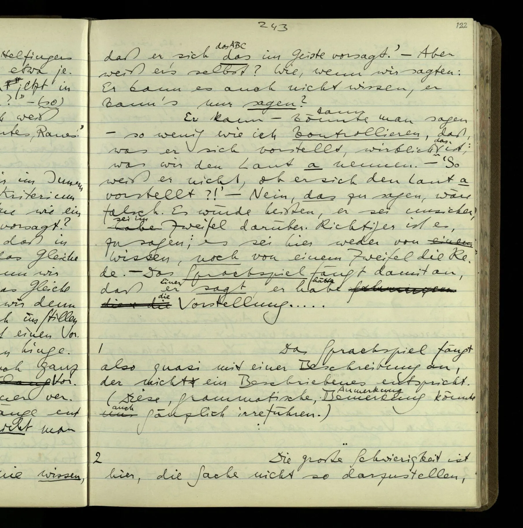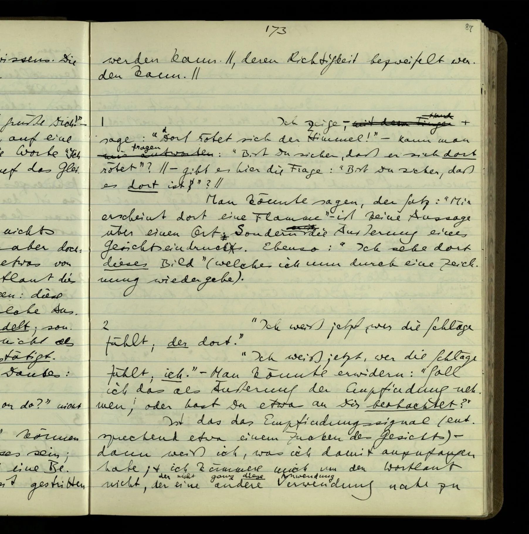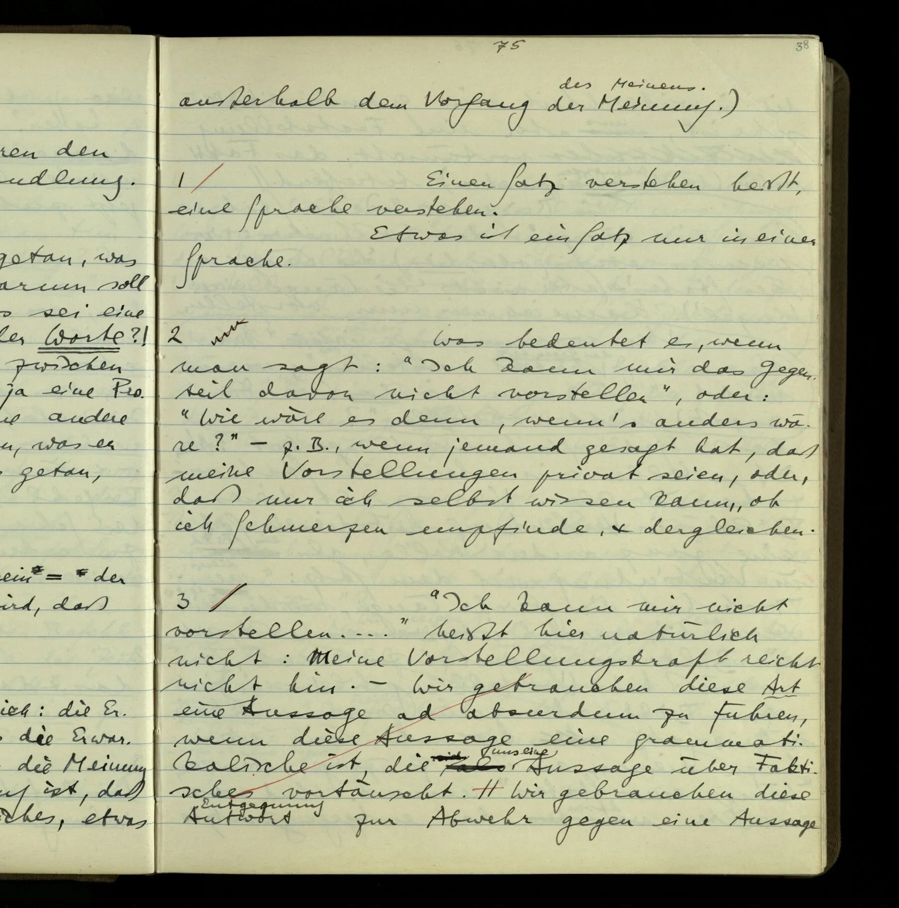 1 Wenn man aber sagt: “wie soll ich wissen, was er meint, ich sehe ja nur seine Zeichen”, so sage ich: “wie soll er wissen, was er meint, er hat ja auch nur seine Zeichen”.