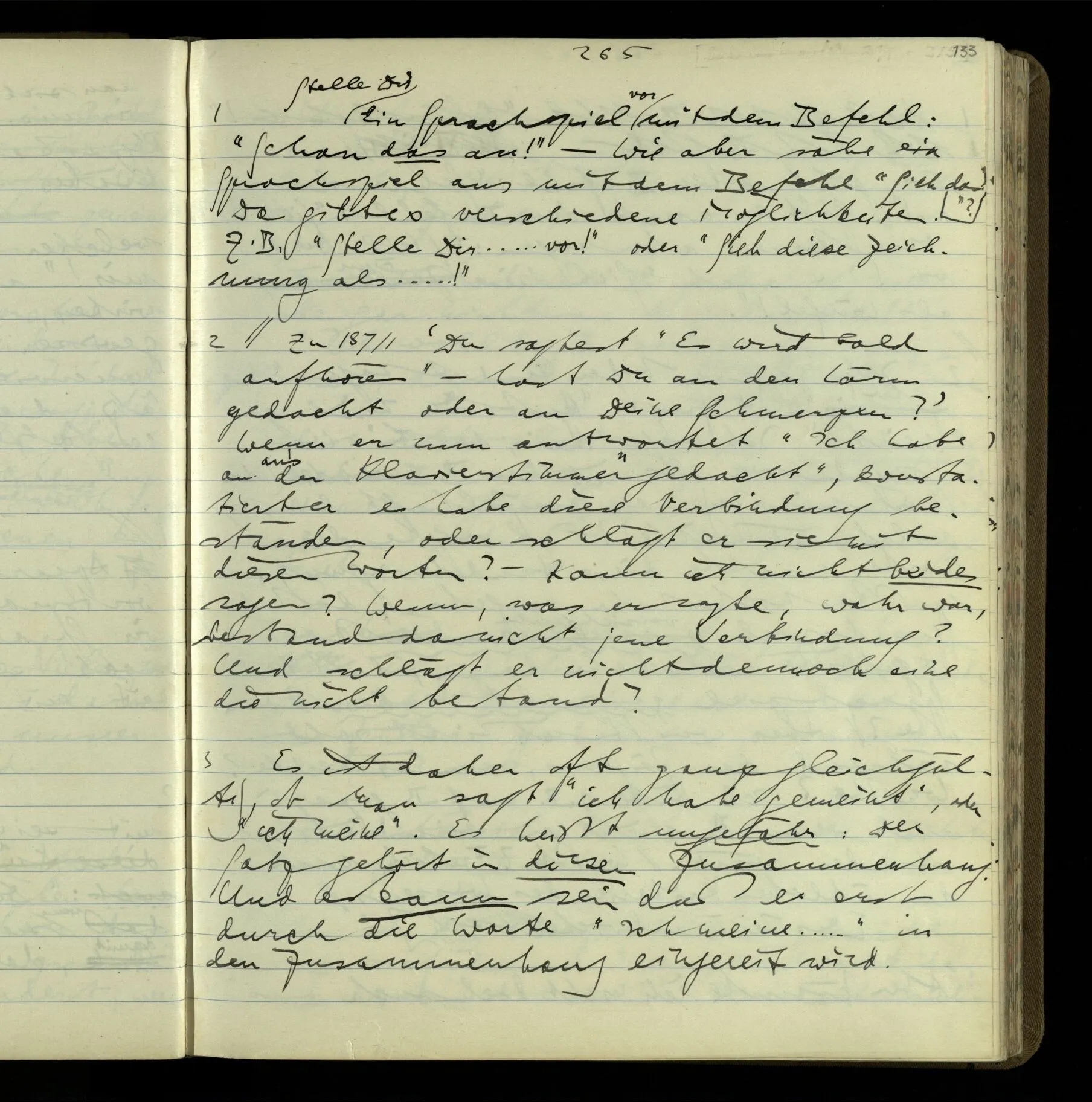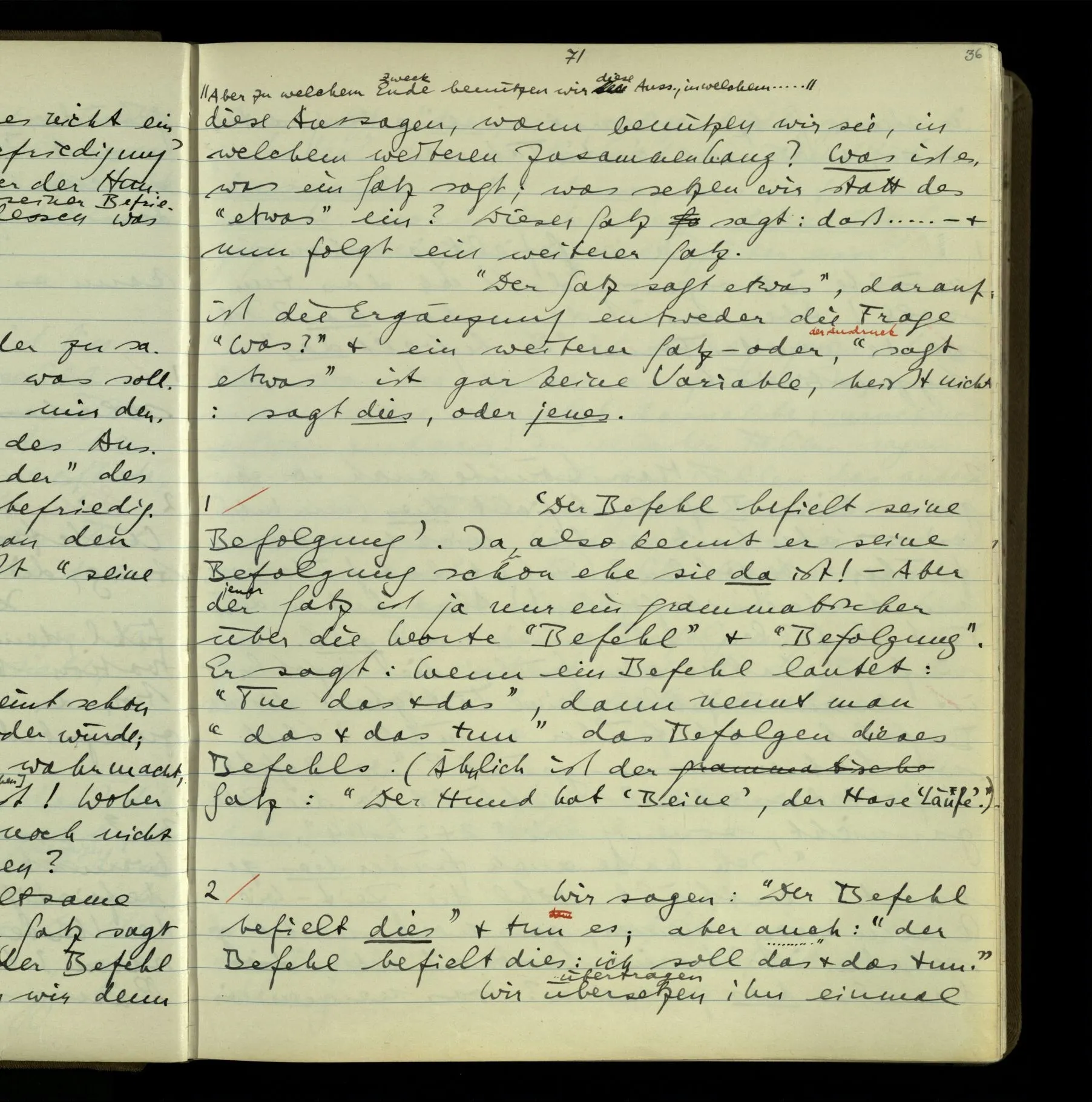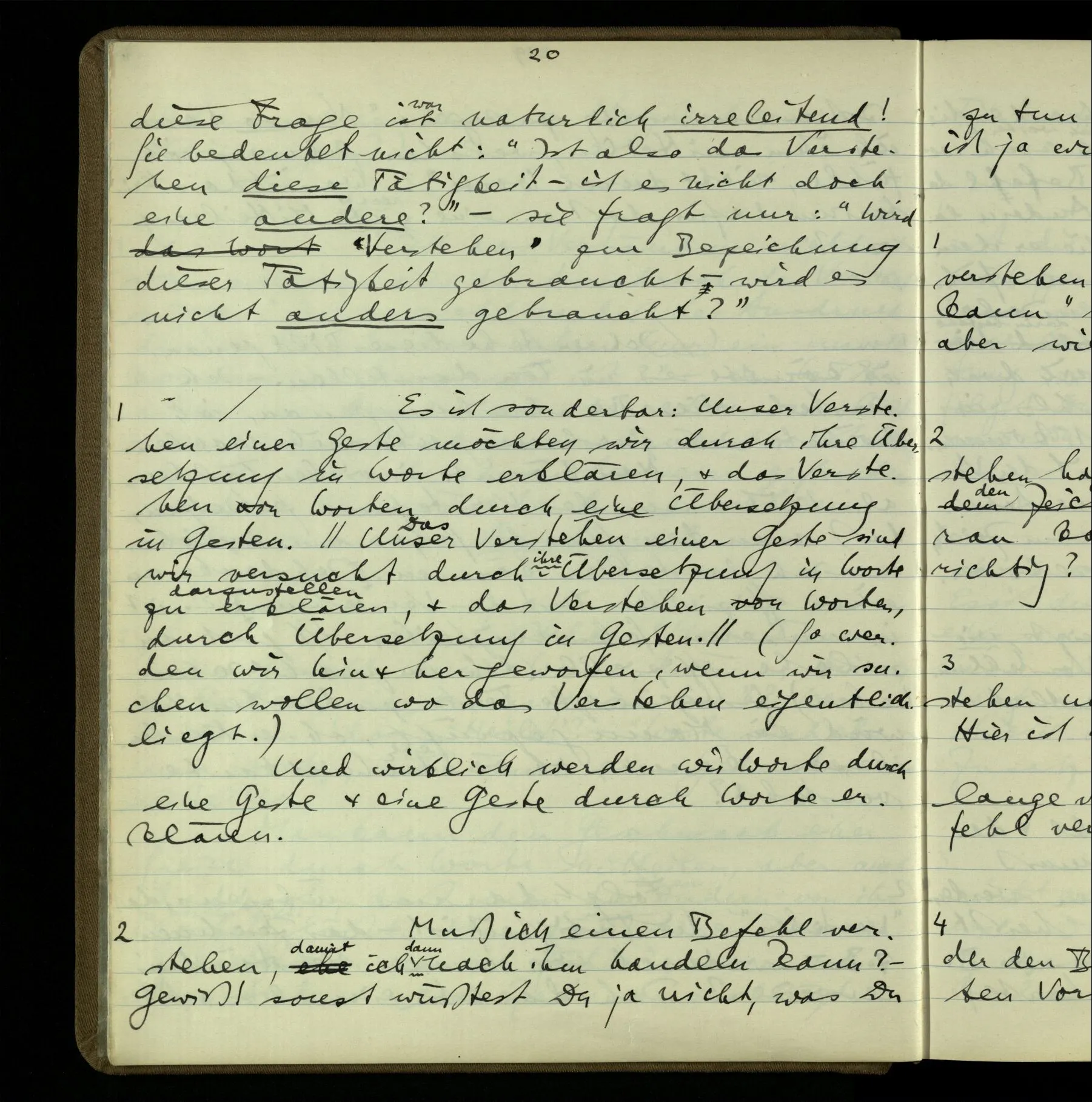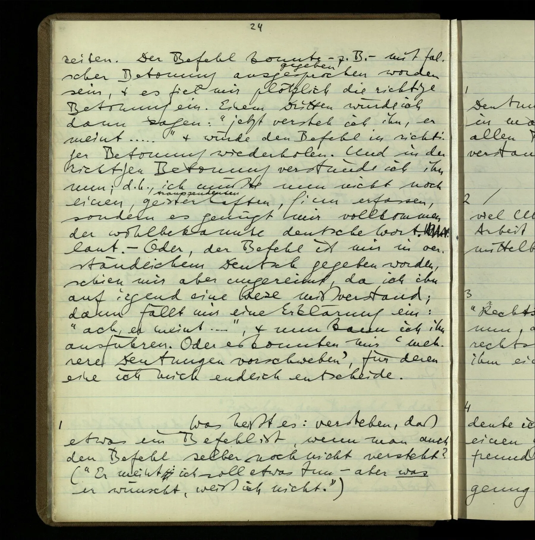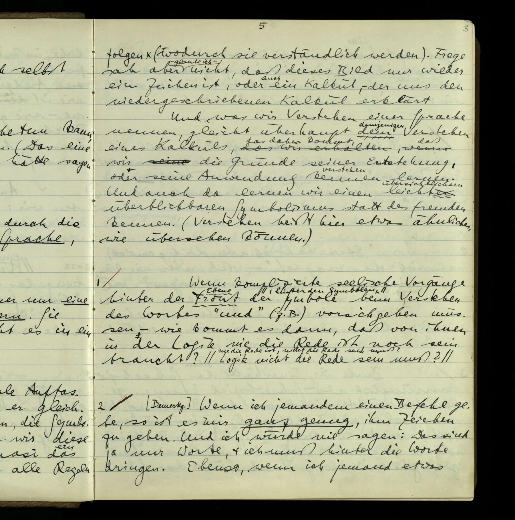 2 Wenn ich jemandem einen Befehl gebe, so ist es mir ganz genug, ihm Zeichen zu geben. Und ich würde nie sagen: Das sind ja nur Worte, & ich muß hinter die Worte dringen. Ebenso, wenn ich jemand etwas gefragt habe & er gibt mir eine Antwort (also ein Zeichen), bin ich zufrieden – das war es, was ich erwartete – & wende nicht ein: Das ist ja eine bloße Antwort.