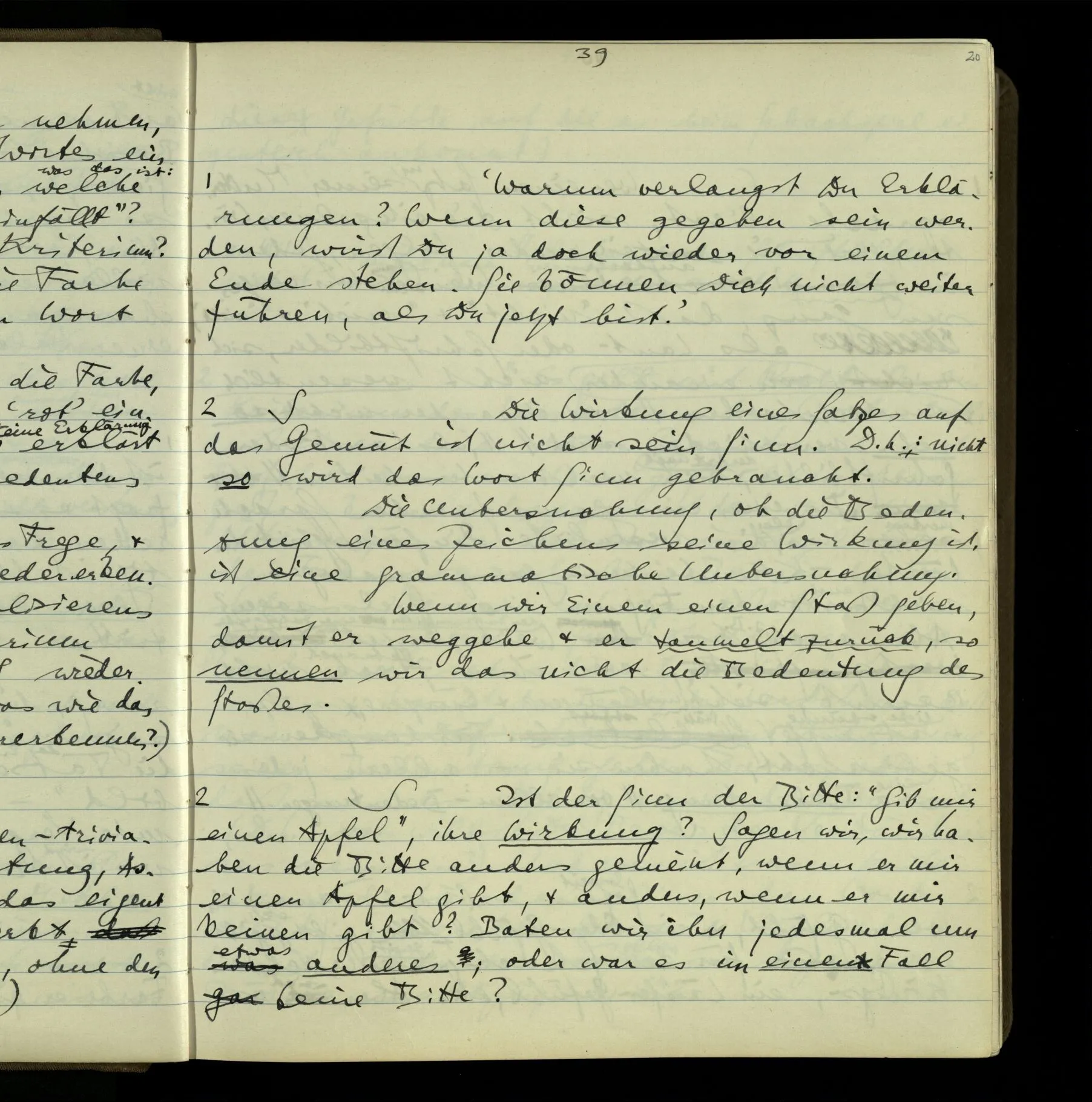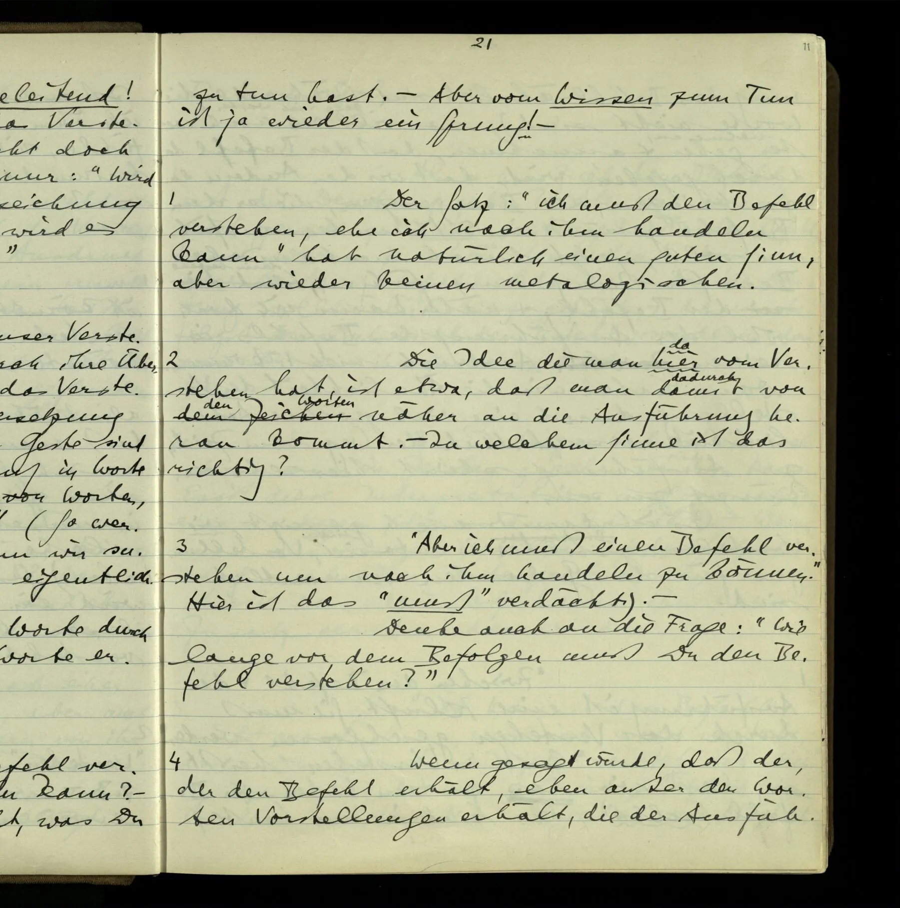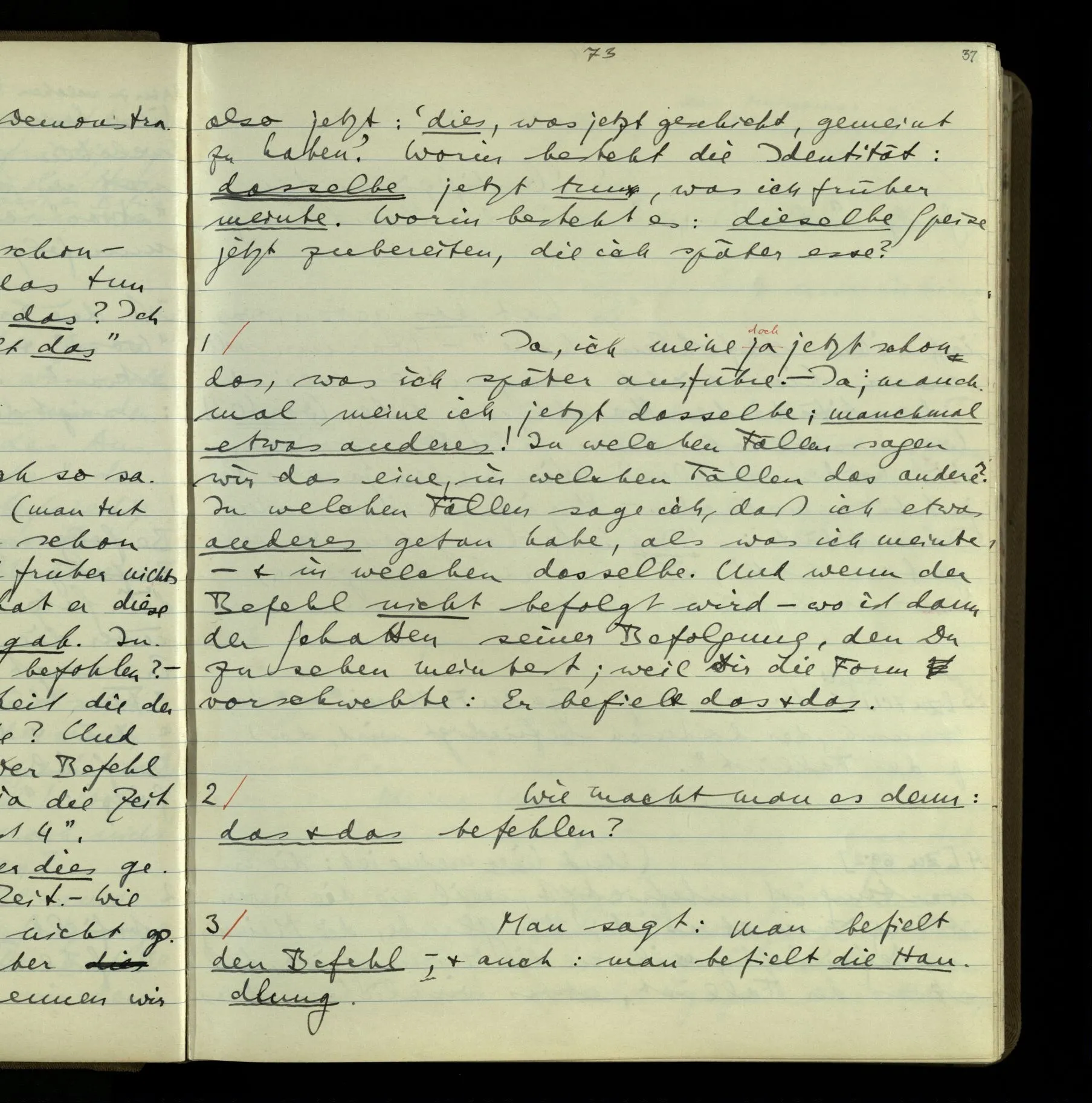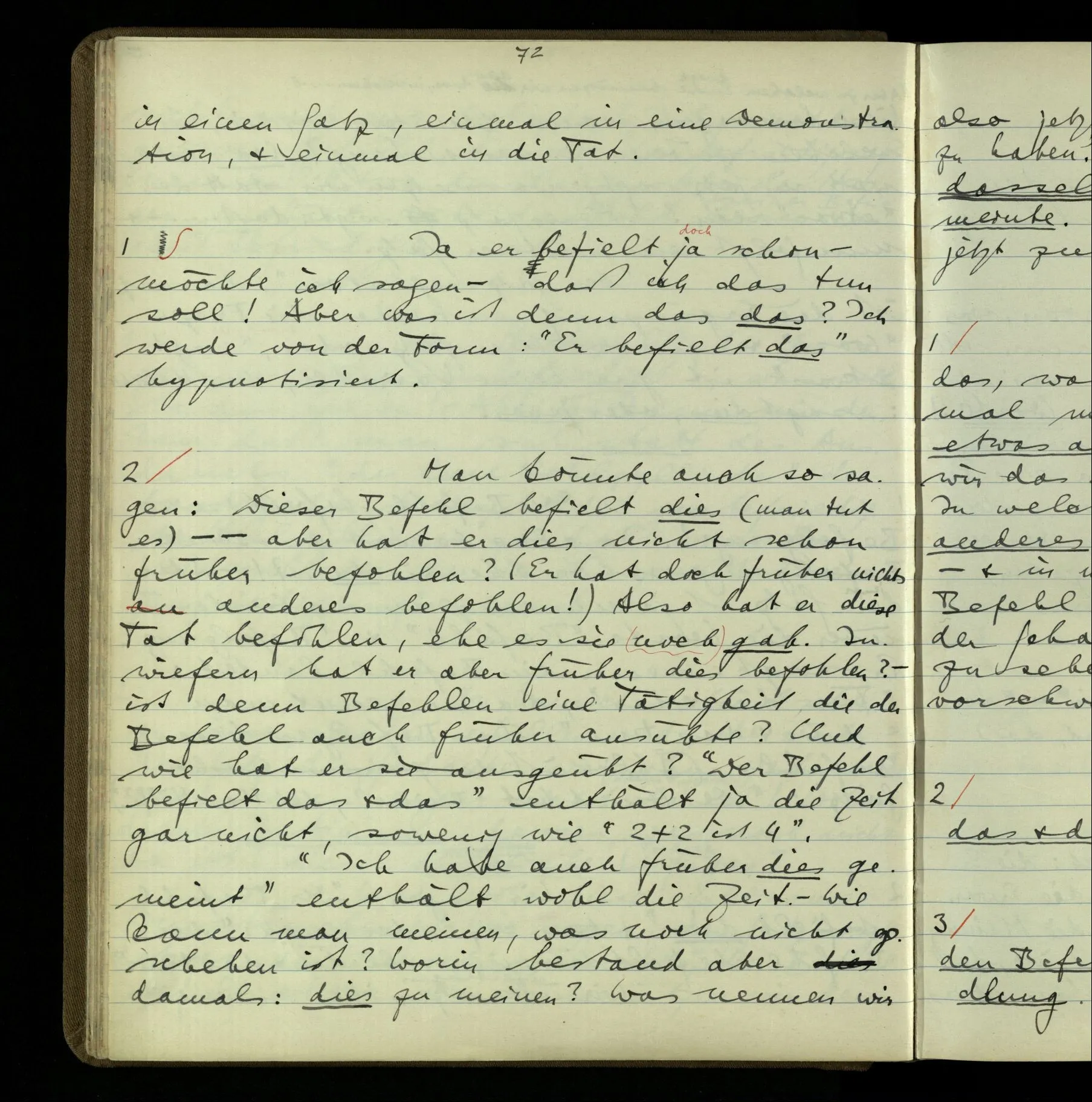 2 Wenn ich jemandem einen Befehl gebe, so ist es mir ganz genug, ihm Zeichen zu geben. Und ich würde nie sagen: Das sind ja nur Worte, & ich muß hinter die Worte dringen. Ebenso, wenn ich jemand etwas gefragt habe & er gibt mir eine Antwort (also ein Zeichen), bin ich zufrieden – das war es, was ich erwartete – & wende nicht ein: Das ist ja eine bloße Antwort.