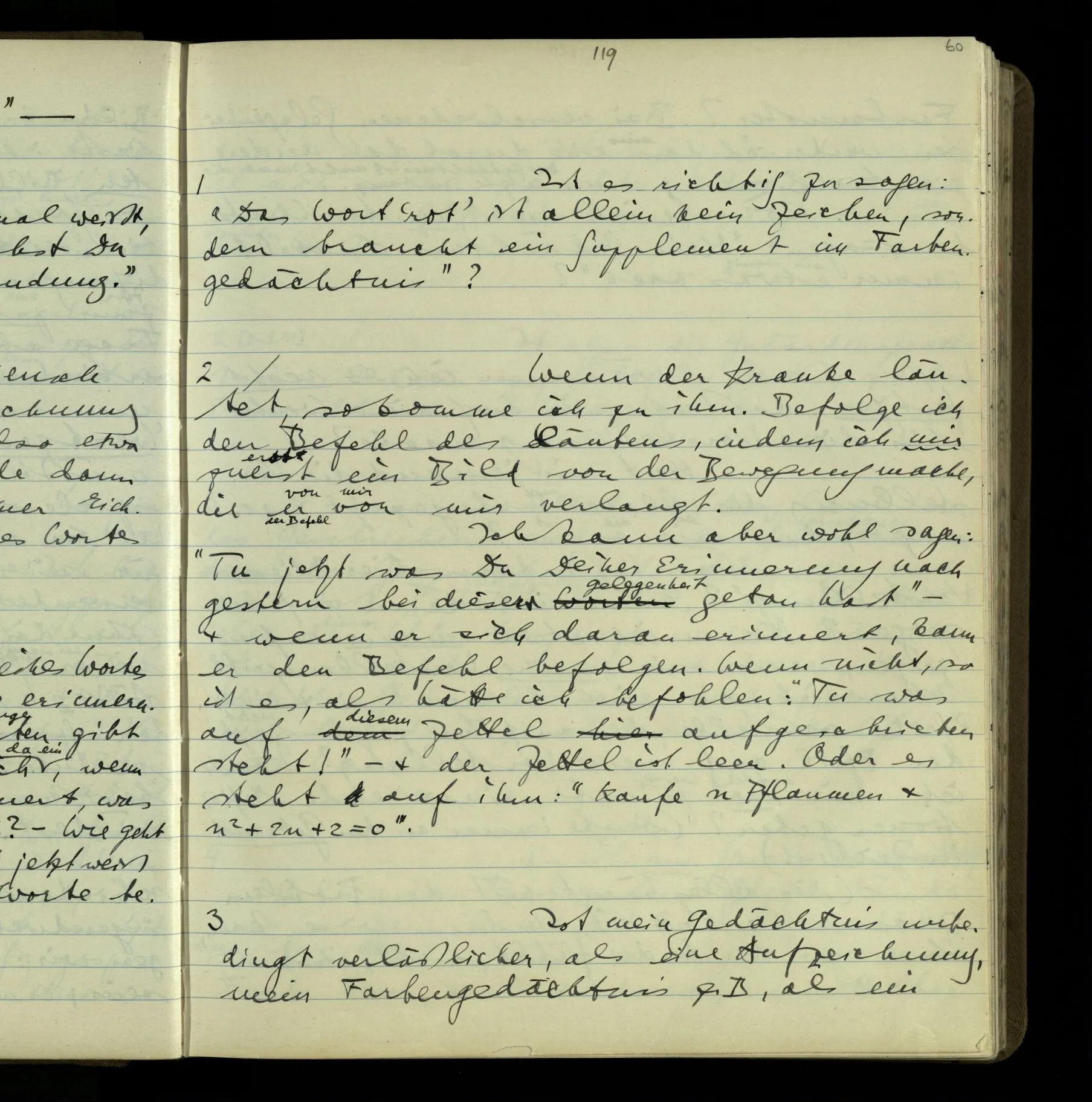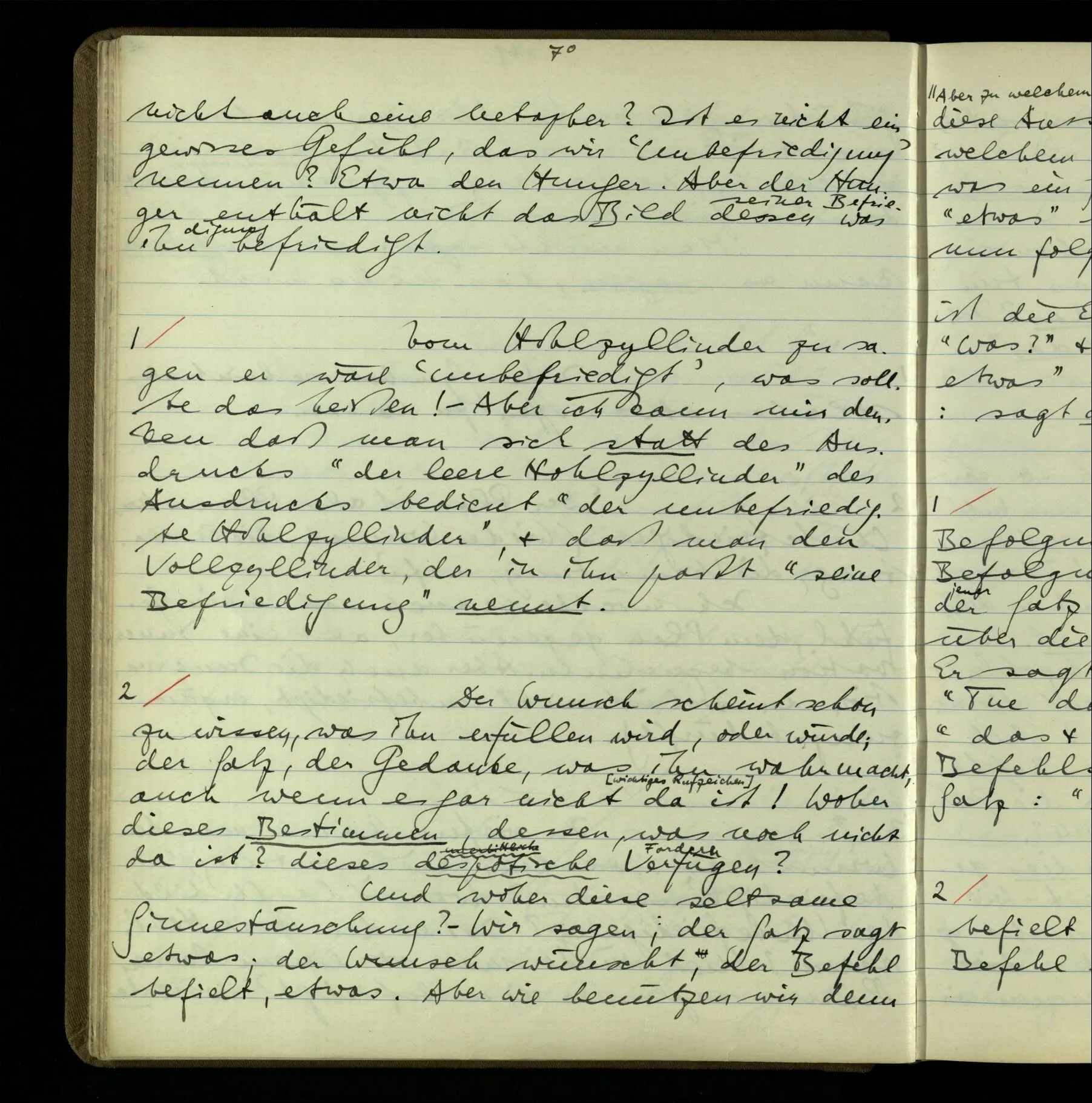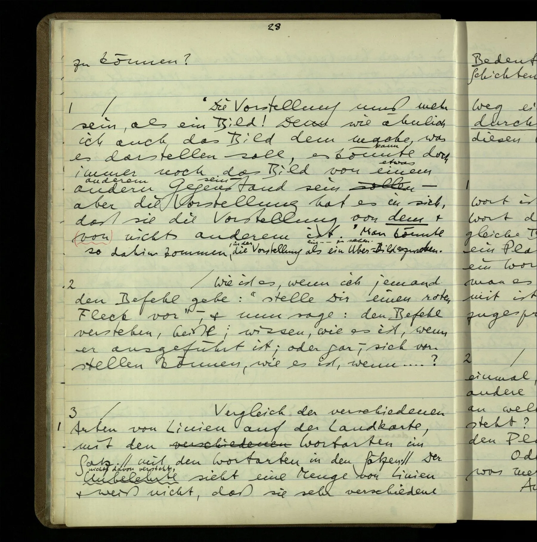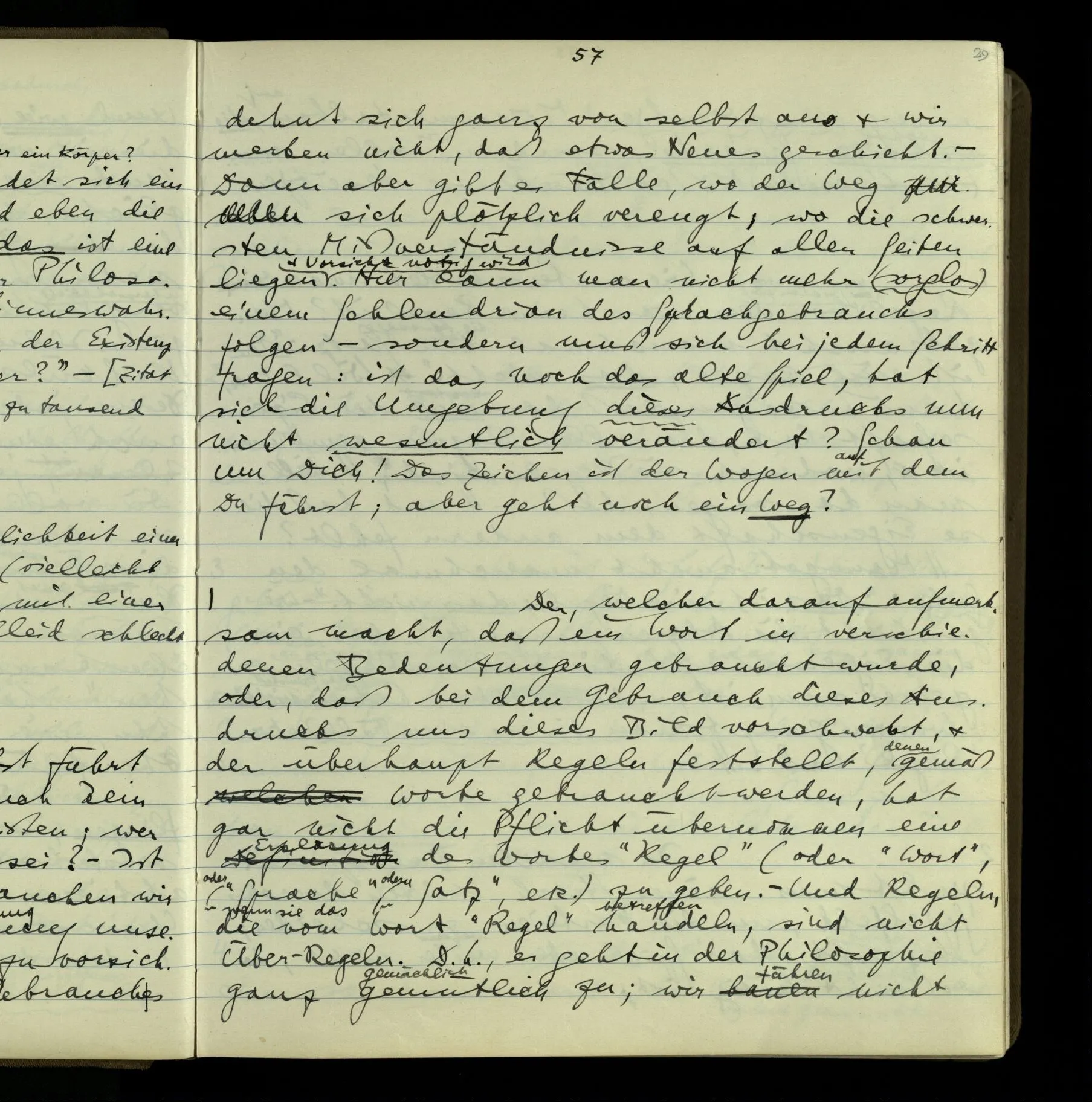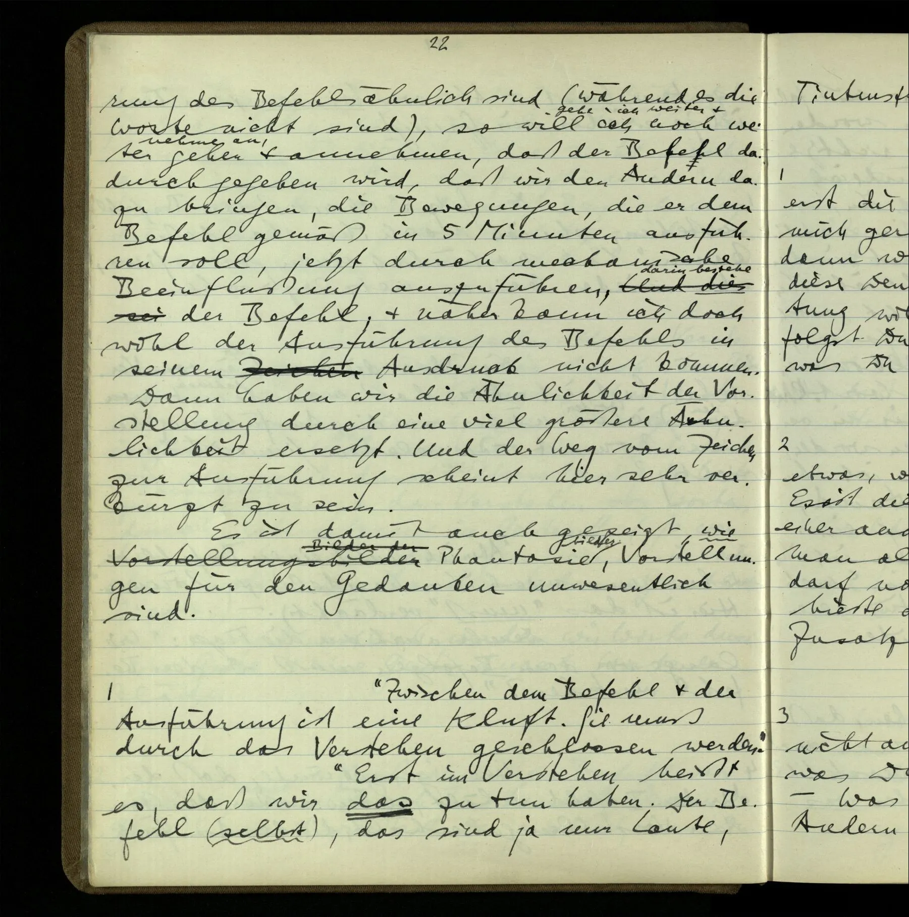 2 Wenn ich jemandem einen Befehl gebe, so ist es mir ganz genug, ihm Zeichen zu geben. Und ich würde nie sagen: Das sind ja nur Worte, & ich muß hinter die Worte dringen. Ebenso, wenn ich jemand etwas gefragt habe & er gibt mir eine Antwort (also ein Zeichen), bin ich zufrieden – das war es, was ich erwartete – & wende nicht ein: Das ist ja eine bloße Antwort.