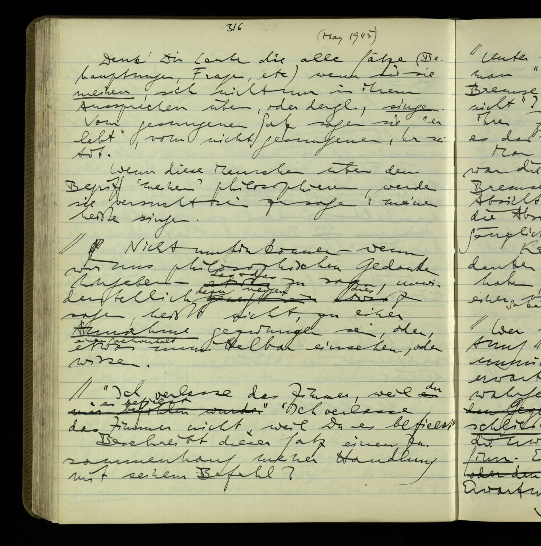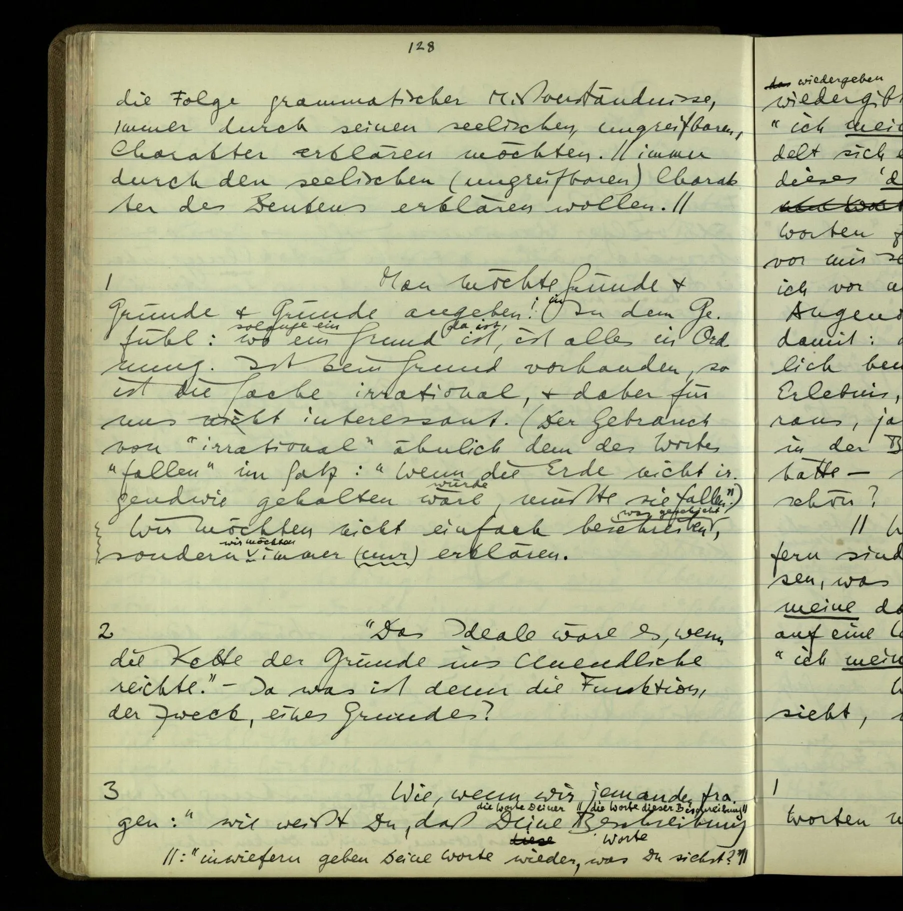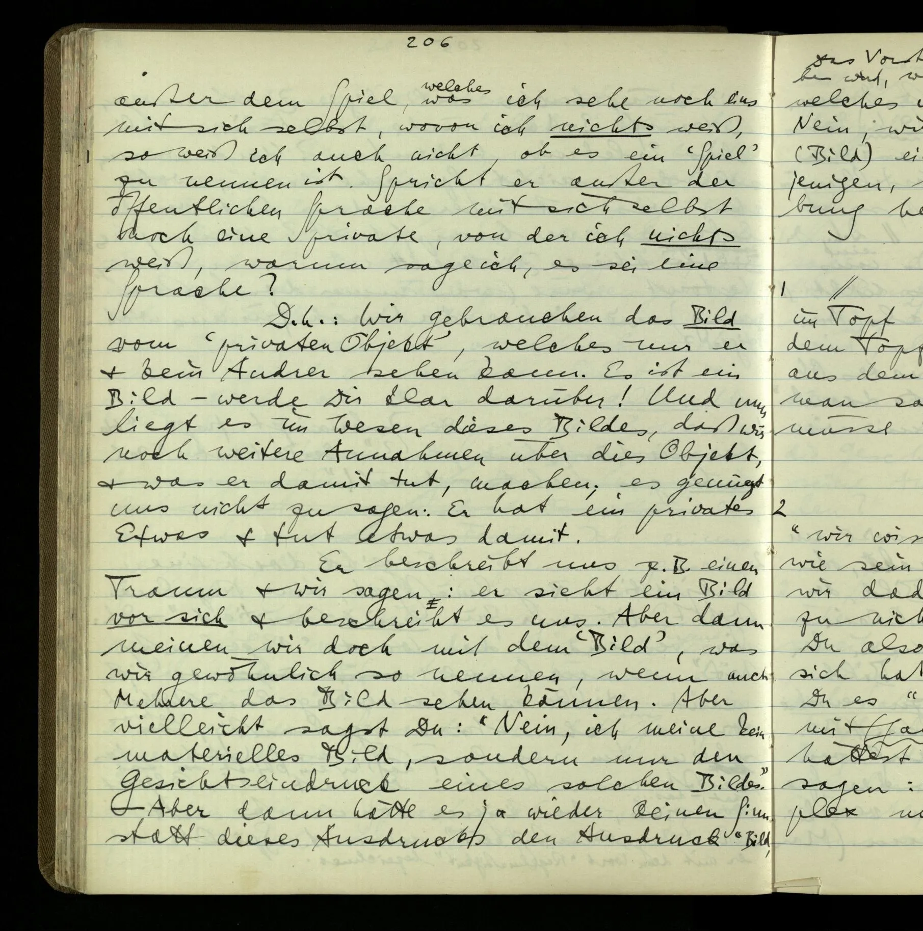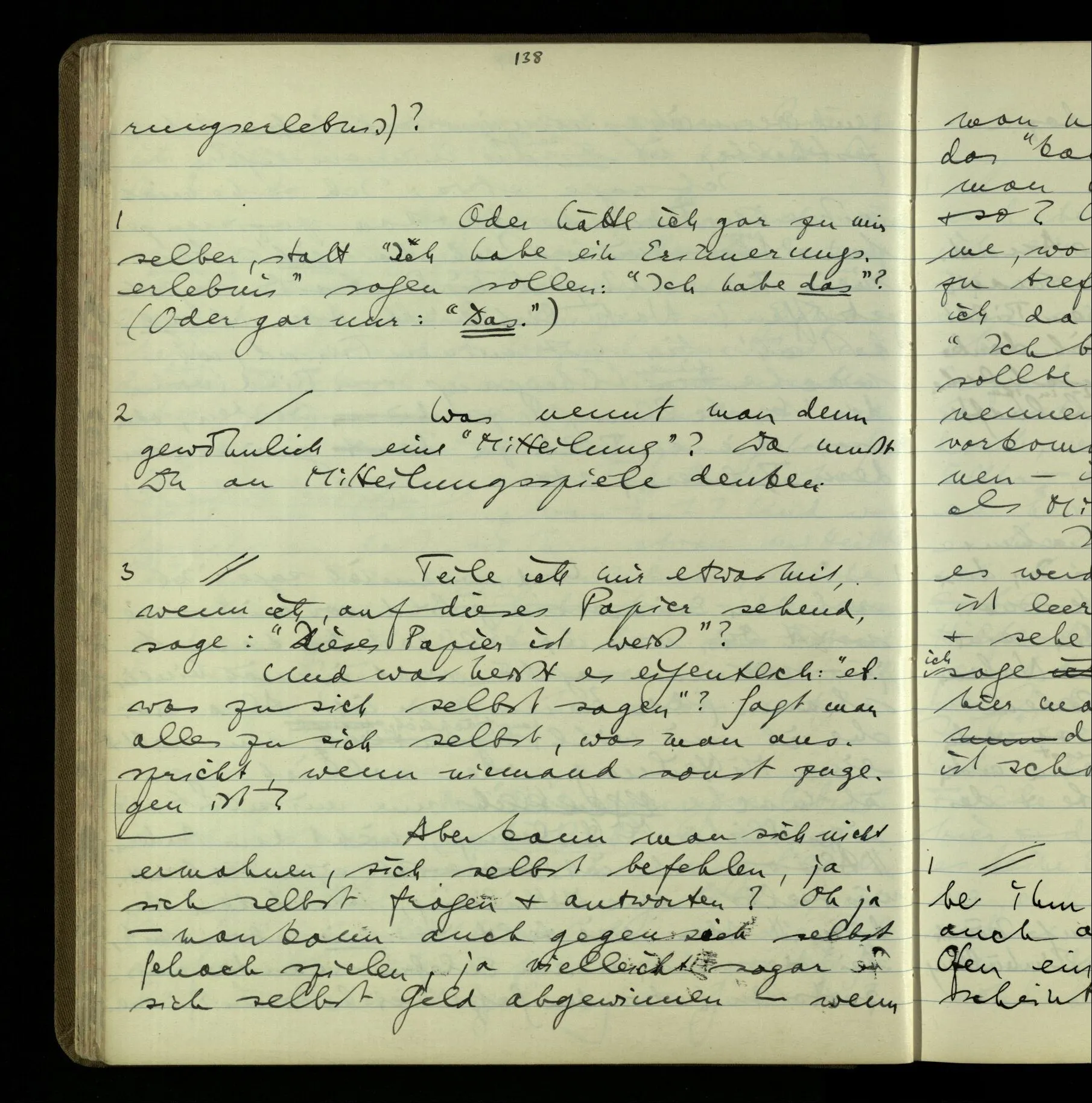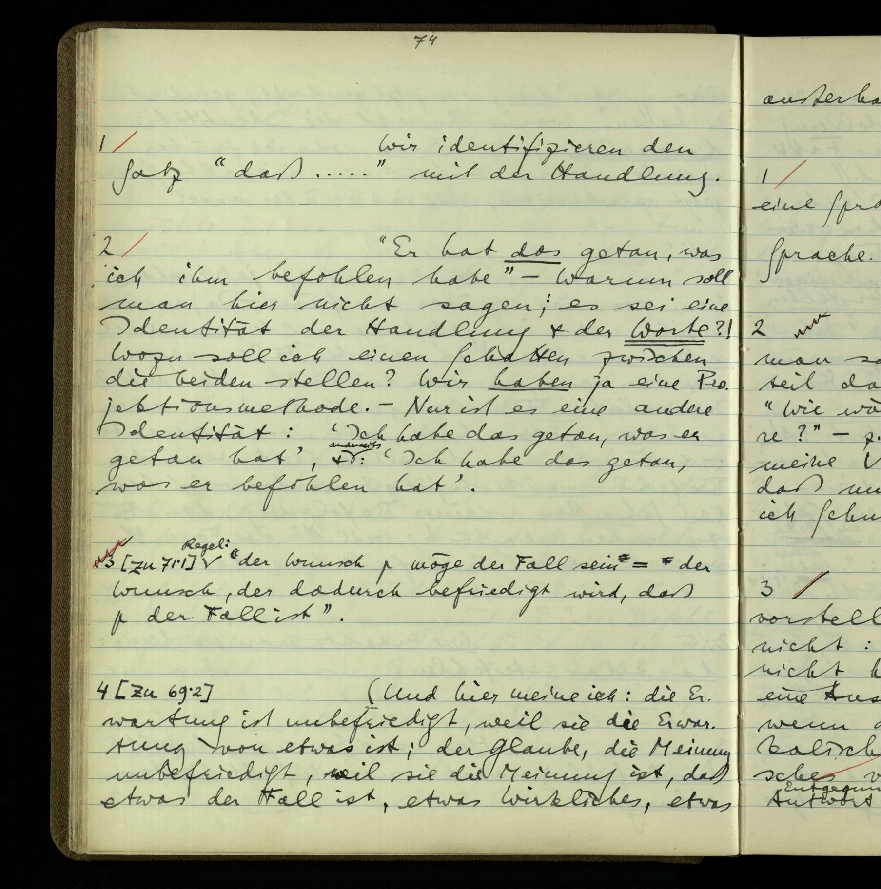 2 Wenn ich jemandem einen Befehl gebe, so ist es mir ganz genug, ihm Zeichen zu geben. Und ich würde nie sagen: Das sind ja nur Worte, & ich muß hinter die Worte dringen. Ebenso, wenn ich jemand etwas gefragt habe & er gibt mir eine Antwort (also ein Zeichen), bin ich zufrieden – das war es, was ich erwartete – & wende nicht ein: Das ist ja eine bloße Antwort.