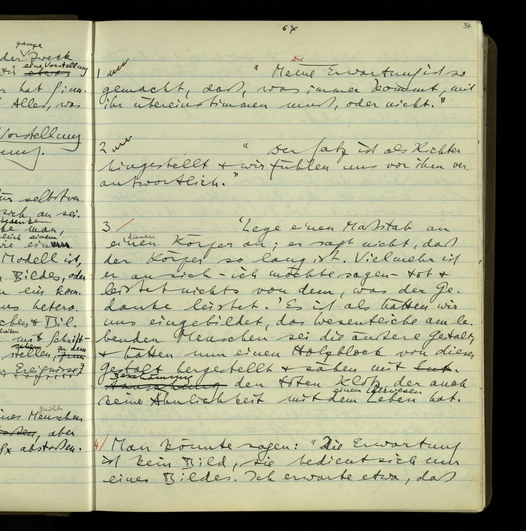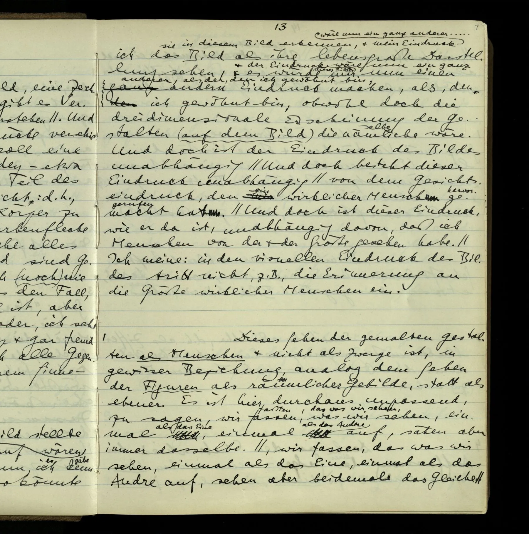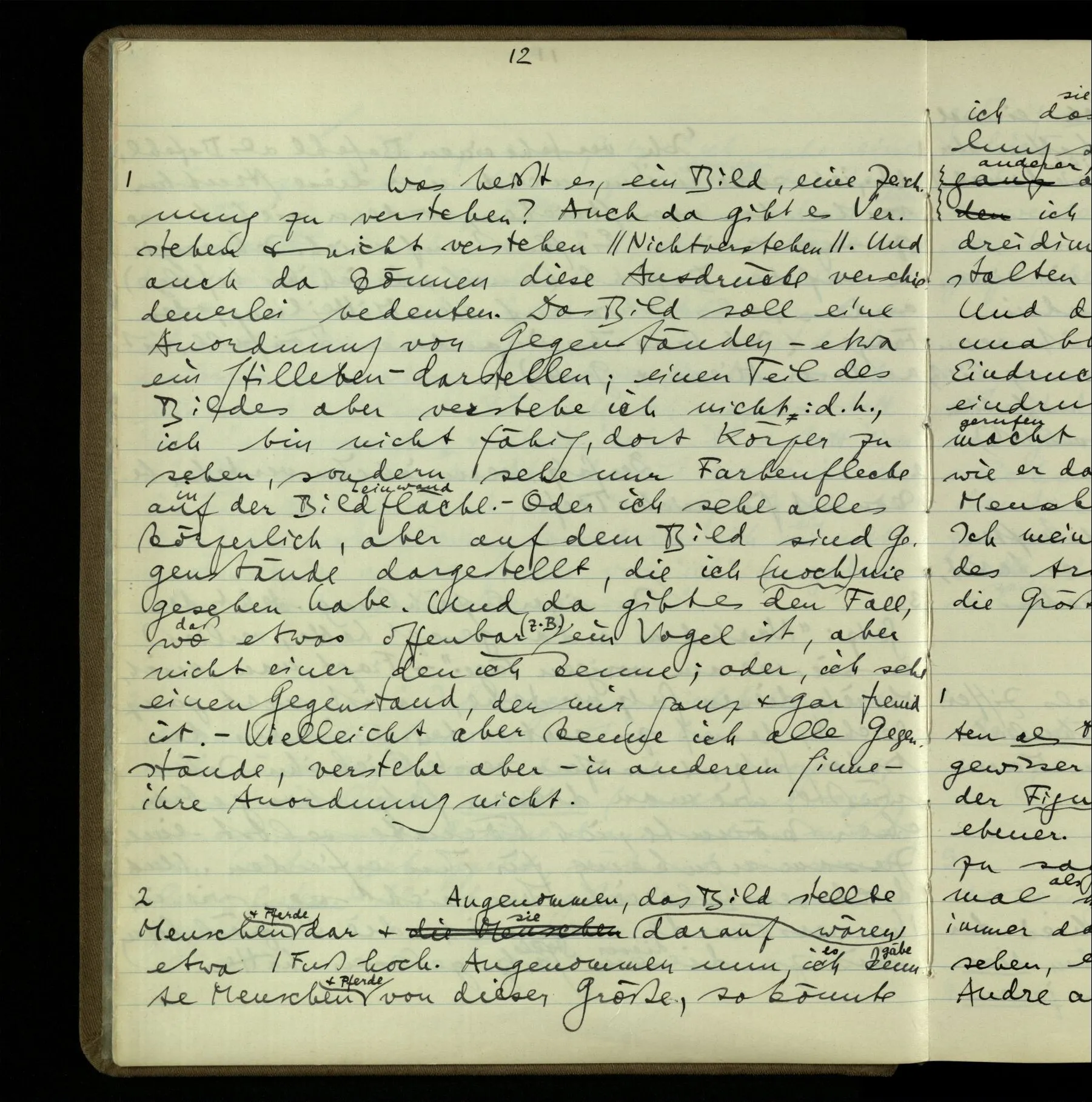 2 Angenommen, das Bild stellte Menschen & Pferde dar & sie wären darauf etwa 1 Fuß hoch. Angenommen nun, ich kennte Menschen & Pferde von dieser Größe, so könnte ich das Bild als ihre lebensgroße Darstellung sehen; & es würde mir nun einen andern Eindruck machen, als, den ich gewöhnt bin; obwohl doch die dreidimensionale Erscheinung der Gestalten (auf dem Bild) die nämliche wäre. Und doch ist der Eindruck des Bildes unabhängig von dem Gesichtseindruck, den ein wirklicher Mensch gemacht hat. Ich meine: in den visuellen Eindruck des Bildes tritt nicht, z.B., die Erinnerung an die Größe wirklicher Menschen ein.