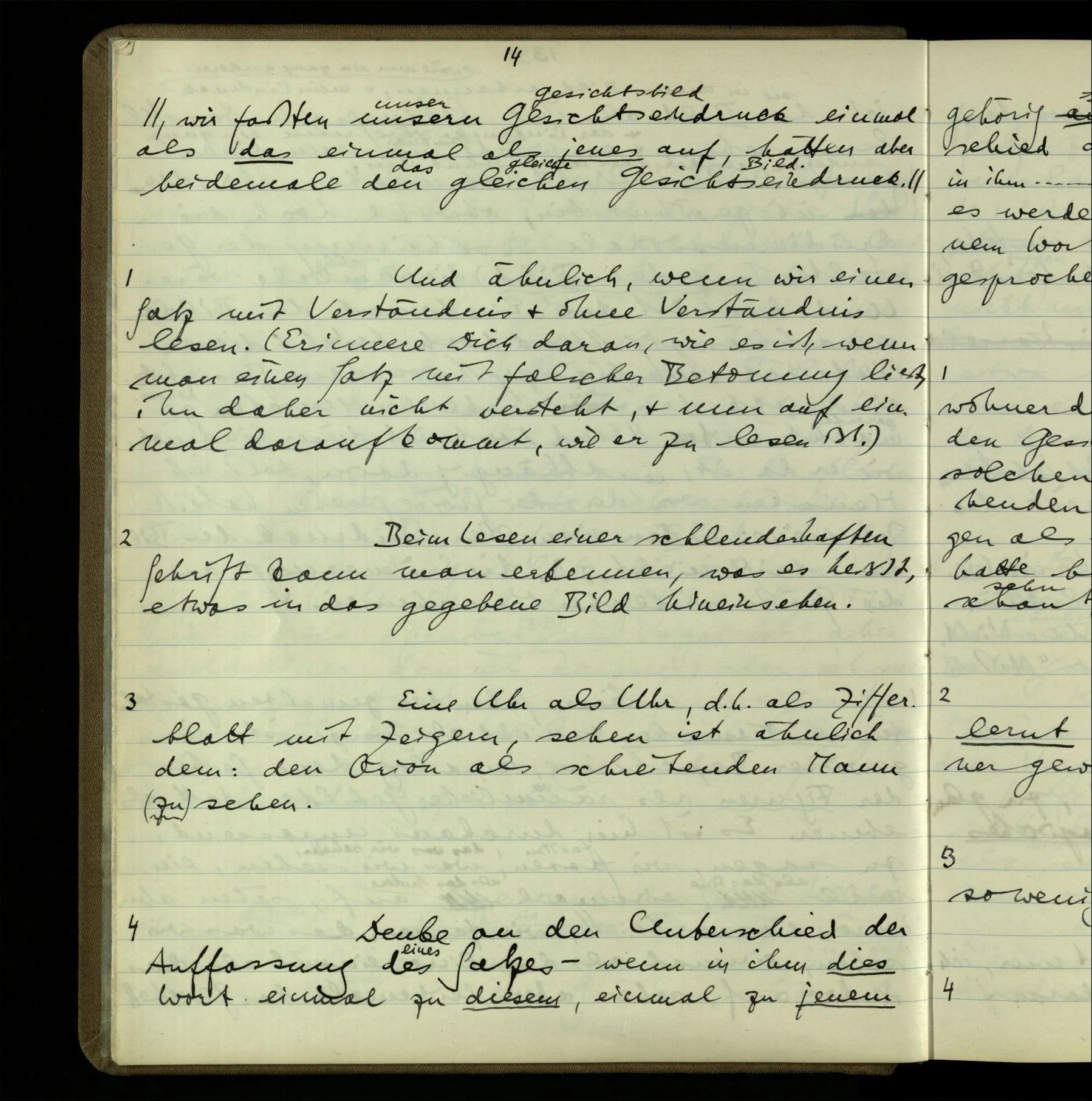 4 Denke an den Unterschied der Auffassung des Satzes – wenn in ihm dies Wort einmal zu diesem, einmal zu jenem gehörig angesehen wird. Und ich hätte auch sagen können, es werde einmal zu diesem, einmal zu jenem Wort gehörig – verstanden, gesehen, ausgesprochen.