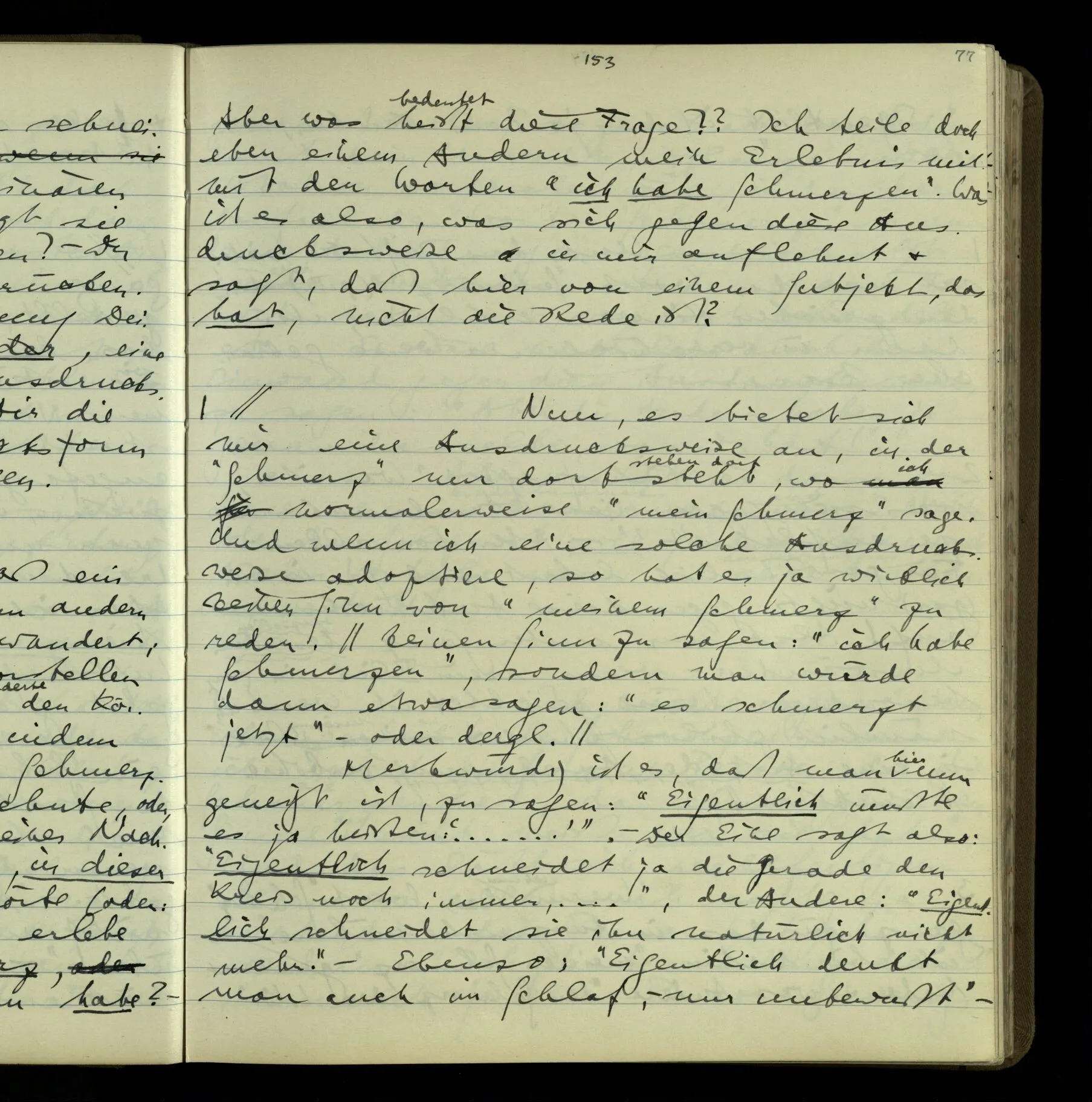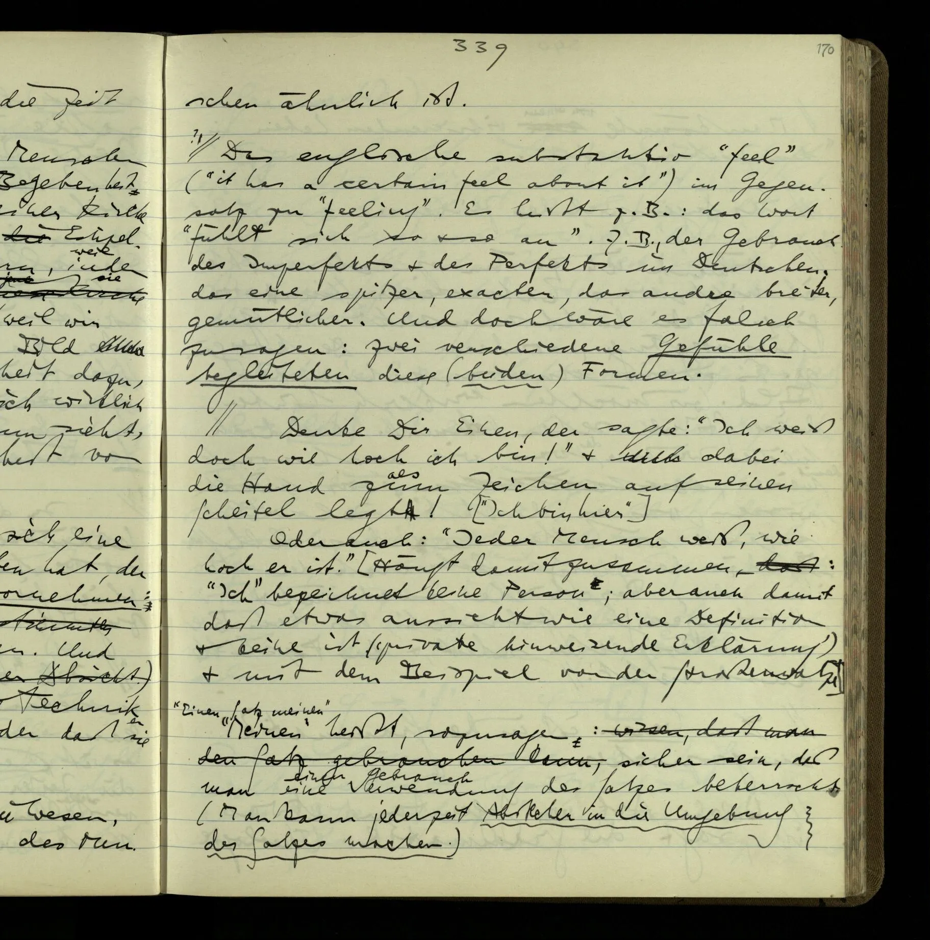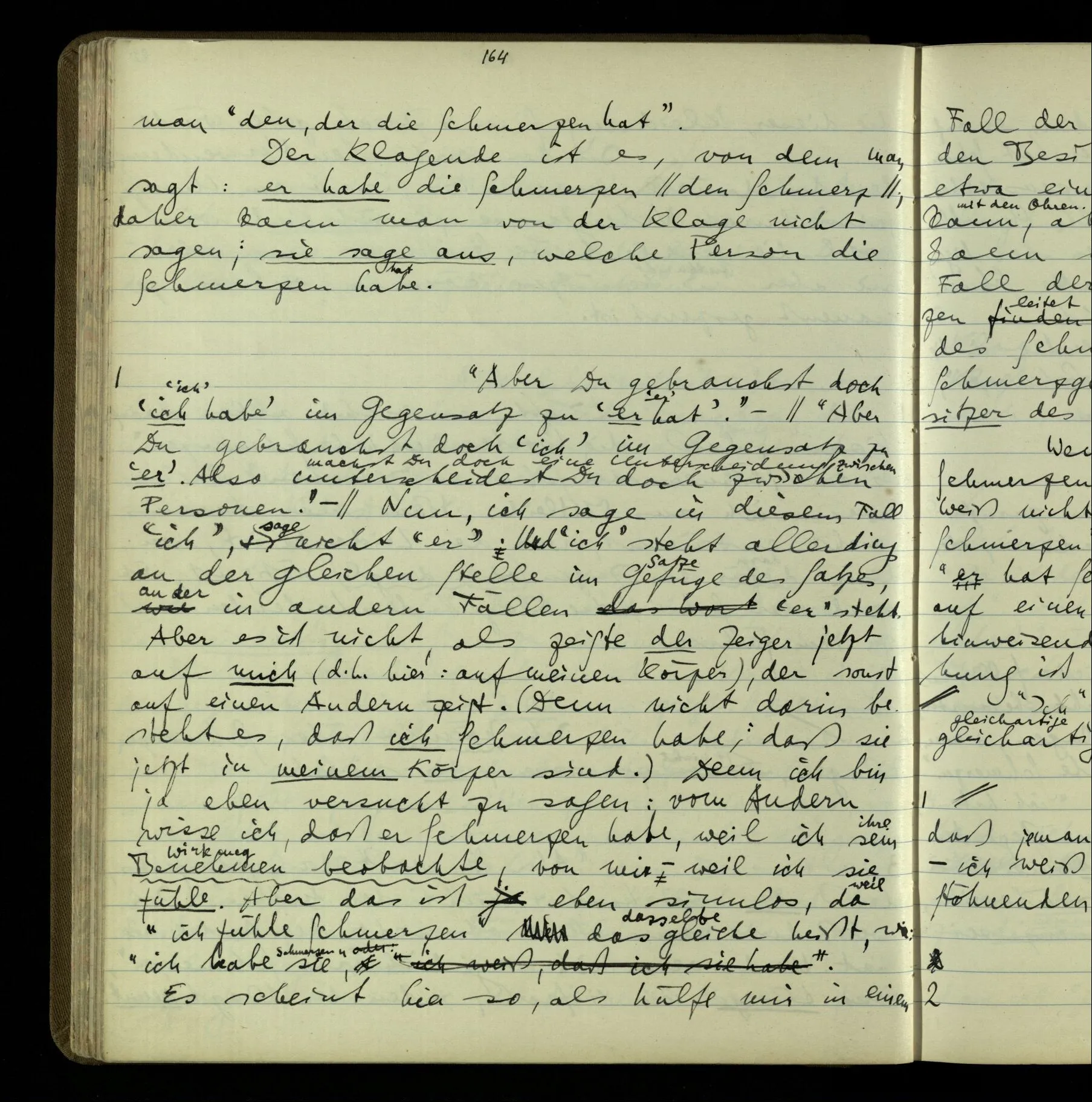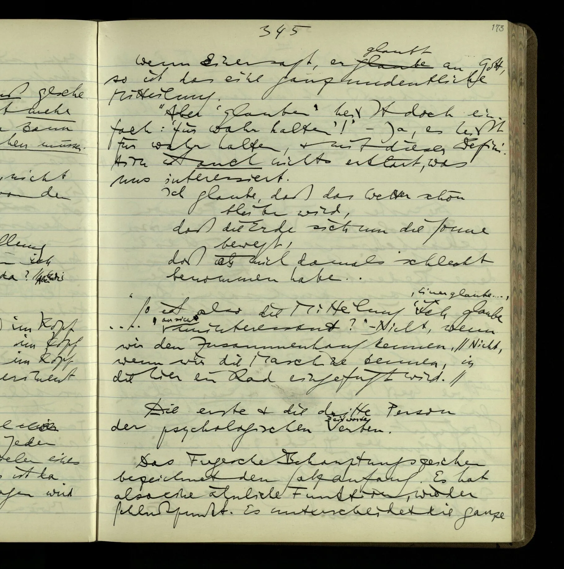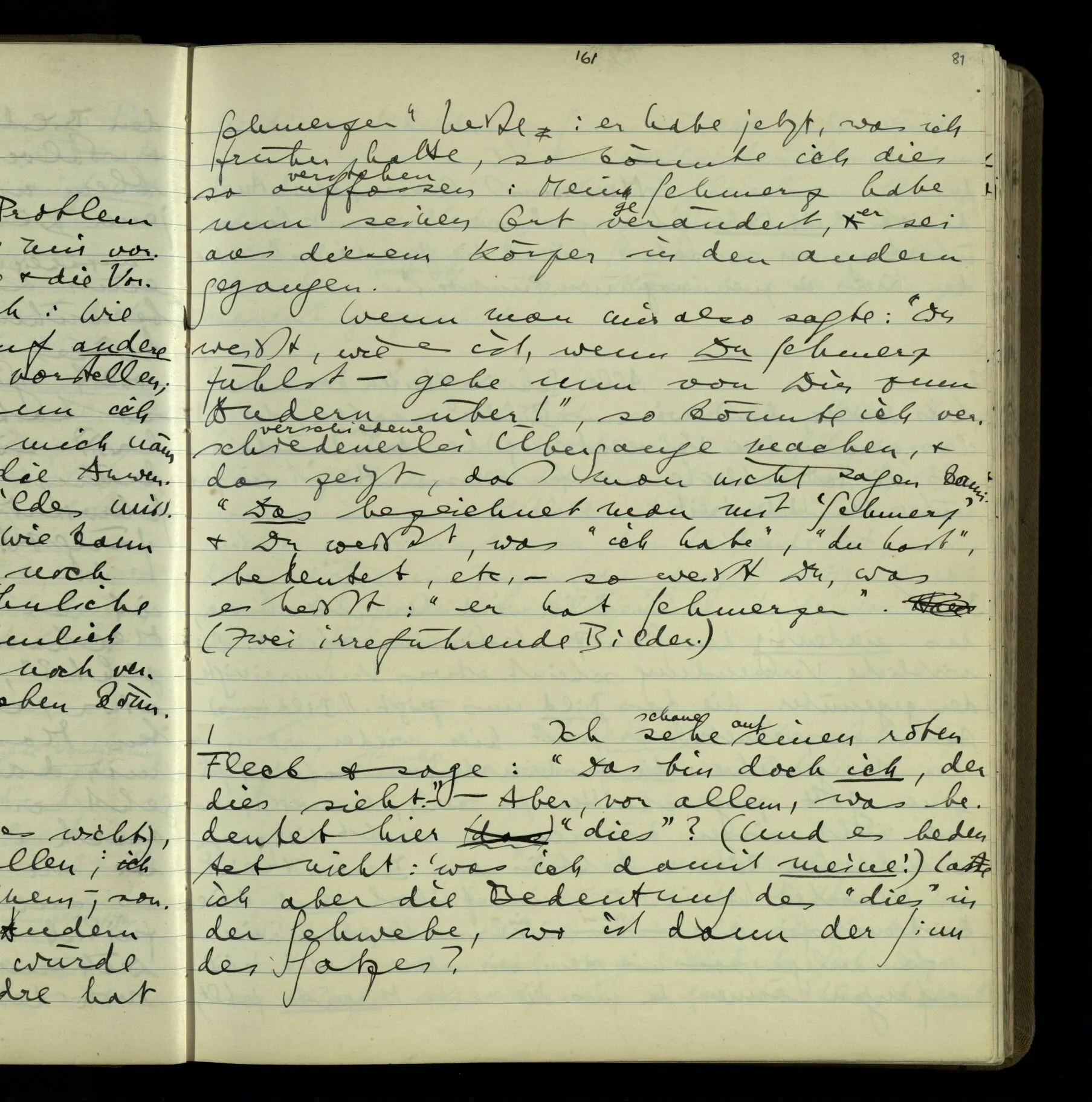 Die erste & die dritte Person der psychologischen Verben. In gewissen Gedankengängen scheint es uns als ob sie dann zwei verschiedene Bedeutungen hätten. Aber man kann auch sagen: Das macht ihre Eigentümlichkeit aus, daß diese zwei Aspekte mit einander zu einer Einheit verschmolzen sind.