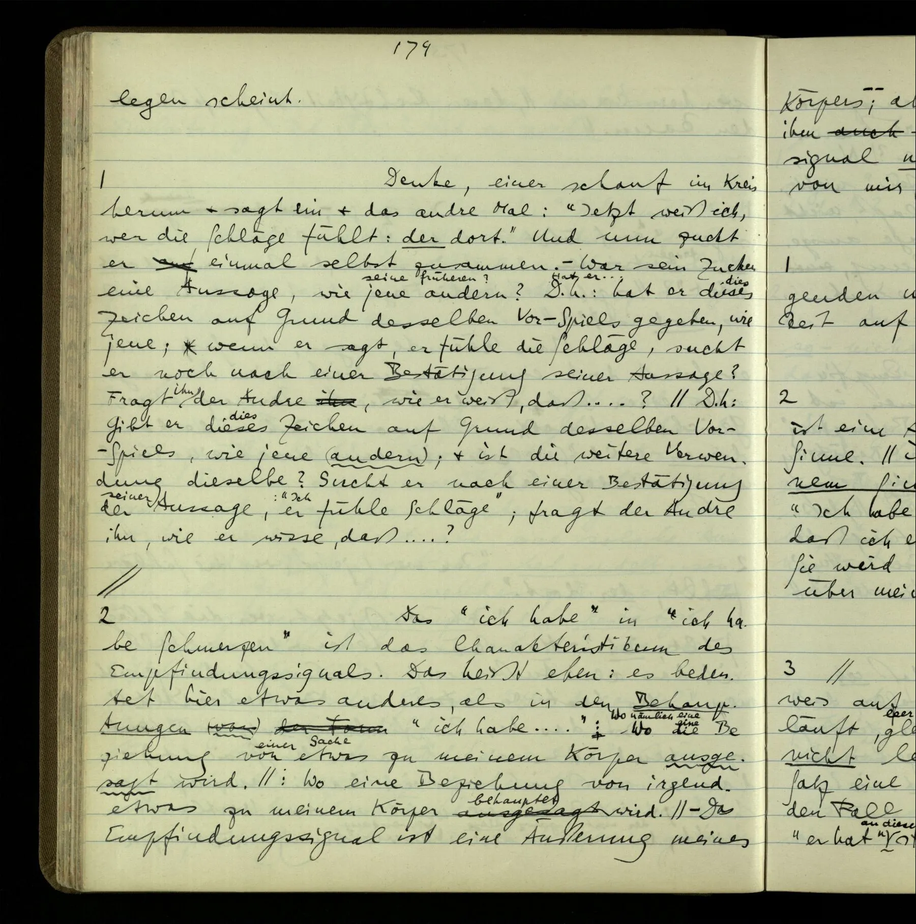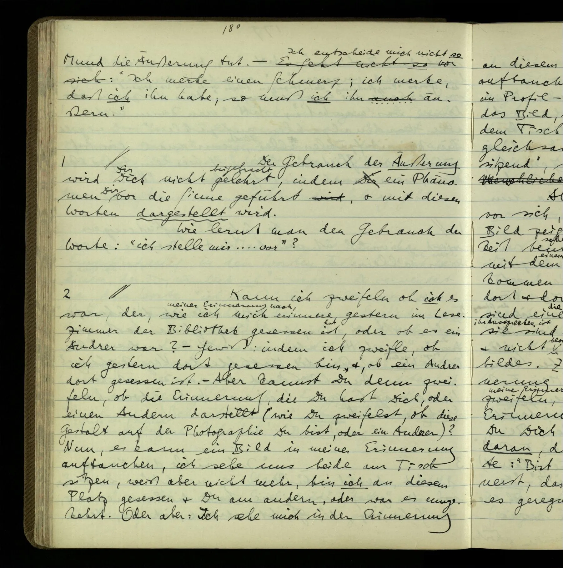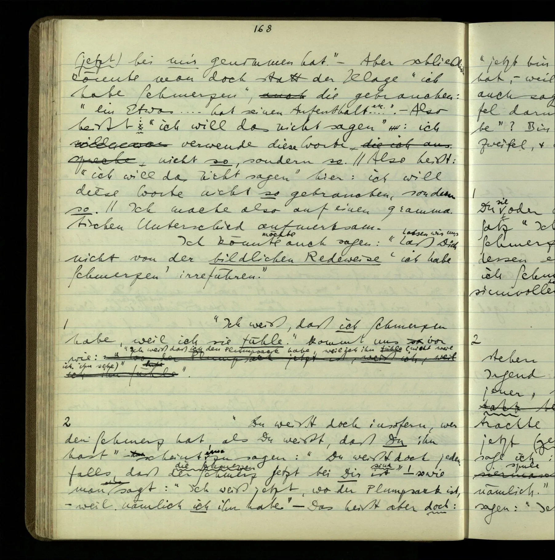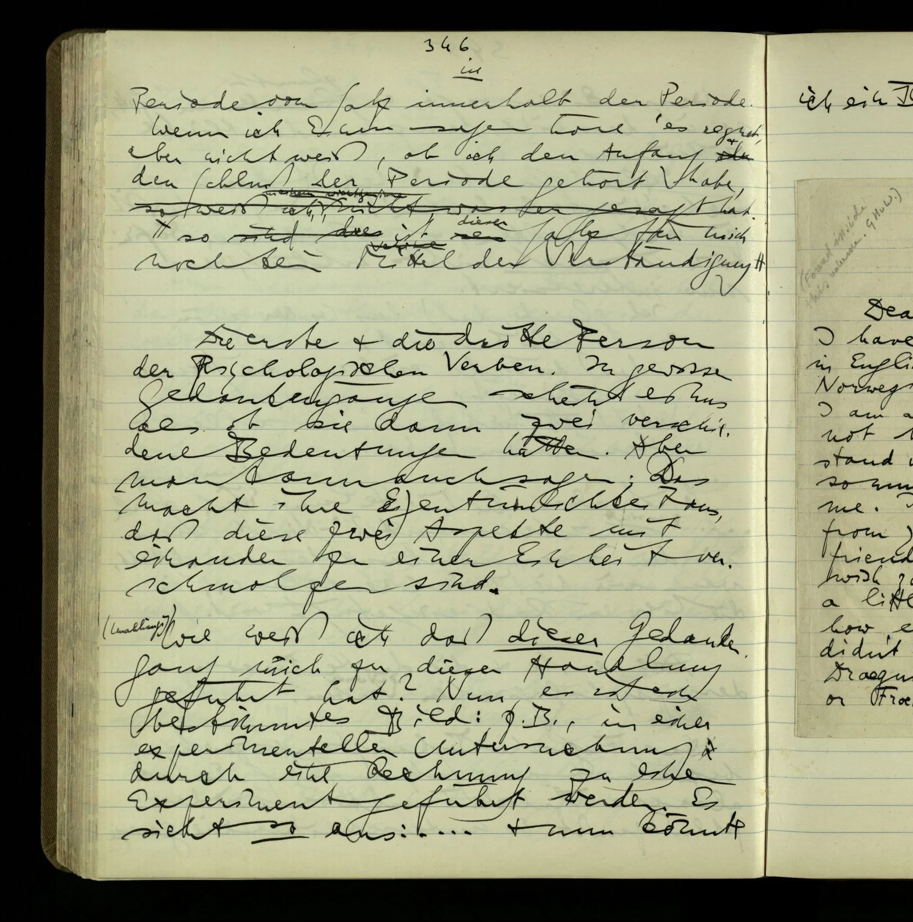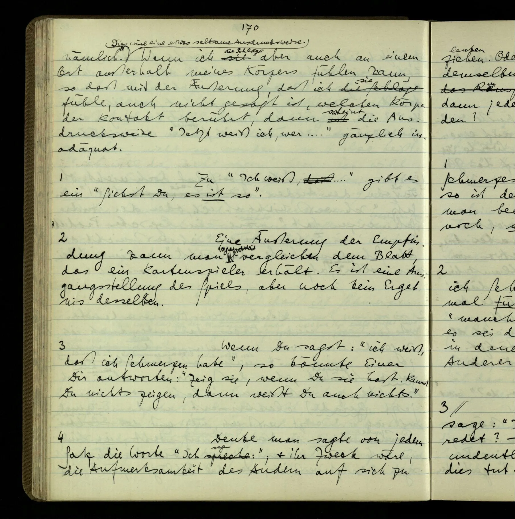 Die erste & die dritte Person der psychologischen Verben. In gewissen Gedankengängen scheint es uns als ob sie dann zwei verschiedene Bedeutungen hätten. Aber man kann auch sagen: Das macht ihre Eigentümlichkeit aus, daß diese zwei Aspekte mit einander zu einer Einheit verschmolzen sind.