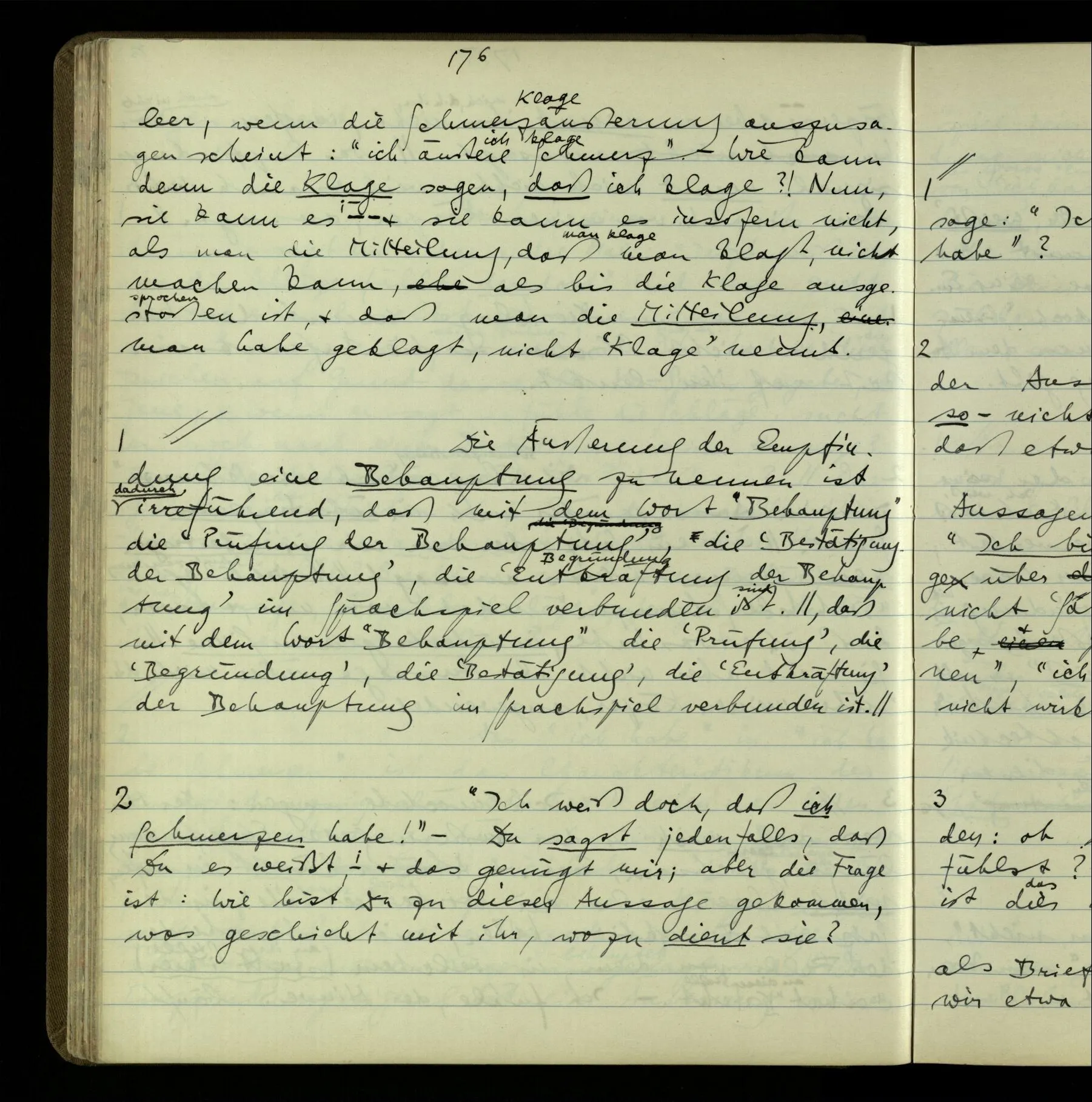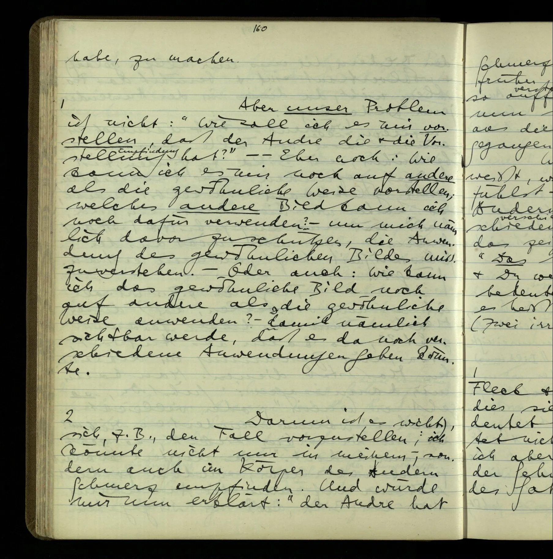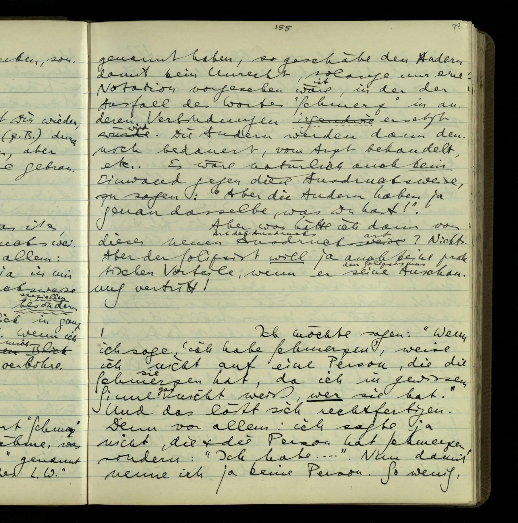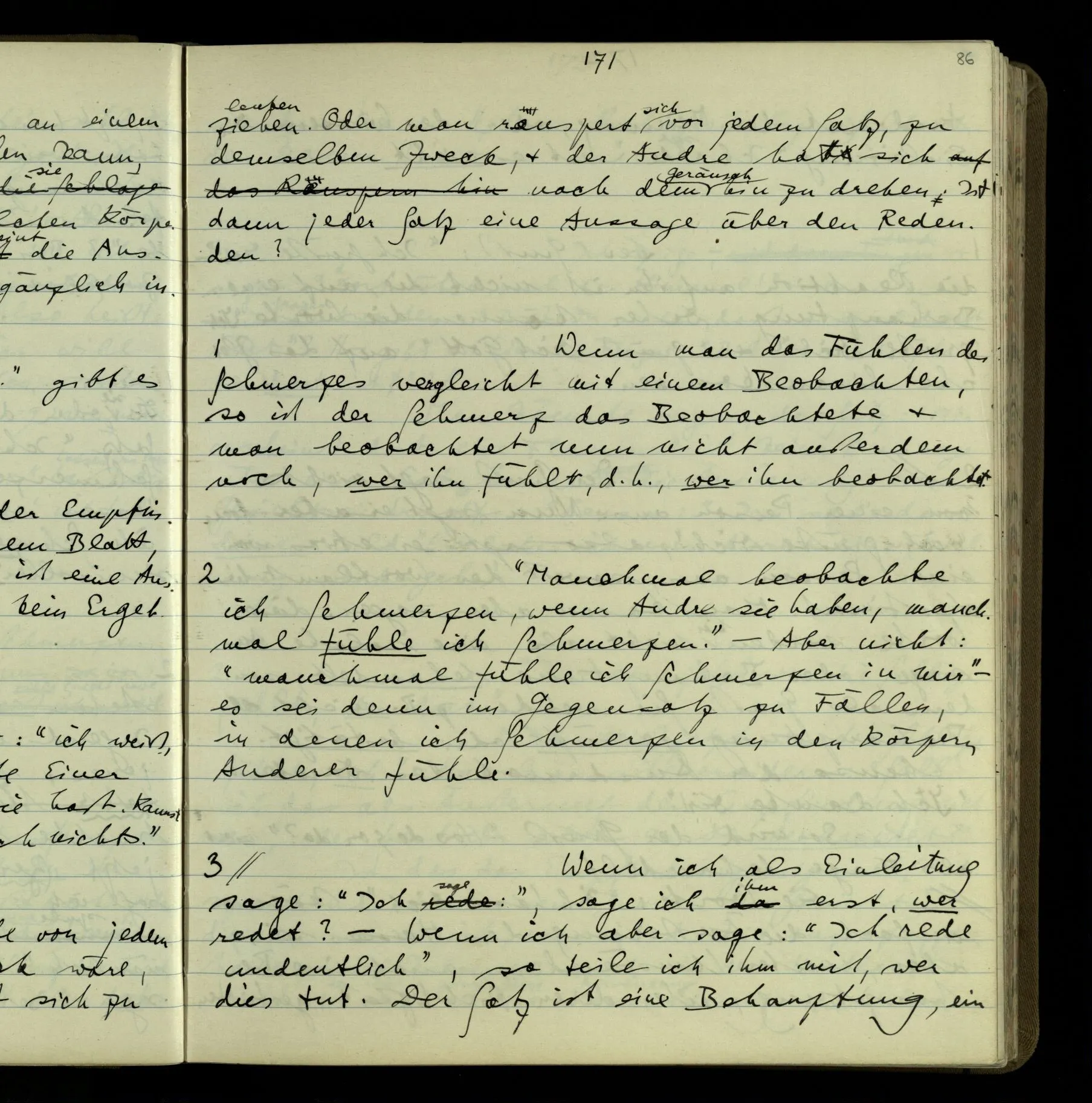 Die erste & die dritte Person der psychologischen Verben. In gewissen Gedankengängen scheint es uns als ob sie dann zwei verschiedene Bedeutungen hätten. Aber man kann auch sagen: Das macht ihre Eigentümlichkeit aus, daß diese zwei Aspekte mit einander zu einer Einheit verschmolzen sind.