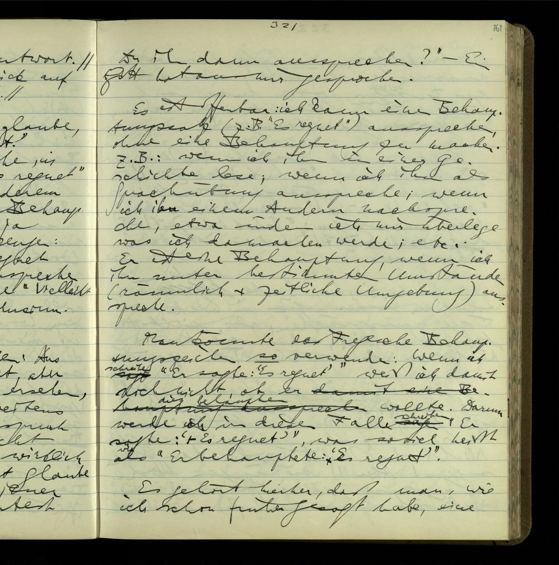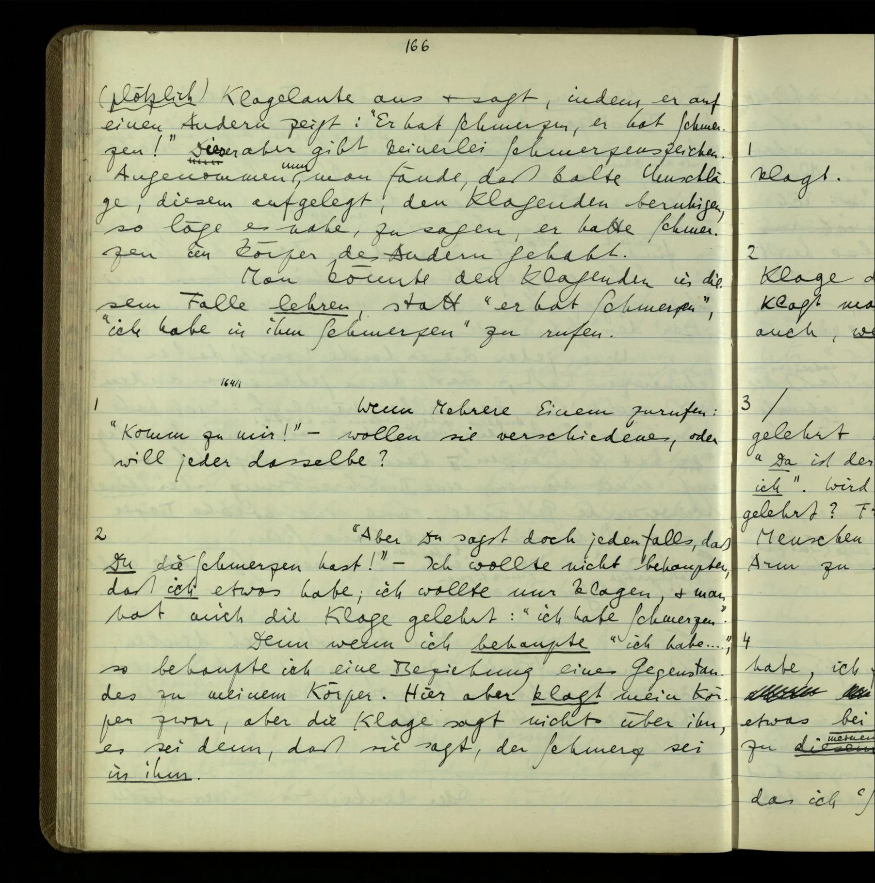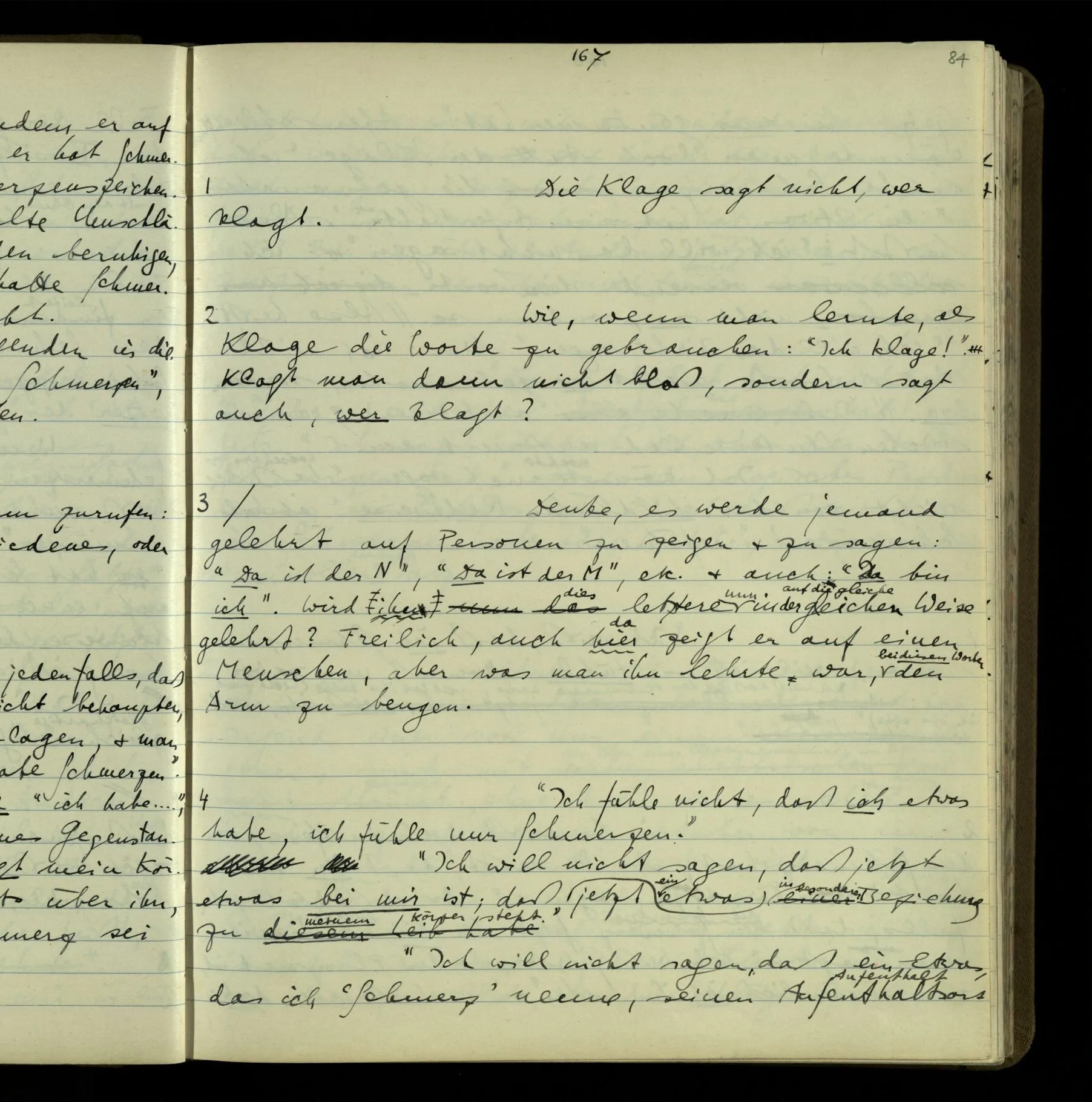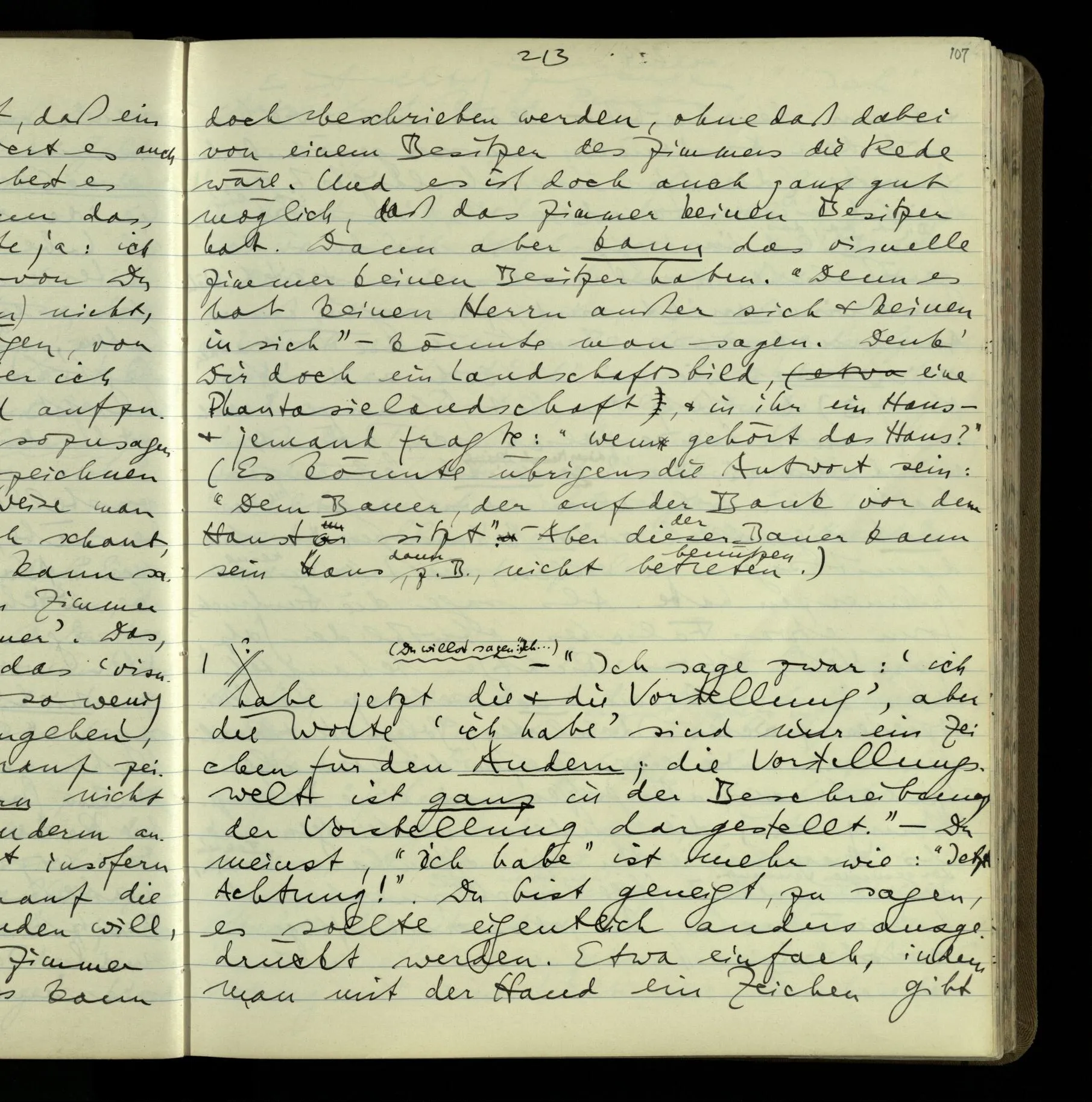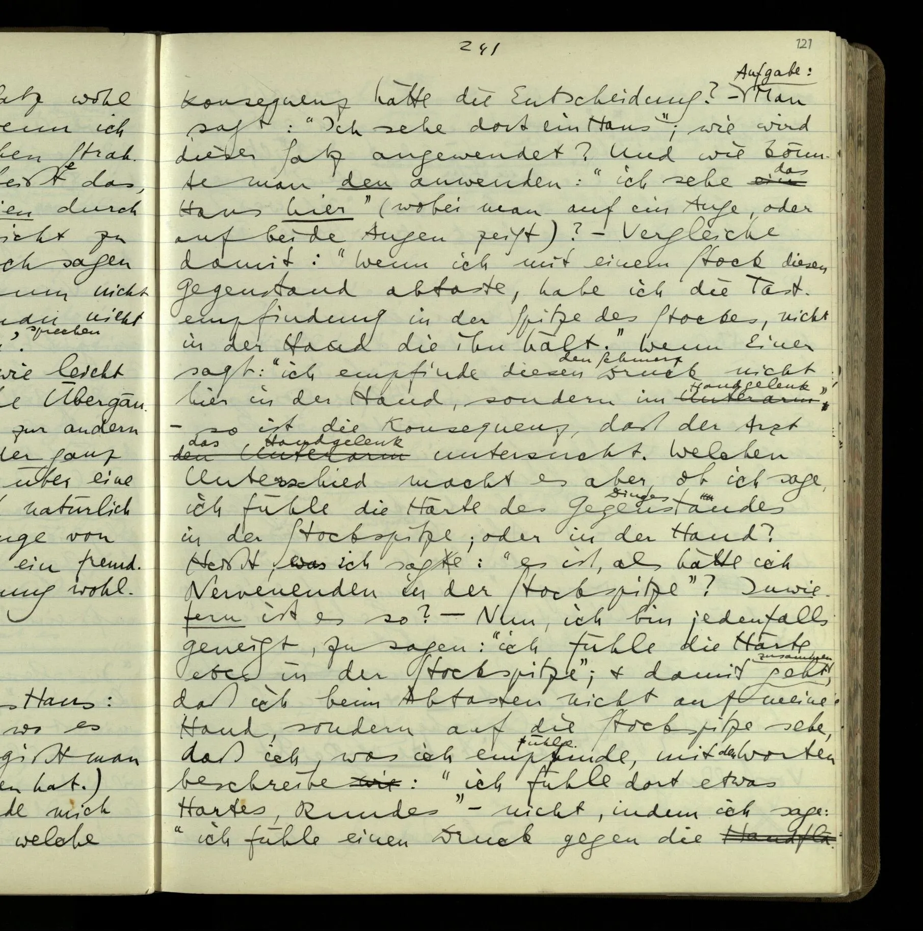 Die erste & die dritte Person der psychologischen Verben. In gewissen Gedankengängen scheint es uns als ob sie dann zwei verschiedene Bedeutungen hätten. Aber man kann auch sagen: Das macht ihre Eigentümlichkeit aus, daß diese zwei Aspekte mit einander zu einer Einheit verschmolzen sind.