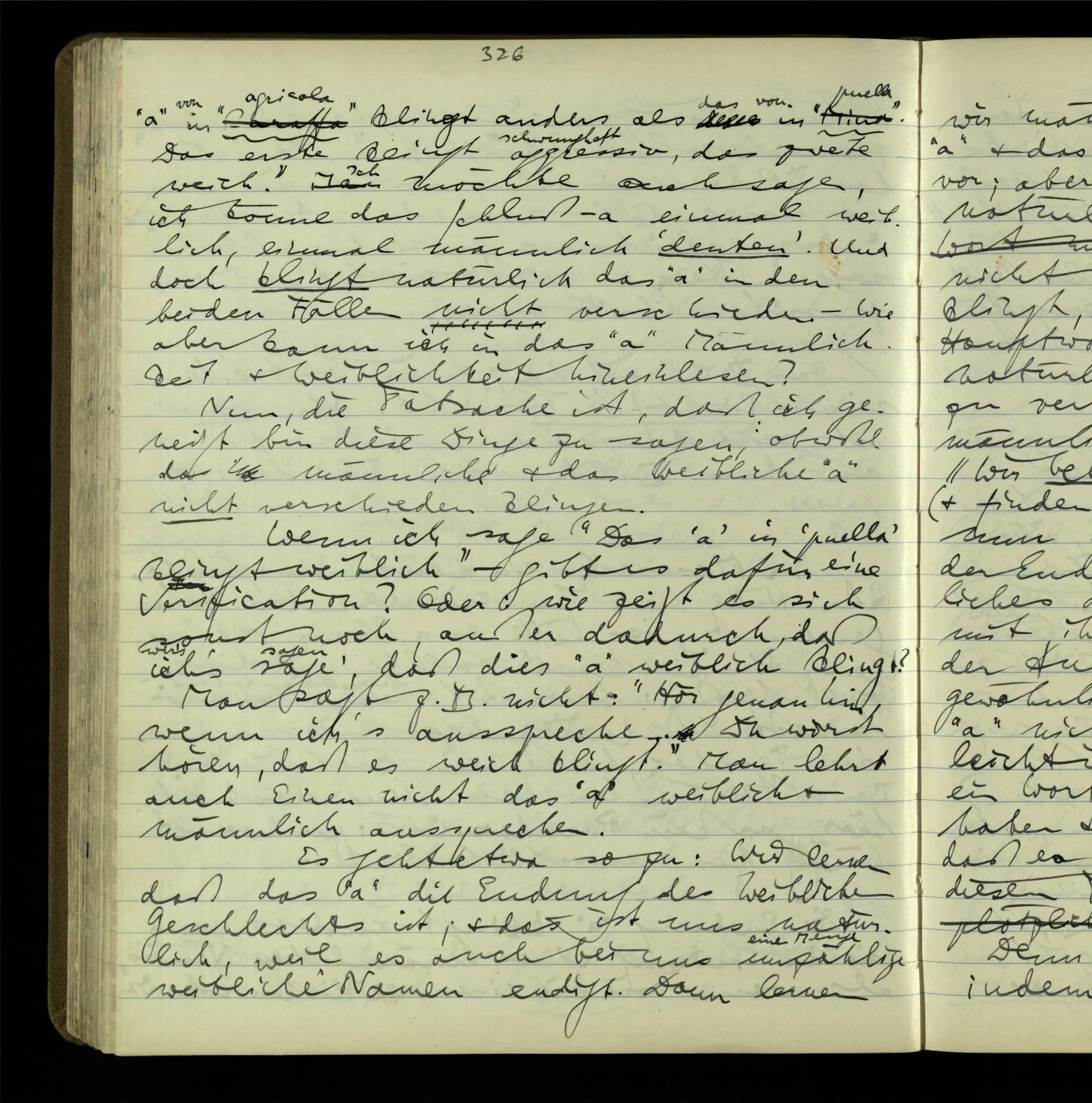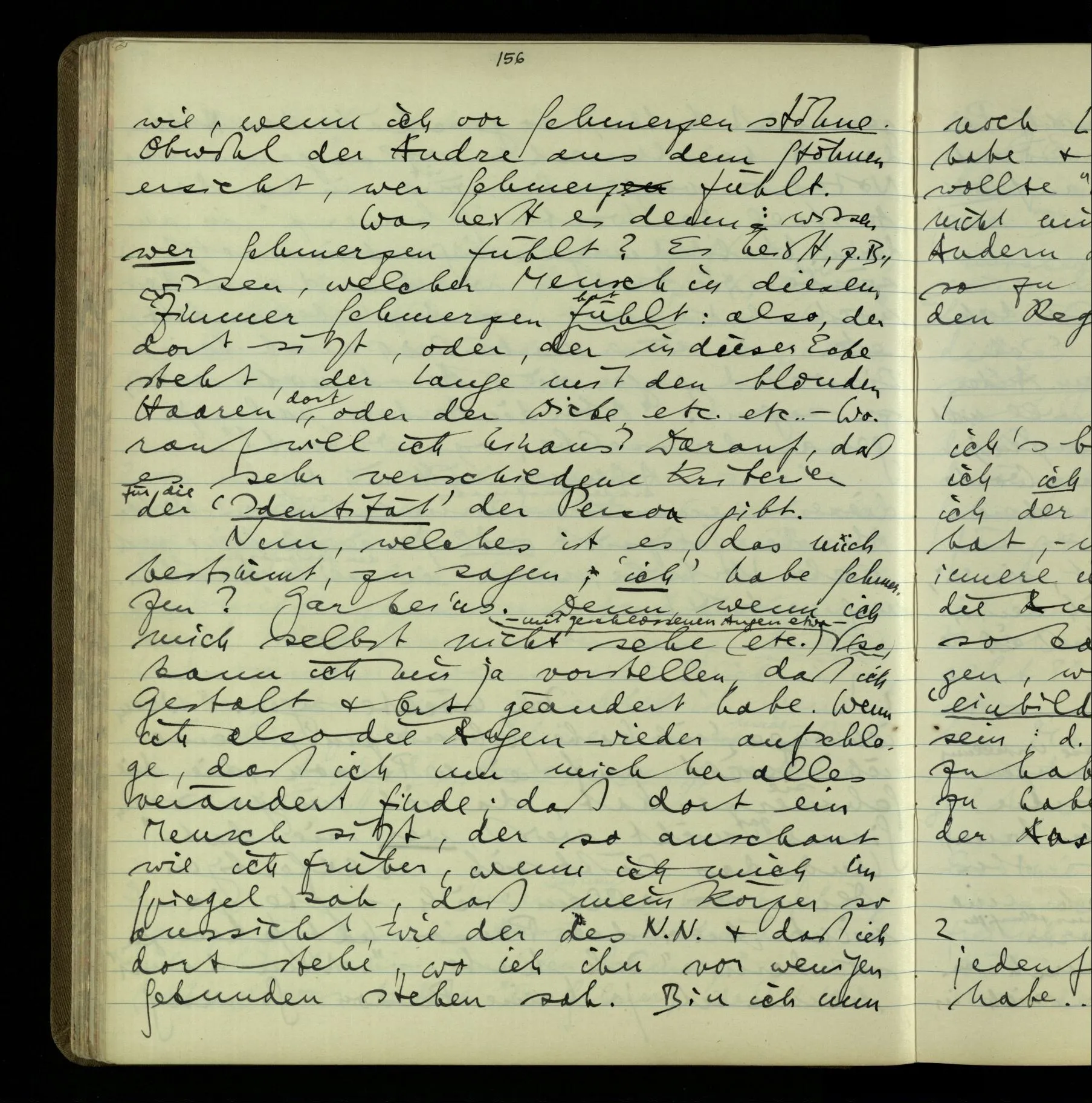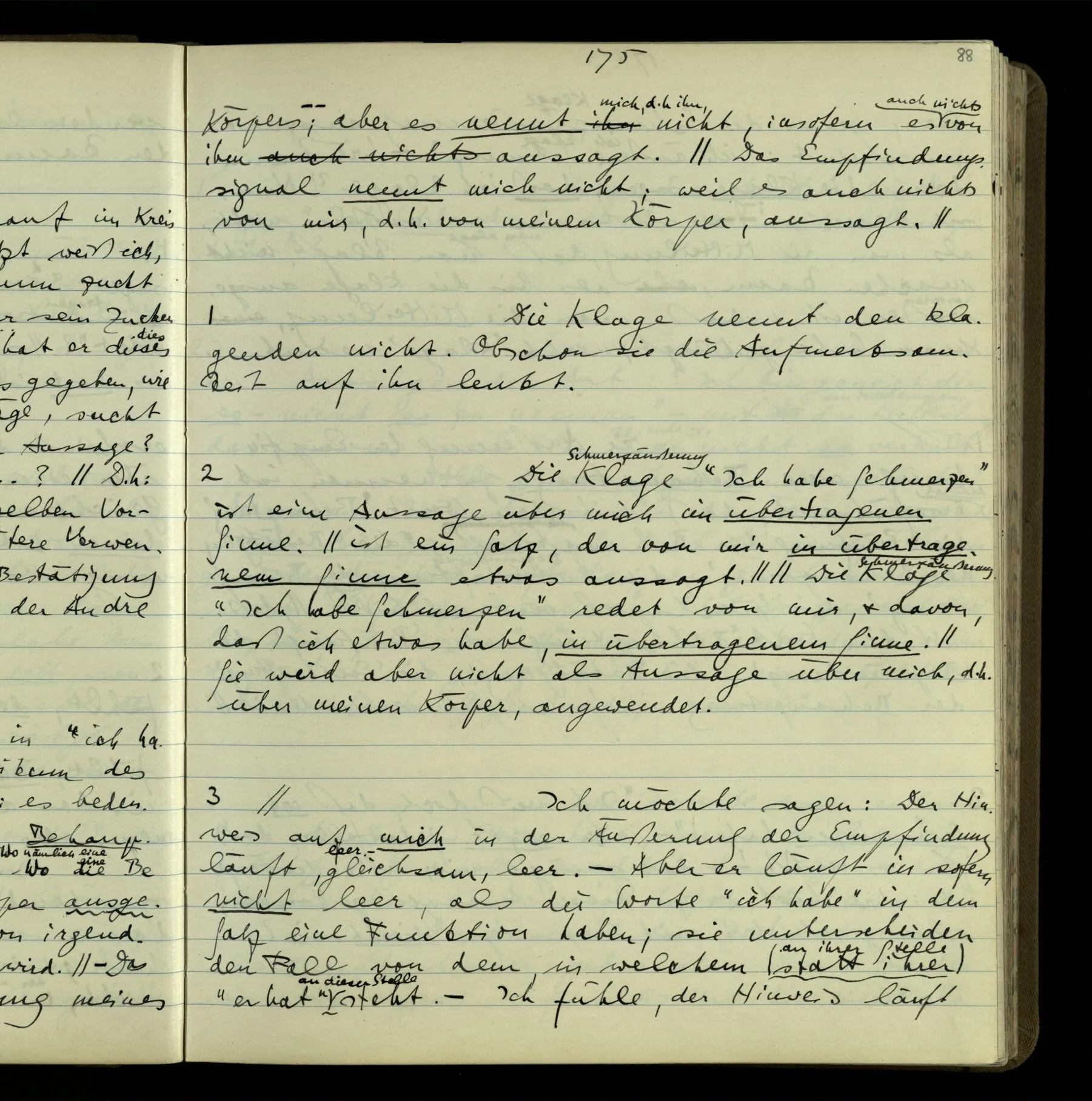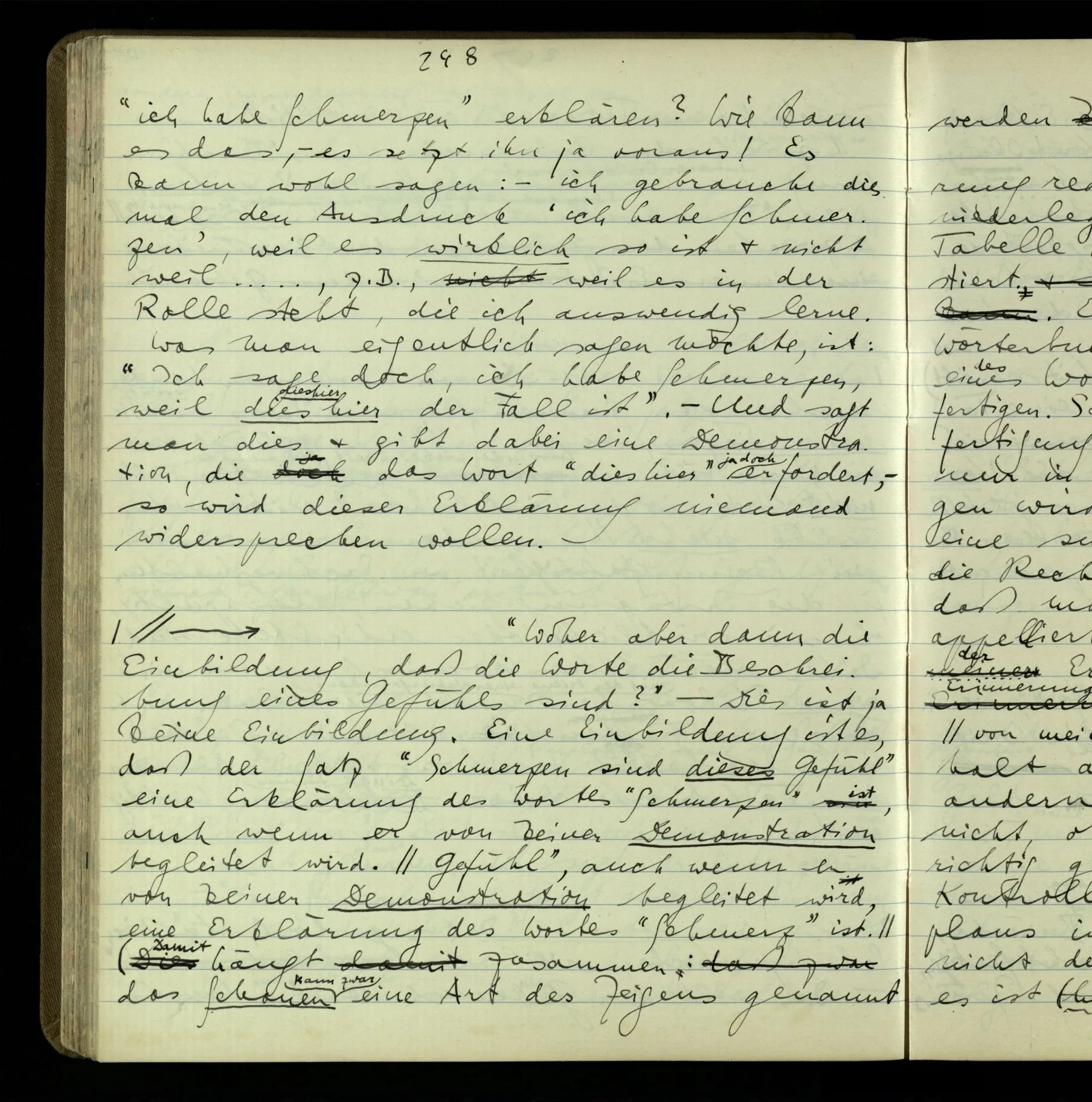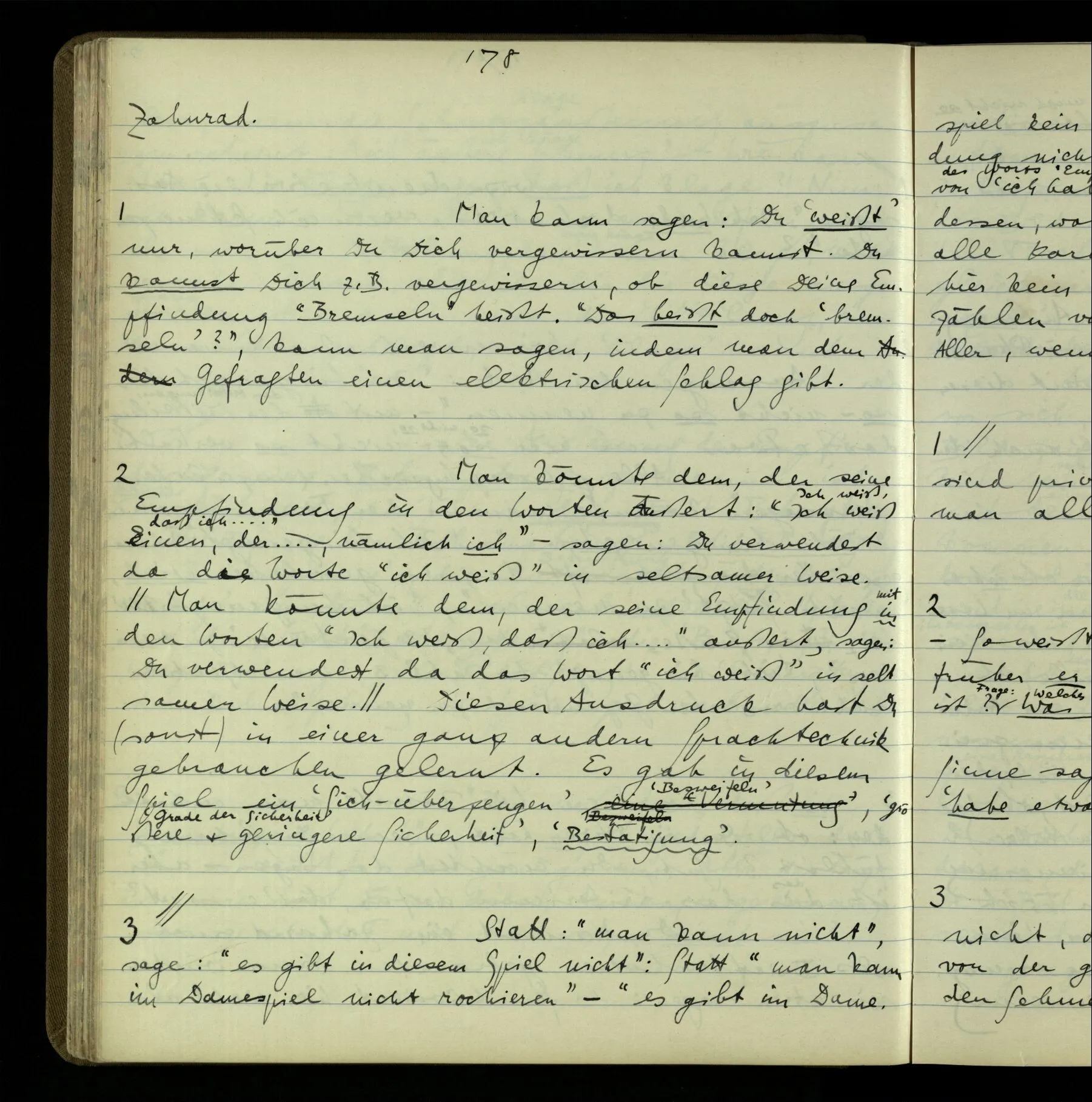 Die erste & die dritte Person der psychologischen Verben. In gewissen Gedankengängen scheint es uns als ob sie dann zwei verschiedene Bedeutungen hätten. Aber man kann auch sagen: Das macht ihre Eigentümlichkeit aus, daß diese zwei Aspekte mit einander zu einer Einheit verschmolzen sind.